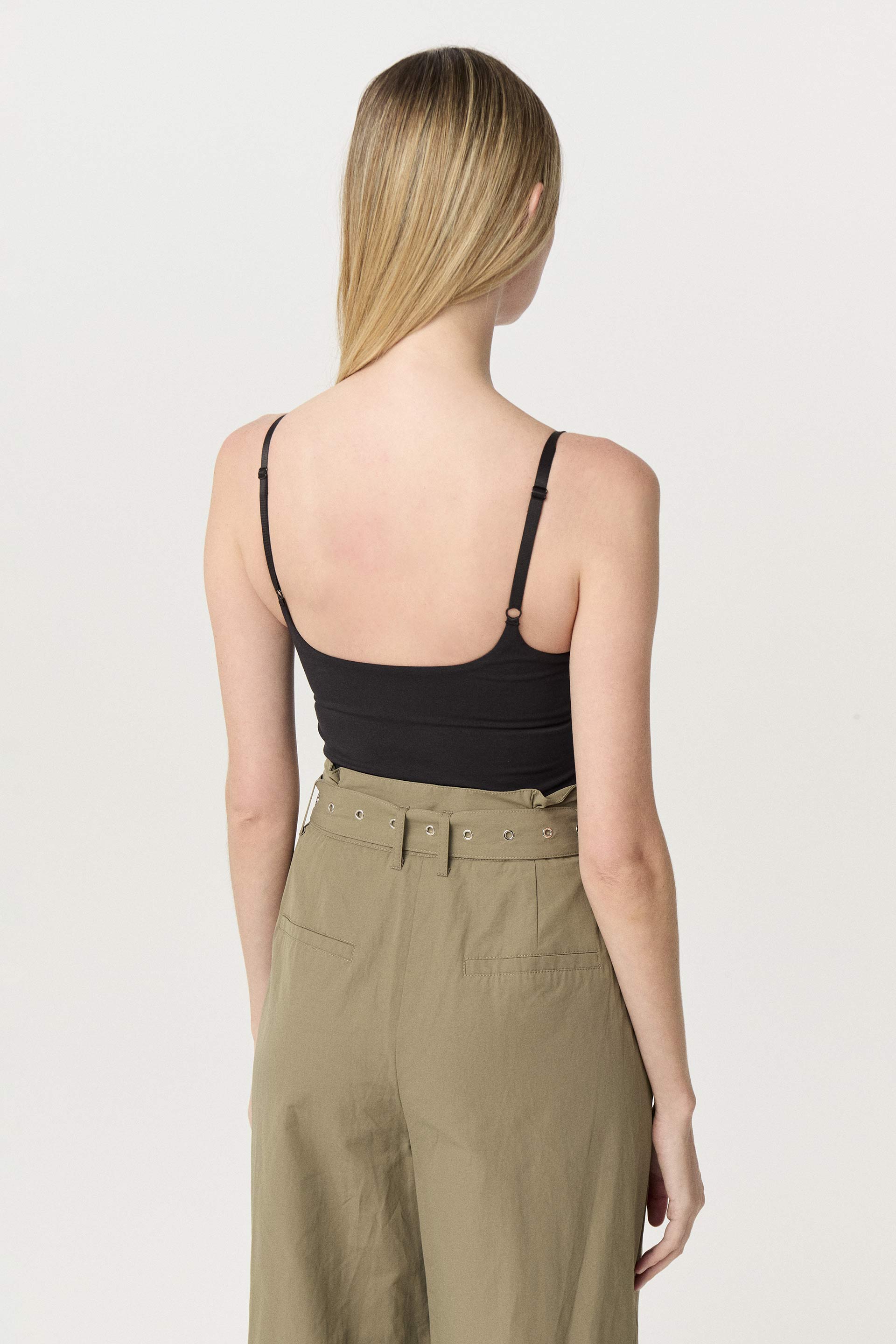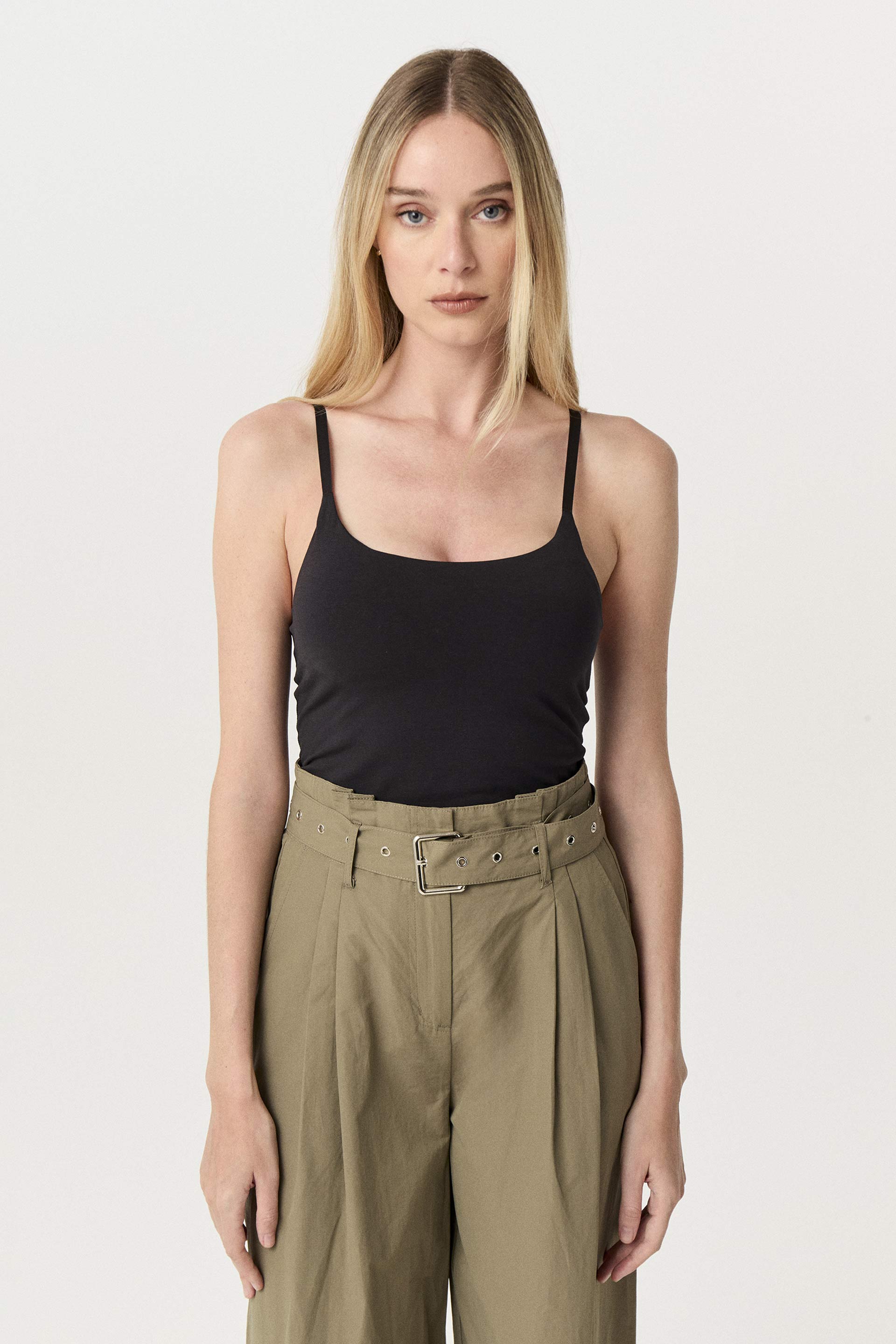 Musculosa de algodón modal con spandex de calce anatómico. Breteles elásticos regulables y escote semicurvo, con tazas soft incorporadas en corpiño interno para soporte y confort.
