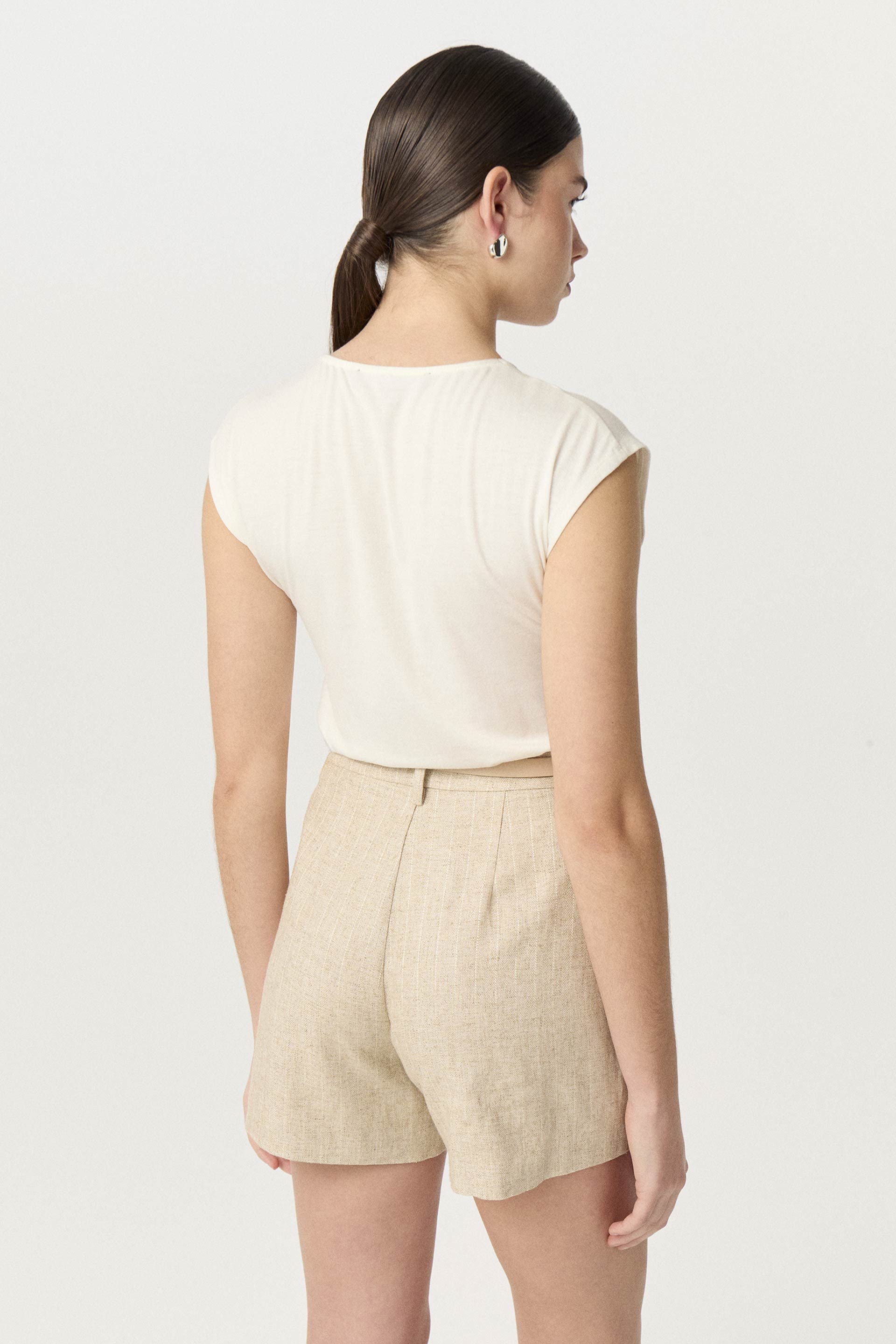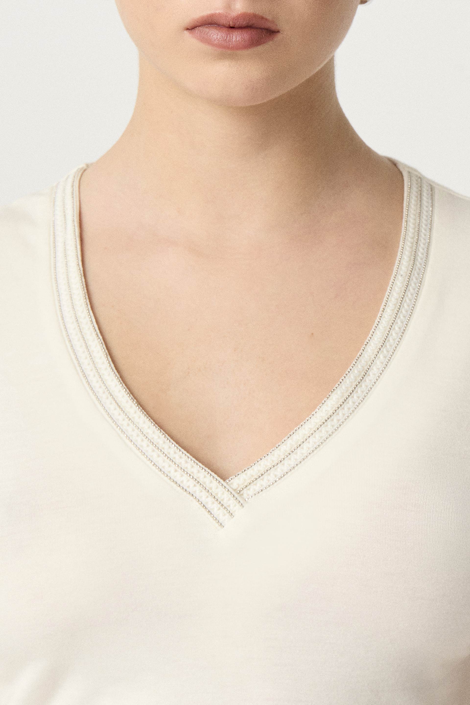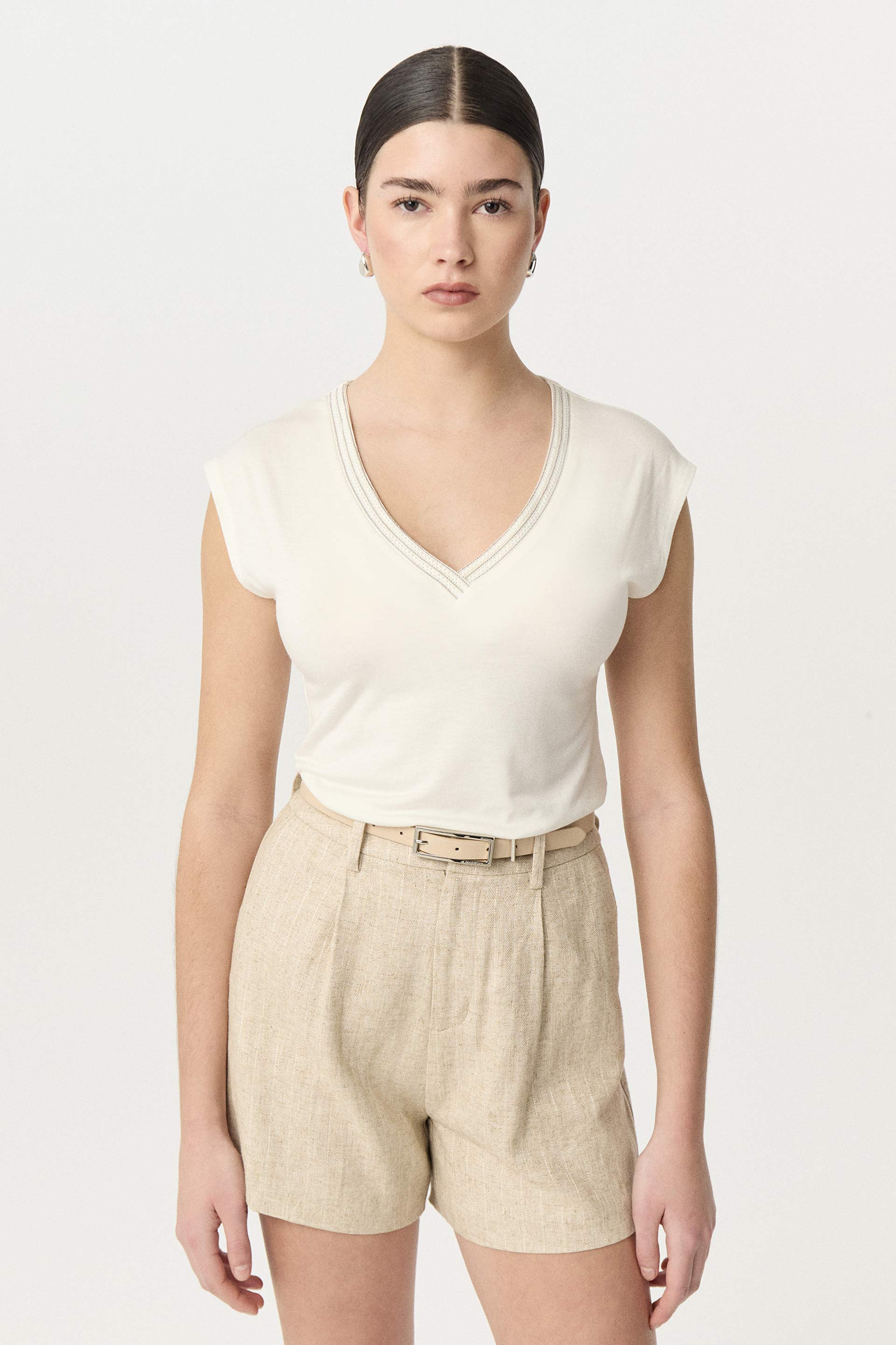 Remera de jersey fantasía de calce al cuerpo. Escote en V, hombro caído y galón a tono en escote. Un comodín perfecto para toda ocasión.