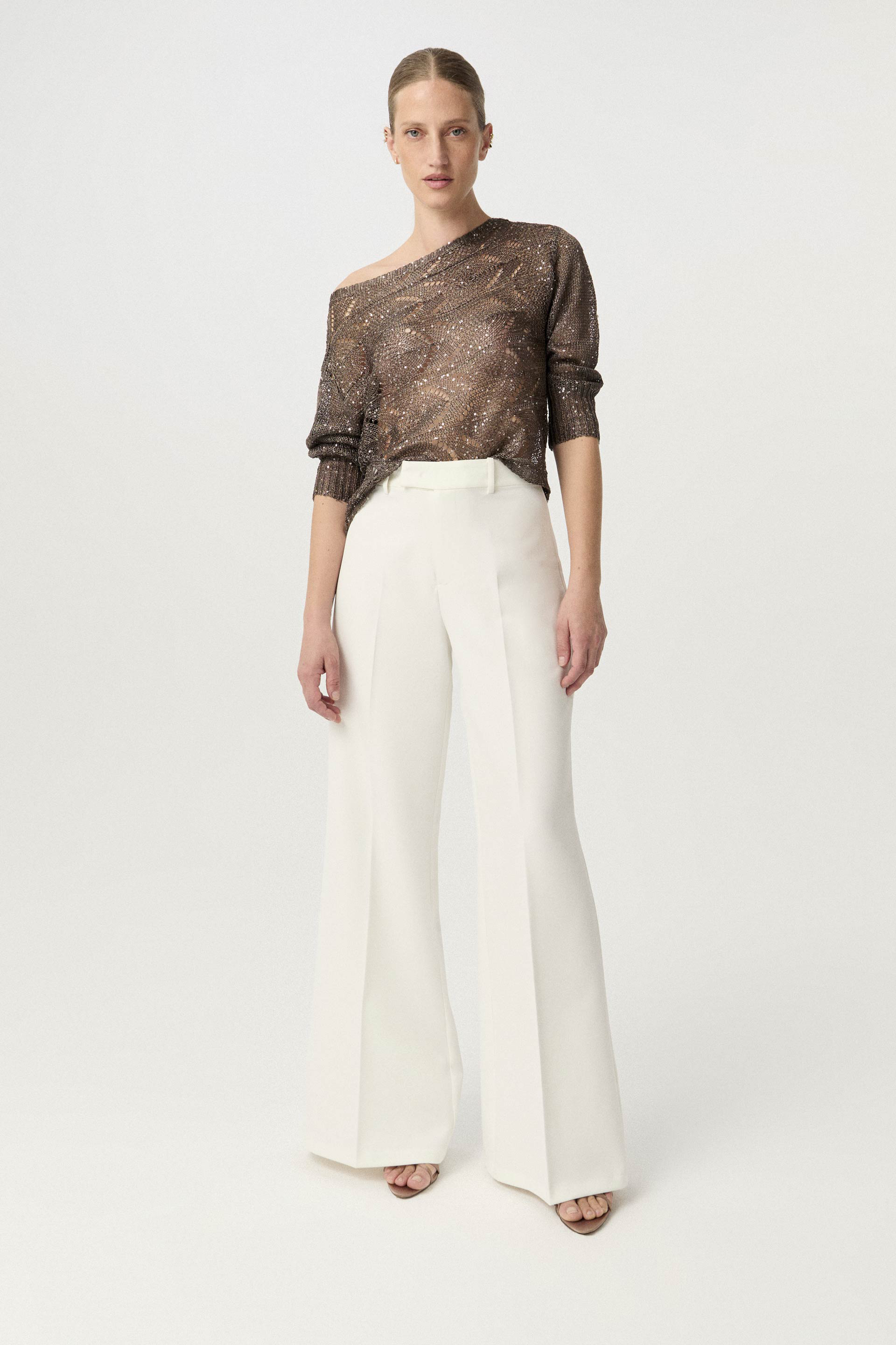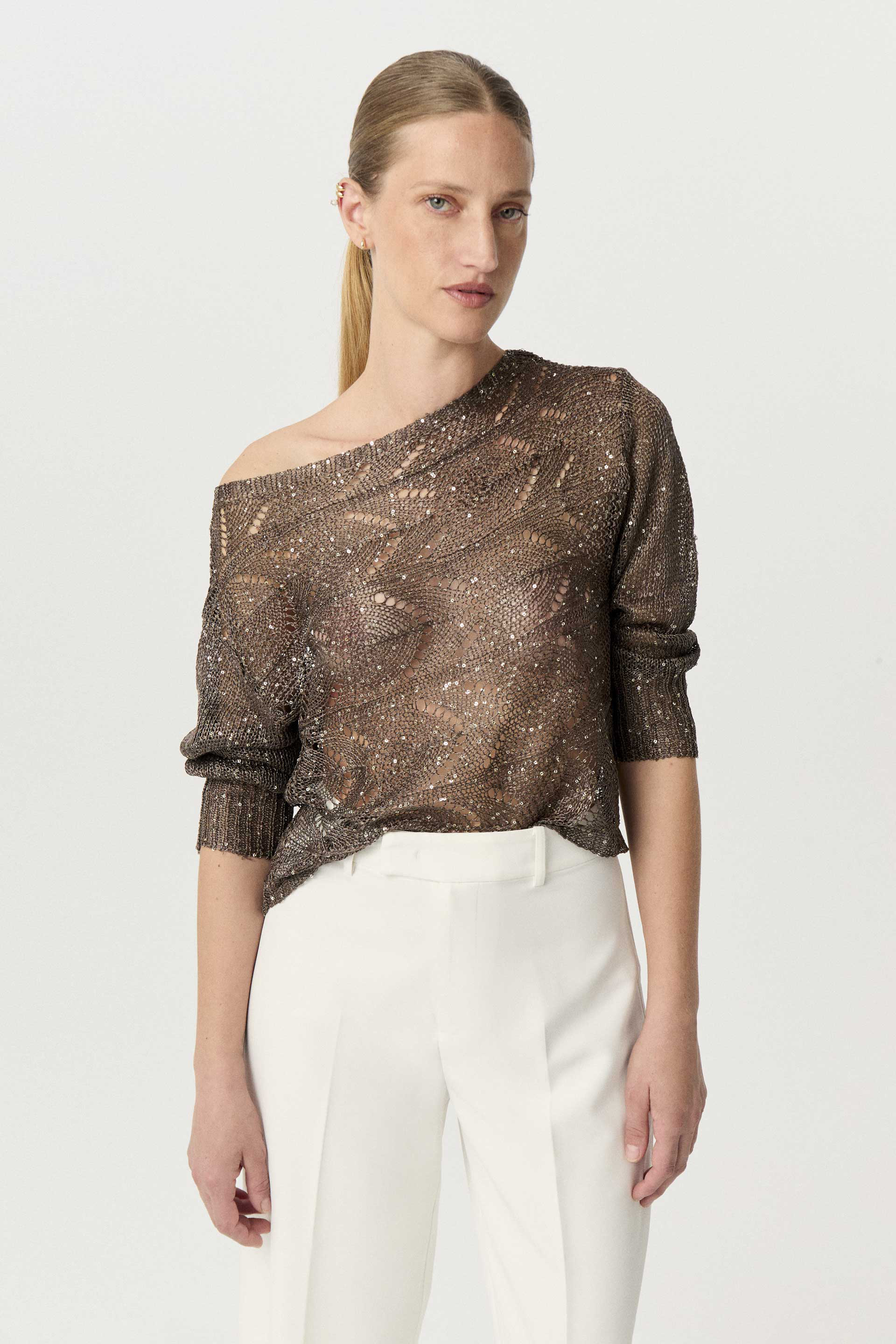 Sweater calado de calce relajado con mangas largas. Escote bote amplio, que permite usarlo de forma clásica o de lado, mostrando un hombro. Su hilado efecto metálico con aplique de mini lentejuelas a tono, lo convierten en un complemento glamoroso pero relajado para realzar tus looks de verano.