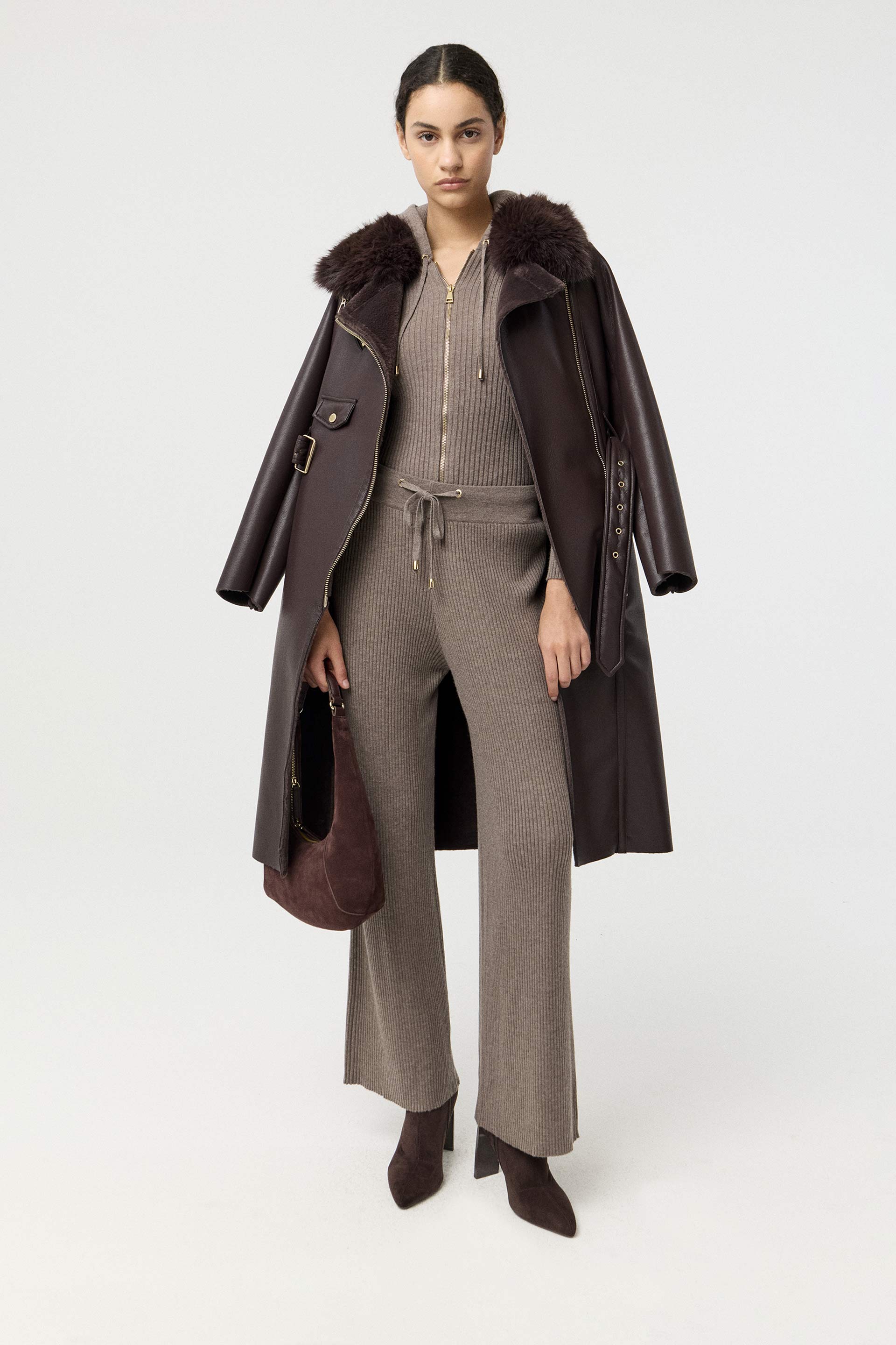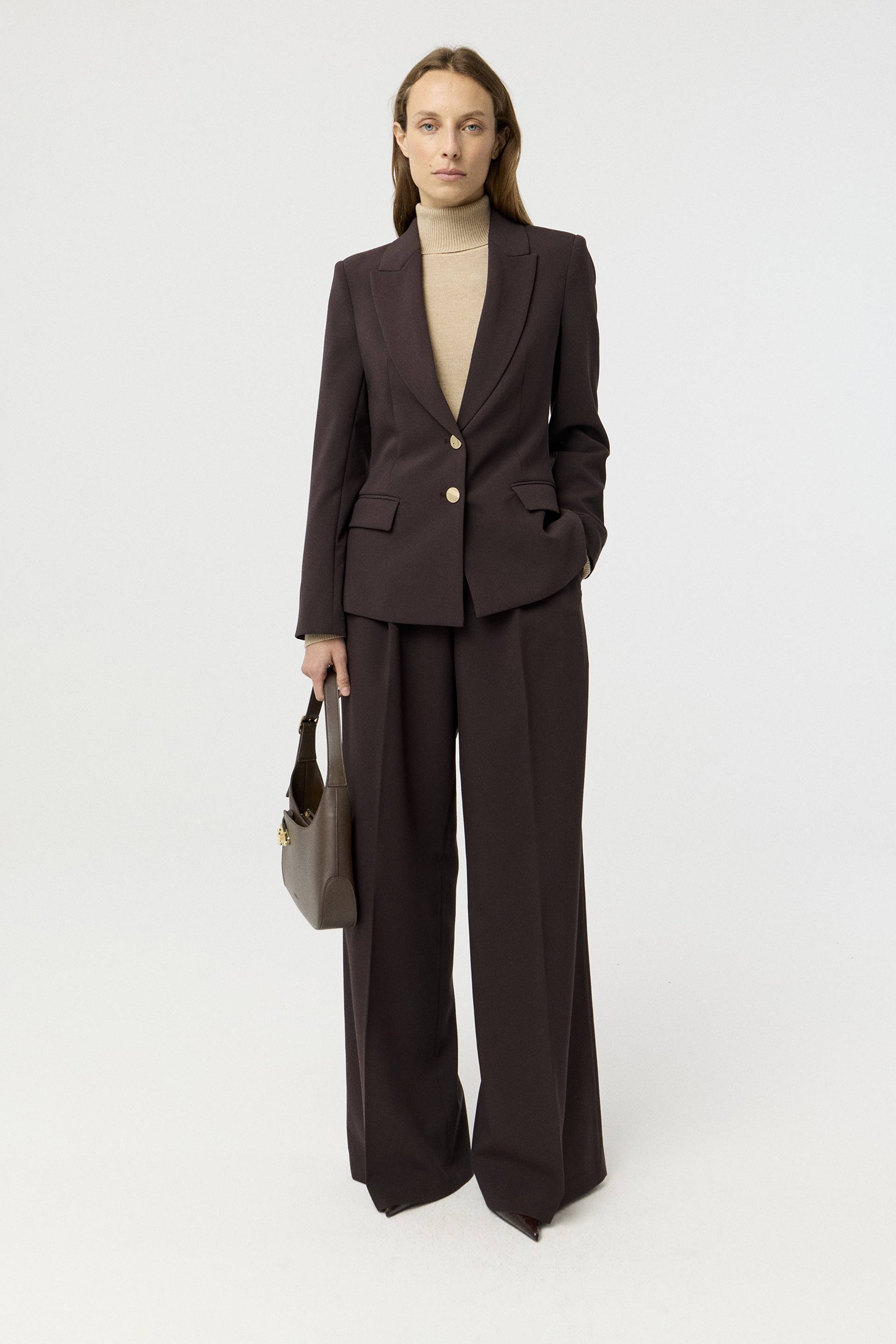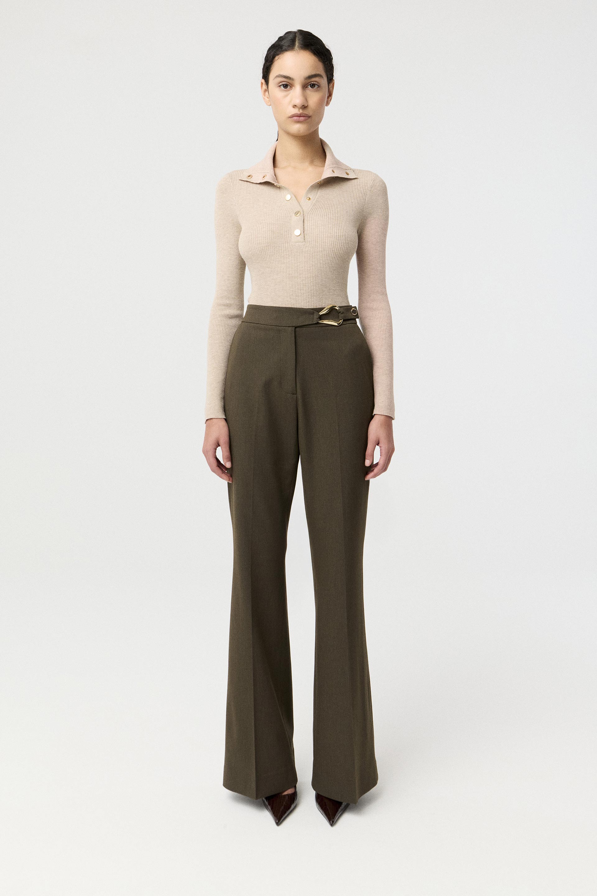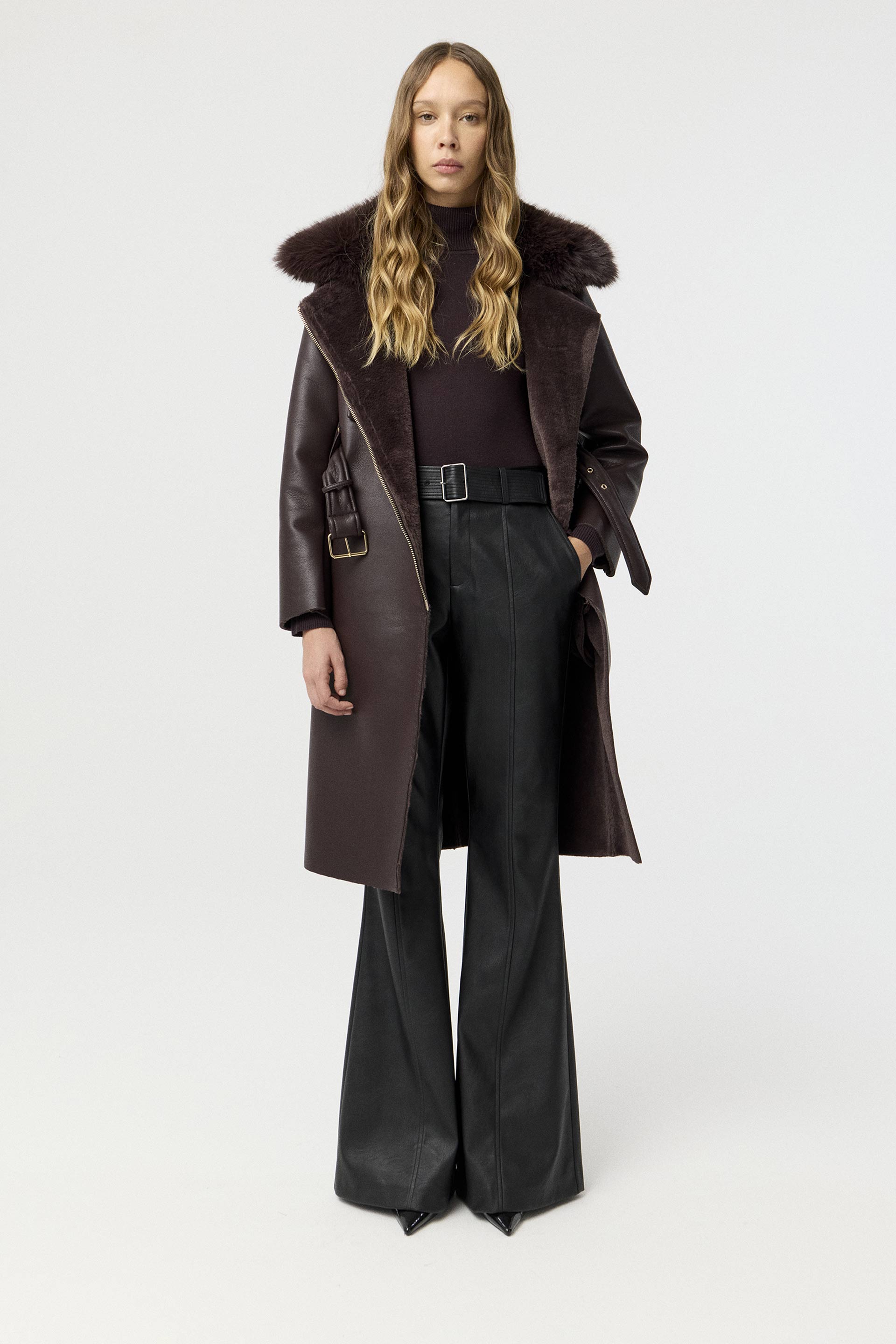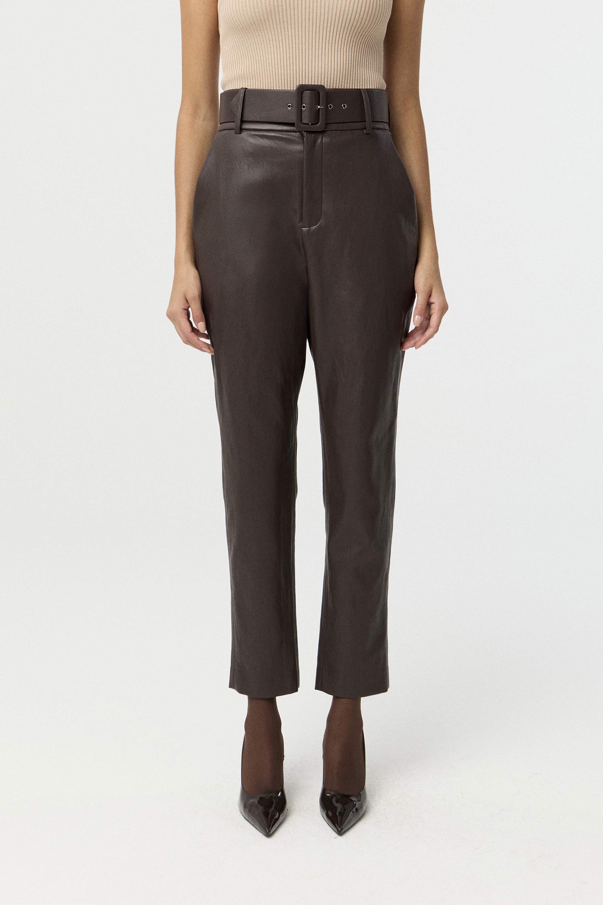 Pantalón efecto cuero encerado, de tiro alto y pierna slim. Posee cinturón forrado con hebilla y bolsillos laterales. Su género ultra suave al tacto y su color protagonista de la temporada lo convierten en un ítem sofisticado, moderno y de tendencia. Combinalo con el blazer Evelyn para lograr un look elegante, ideal para la oficina.