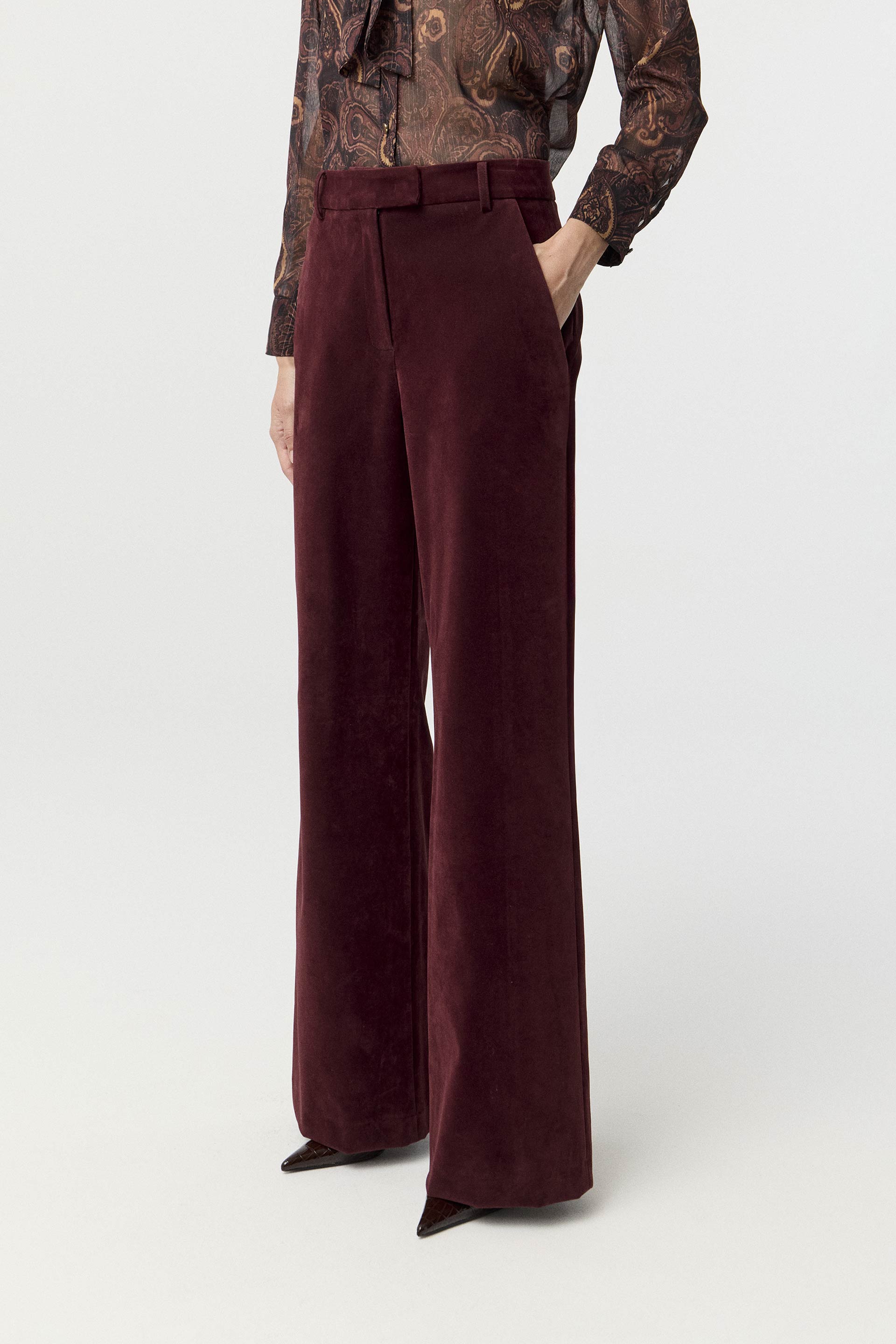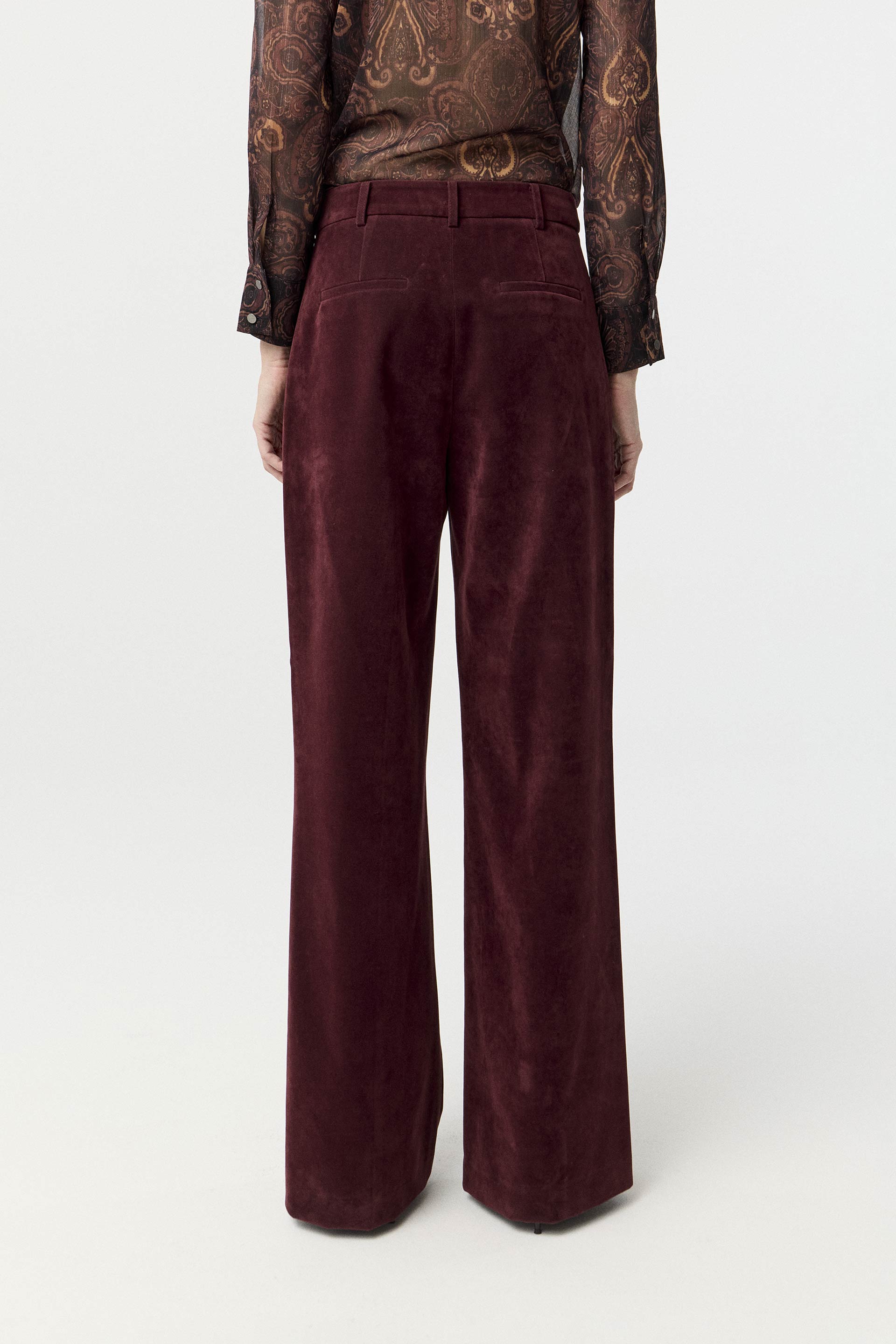 Pantalón efecto gamuza, de tiro alto y pierna ancha. Posee bolsillos diagonales y acceso central con cierre y gancho pantalonero. Su género, calce y color aportan elegancia y modernidad. Combinalo con el blazer Droll y armá un total look de absoluta tendencia.