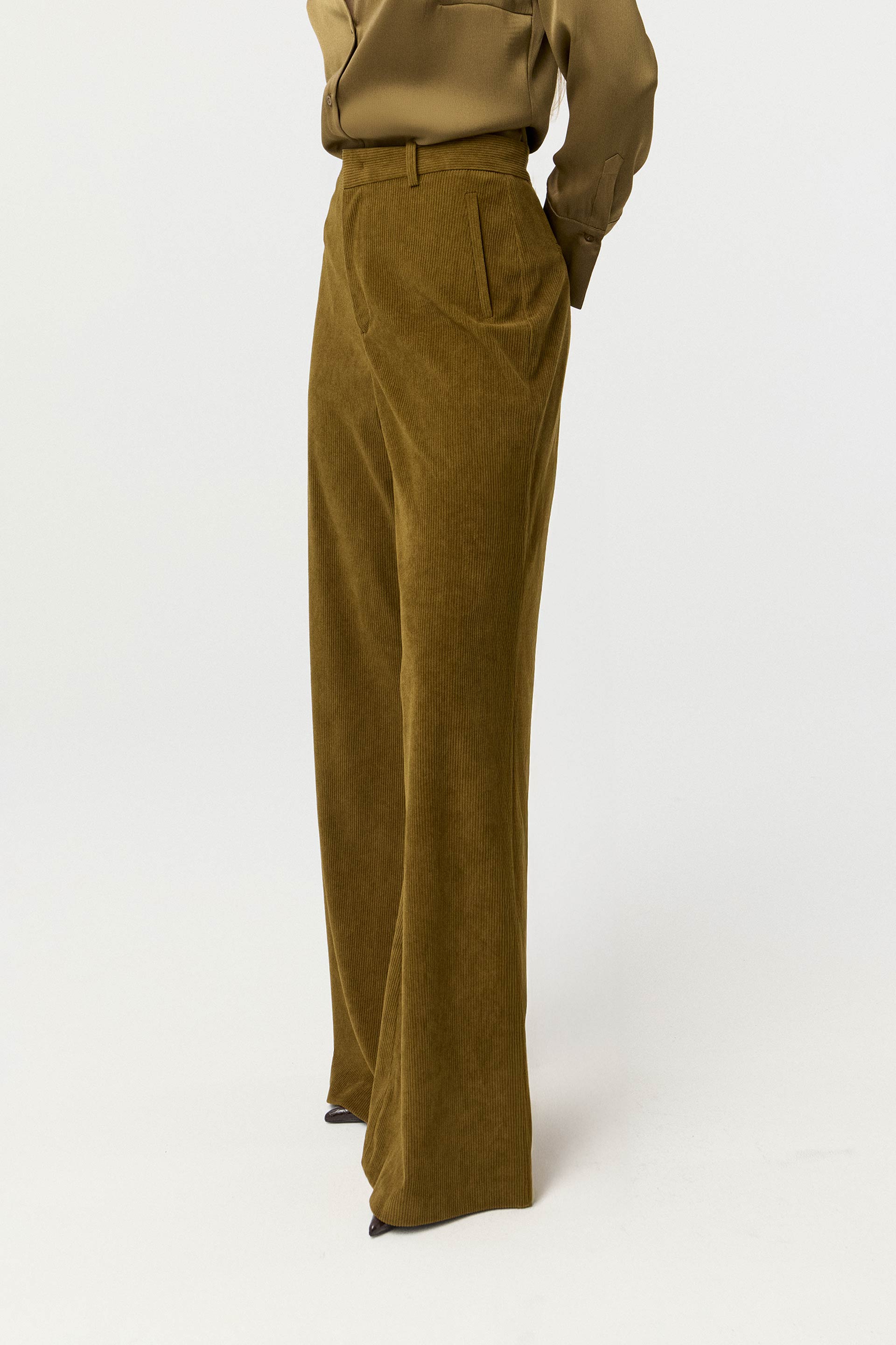 Pantalón de corderoy, de tiro alto y pierna palazzo. Posee acceso central con cierre y gancho pantalonero. Su género y silueta lo convierten en un ítem de absoluta tendencia. Ideal para crear looks modernos y cancheros. Combinalo con el chaleco Aneto y armá un total look.
