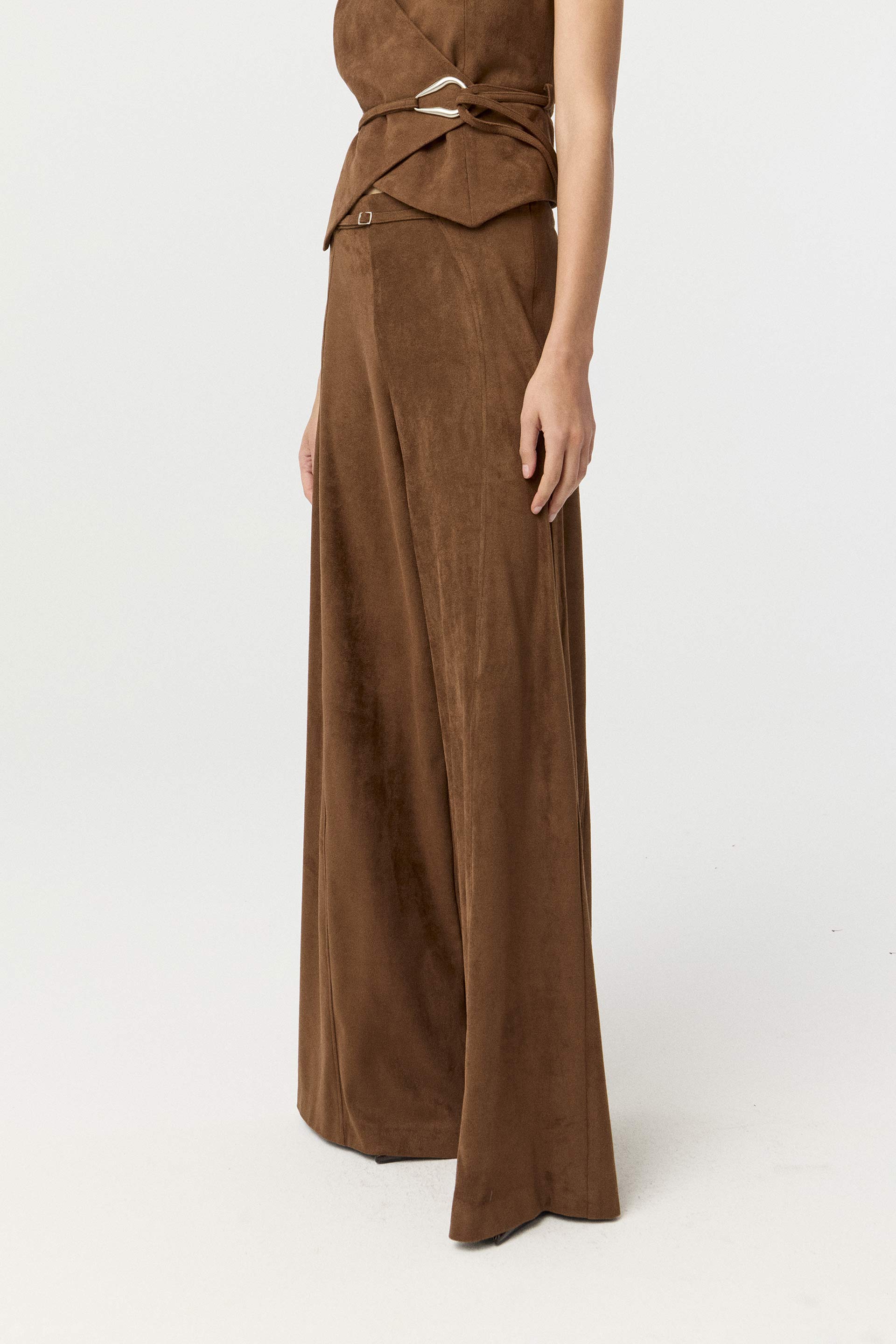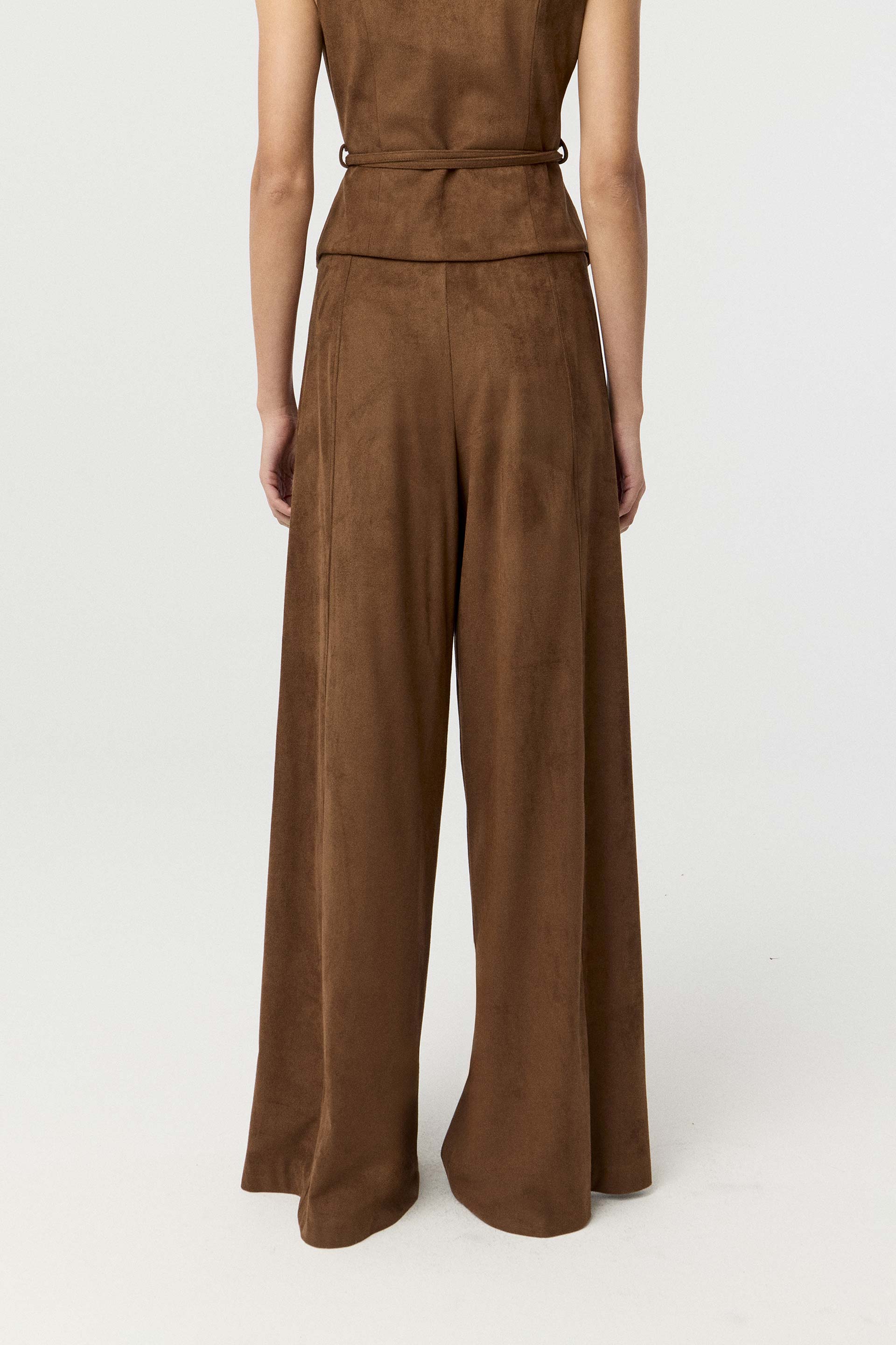 Pantalón efecto gamuza, de tiro alto y pierna palazzo. Posee recortes en delantero, acceso en el lateral con cierre invisible y tira que simula cinturón con hebilla metálica. Su silueta, género y color hacen de esta prenda un ítem moderno de absoluta tendencia. Combinalo con el chaleco Patrol y armá un total look ideal para lucirte en un evento.
