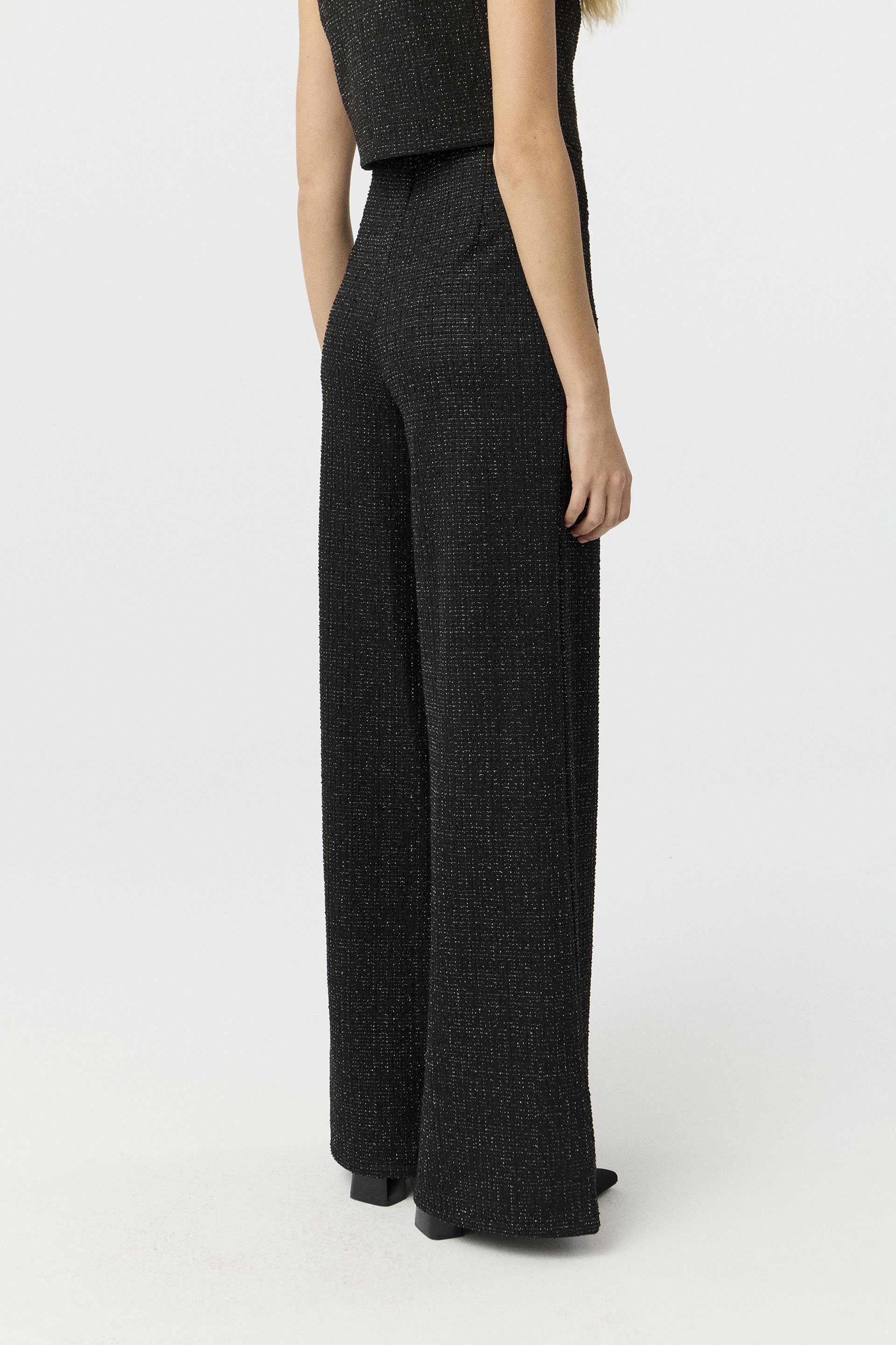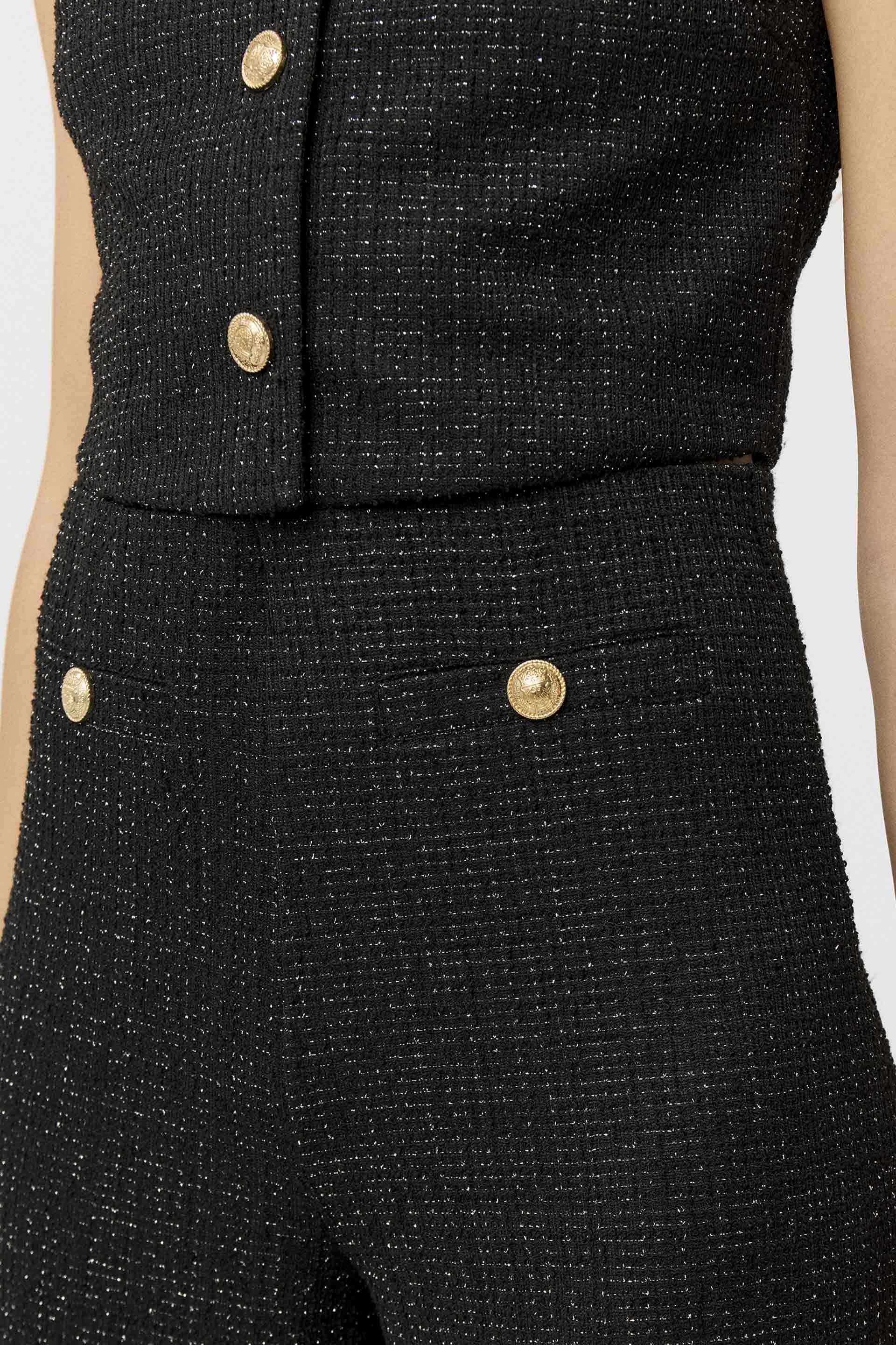 Pantalón de tweed de punto elastizado de tiro alto y pierna ancha. Cintura con elástico interno que se adapta al cuerpo y bolsillos con botones dorados en delantero. Combinalo con el chaleco Cervino y armá el total look.