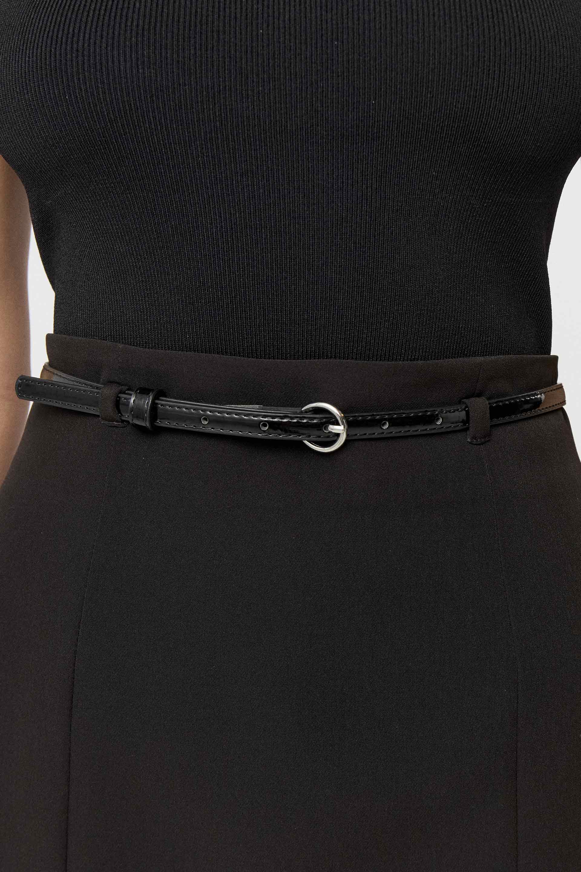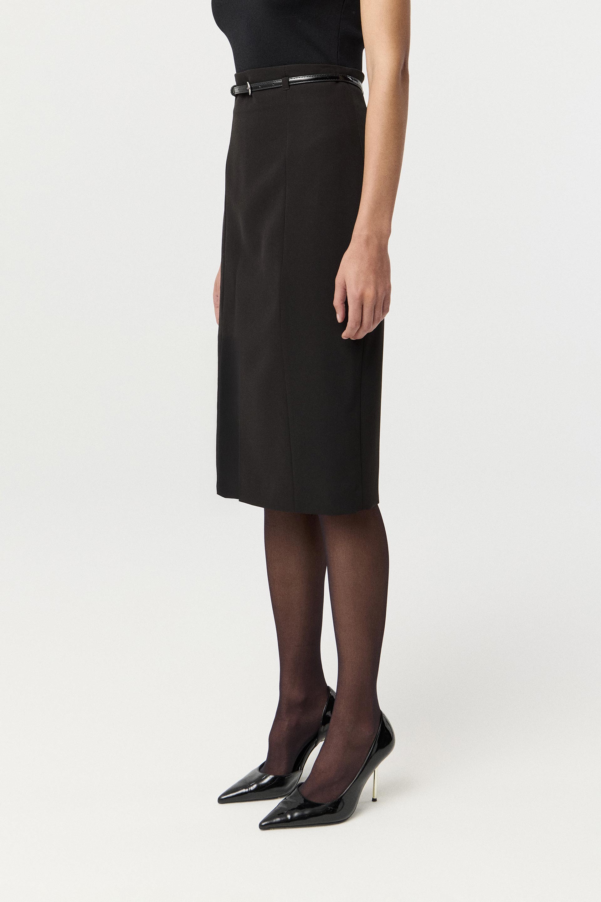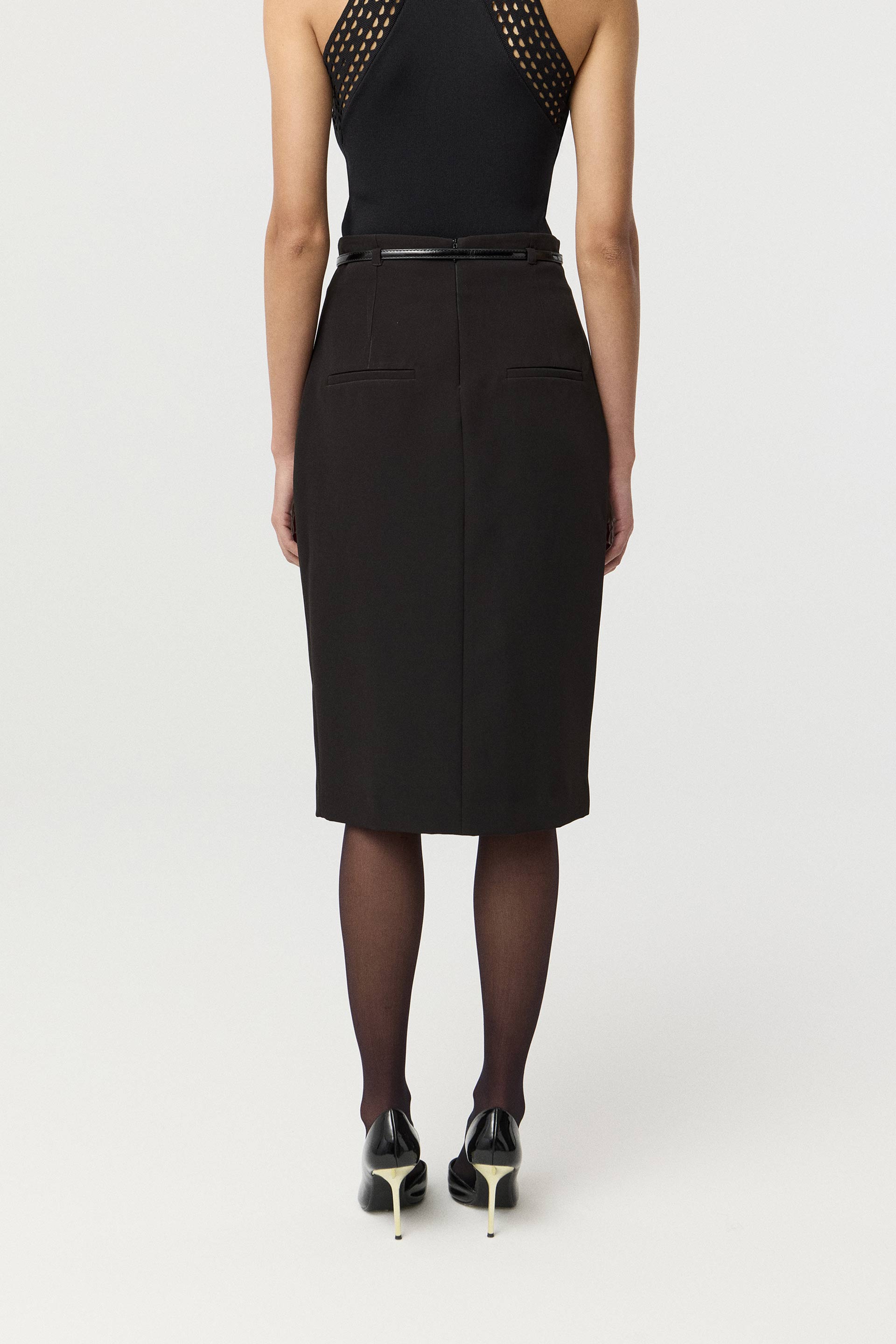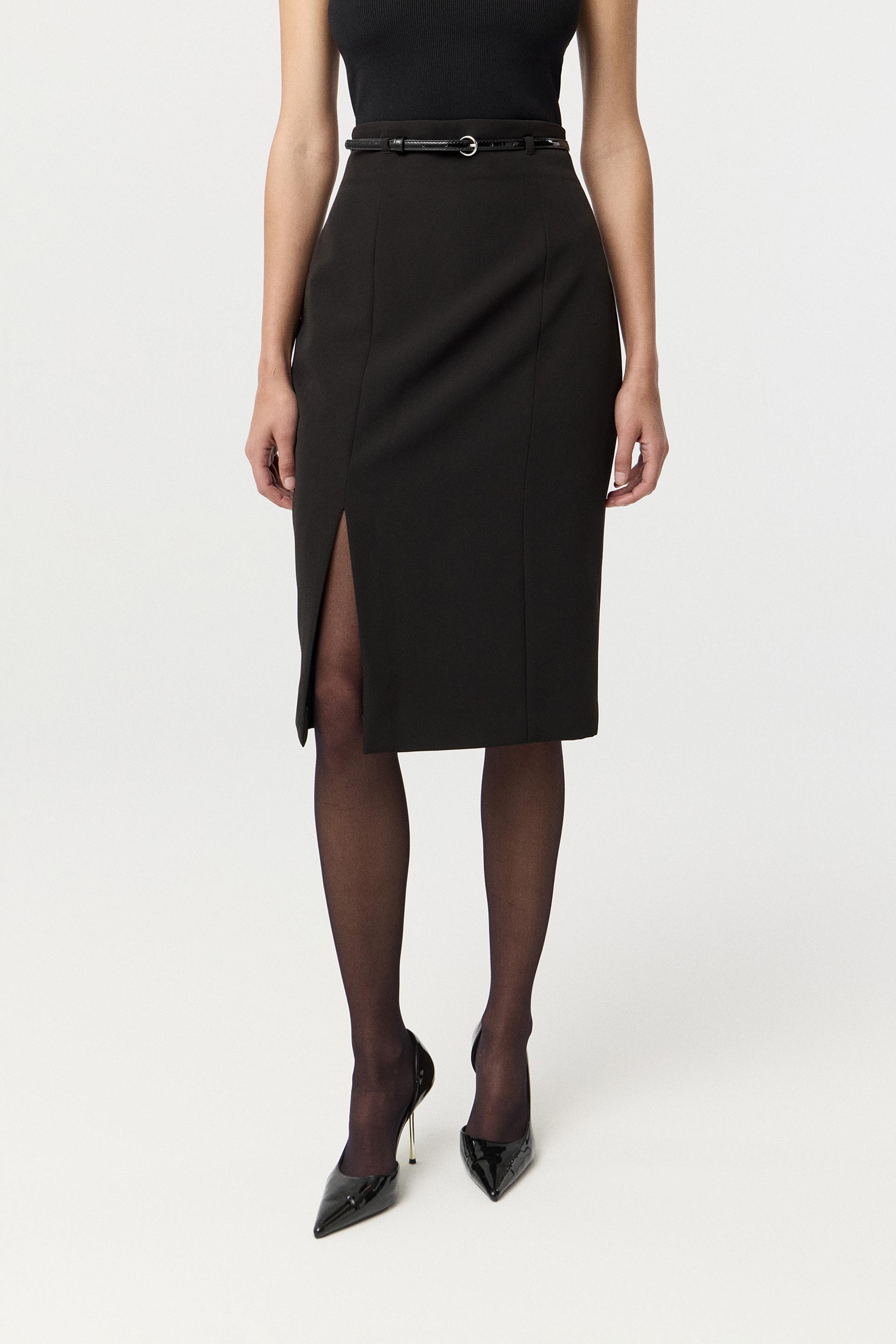 Pollera de sastrería elastizada, de tiro alto y silueta tubo. Posee recortes en el delantero con tajo, cinturón efecto charol con hebilla metálica y forrería elastizada para mayor confort. Su género contenedor y elegante la convierte en la prenda ideal para la oficina.