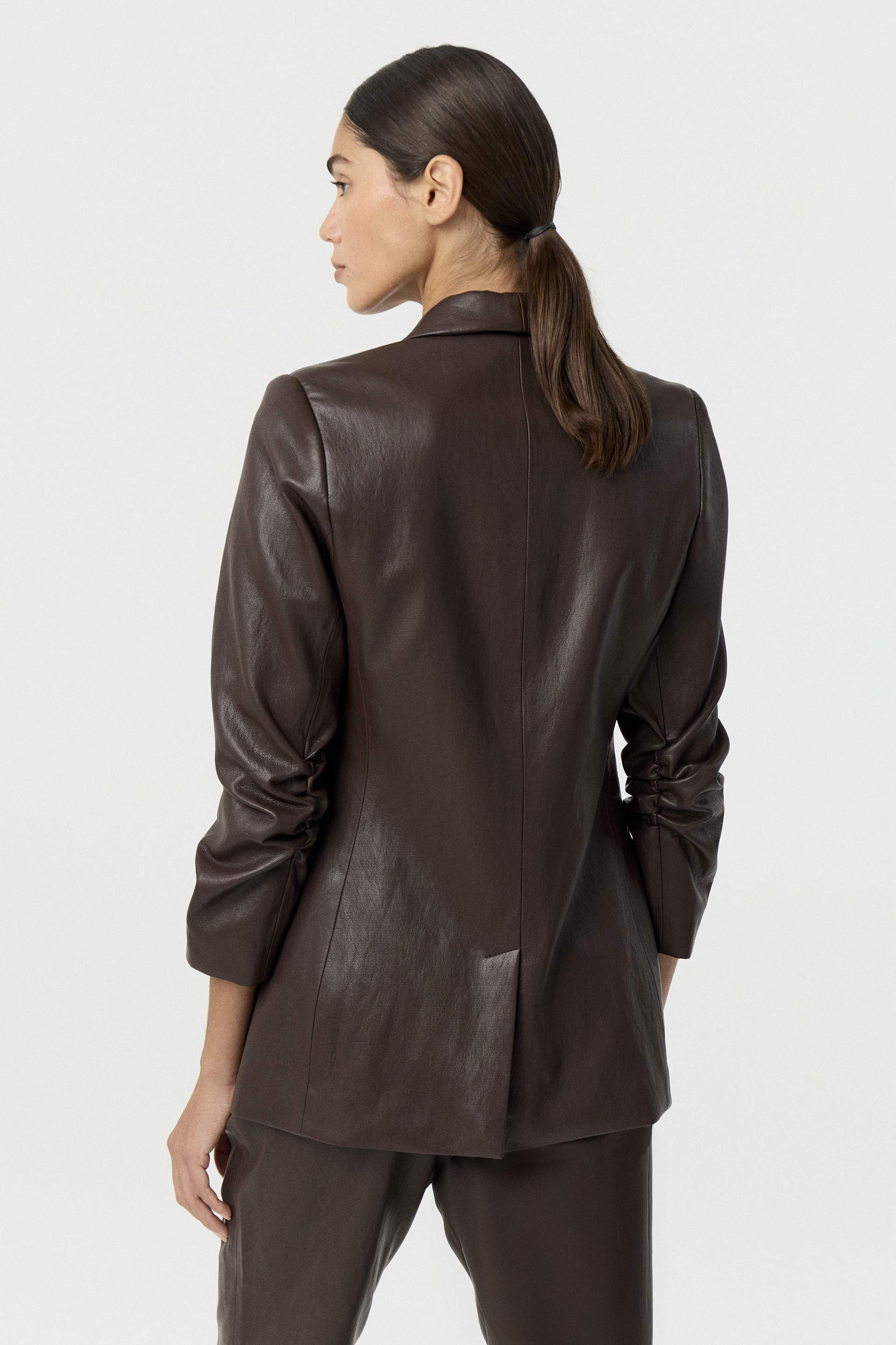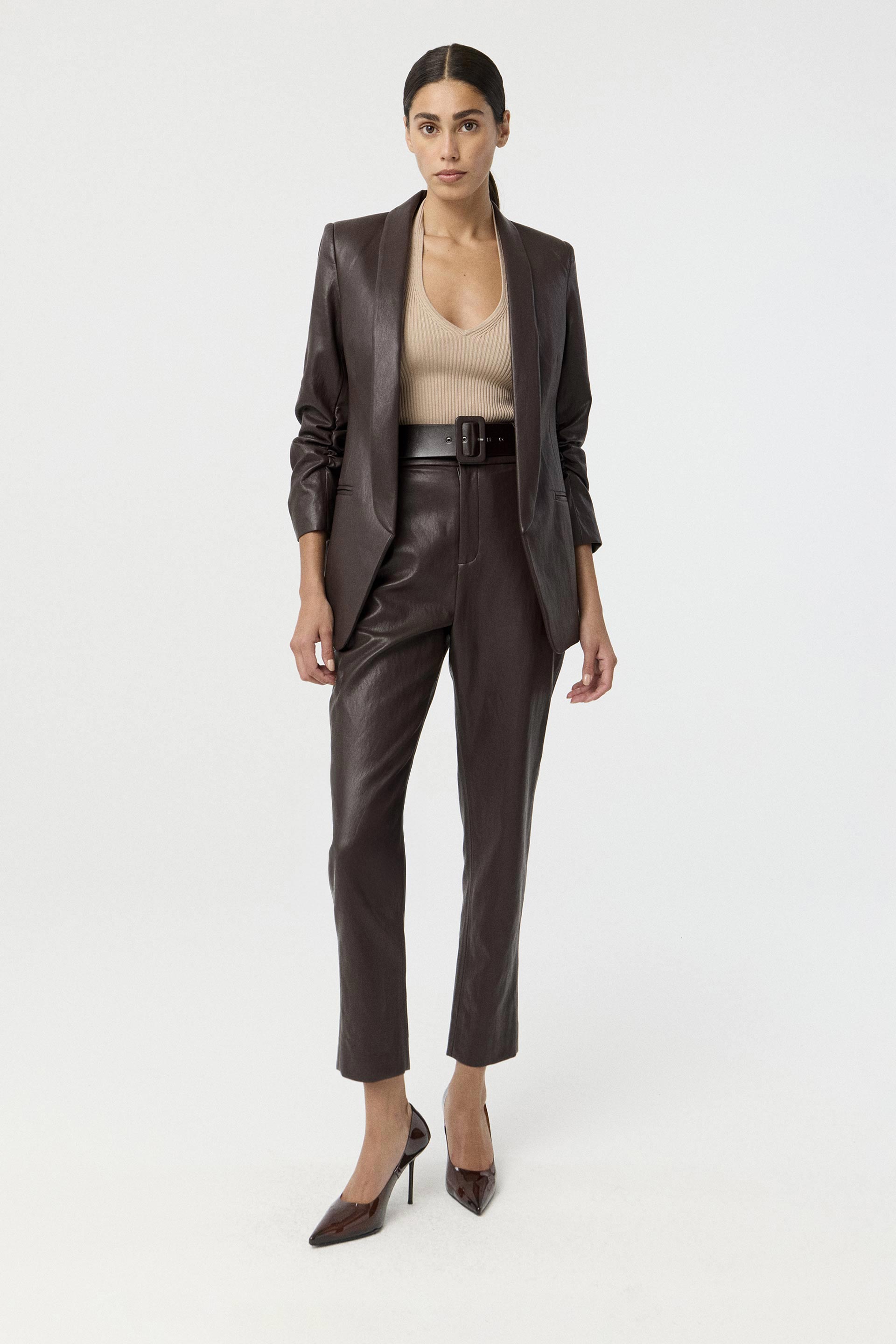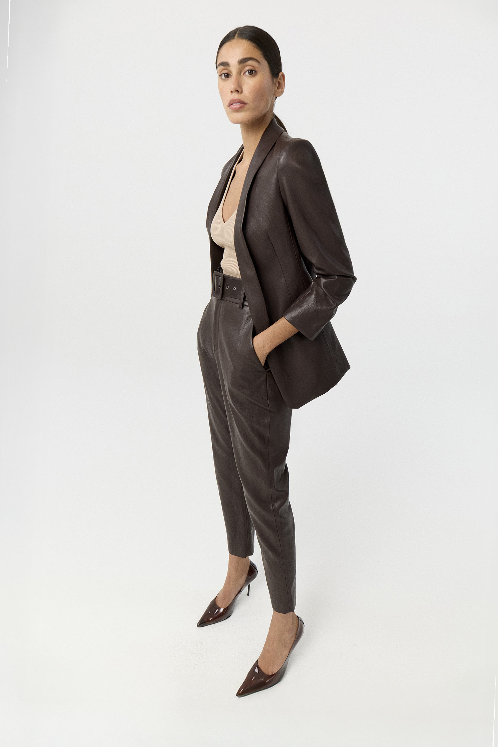 Blazer largo efecto cuero encerado, de silueta relajada, con solapa smoking y mangas 3/4 con frunce. Su interior está forrado en satén elastizado aportando extra confort. Su género ultra suave al tacto, su largo a la cadera y su color de tendencia lo convierten en un ítem súper moderno, fácil de combinar tanto con jeans como con el pantalón Evelyn para completar un total look.