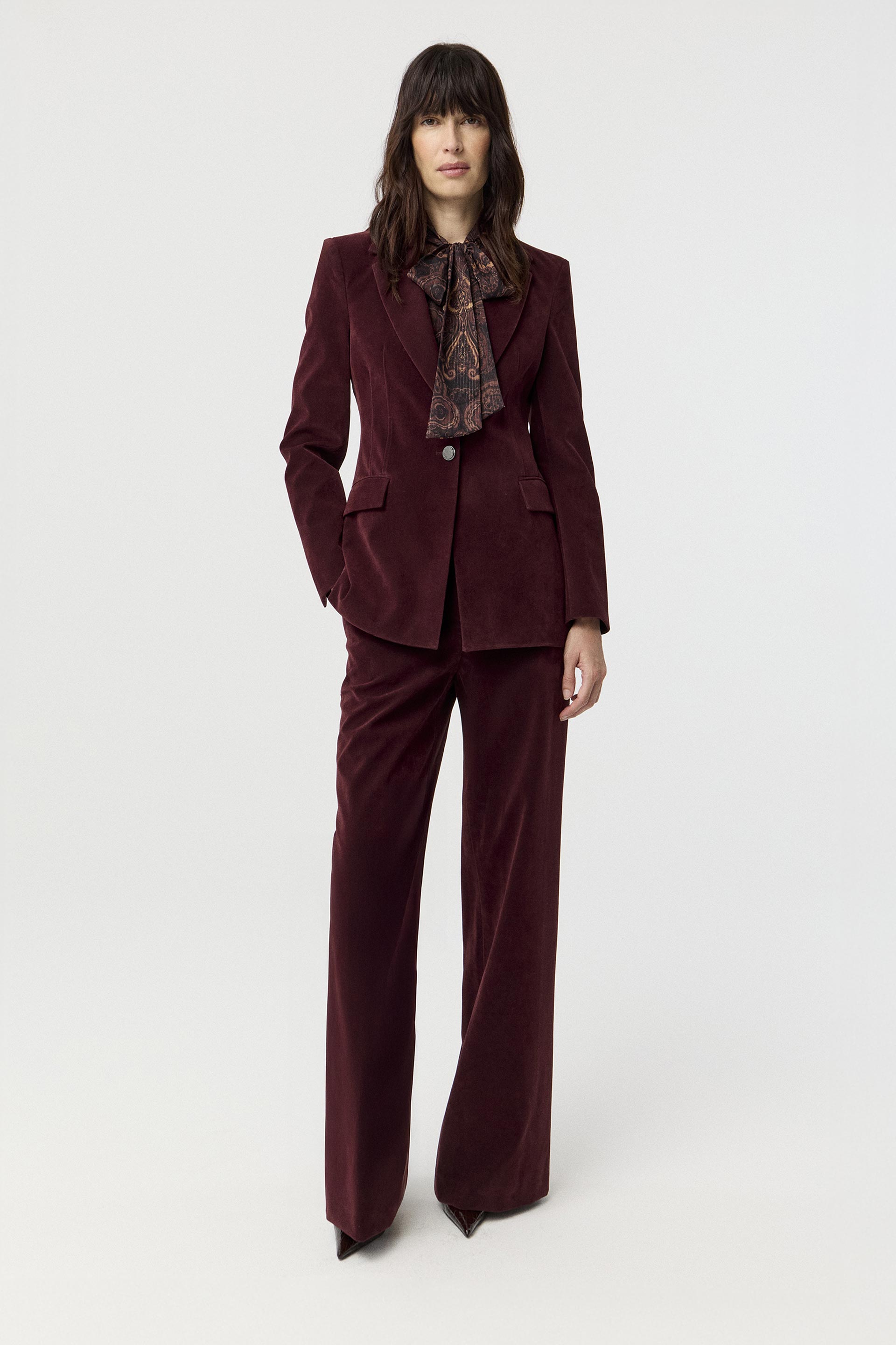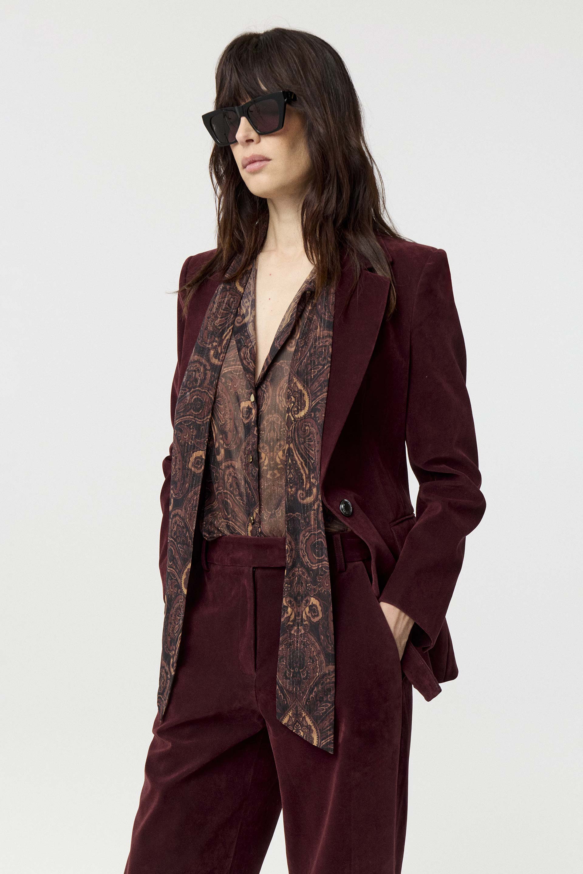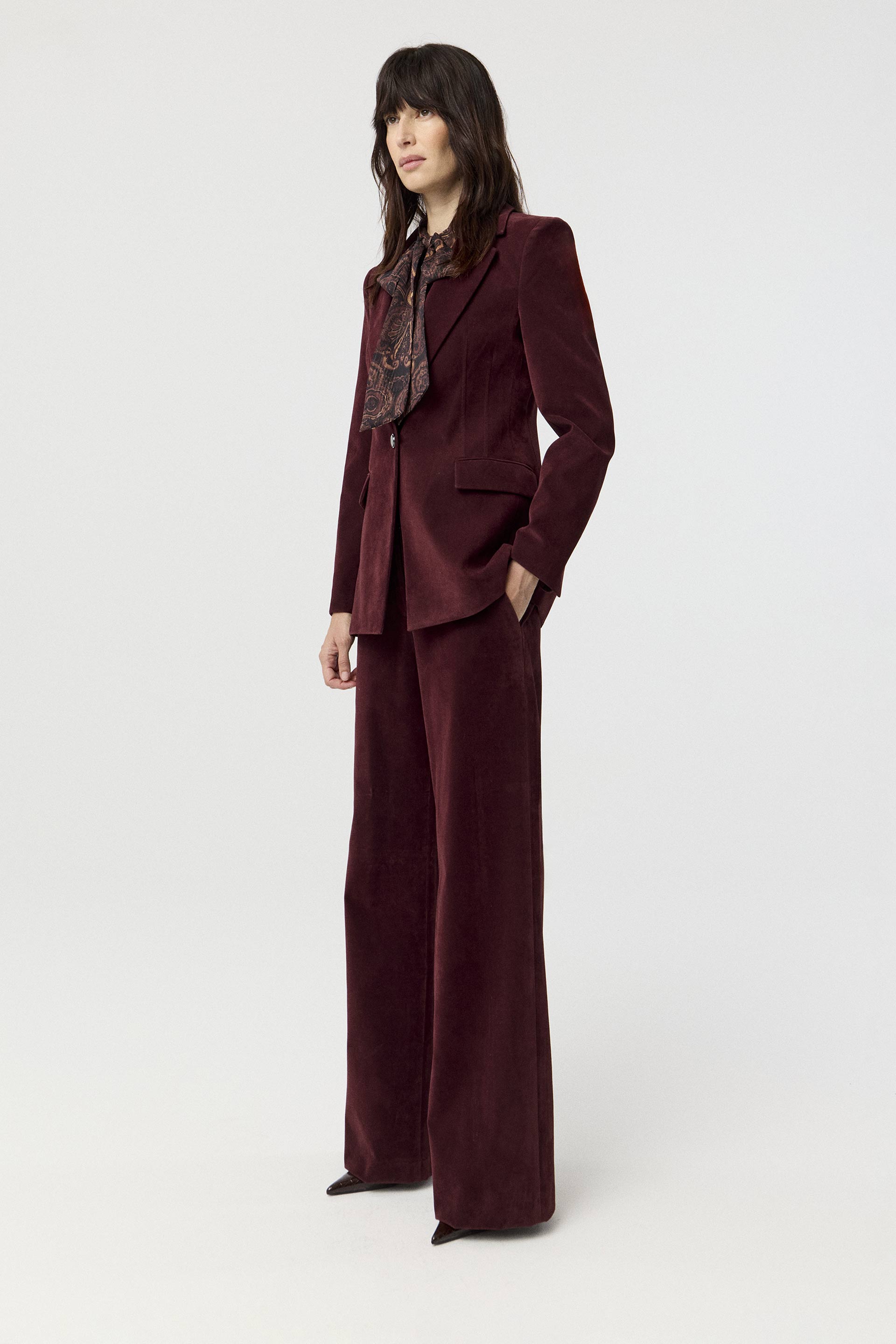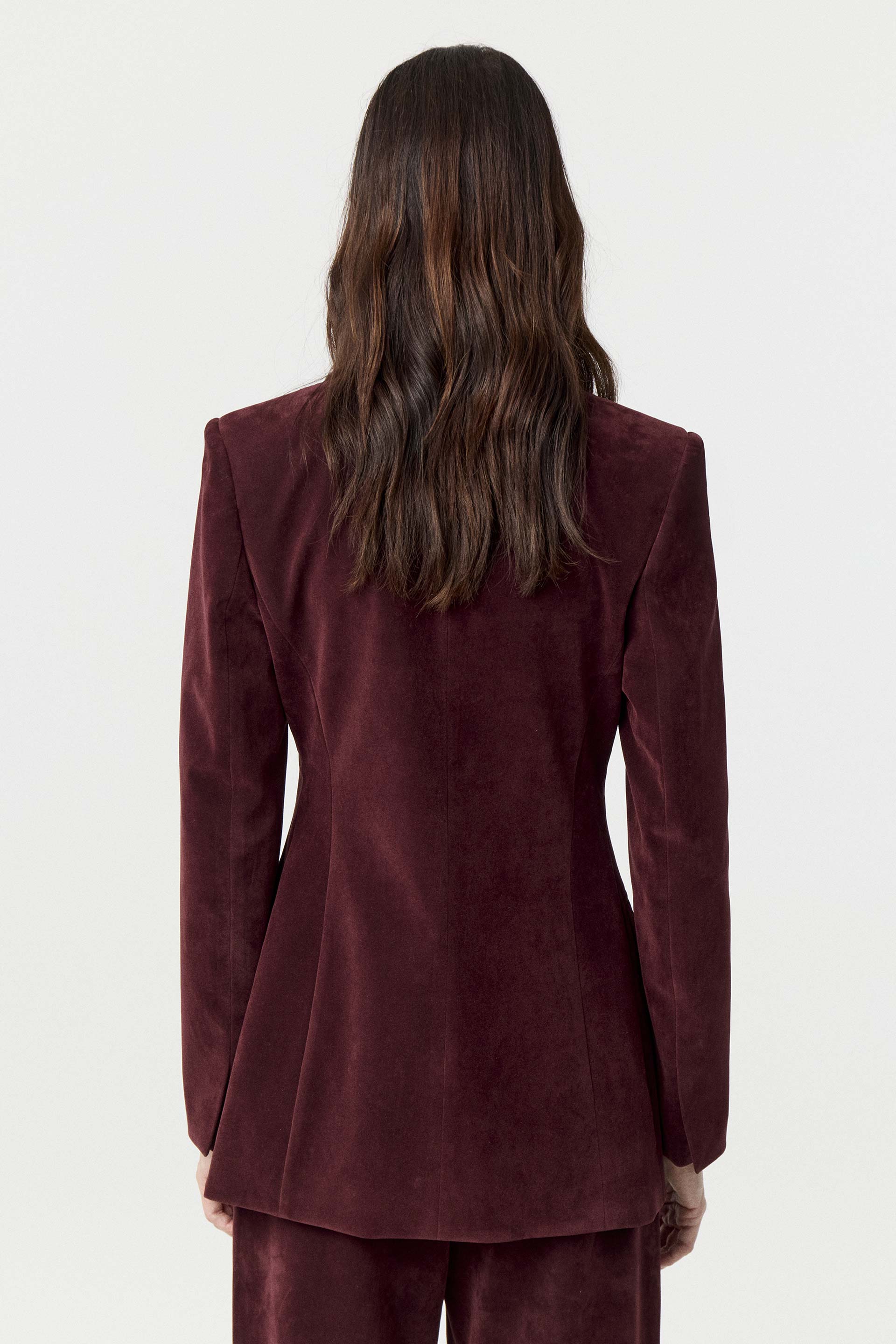 Blazer largo efecto gamuza, de silueta entallada y mangas largas. Su interior está forrado en acetato diagonal para otorgarle mayor estructura. Posee acceso central con botón personalizado MKV. Su silueta, su género y su color lo convierten en un ítem de absoluta tendencia. Combinalo con el pantalón o con el skort Droll y armá un total look canchero y moderno.