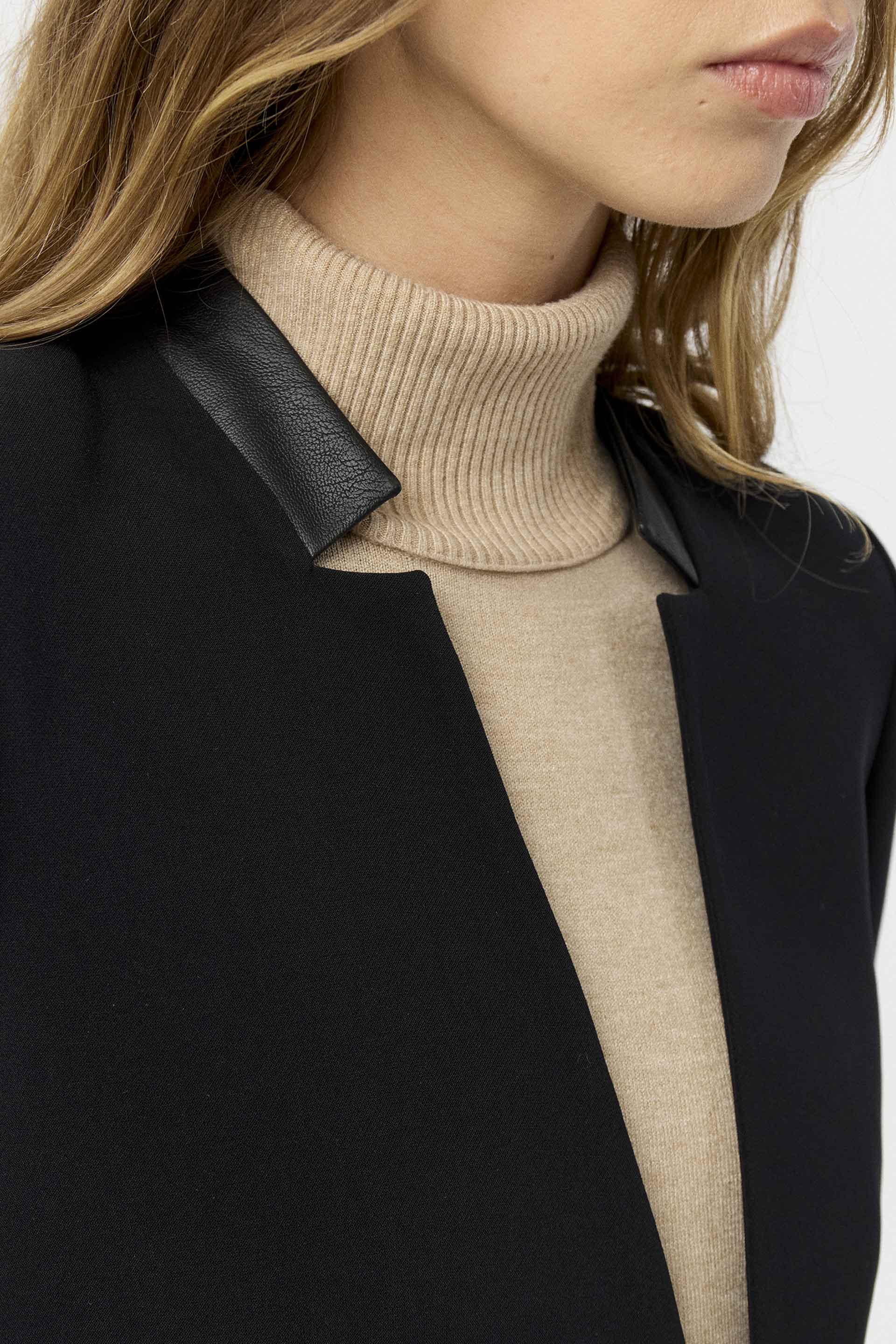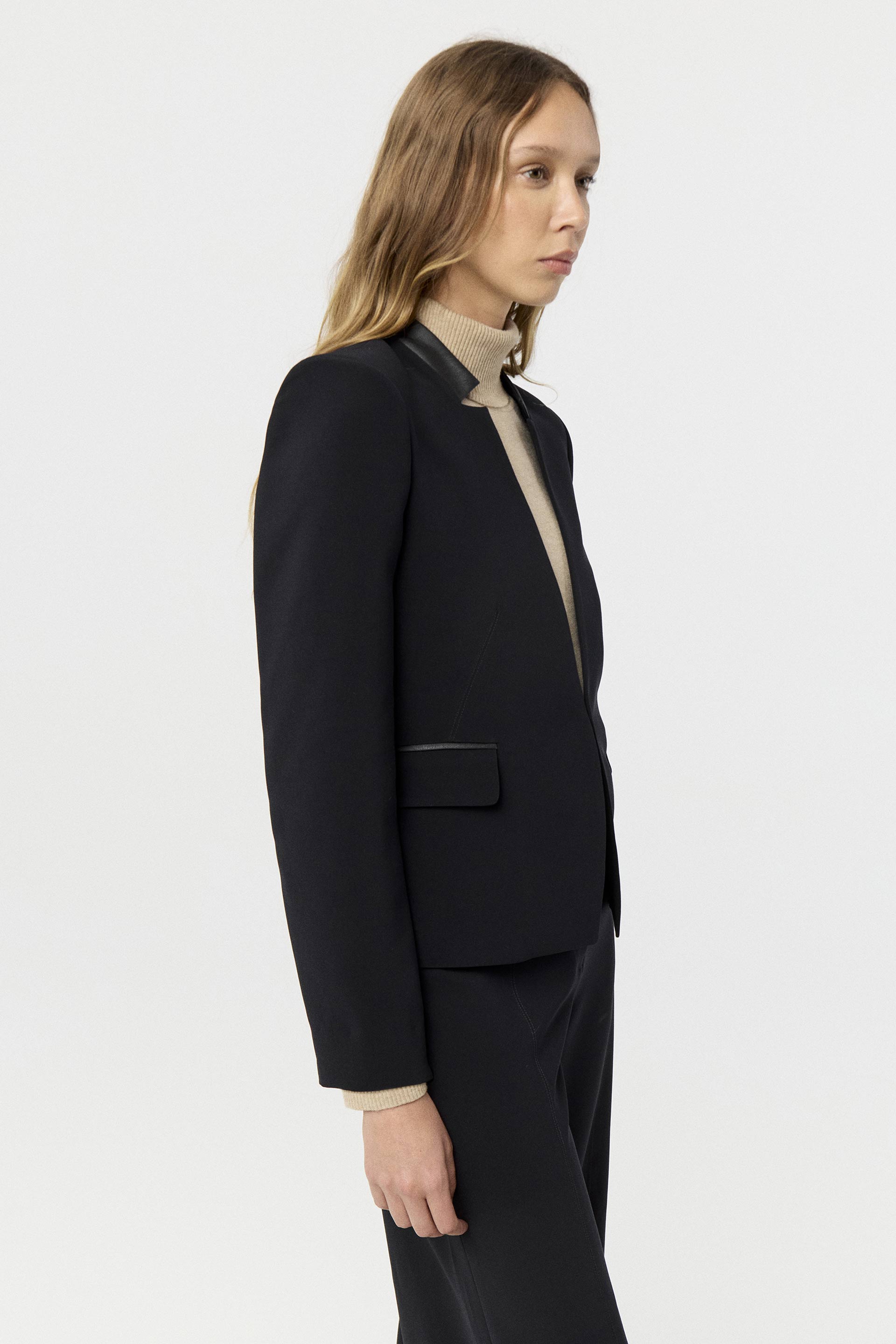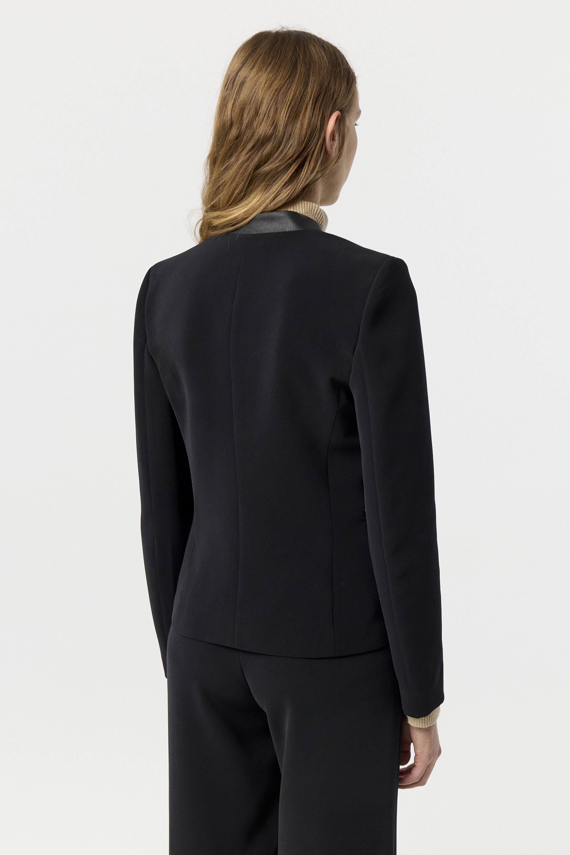 Blazer corto de crepe elastizado, de silueta entallada y manga larga. Su interior está forrado con satén elastizado generando extra confort. Posee cuello combinado en tela efecto cuero y acceso con gancho sastrero. Un blazer clásico pero con twist moderno. Combinalo con el pantalón Lumbre para armar un total look sastrero, idea para la oficina.