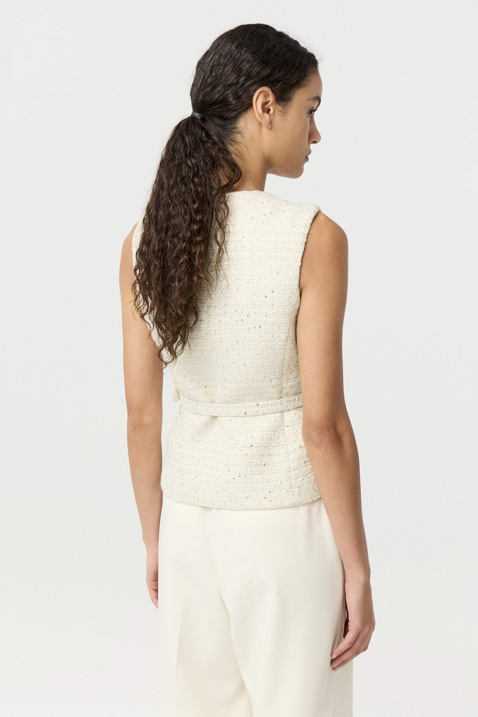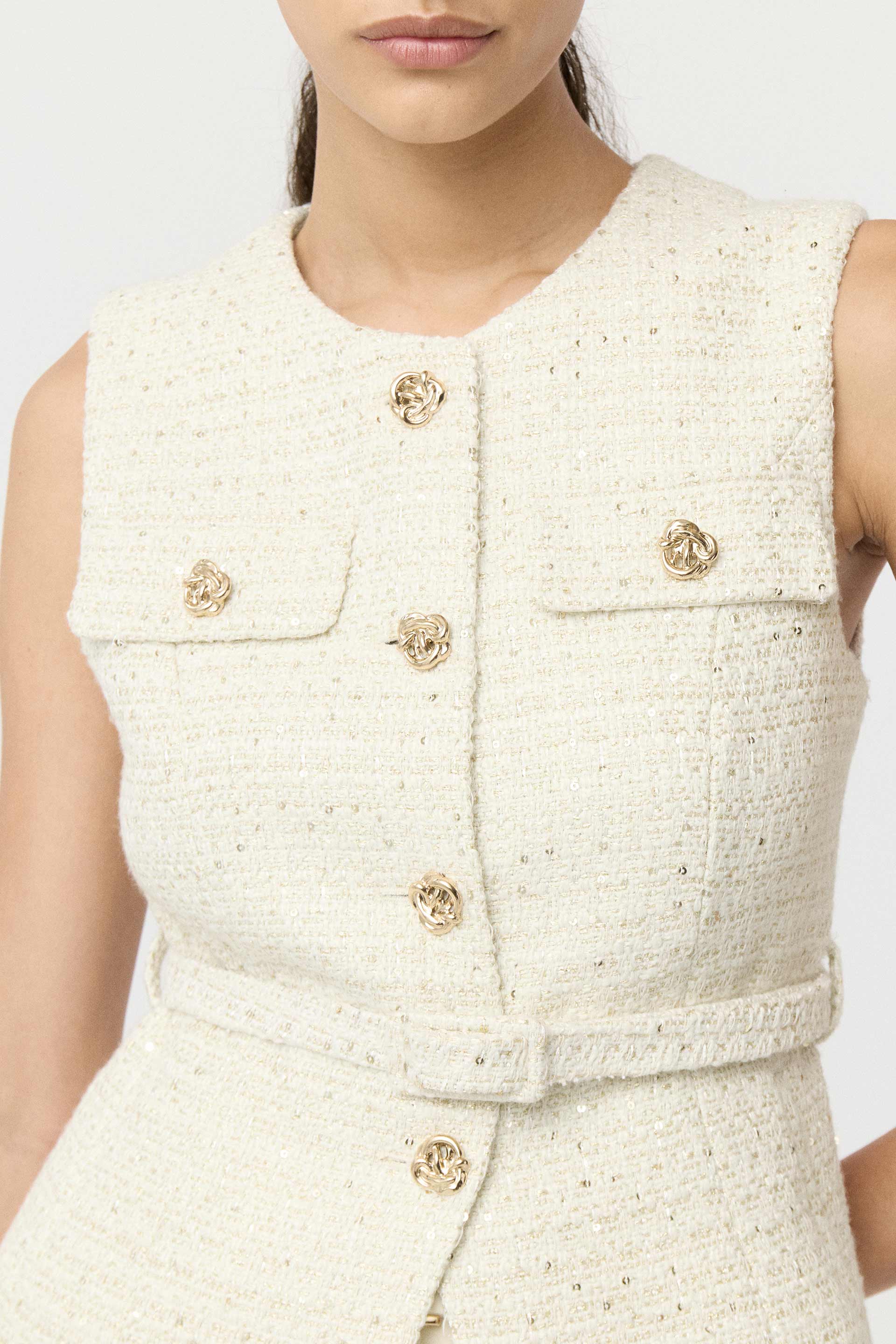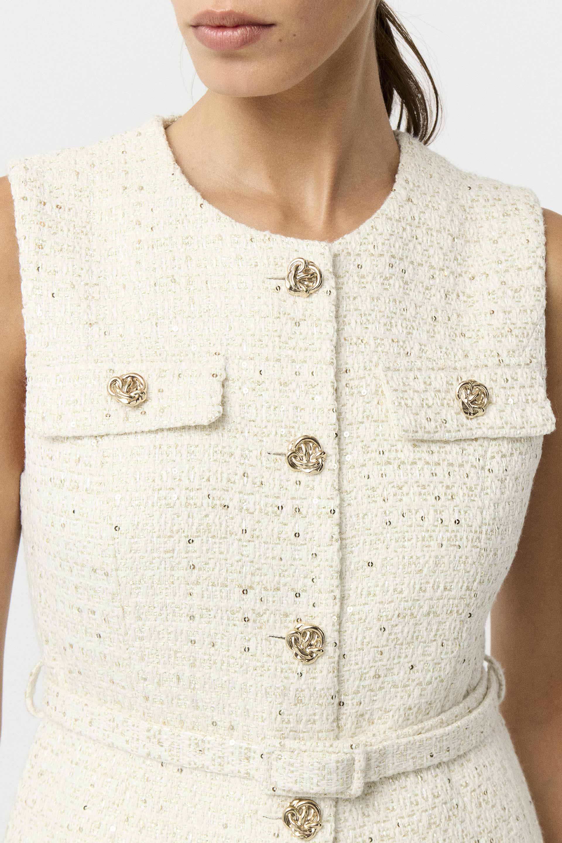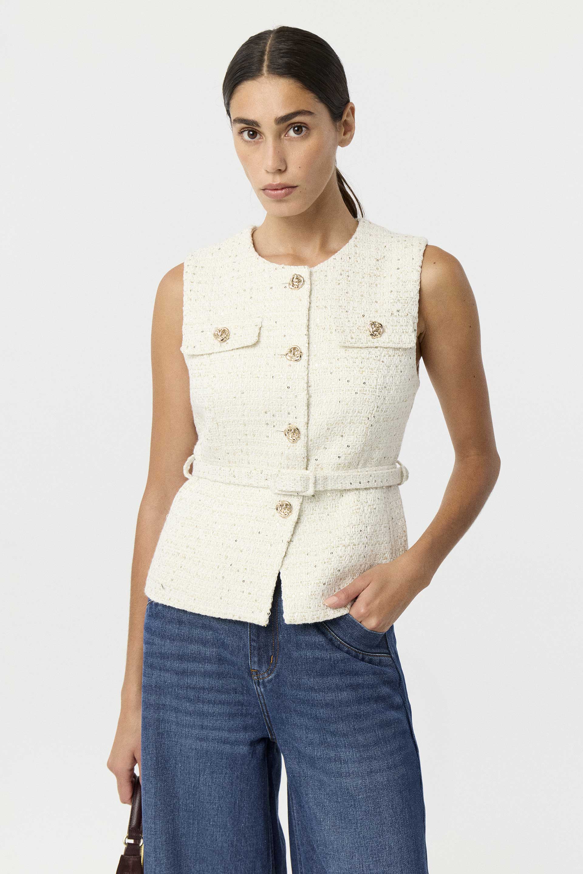 Chaleco de tweed, de silueta entallada y escote redondo. Posee acceso con botones metálicos y cinturón forrado en la misma tela. Su diseño y su género lo convierten en un ítem de absoluta tendencia. Combinalo con un pantalón sastrero o con jeans y armá un look moderno y sofisticado.
