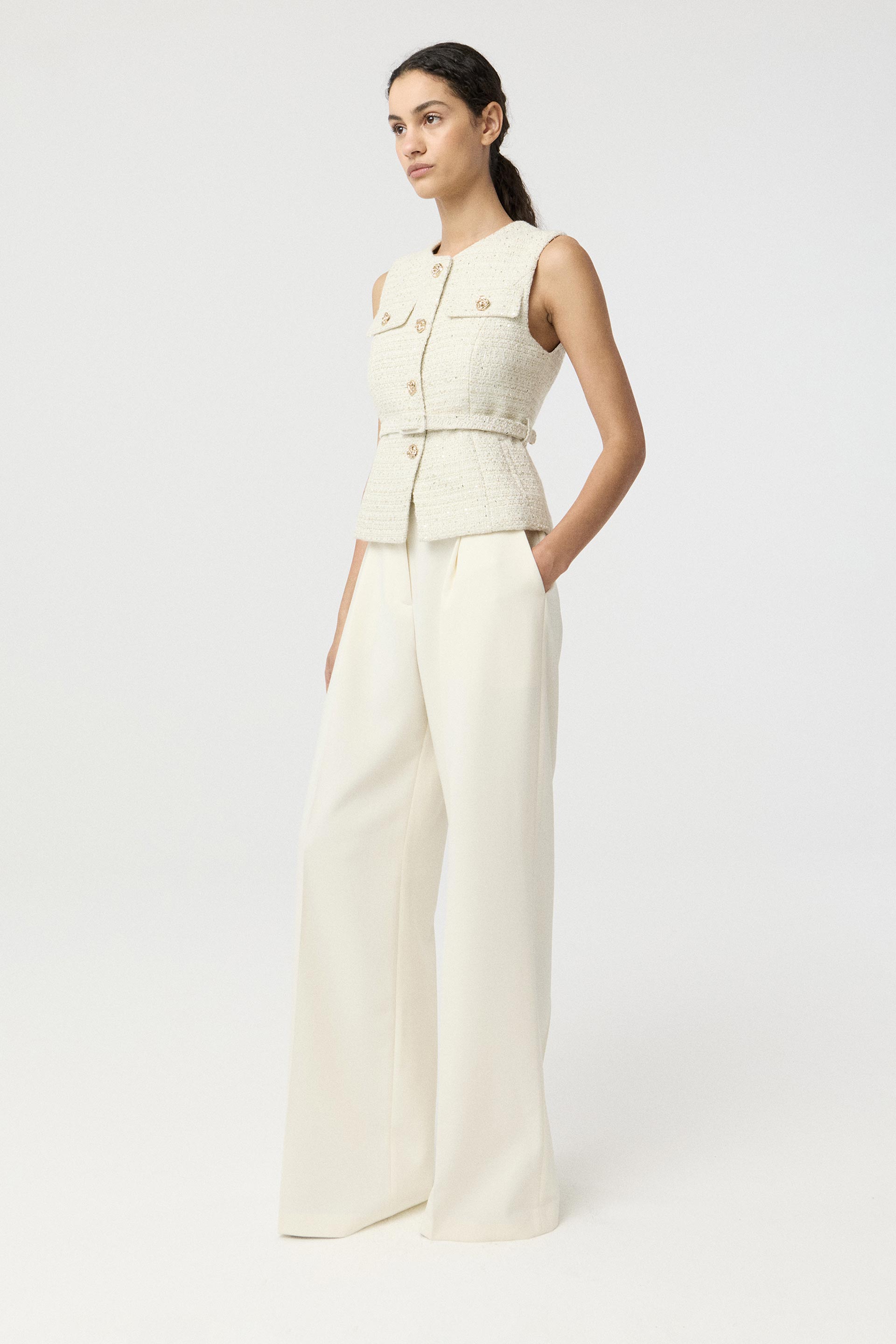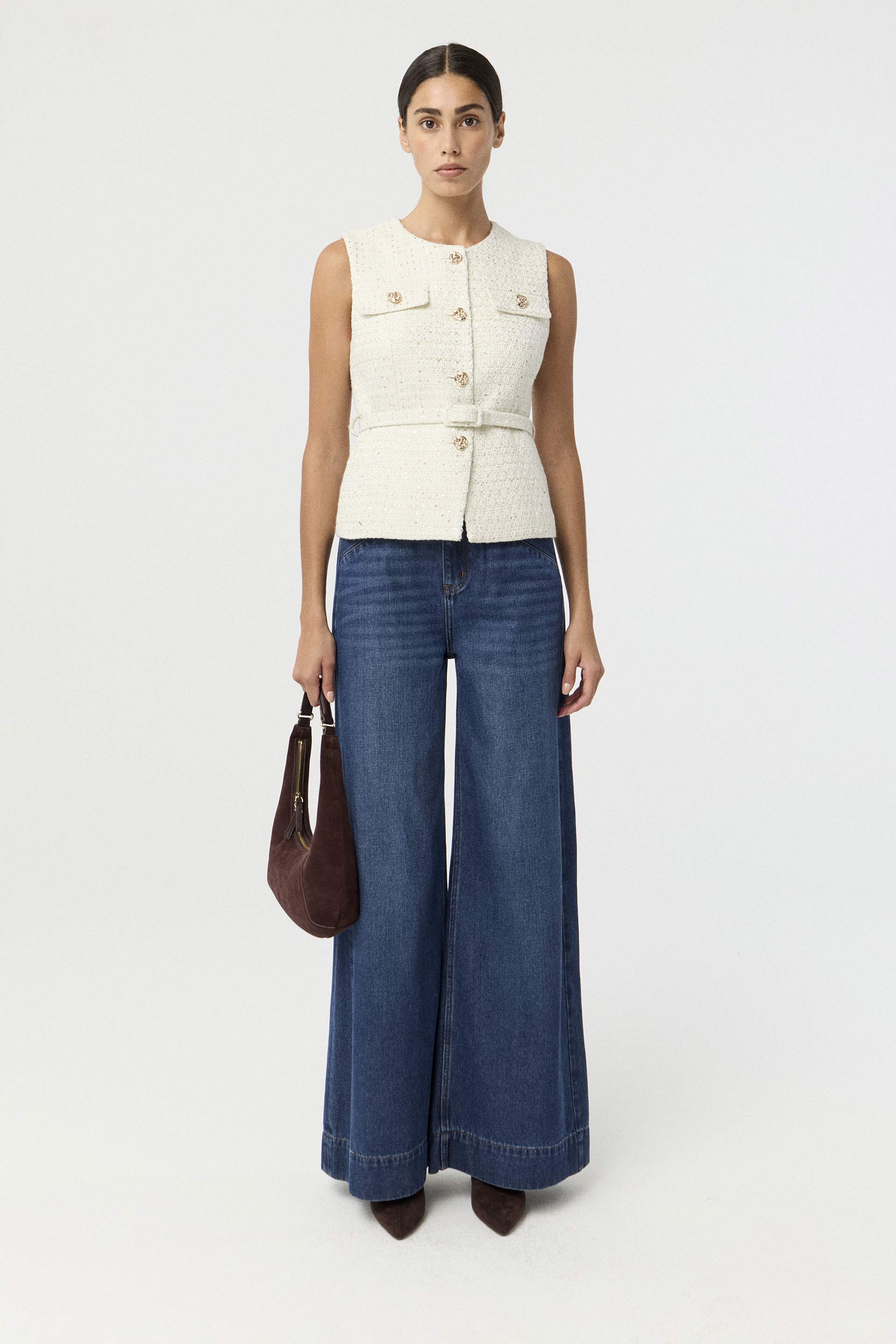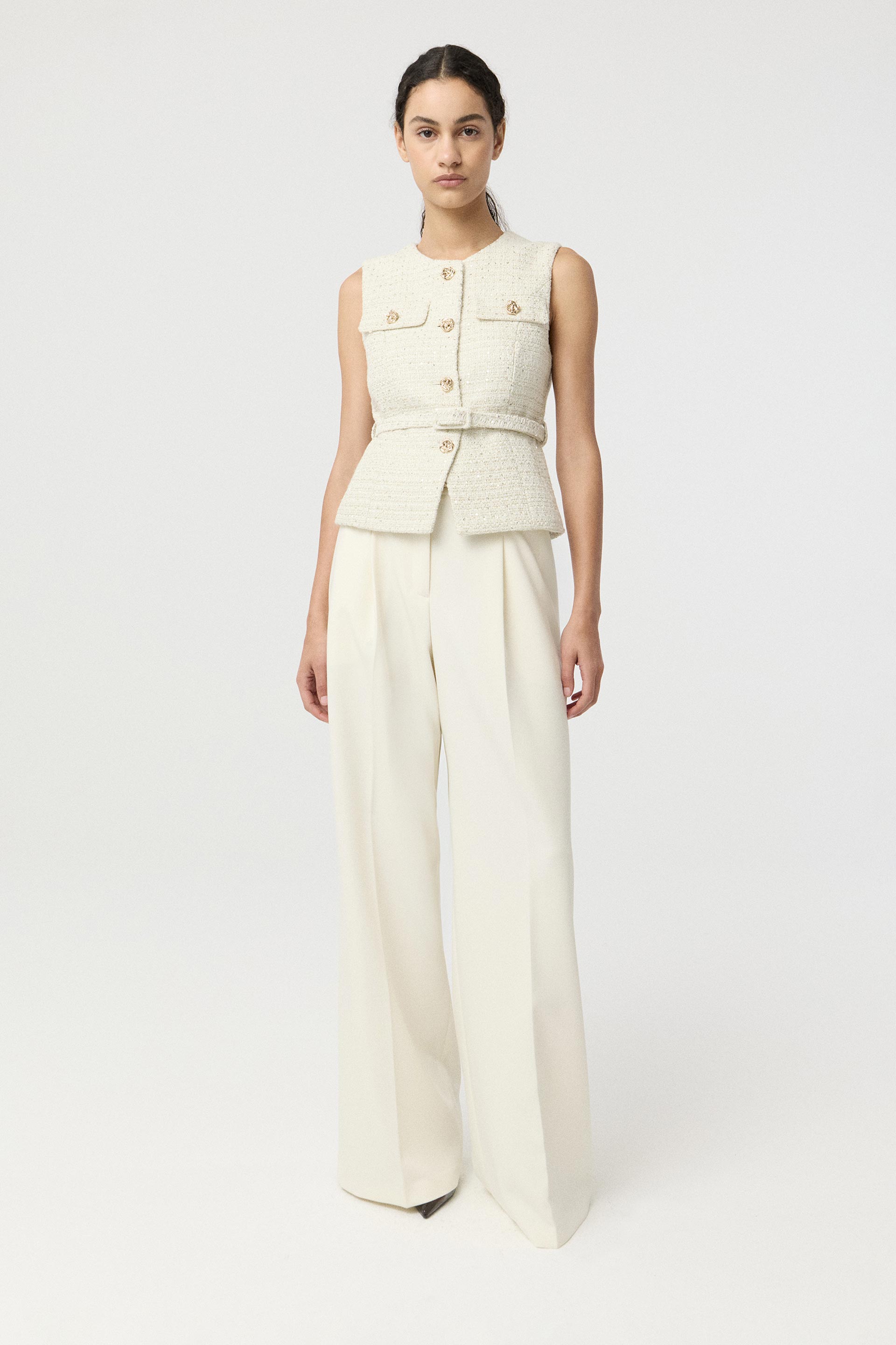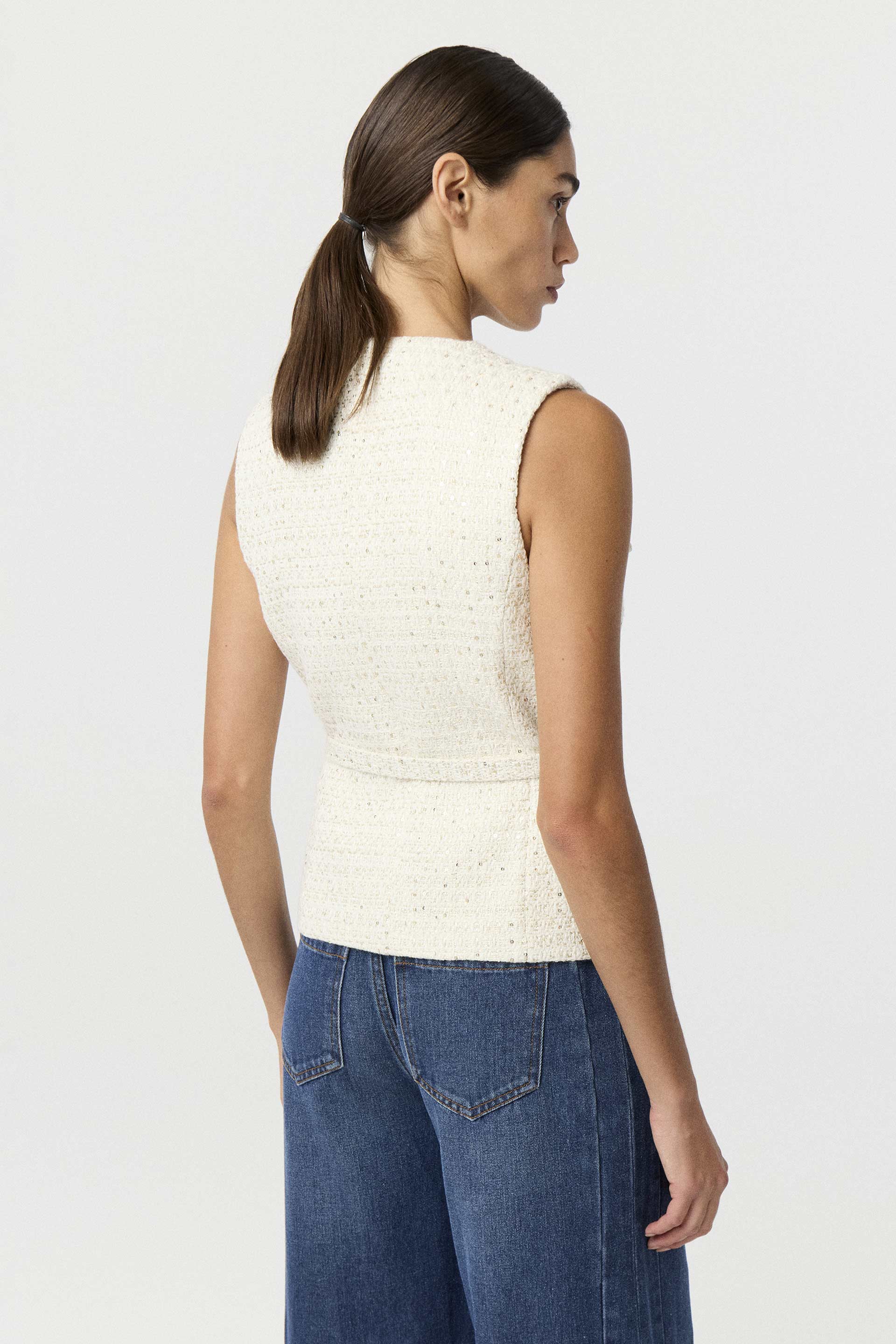 Chaleco de tweed, de silueta entallada y escote redondo. Posee acceso con botones metálicos y cinturón forrado en la misma tela. Su diseño y su género lo convierten en un ítem de absoluta tendencia. Combinalo con un pantalón sastrero o con jeans y armá un look moderno y sofisticado.