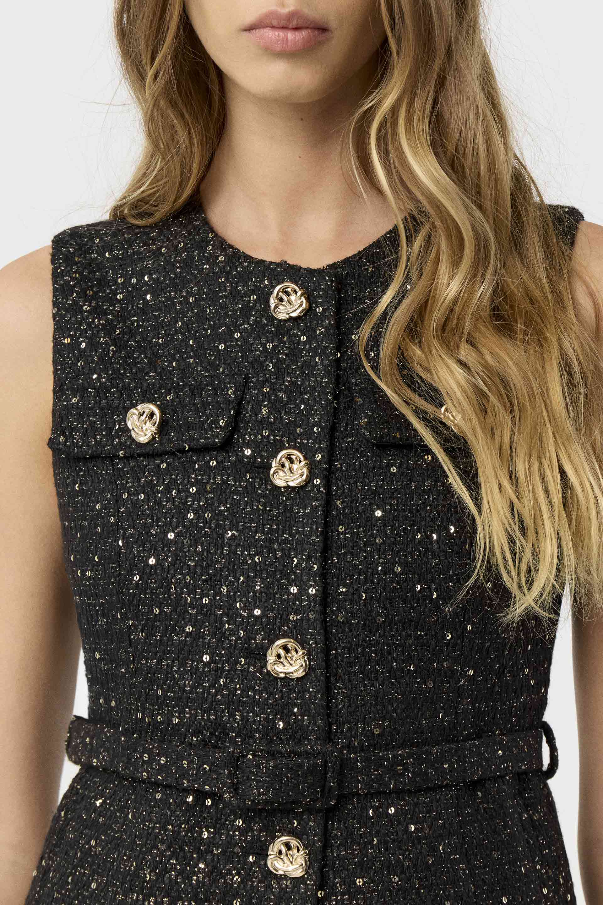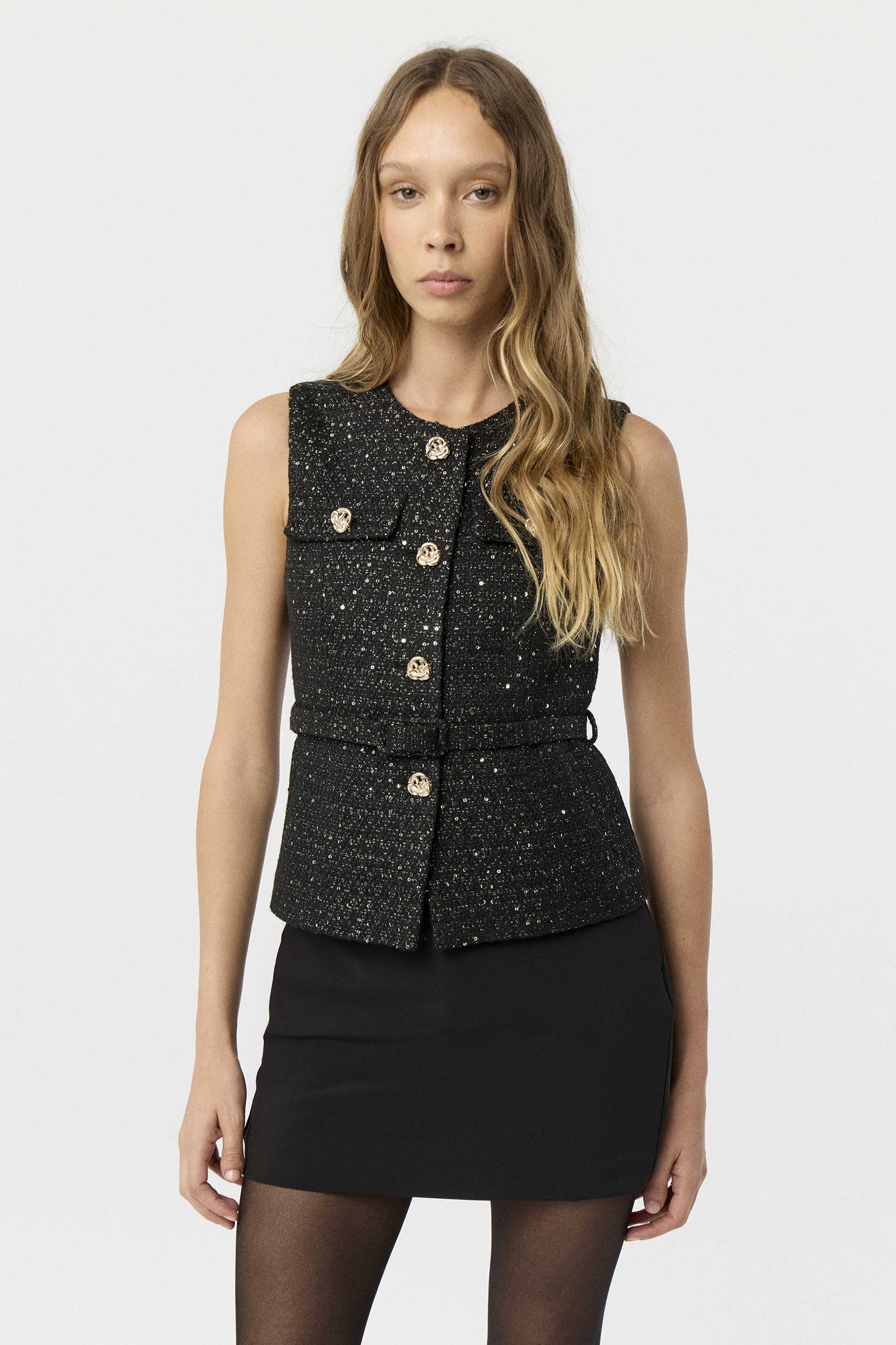Chaleco de tweed, de silueta entallada y escote redondo. Posee acceso con botones metálicos y cinturón forrado en la misma tela. Su diseño y su género lo convierten en un ítem de absoluta tendencia. Combinalo con un pantalón sastrero o con jeans y armá un look moderno y sofisticado.