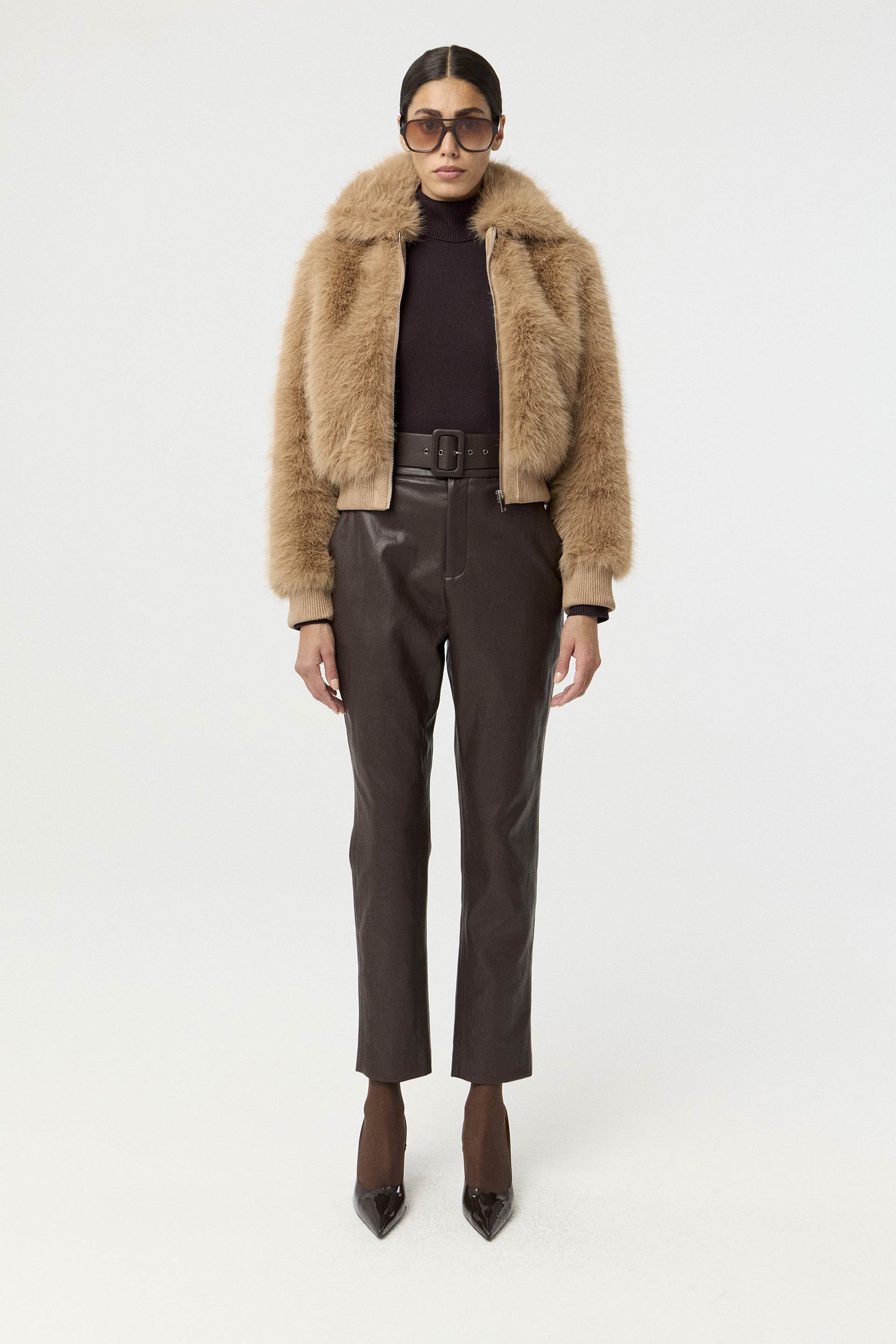 Chaqueta efecto cuero premium, de silueta entallada y manga larga. Posee acceso con cierre doble carro, broche metálico personalizado MKV en cuello y cierres en bolsillos. Una chaqueta clásica y moderna que no puede faltarte en tu guardarropas, ideal tanto para el día como para la noche.