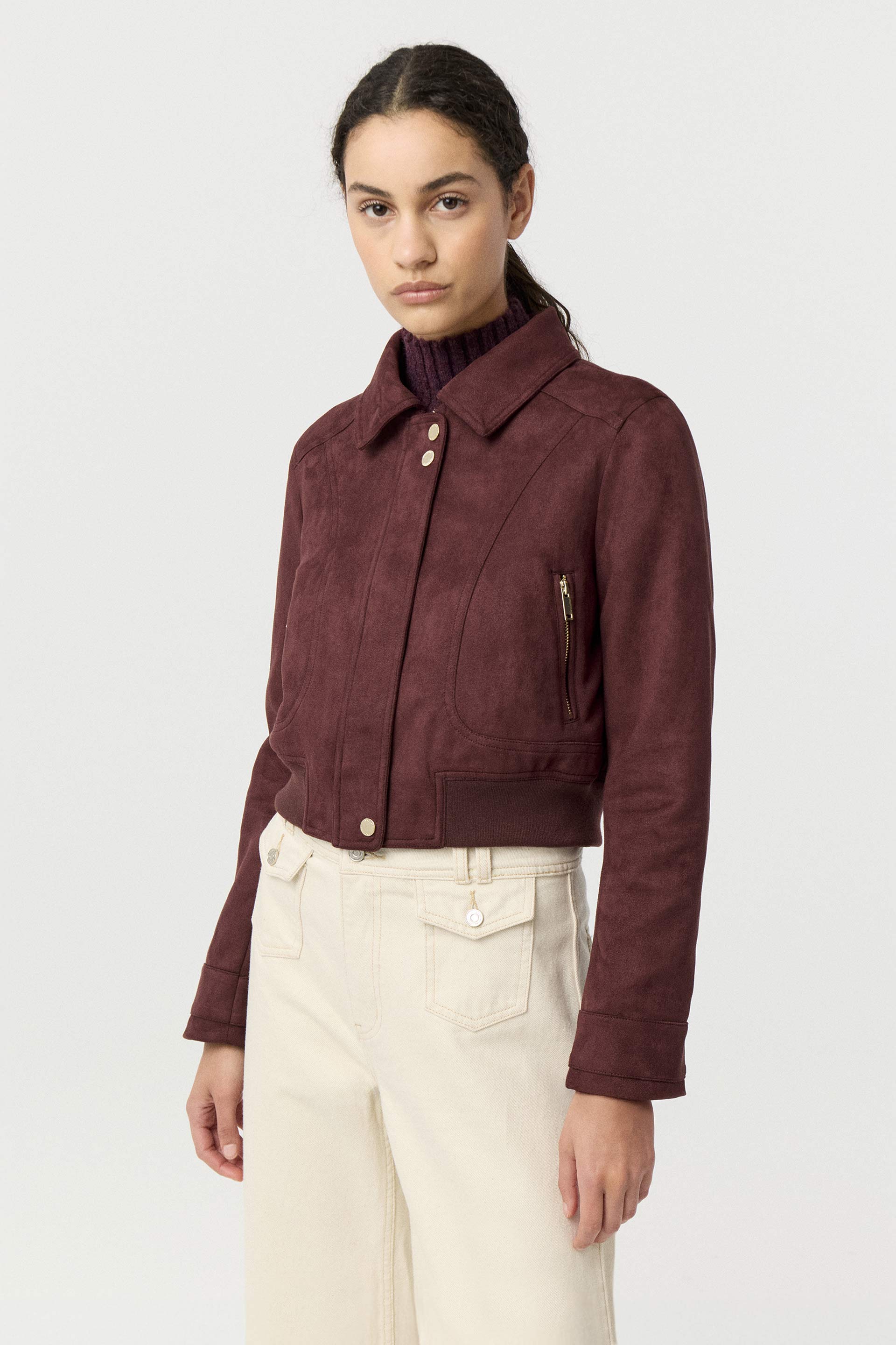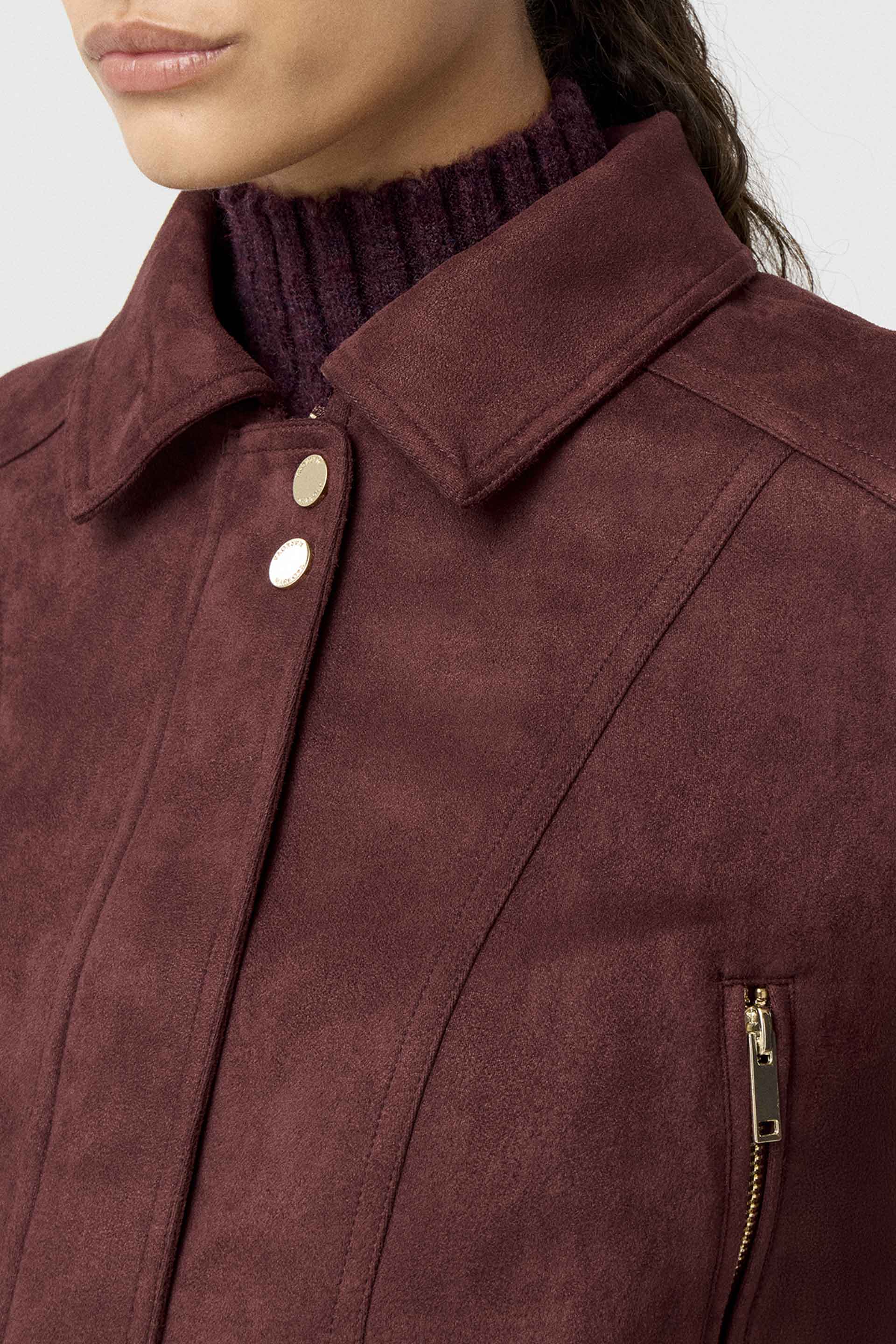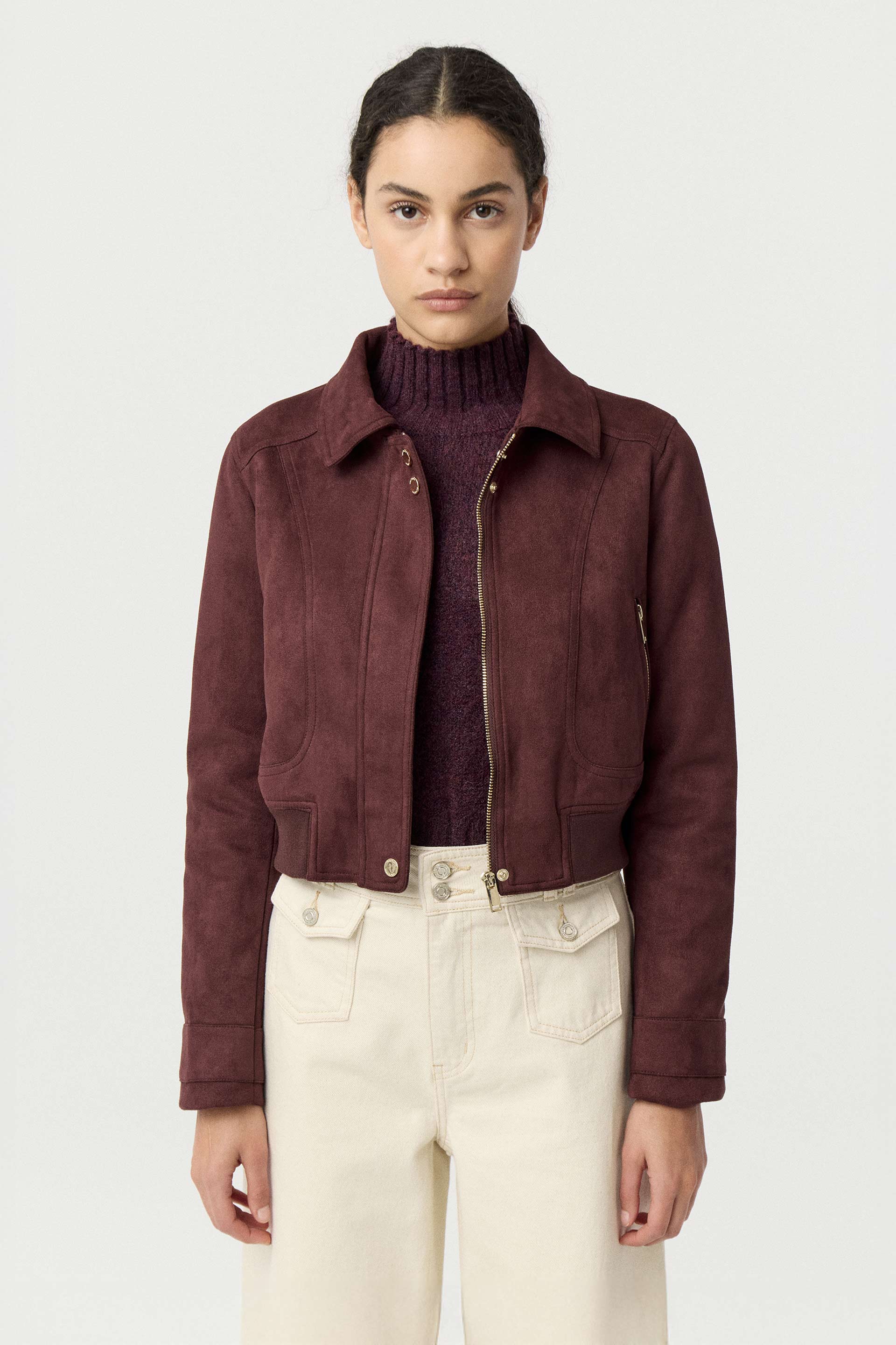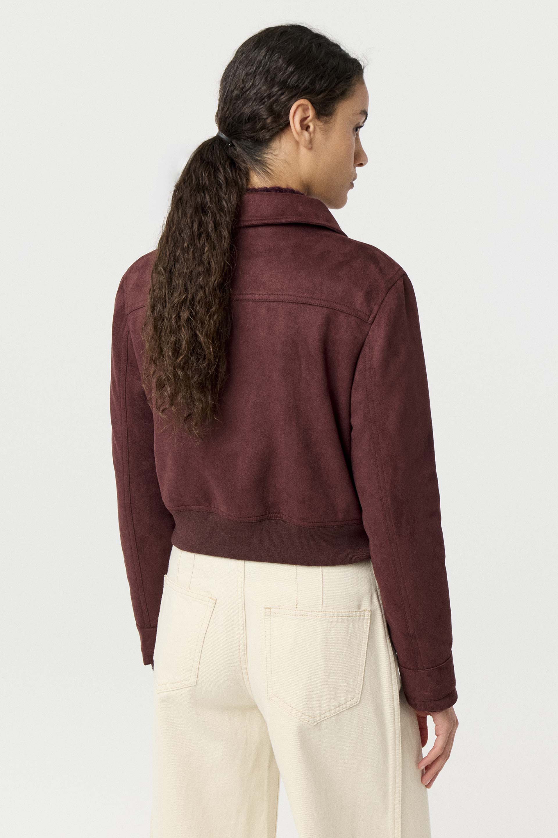 Chaqueta efecto gamuza, de silueta relajada y manga larga. Lleva cierre central, broches metálicos personalizados MKV y cintura con puño tejido para un fit cómodo. Su silueta y el acabado efecto gamuza la convierten en un ítem moderno y versátil.