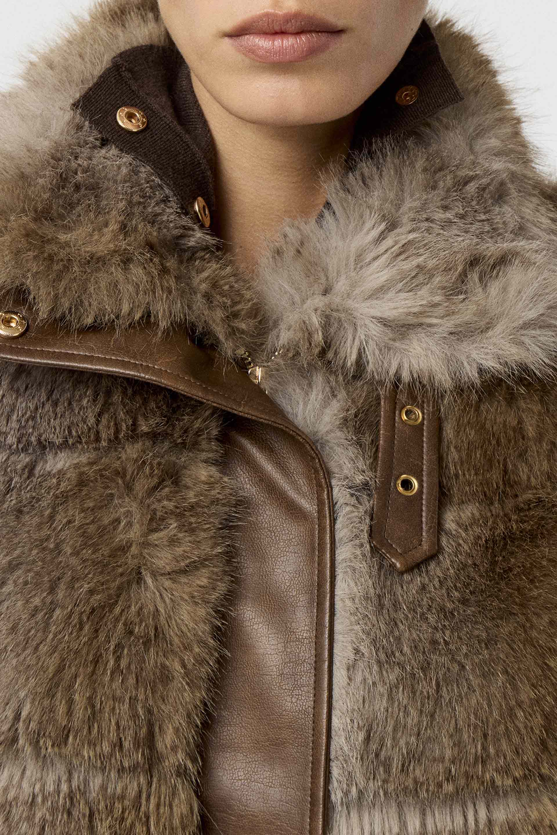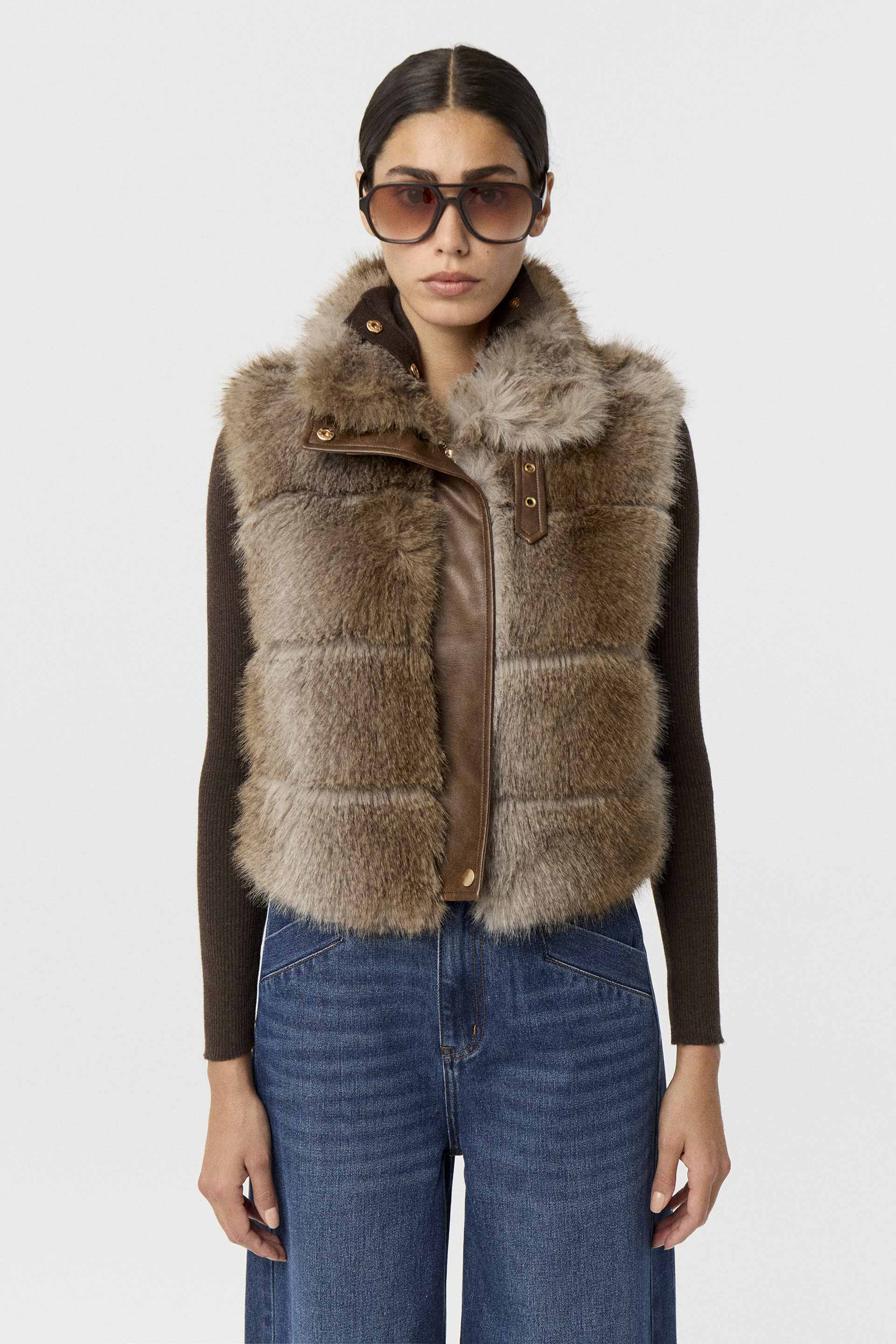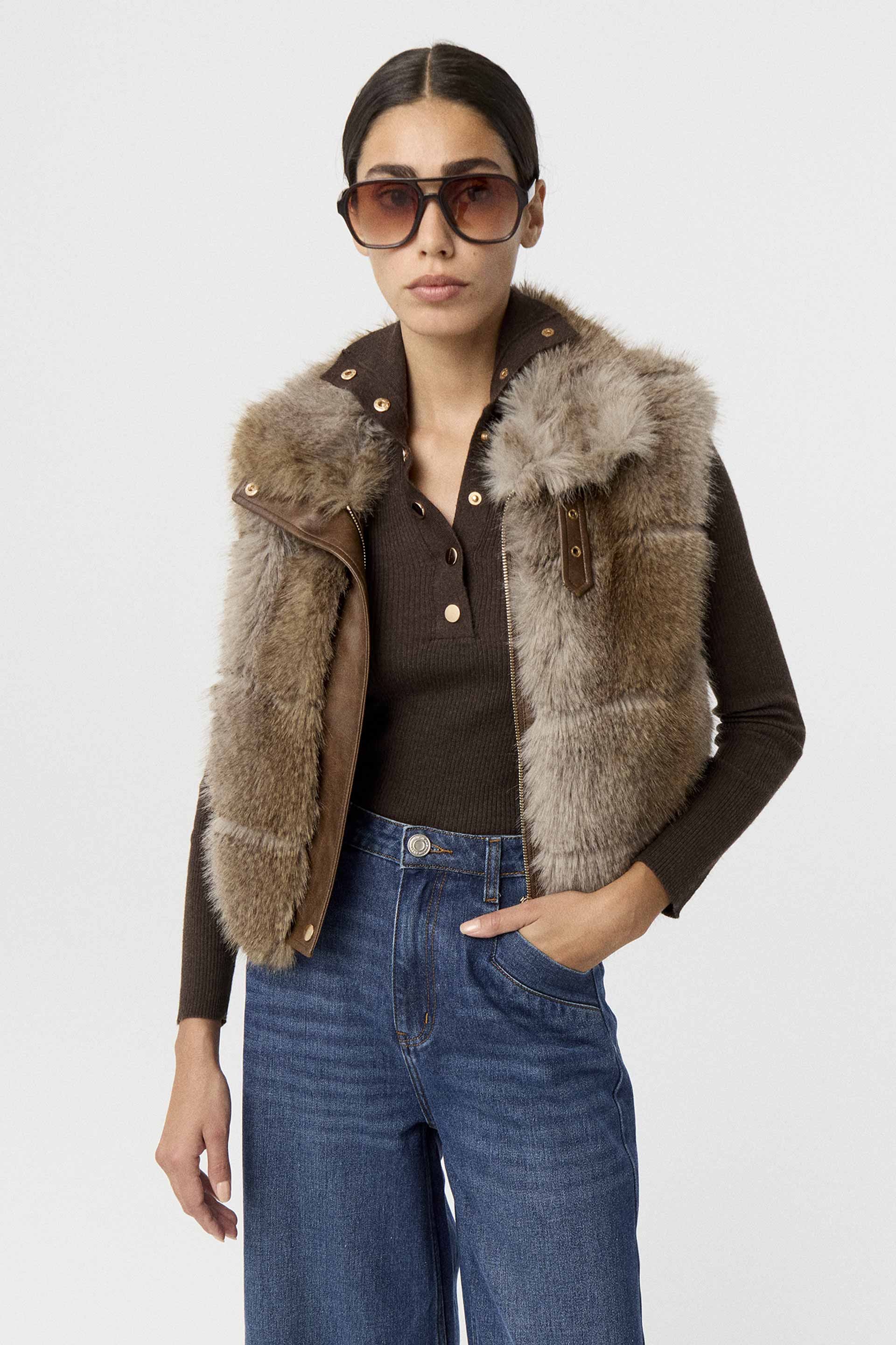 Chaleco efecto piel de silueta relajada. Tiene cierre central, cuello y cartera en combinación efecto cuero, broches personalizados MKV y hebilla metálica. El mix de pelo y cuero, junto con su color, la convierten en una prenda de absoluta tendencia, ideal para completar tus looks en una noche de invierno.