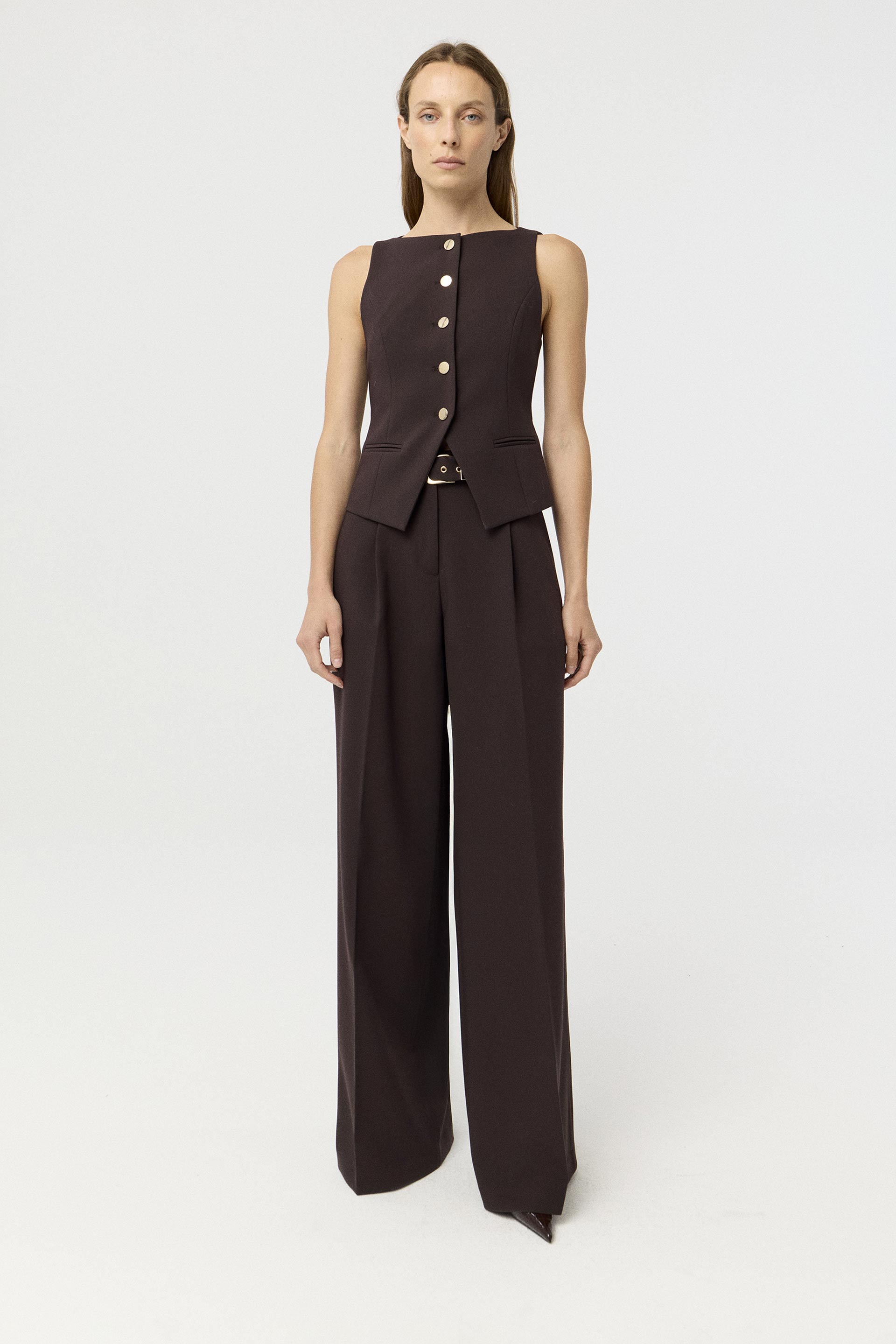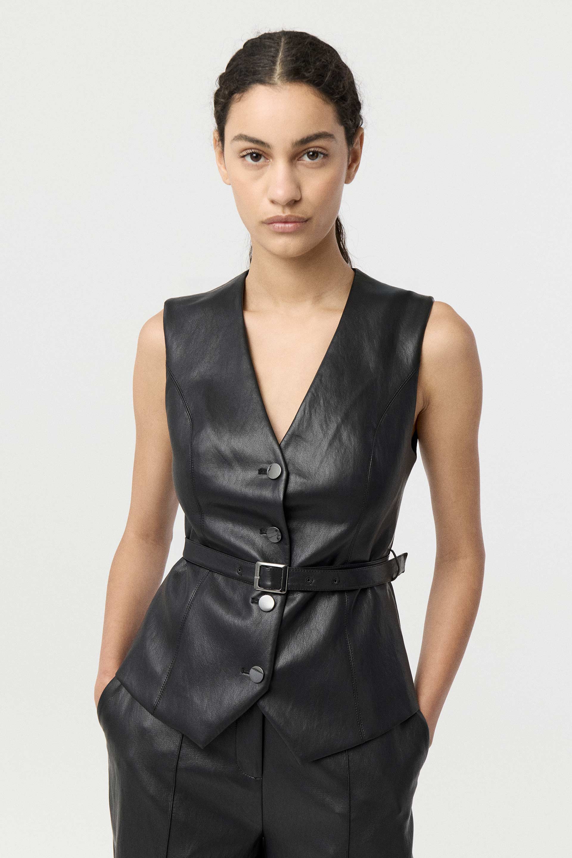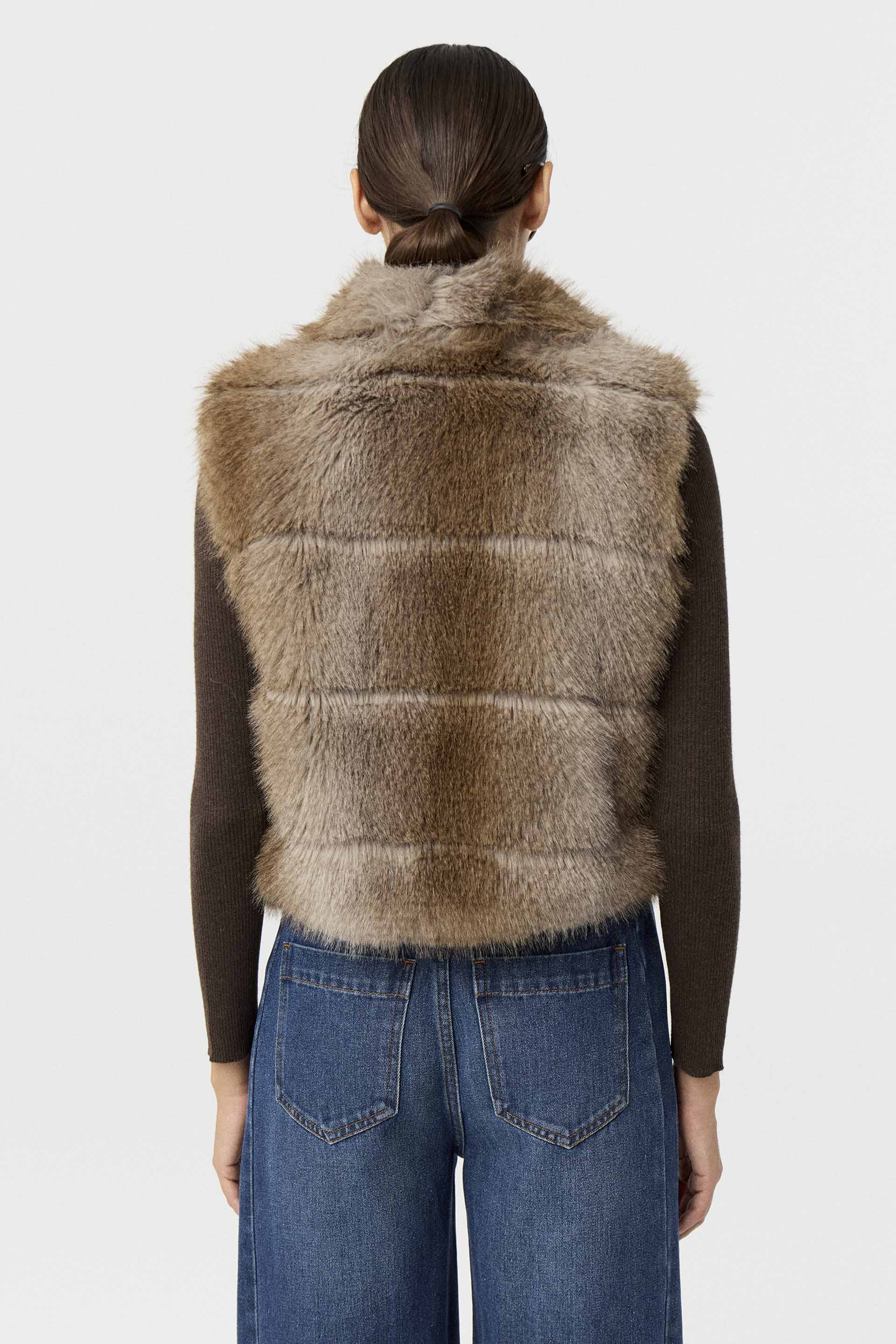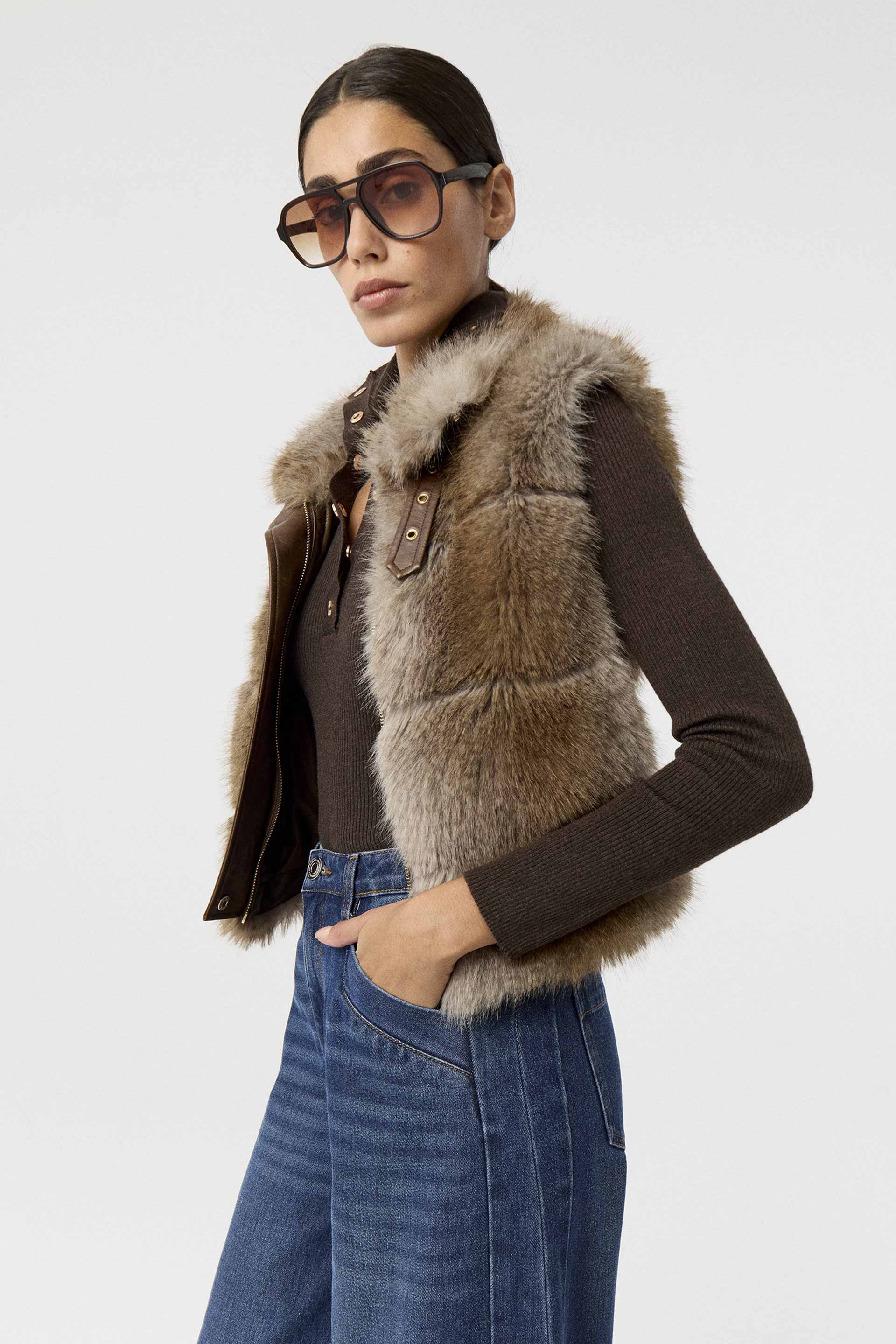 Chaleco efecto piel de silueta relajada. Tiene cierre central, cuello y cartera en combinación efecto cuero, broches personalizados MKV y hebilla metálica. El mix de pelo y cuero, junto con su color, la convierten en una prenda de absoluta tendencia, ideal para completar tus looks en una noche de invierno.