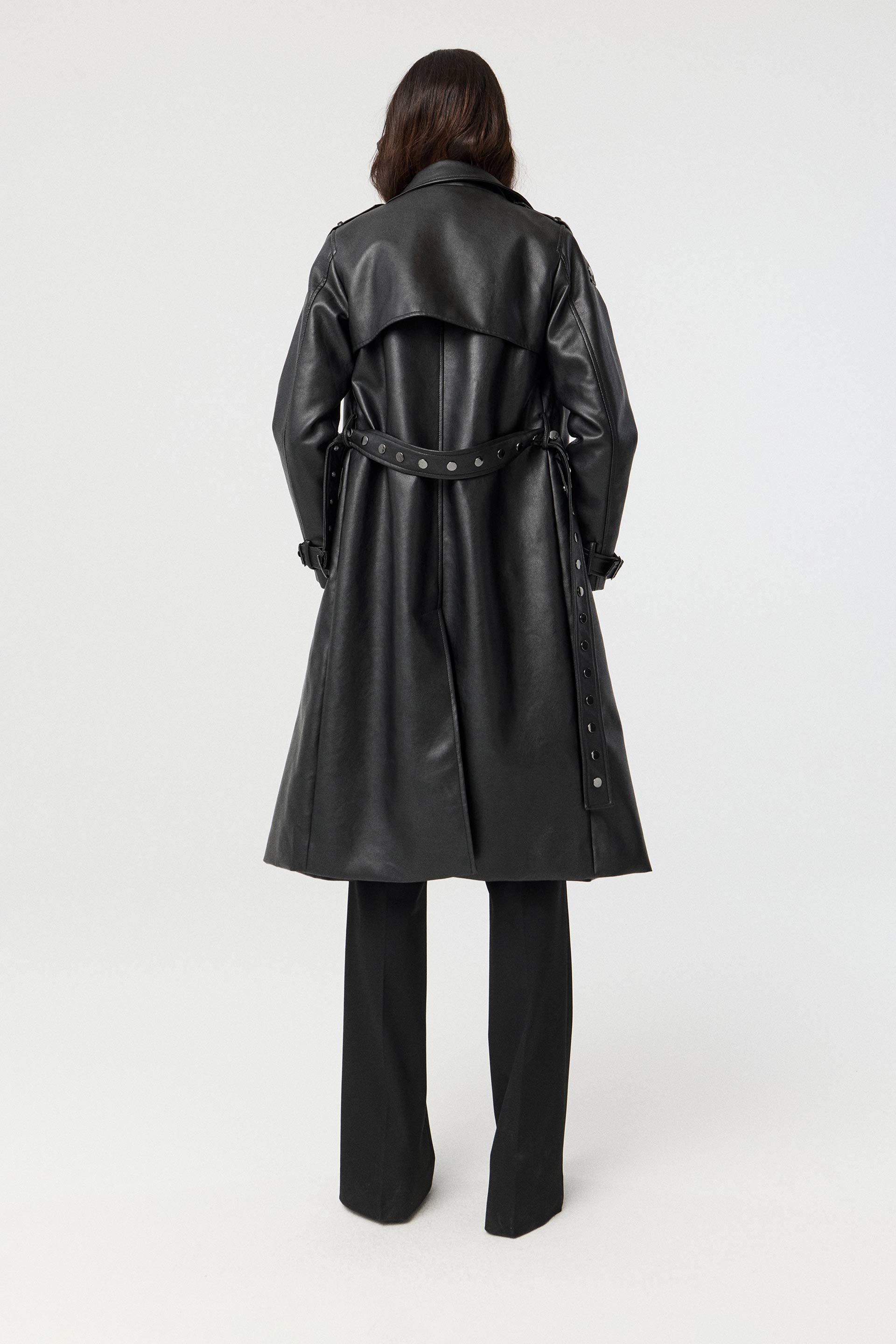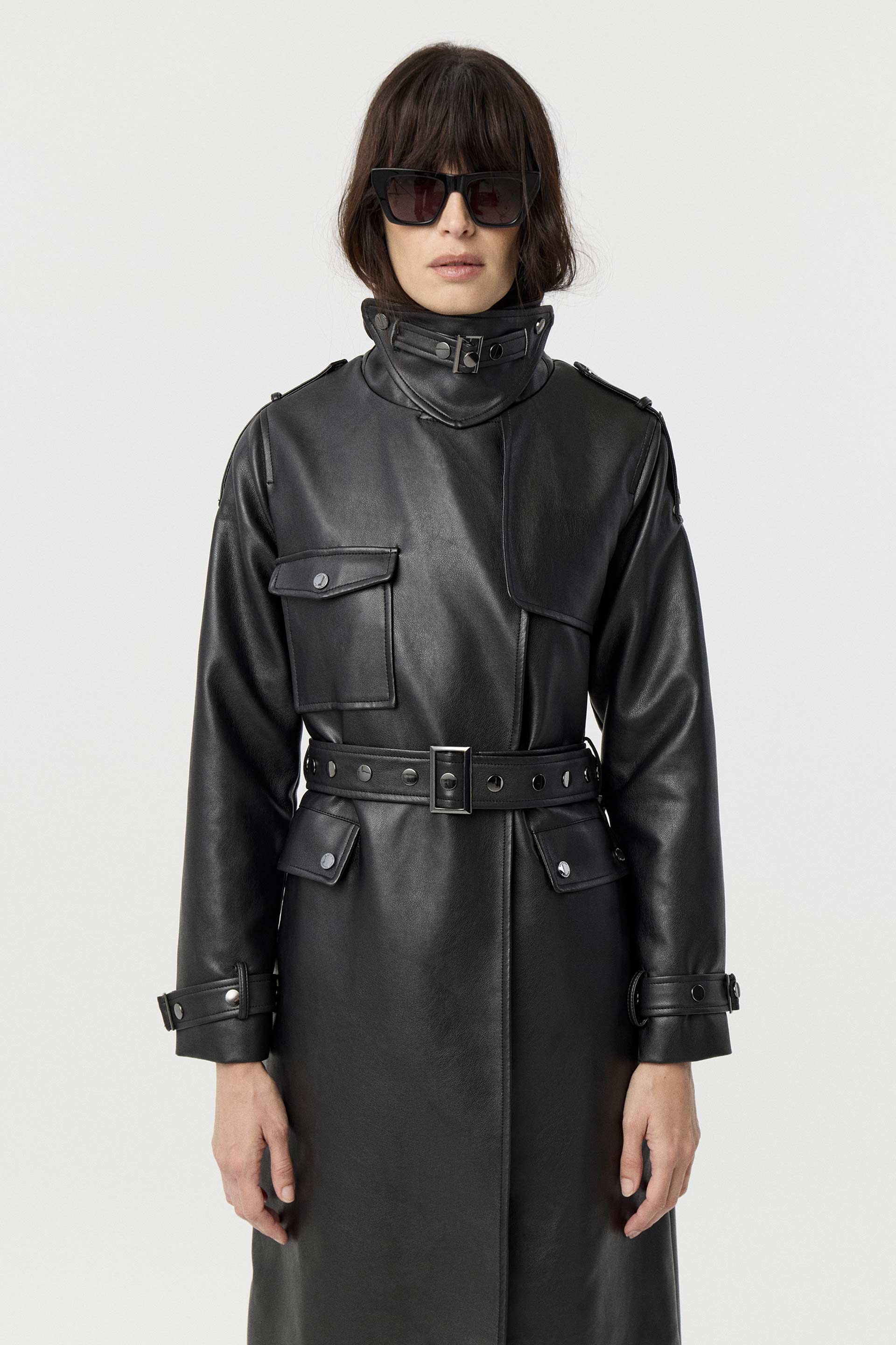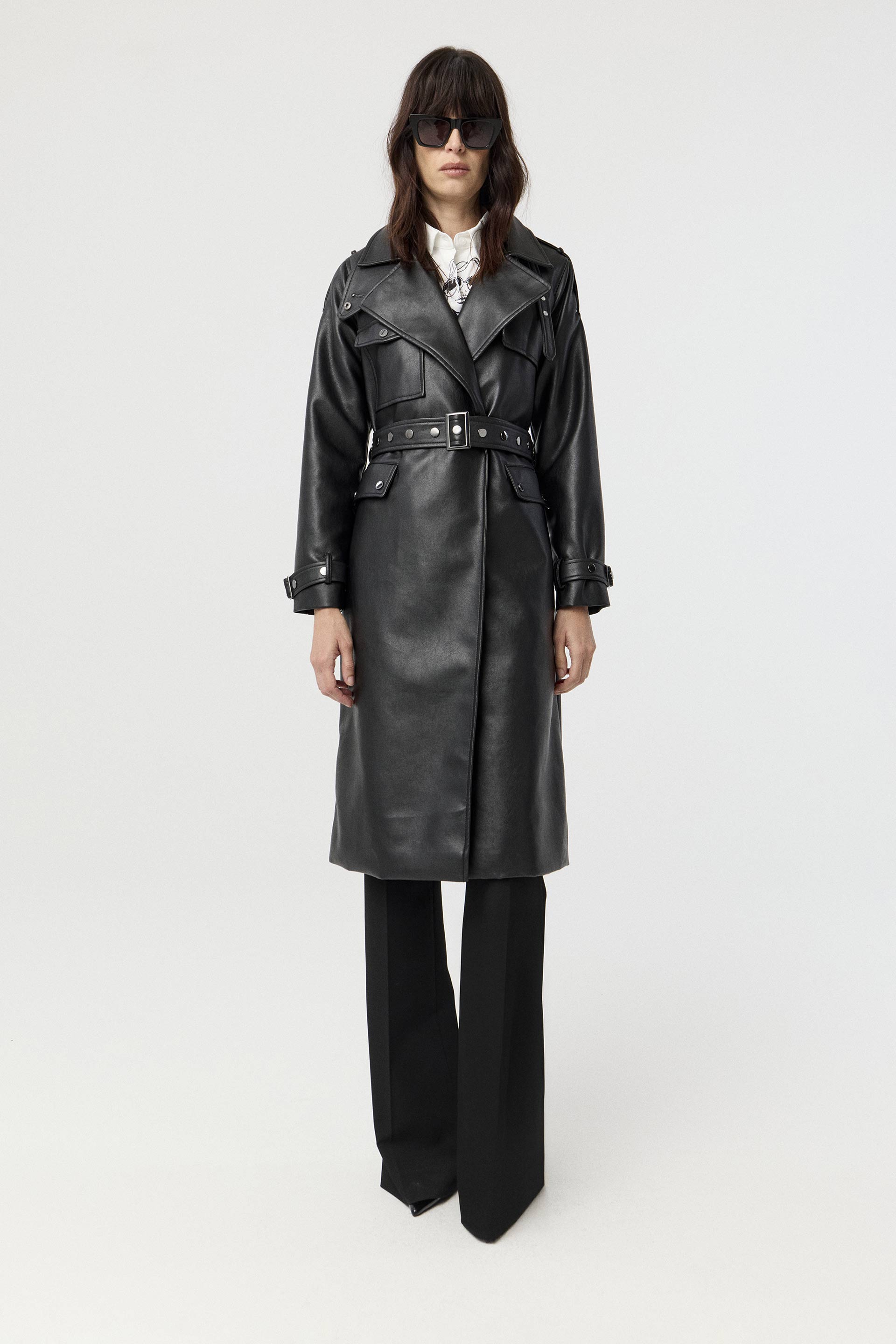 Trench efecto cuero, entallado, con solapa y mangas largas. De calce cruzado, incorpora broches metálicos internos, cinturón con broches a lo largo de todo el recorrido y hebillas metálicas en la cintura, los puños y el cuello. Su diseño y su largo modular lo convierten en un trench canchero y con actitud rocker, ideal para una salida nocturna.