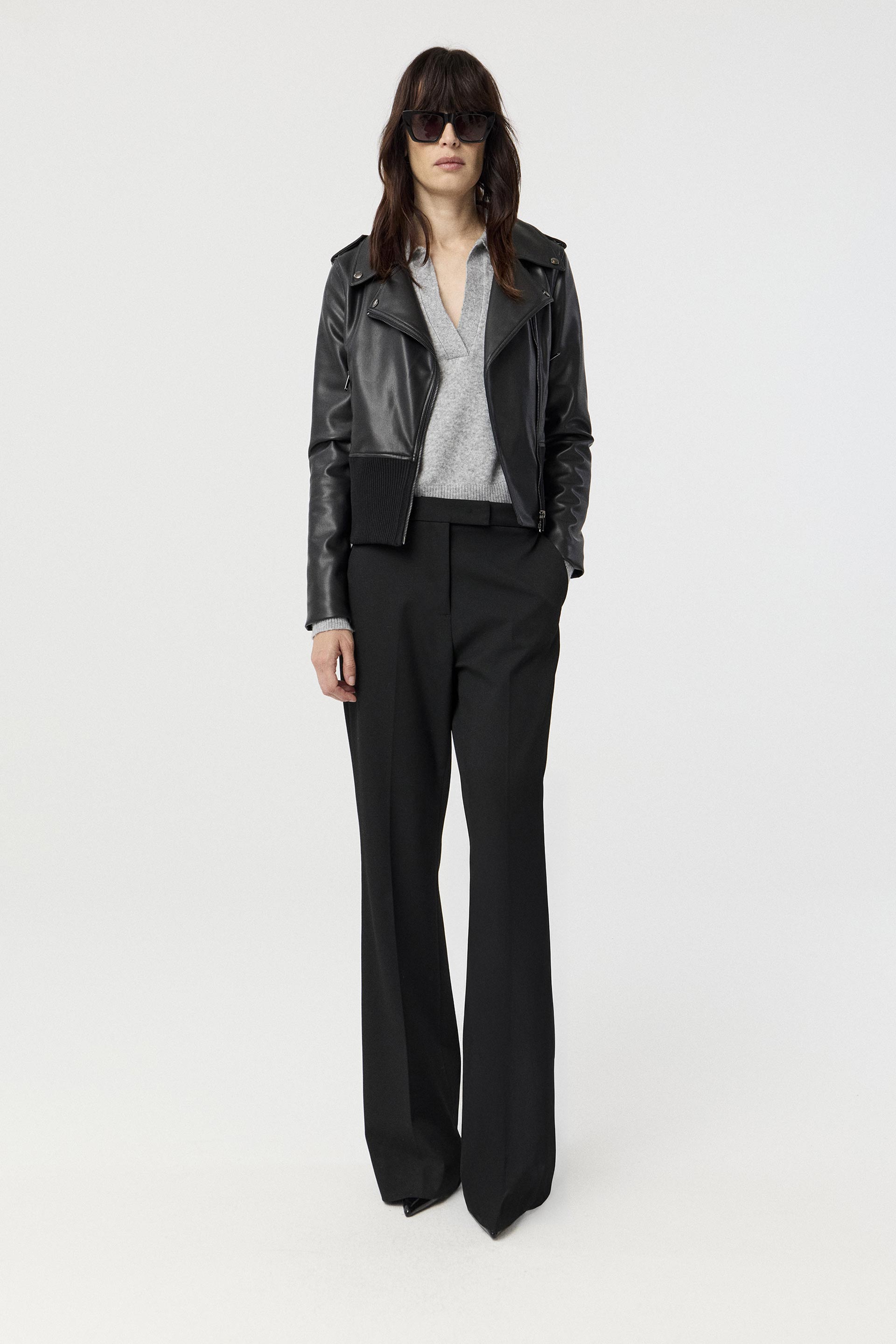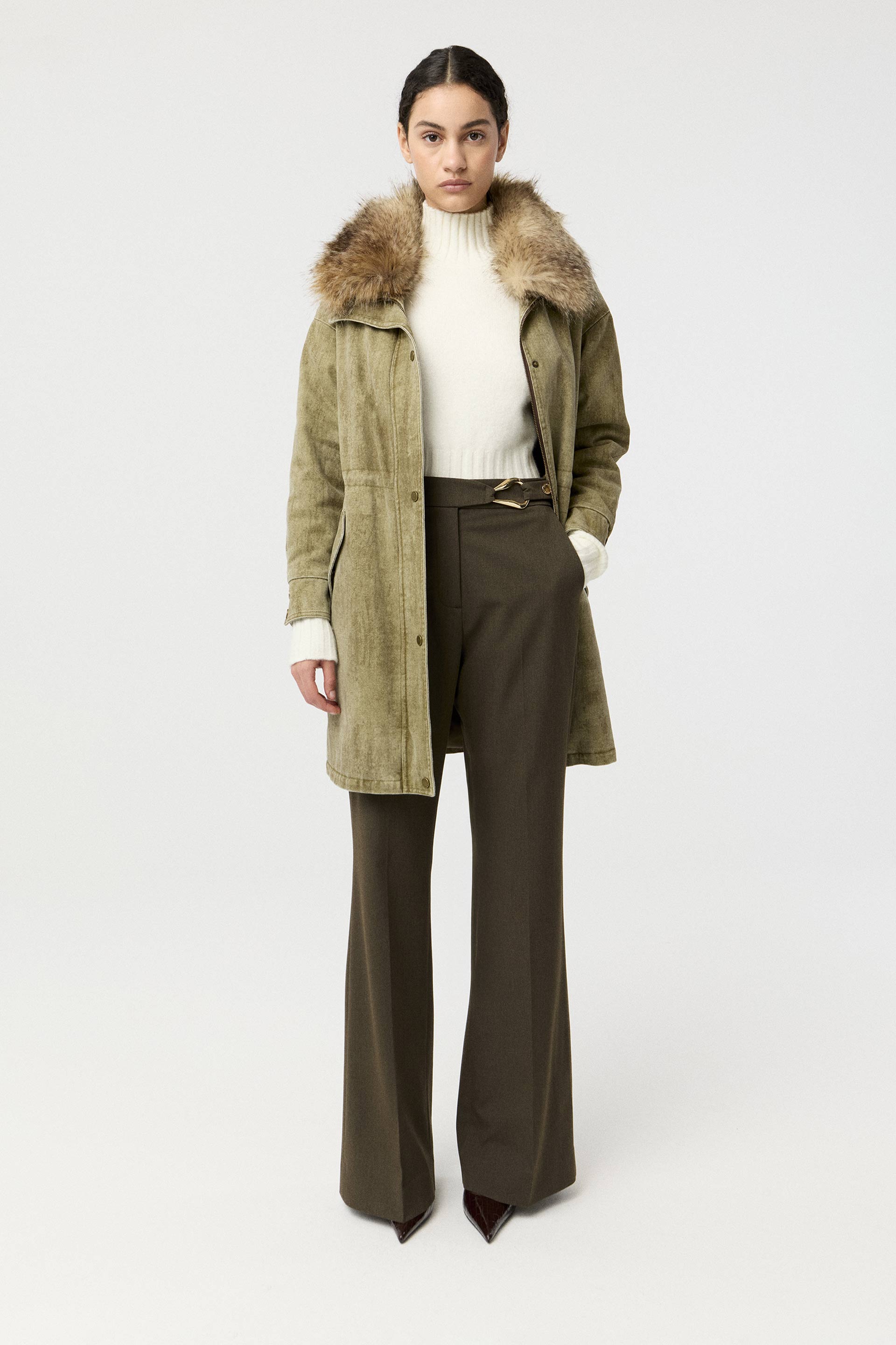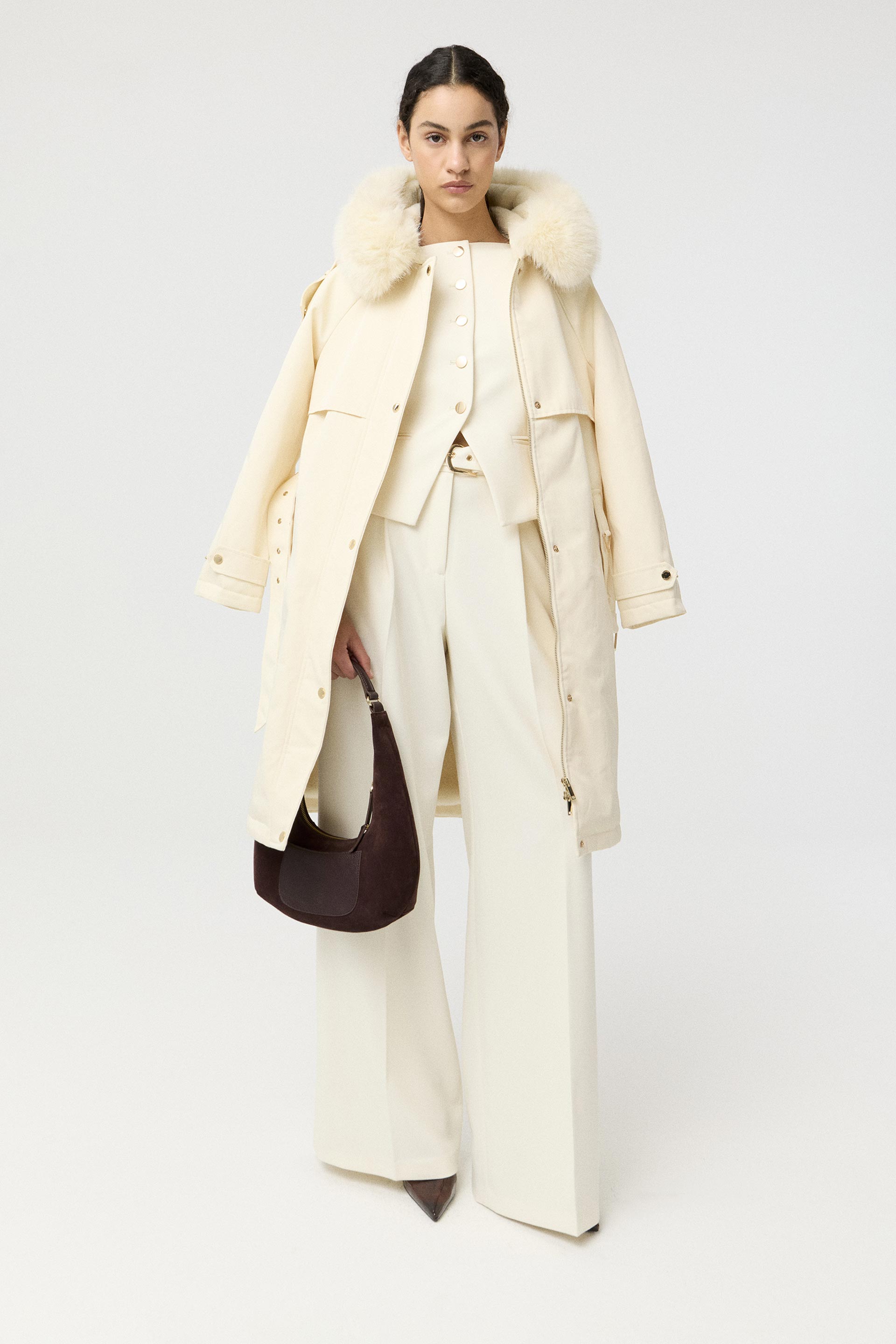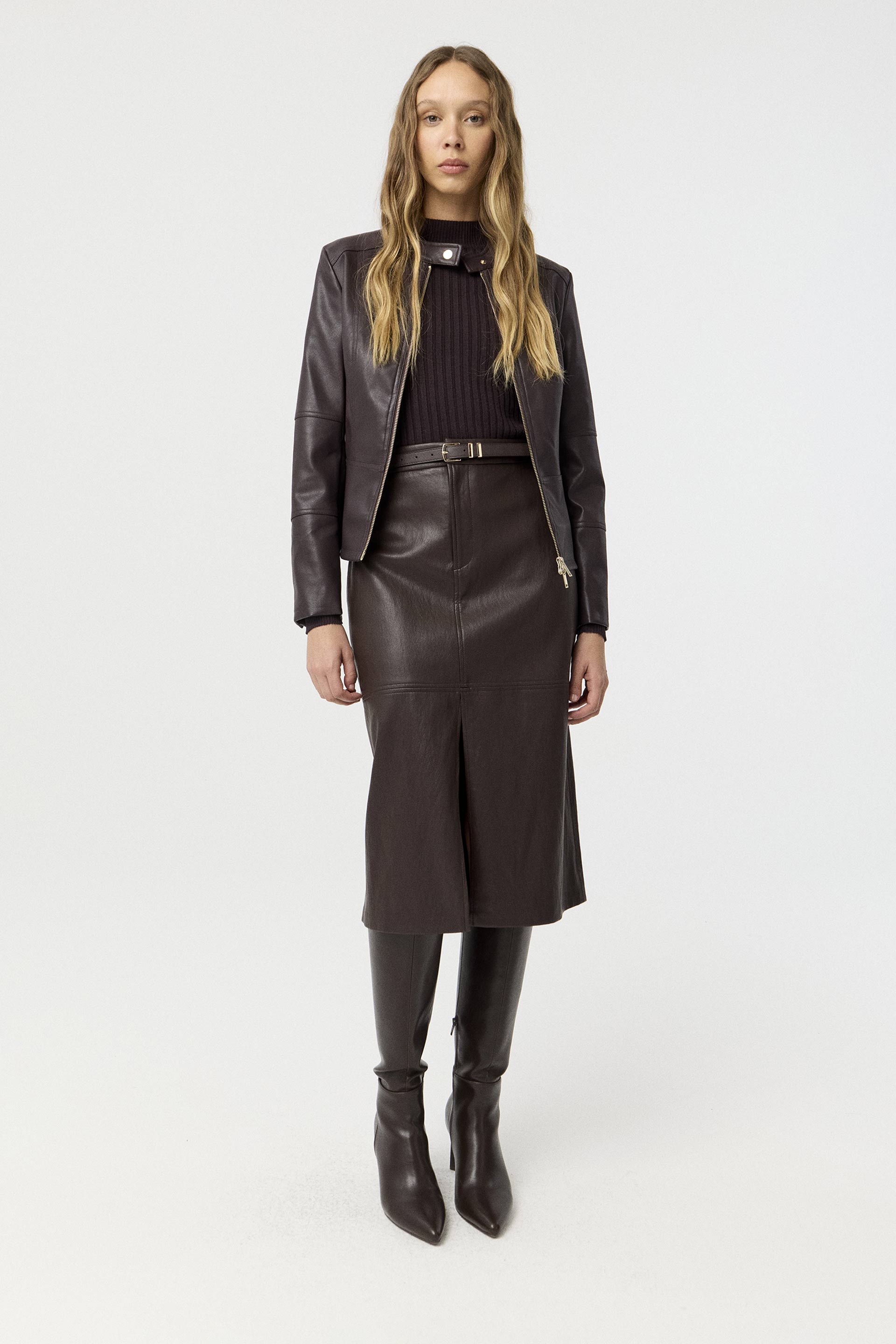 Trench efecto cuero, entallado, con solapa y mangas largas. De calce cruzado, incorpora broches metálicos internos, cinturón con broches a lo largo de todo el recorrido y hebillas metálicas en la cintura, los puños y el cuello. Su diseño y su largo modular lo convierten en un trench canchero y con actitud rocker, ideal para una salida nocturna.