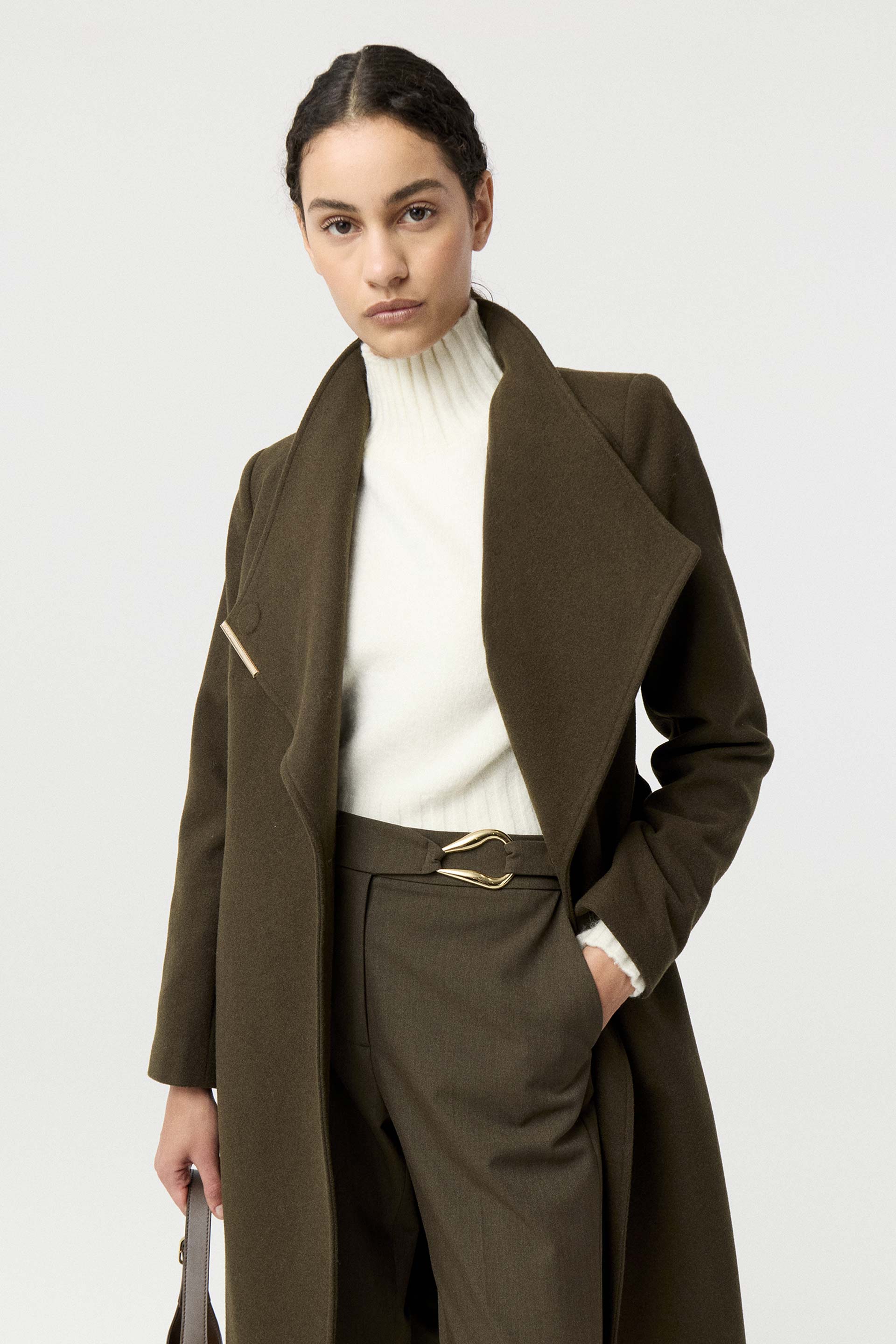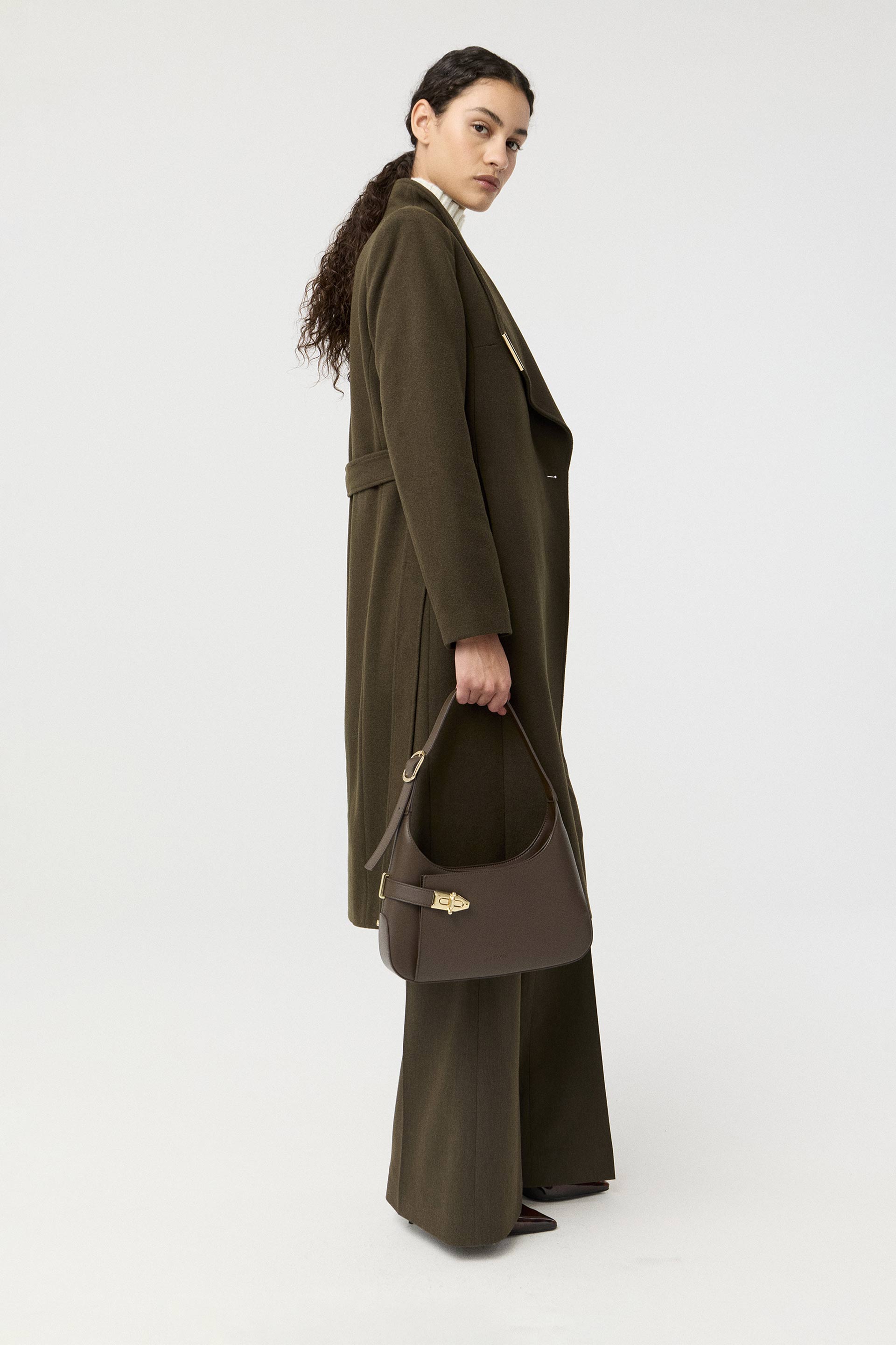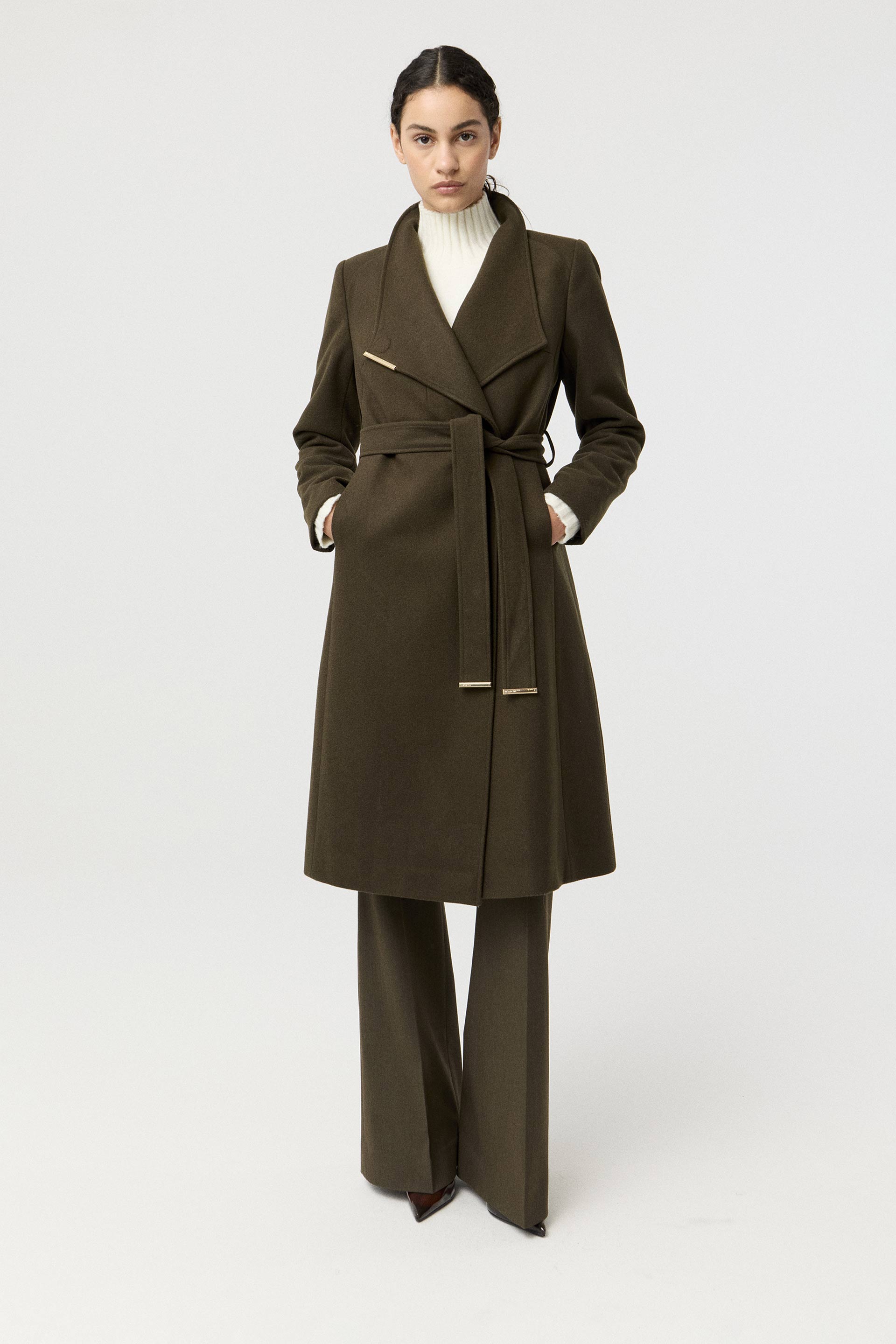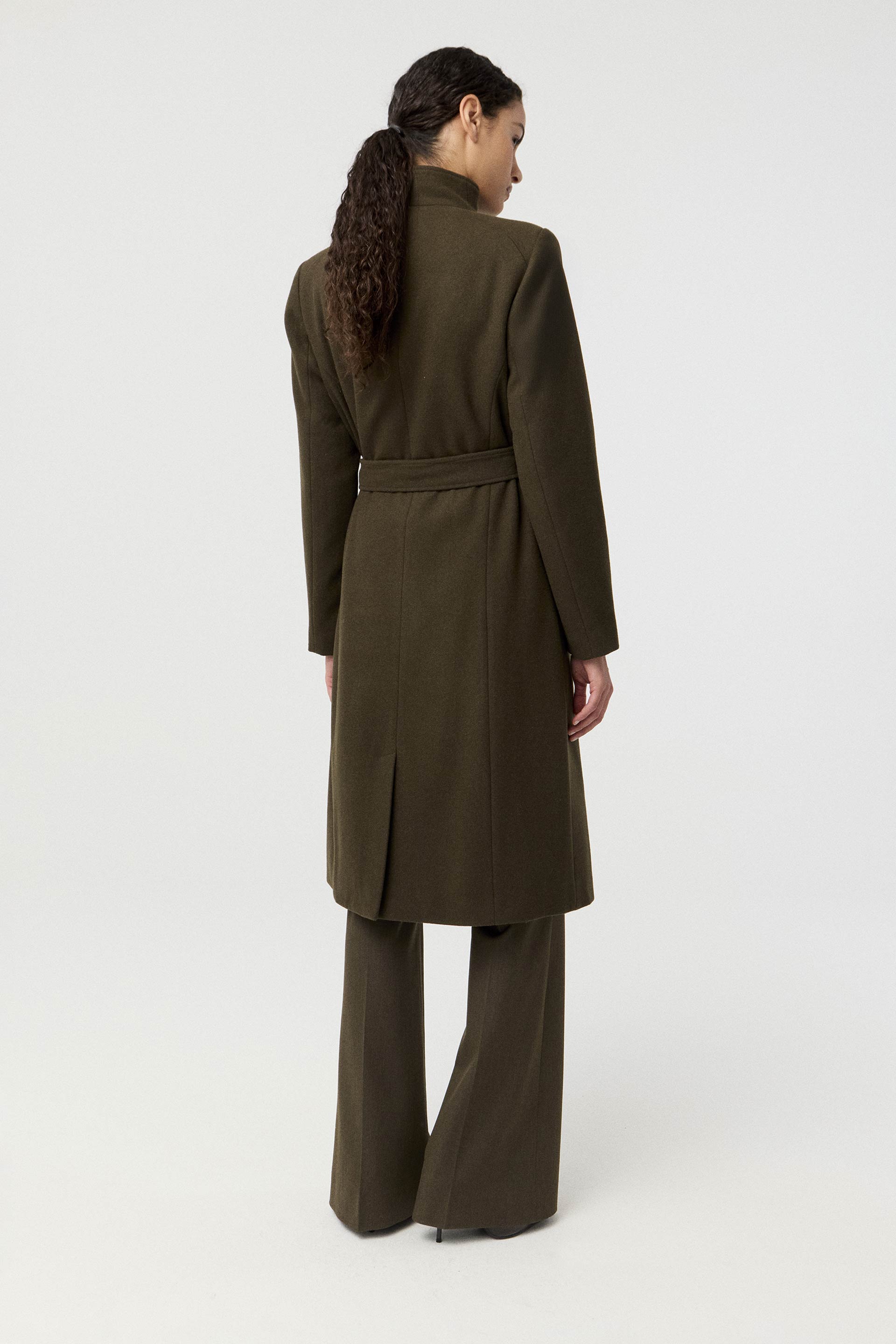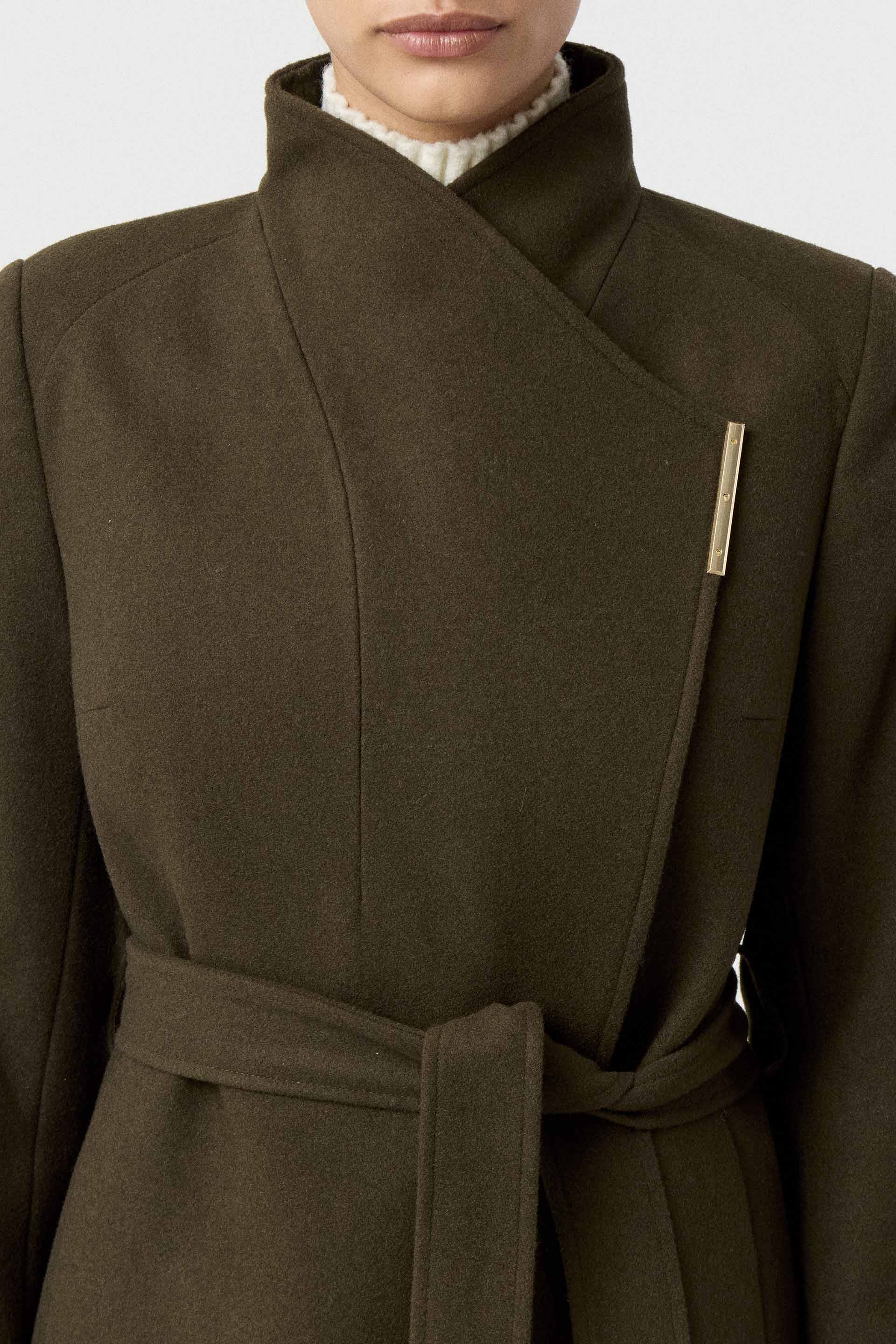 Tapado de paño de lana, de silueta entallada, cuello alto y manga larga. Presenta un botón metálico en el acceso, lazo en la cintura con terminaciones metálicas y avío imantado personalizado MKV en la solapa. Un tapado elegante y fácil de combinar, con un largo modular de tendencia que potencia cualquier look.