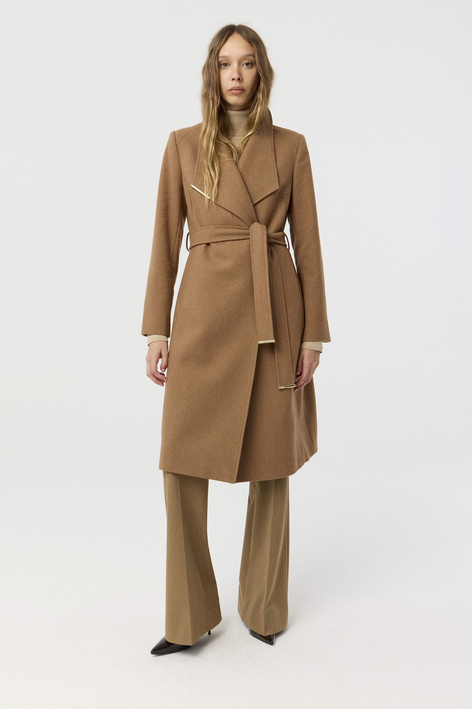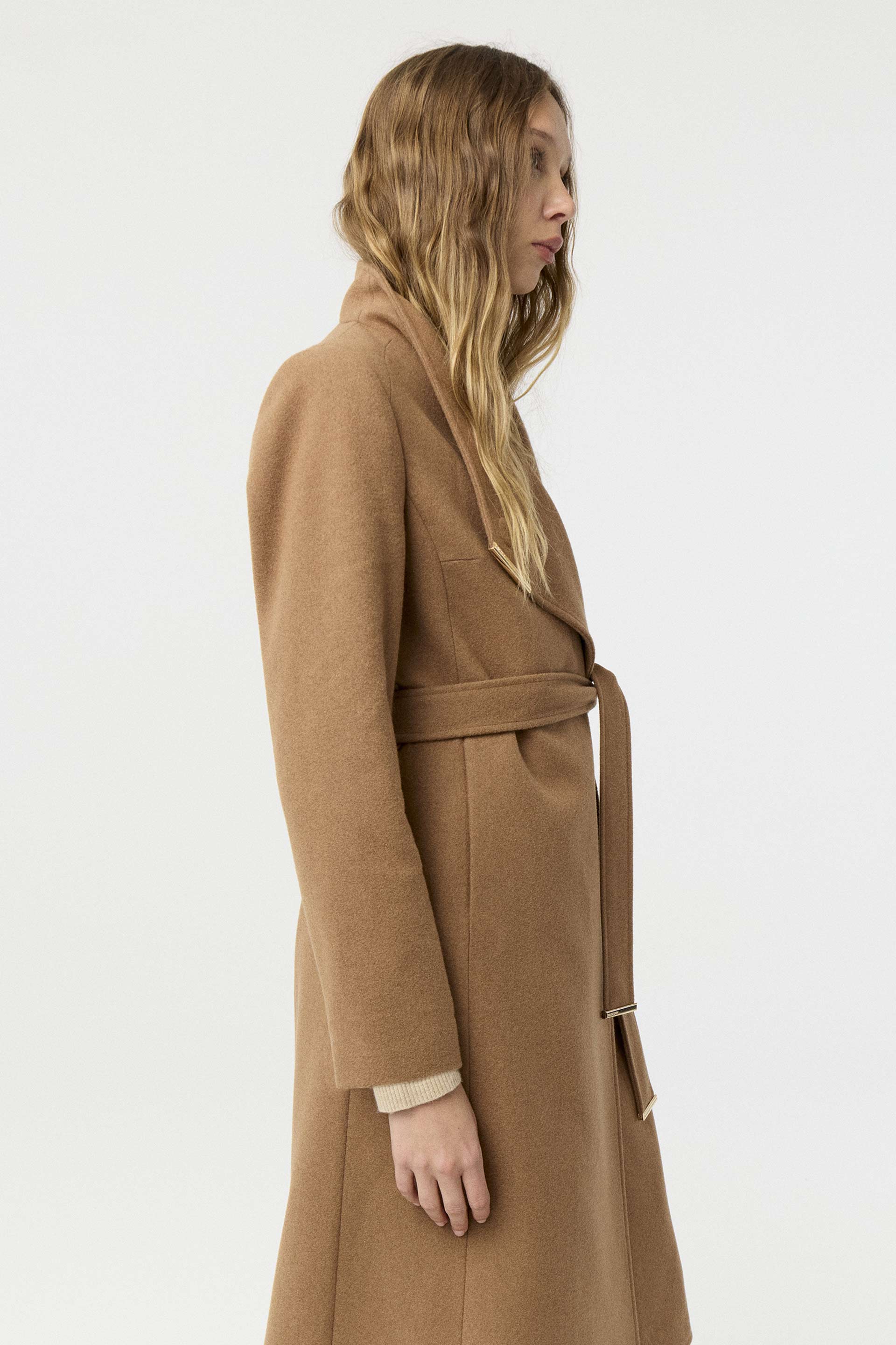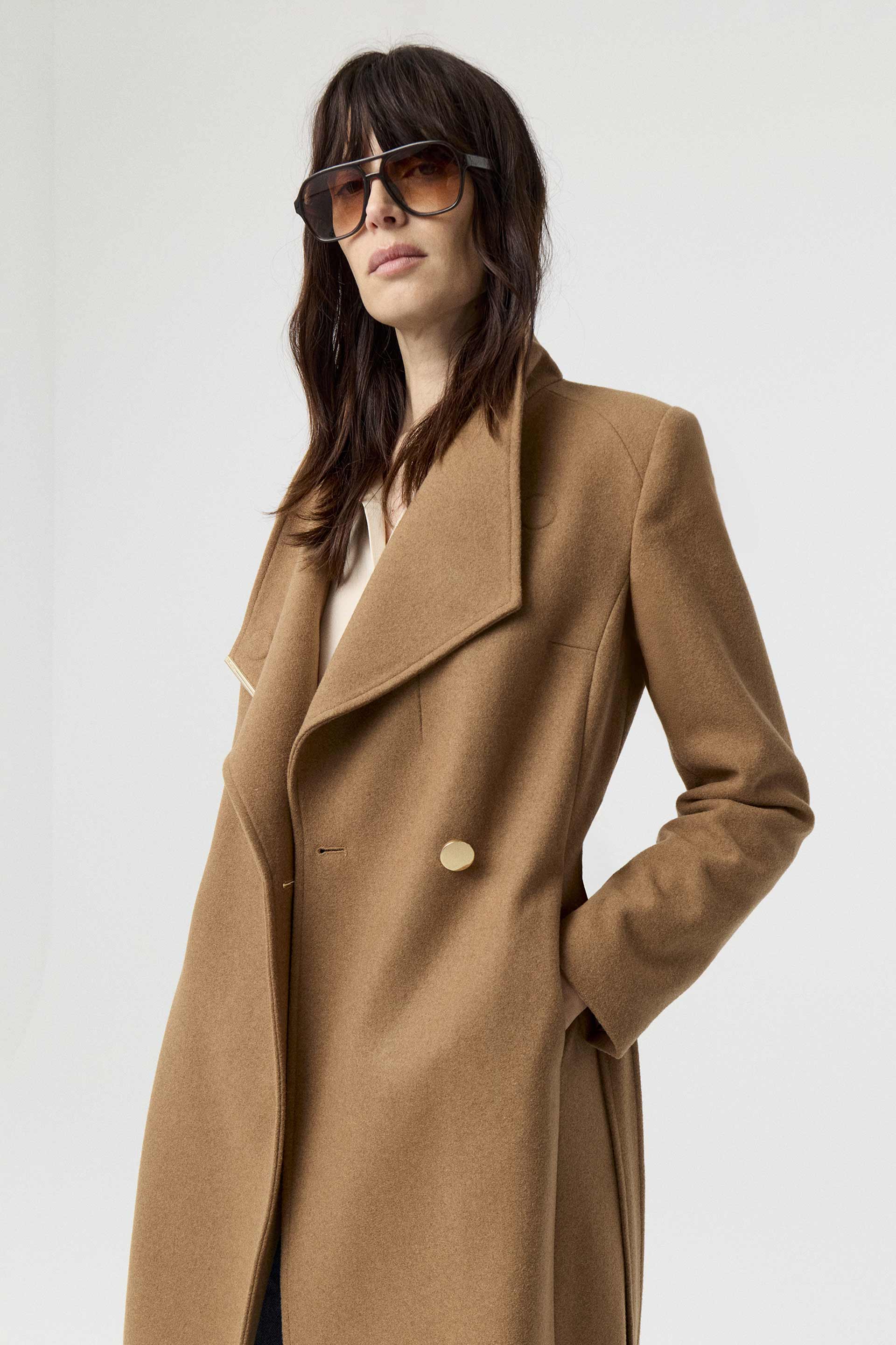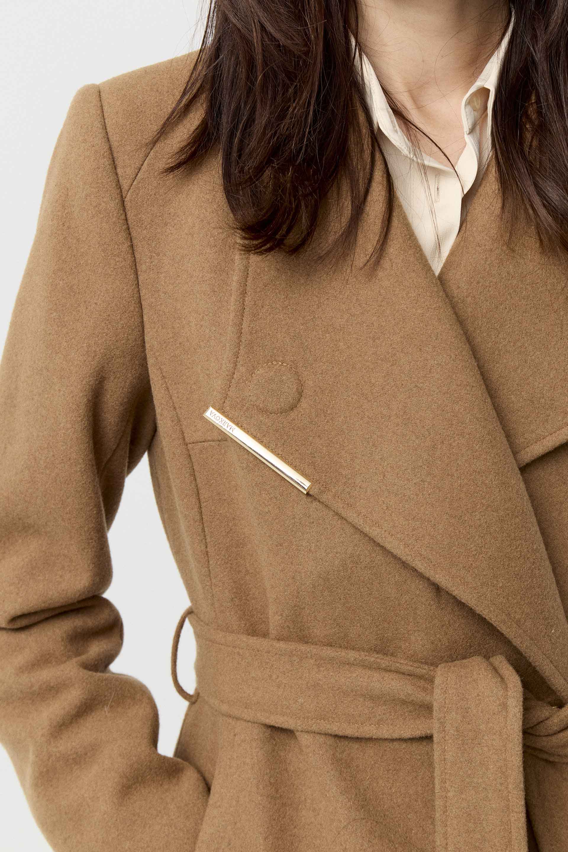 Tapado de paño de lana, de silueta entallada, cuello alto y manga larga. Presenta un botón metálico en el acceso, lazo en la cintura con terminaciones metálicas y avío imantado personalizado MKV en la solapa. Un tapado elegante y fácil de combinar, con un largo modular de tendencia que potencia cualquier look.