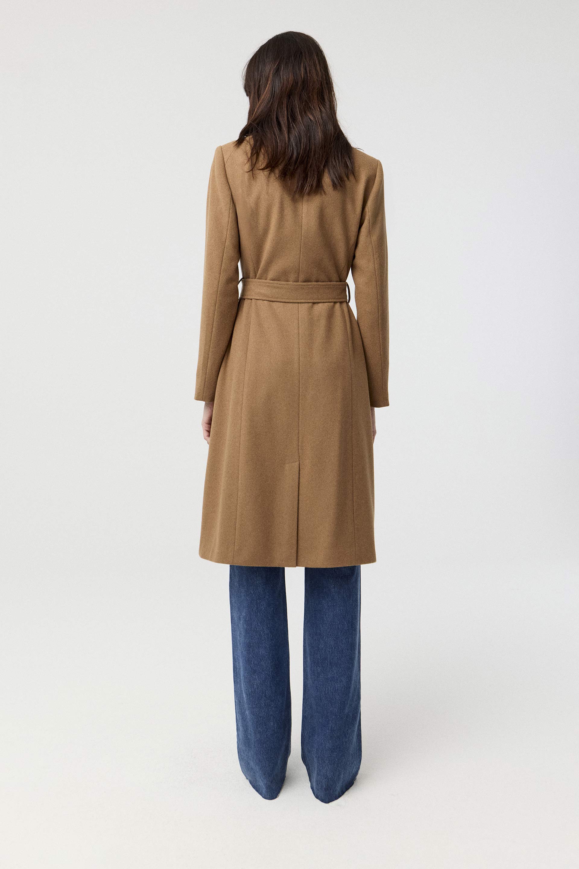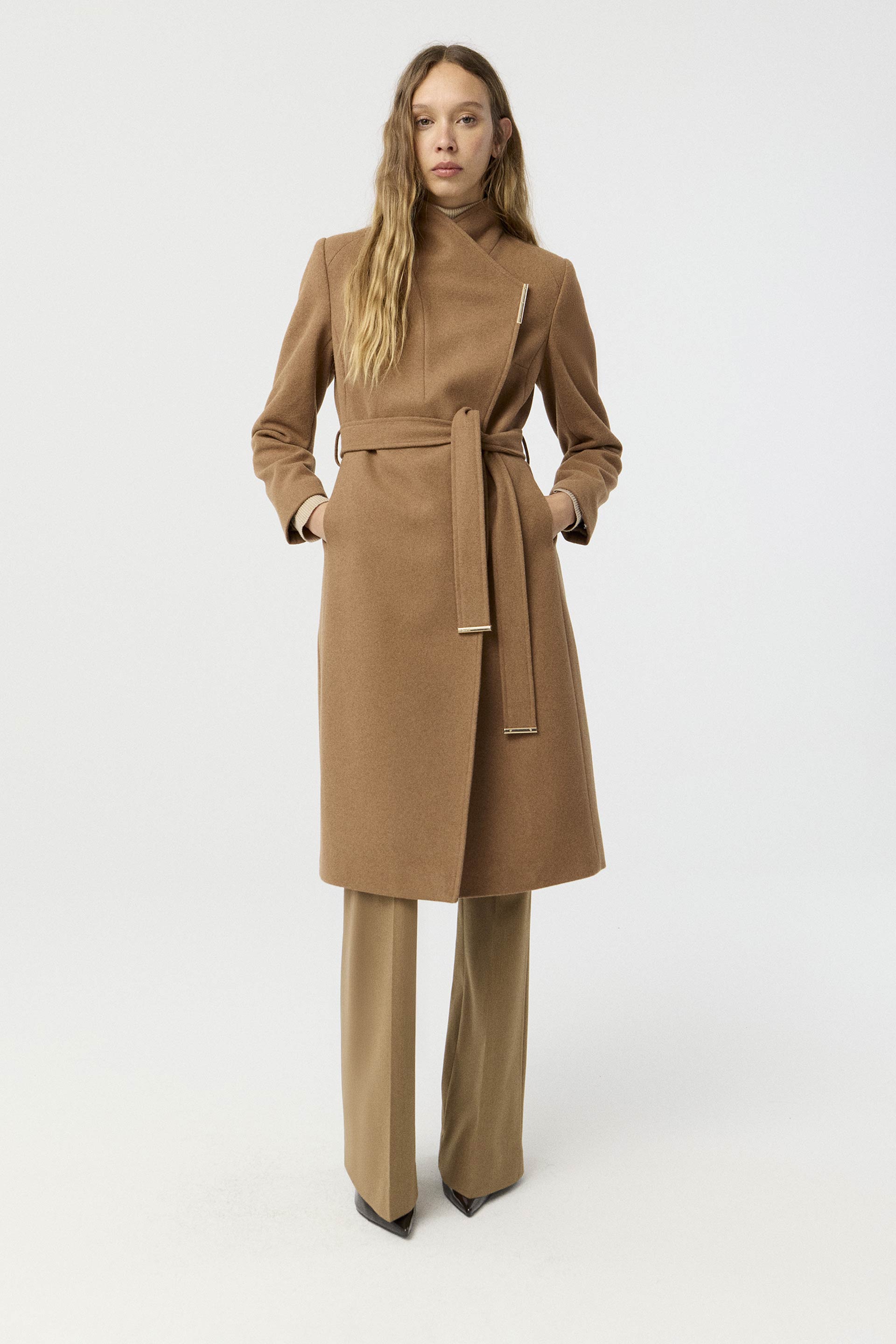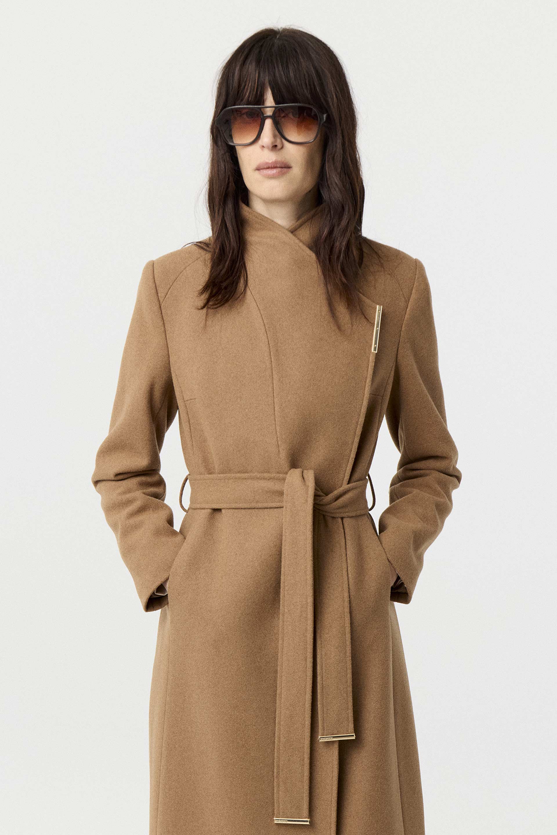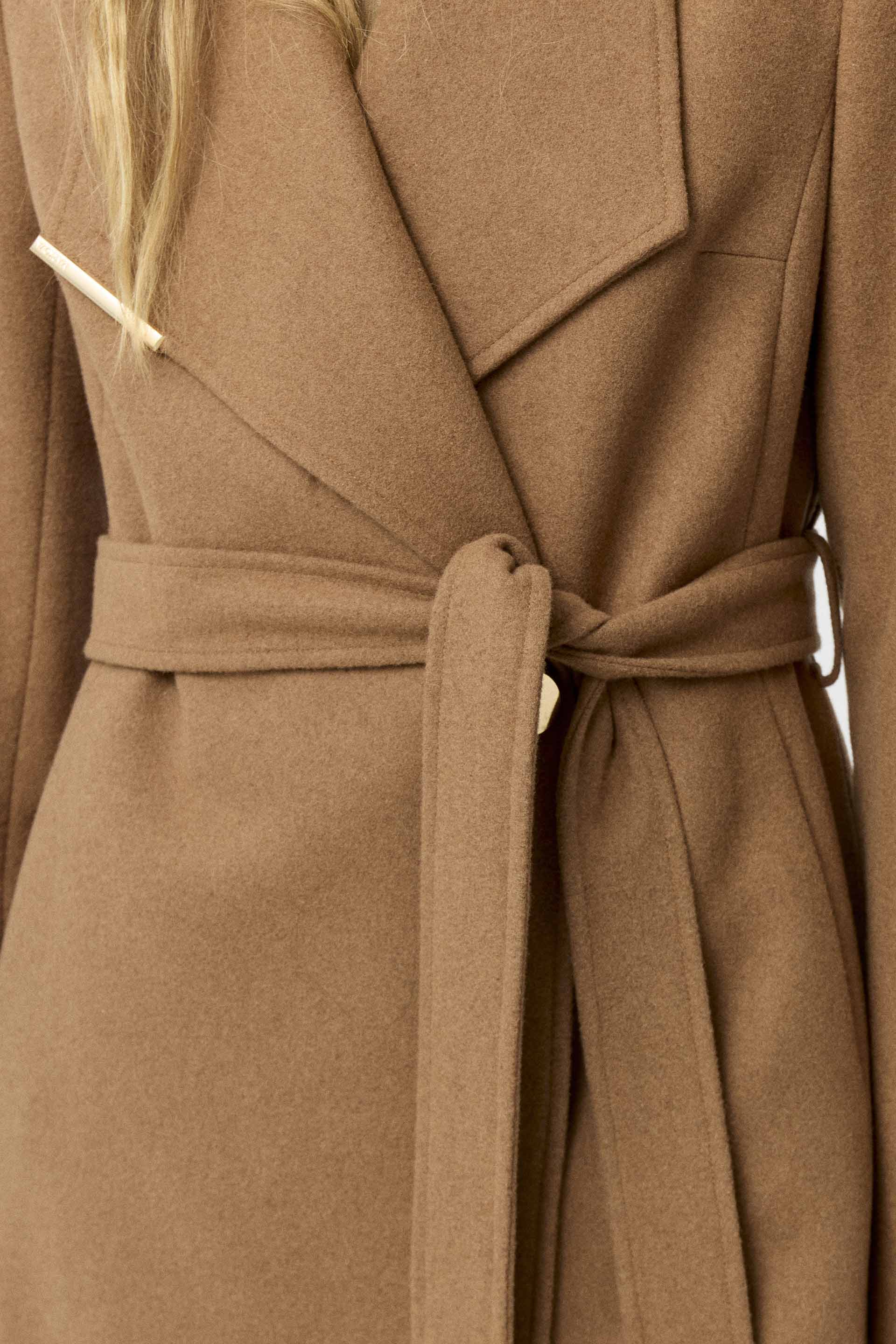 Tapado de paño de lana, de silueta entallada, cuello alto y manga larga. Presenta un botón metálico en el acceso, lazo en la cintura con terminaciones metálicas y avío imantado personalizado MKV en la solapa. Un tapado elegante y fácil de combinar, con un largo modular de tendencia que potencia cualquier look.