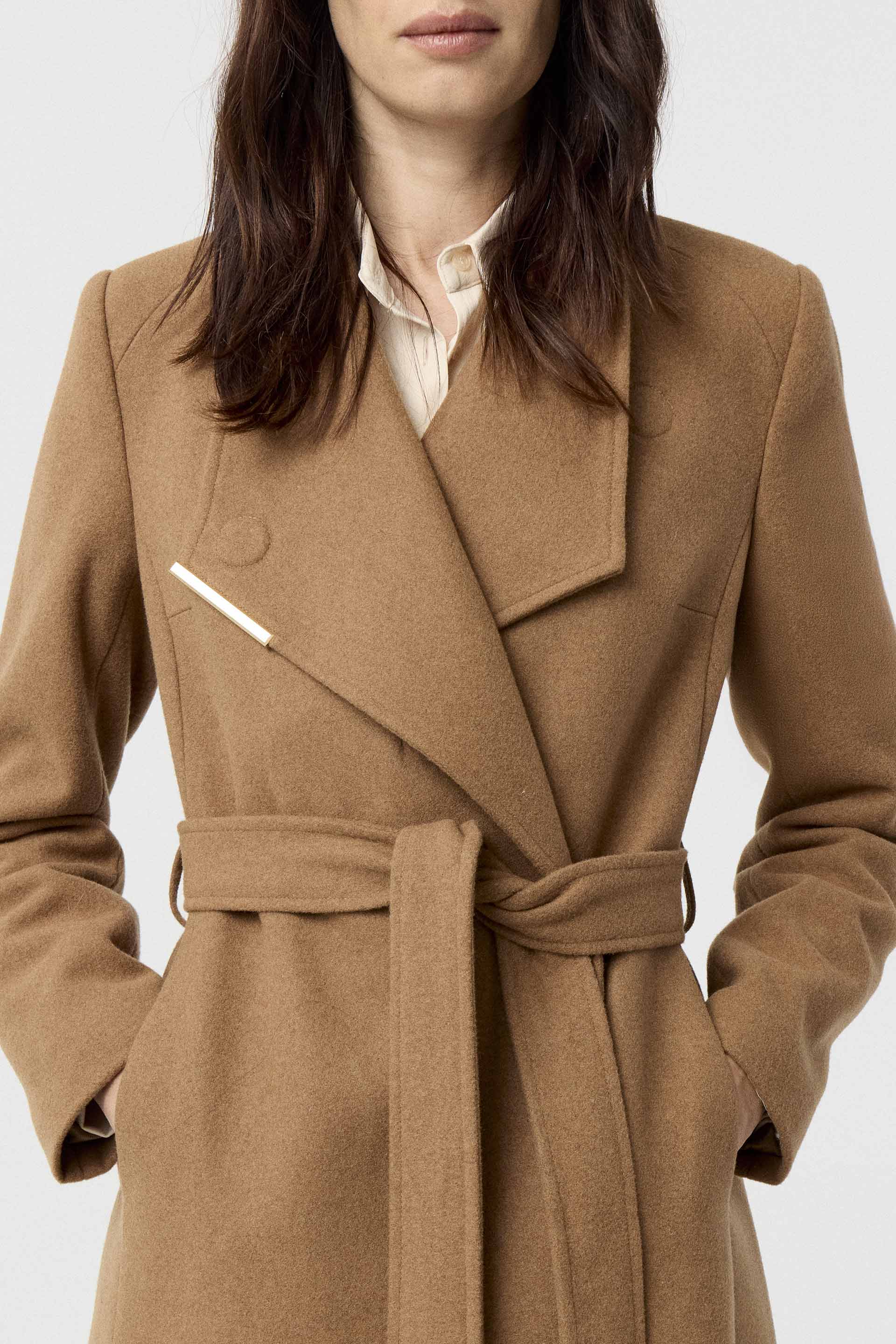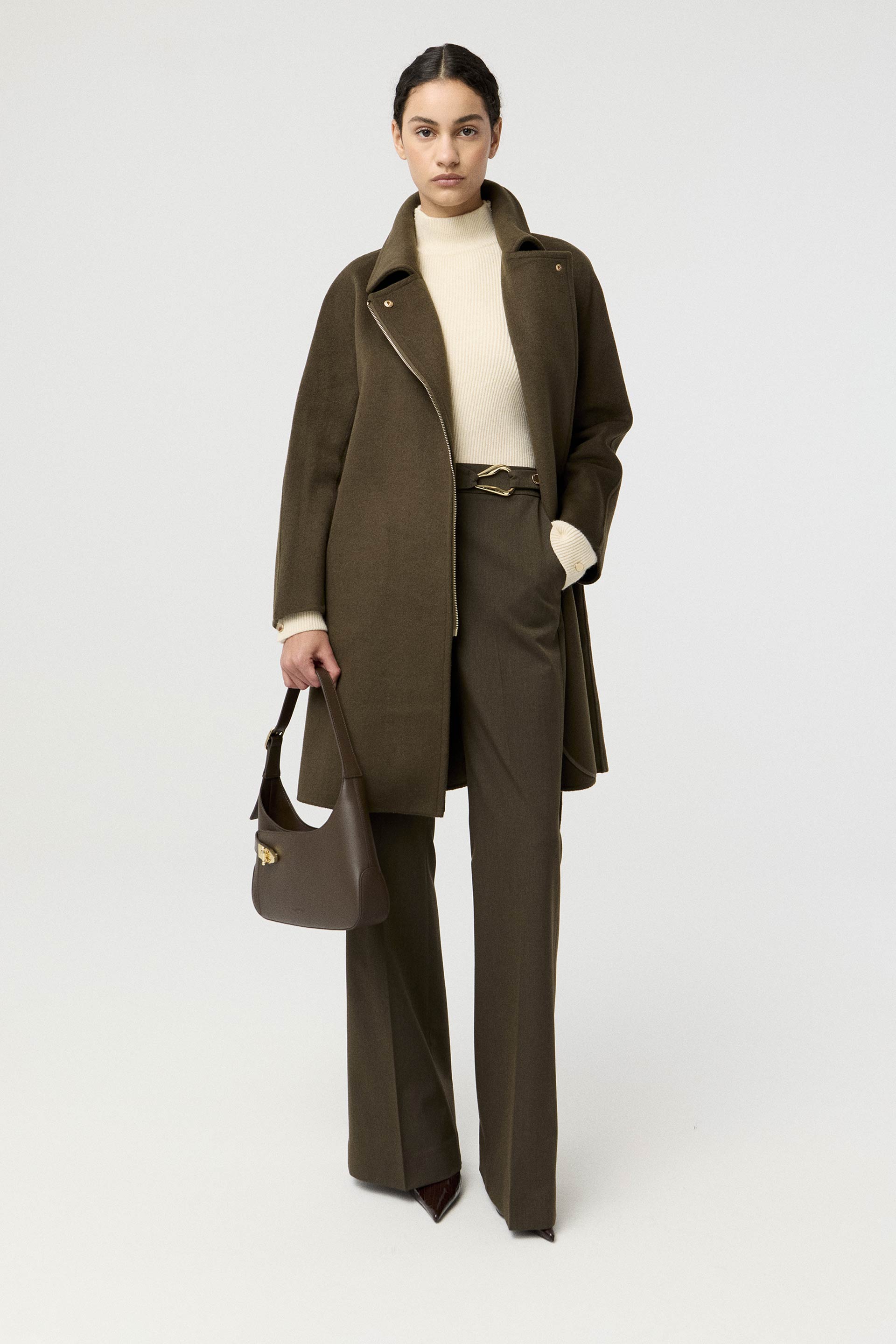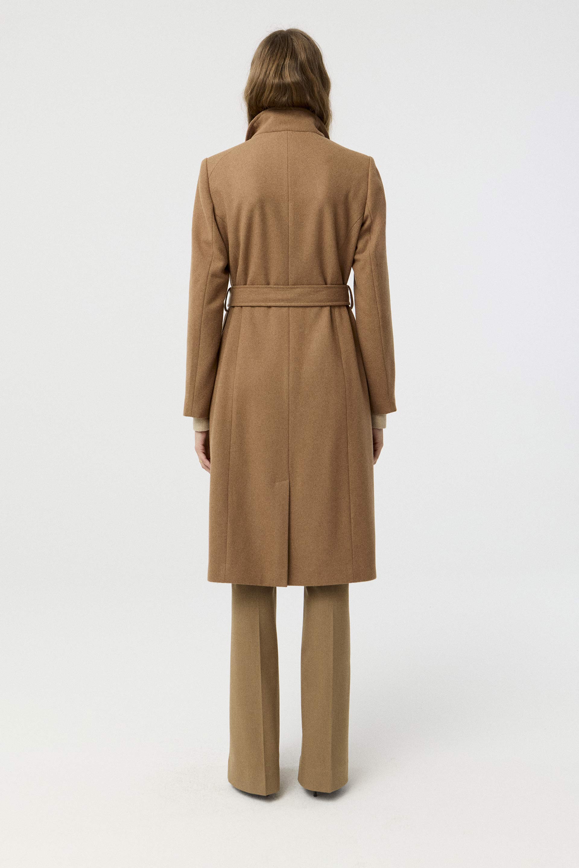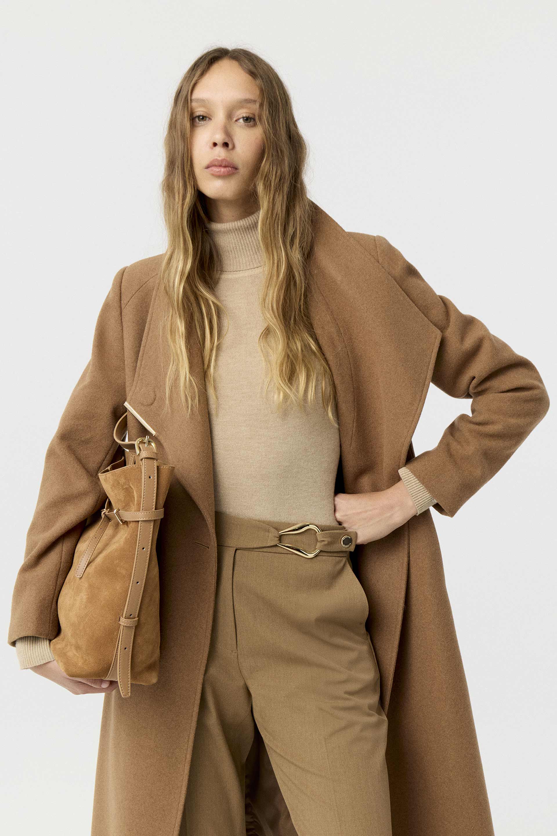 Tapado de paño de lana, de silueta entallada, cuello alto y manga larga. Presenta un botón metálico en el acceso, lazo en la cintura con terminaciones metálicas y avío imantado personalizado MKV en la solapa. Un tapado elegante y fácil de combinar, con un largo modular de tendencia que potencia cualquier look.