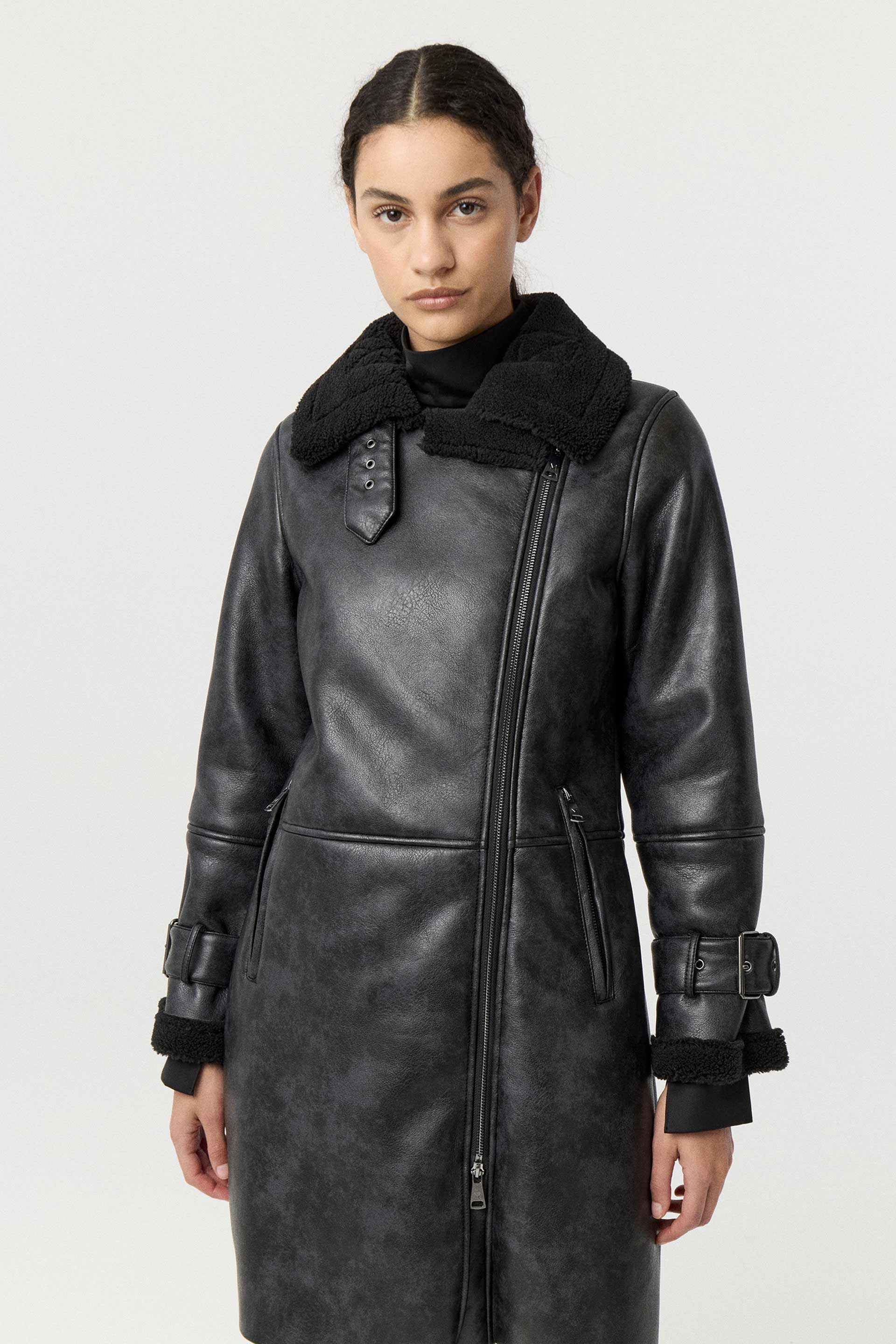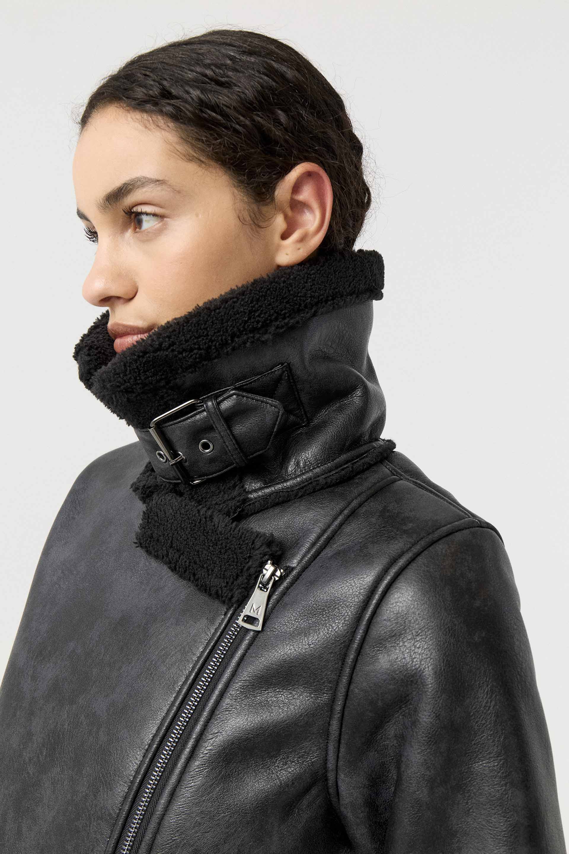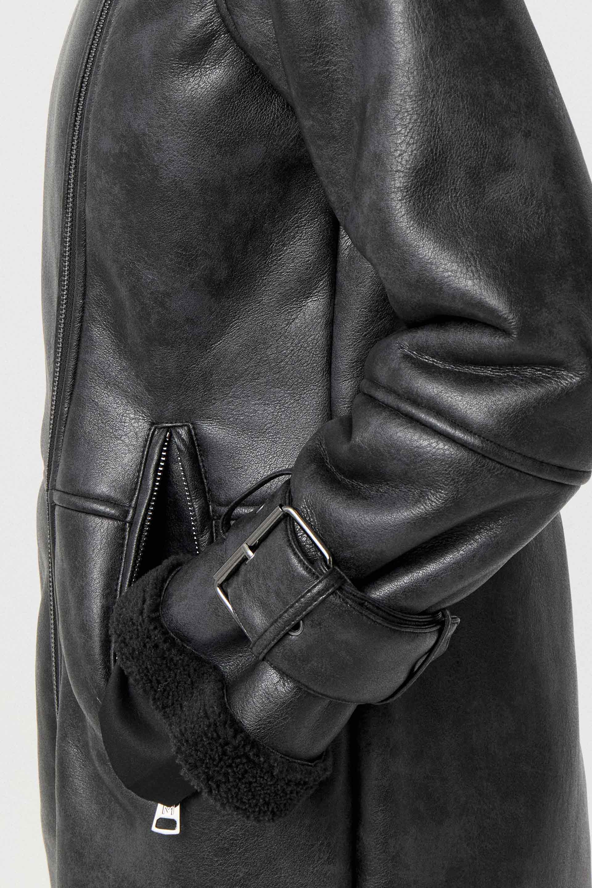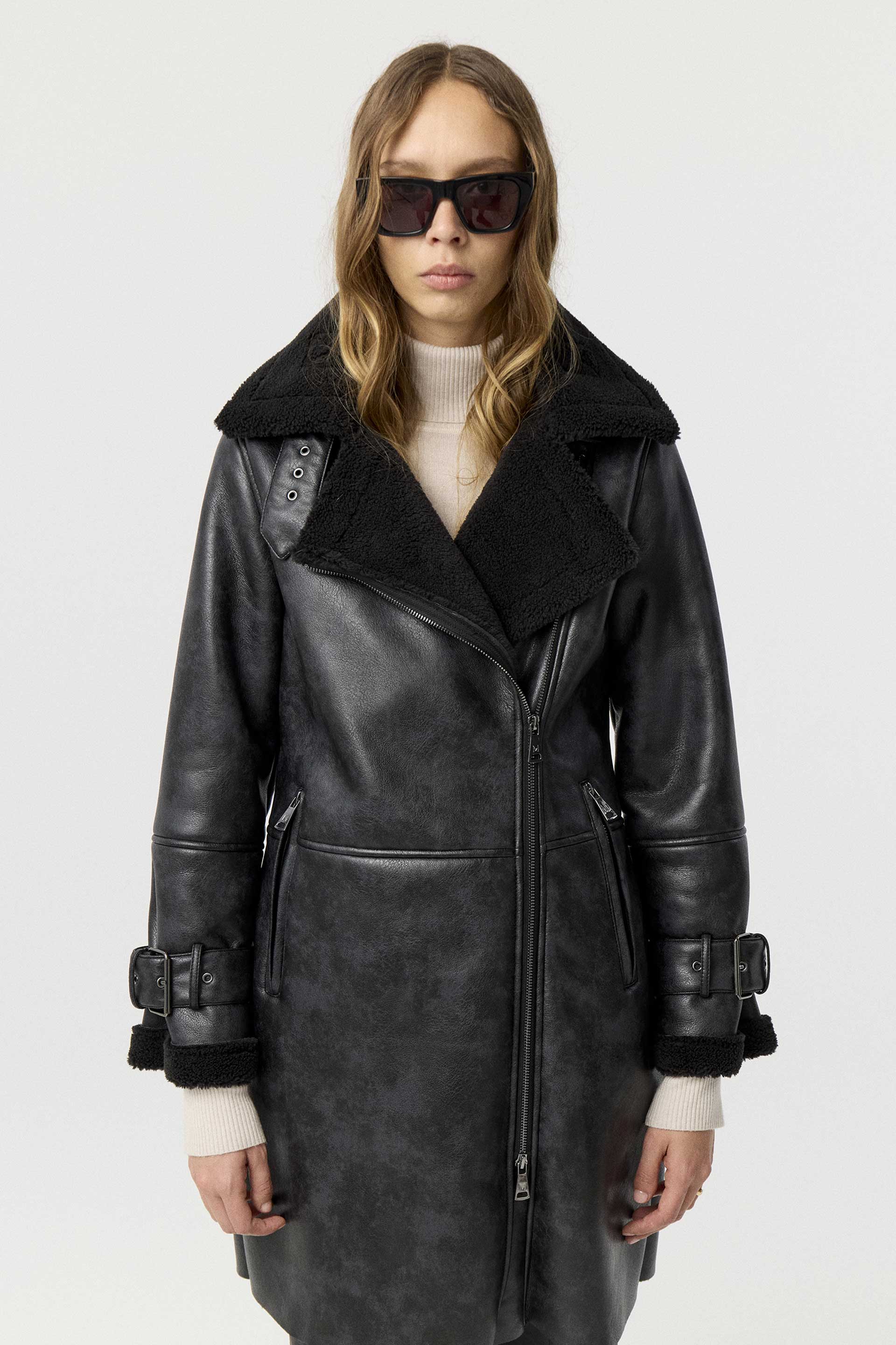 Tapado biker efecto cuero bondeado gastado, de silueta entallada y manga larga. Posee acceso y bolsillos delanteros con cierres metálicos personalizados MKV. Su género le aporta una dosis extra de abrigo, ideal para los días más fríos, y su acabado gastado lo convierte en una prenda moderna y versátil, perfecta tanto para salidas nocturnas como para looks de oficina.