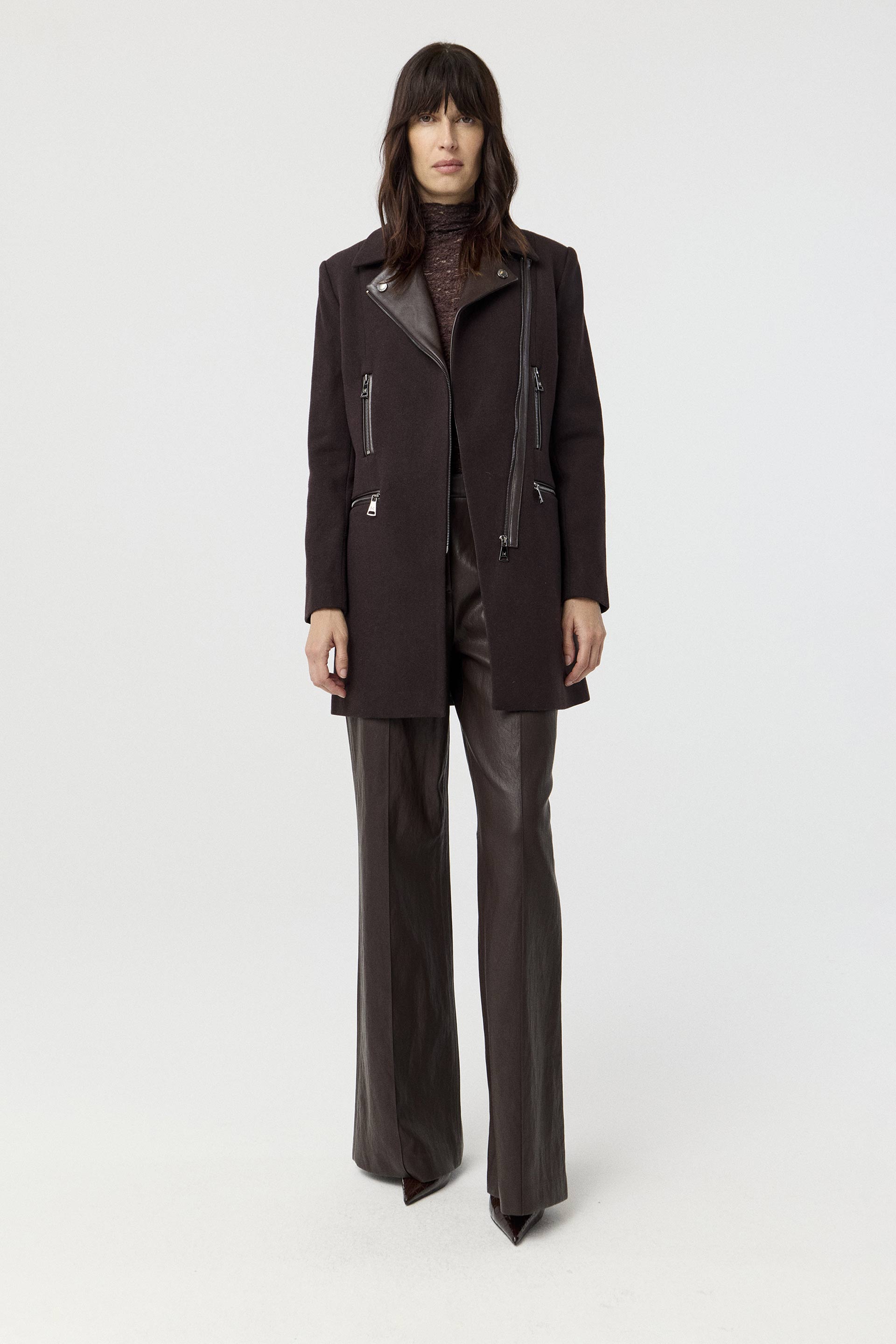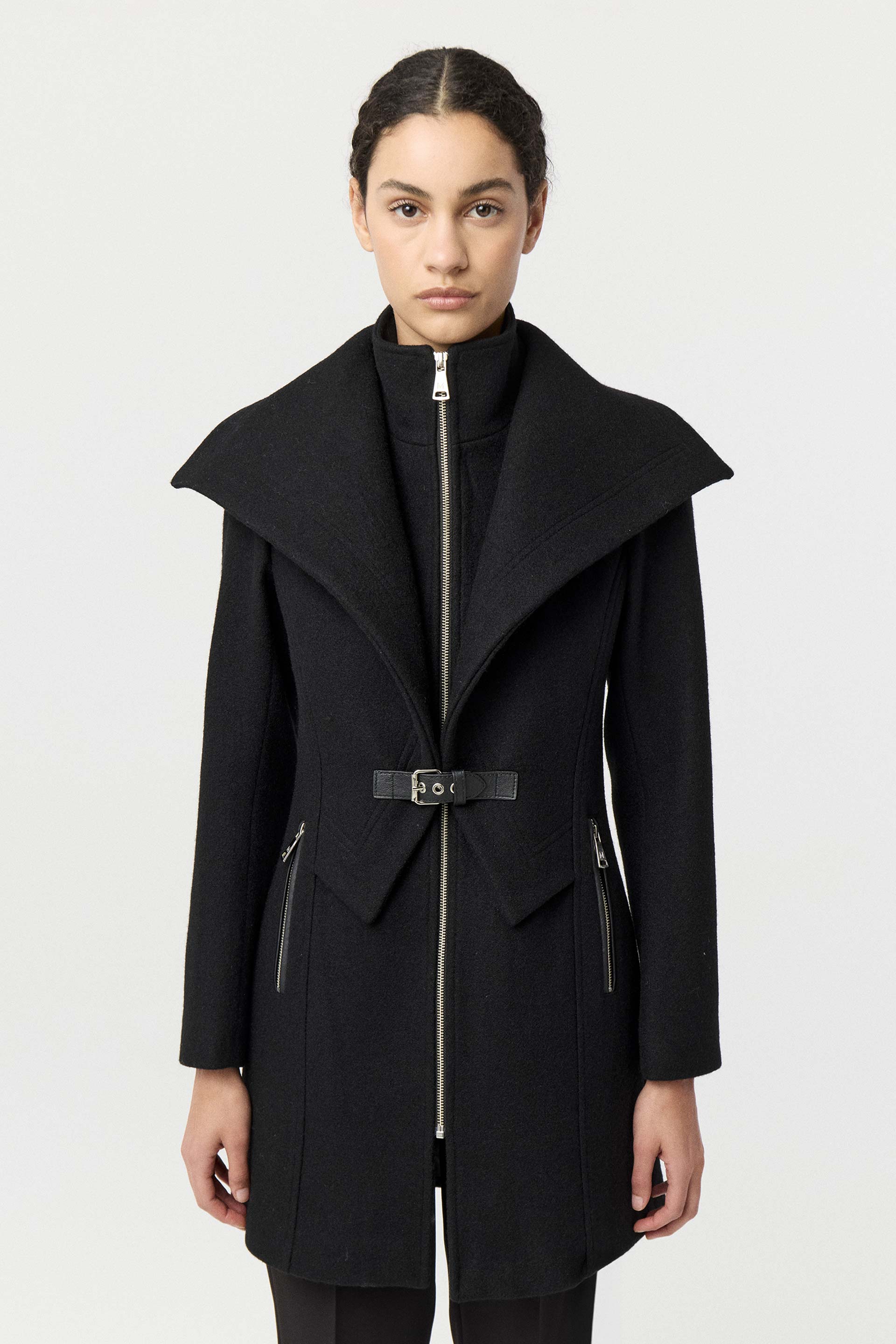 Tapado de paño de lana premium, de silueta entallada y manga larga. Su doble cuello aporta un detalle distintivo que lo eleva. Presenta acceso central con cierre metálico personalizado MKV y alamar efecto cuero en la cintura. Un tapado clásico pero original, un infaltable en tu guardarropa este invierno.