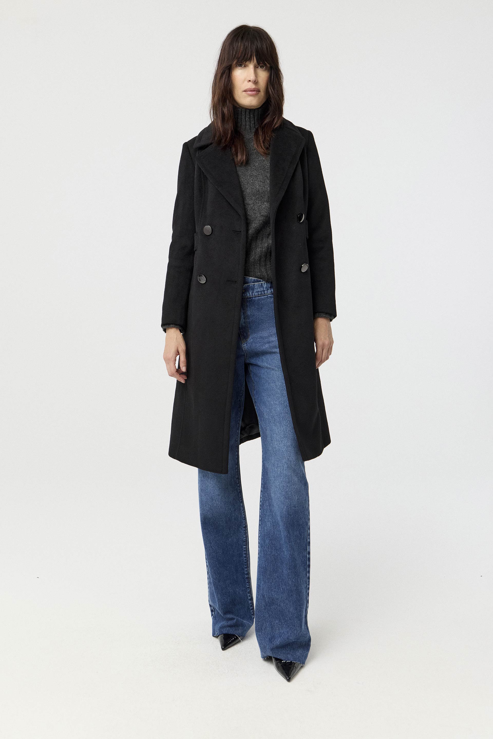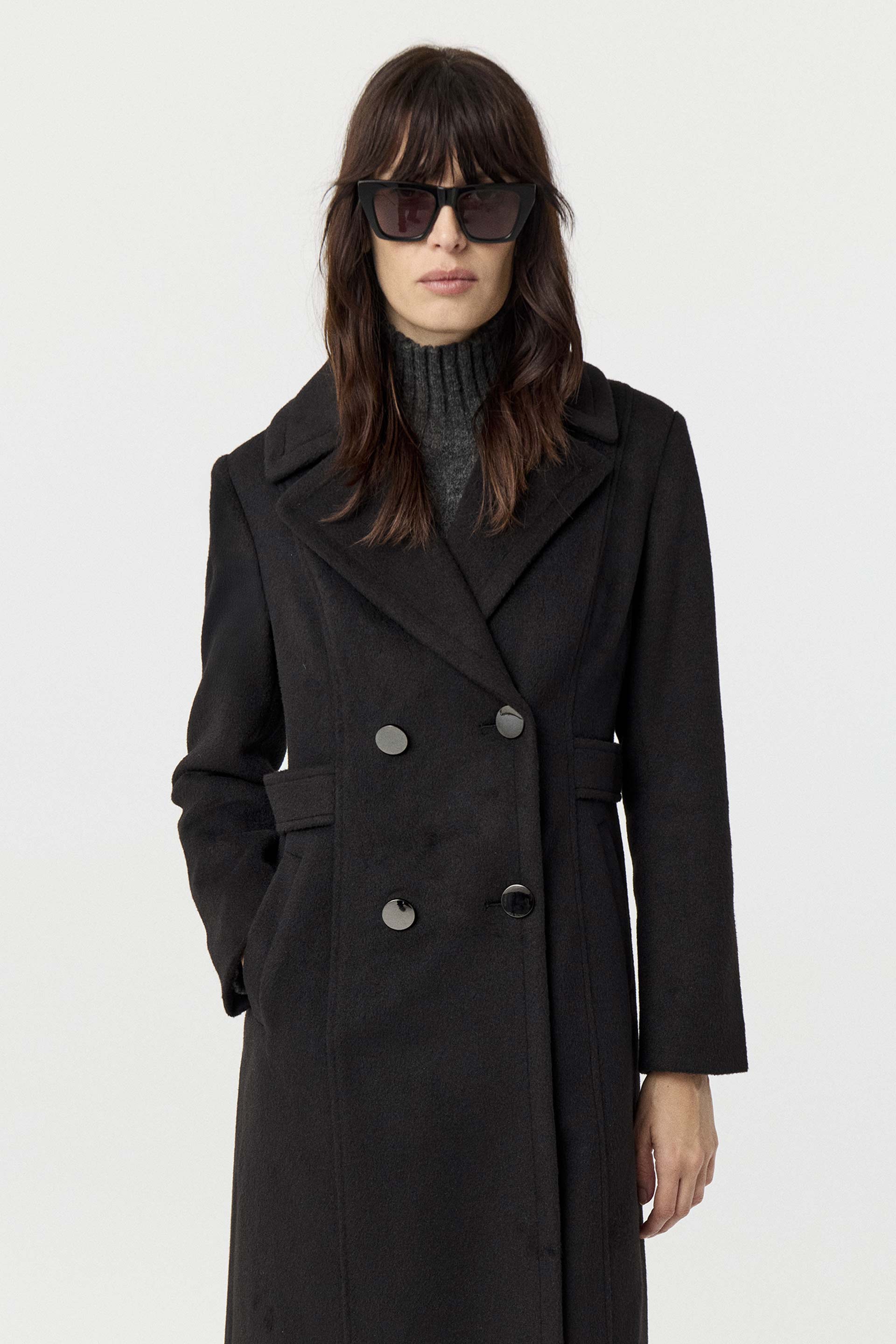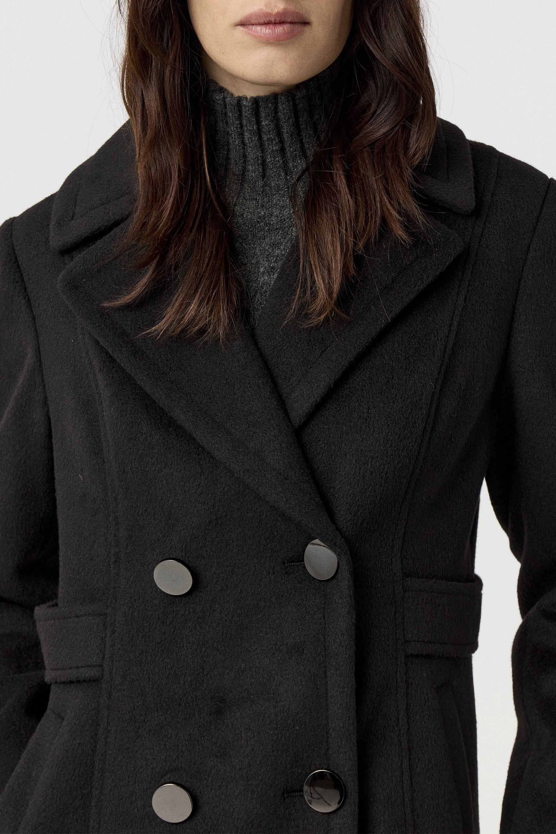 Tapado de paño cruzado, de silueta entallada y manga larga. Posee acceso con botones metálicos, bolsillos diagonales y tiras a la altura de la cintura. Su interior está forrado en acetato diagonal, lo que otorga mayor estructura a la prenda. Su largo modular y su diseño lo convierten en un tapado clásico y moderno, ideal para componer looks elegantes.
