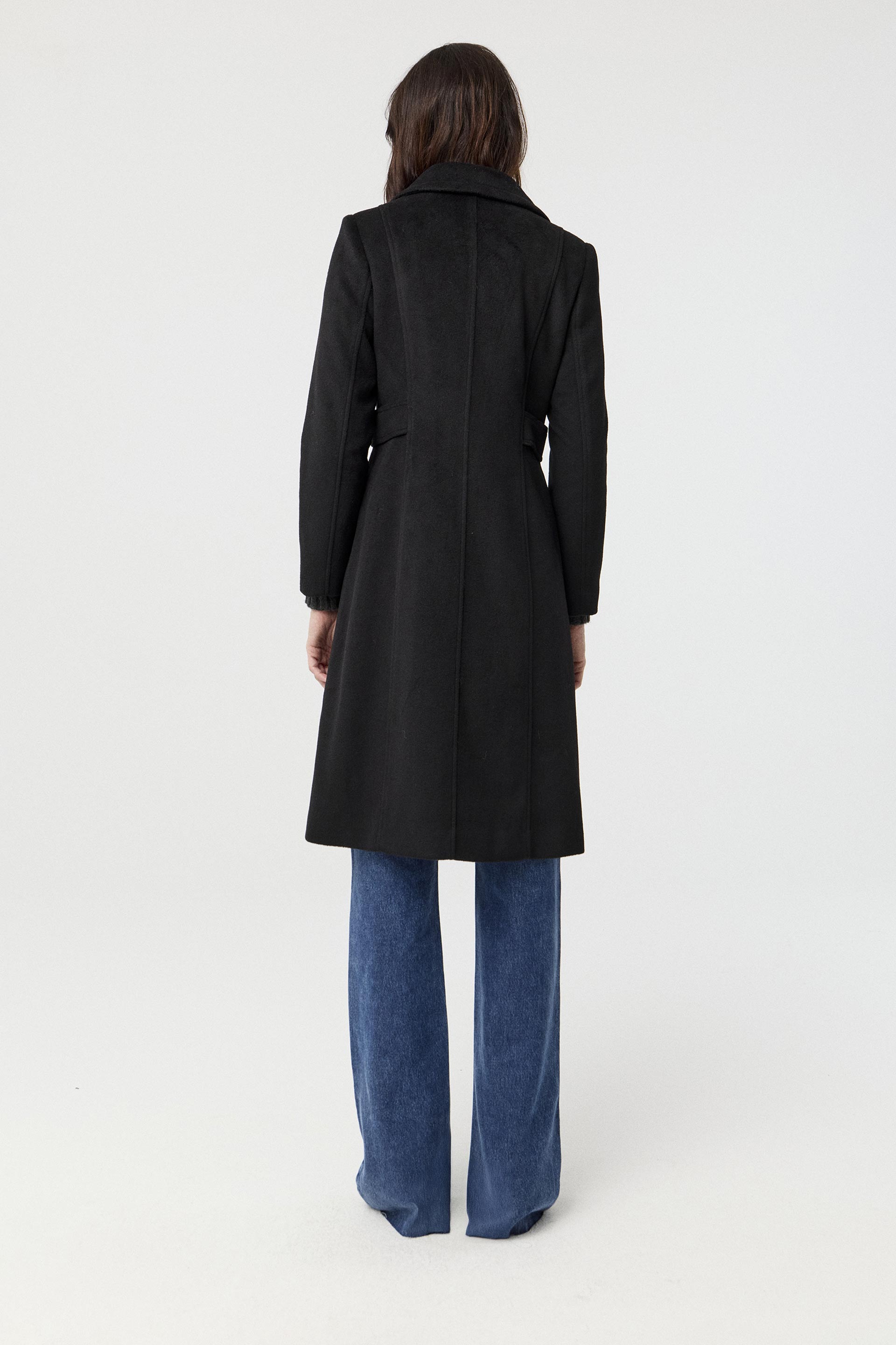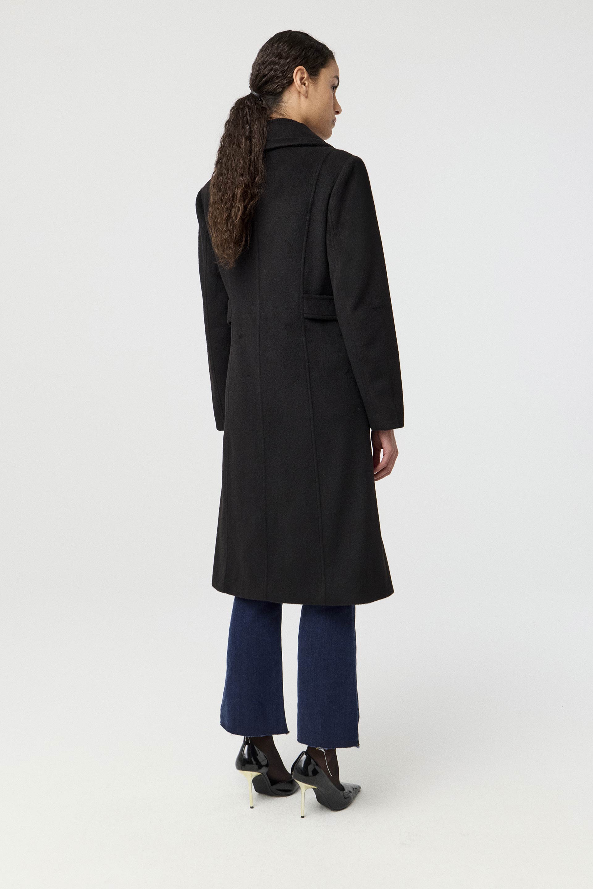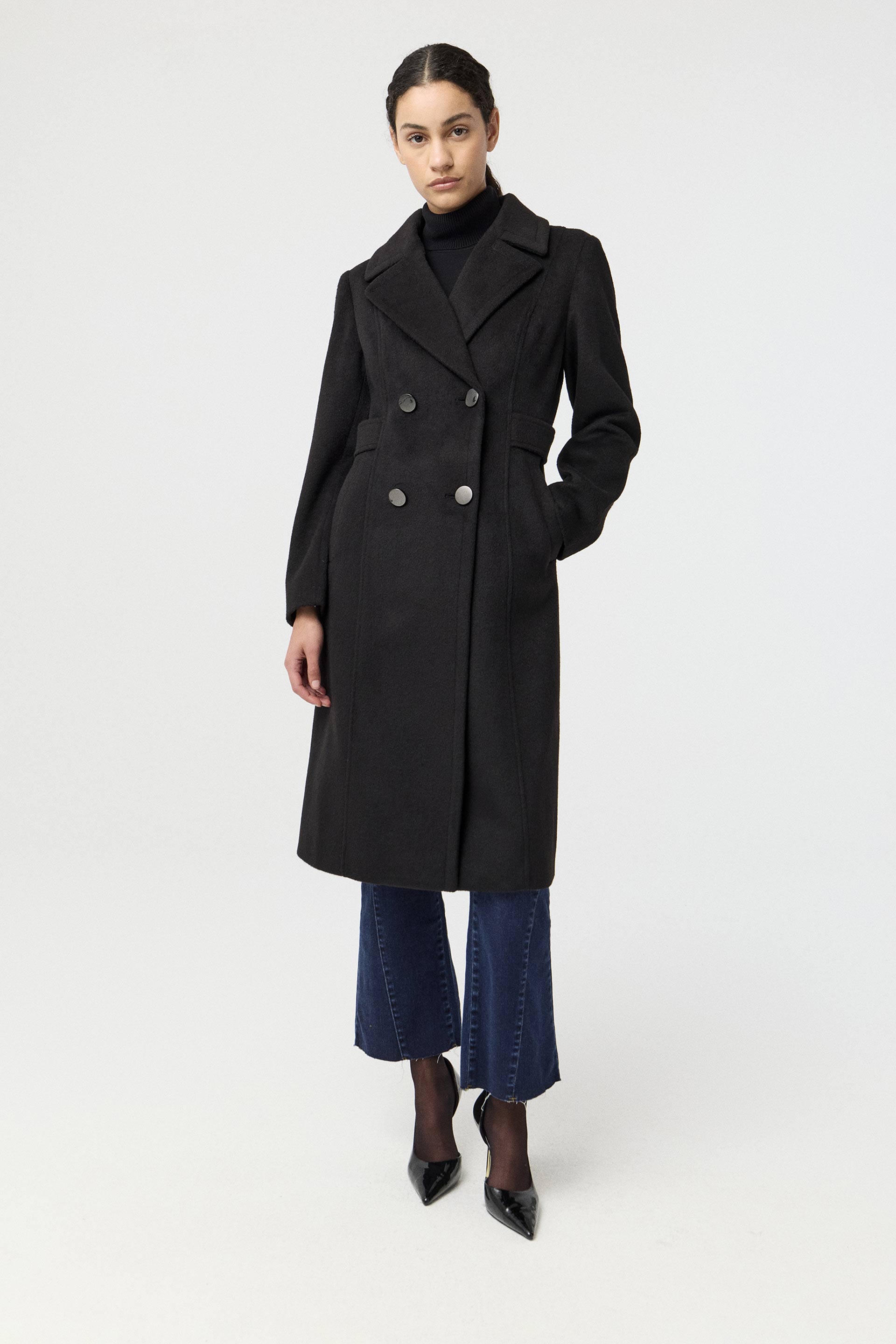 Tapado de paño cruzado, de silueta entallada y manga larga. Posee acceso con botones metálicos, bolsillos diagonales y tiras a la altura de la cintura. Su interior está forrado en acetato diagonal, lo que otorga mayor estructura a la prenda. Su largo modular y su diseño lo convierten en un tapado clásico y moderno, ideal para componer looks elegantes.