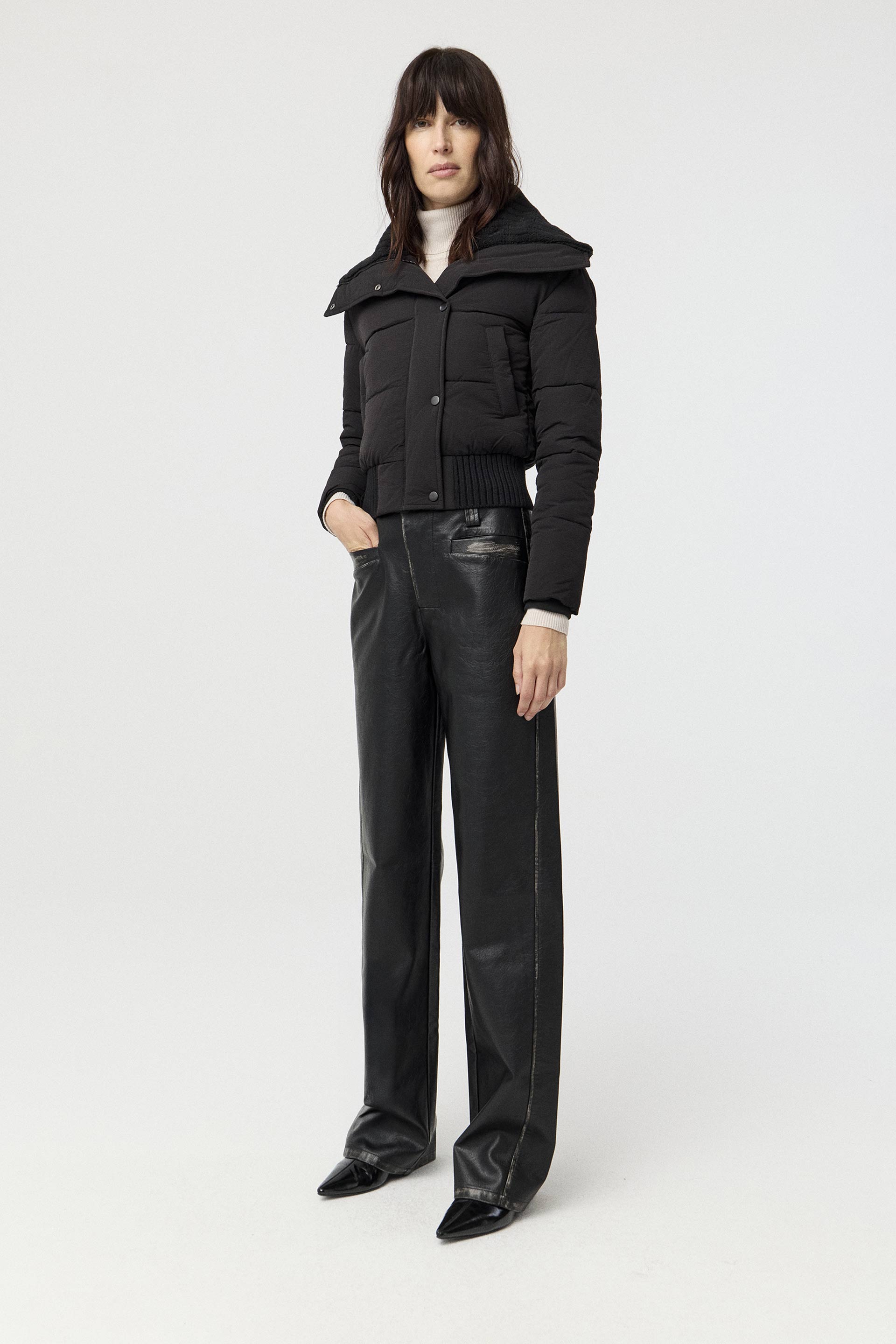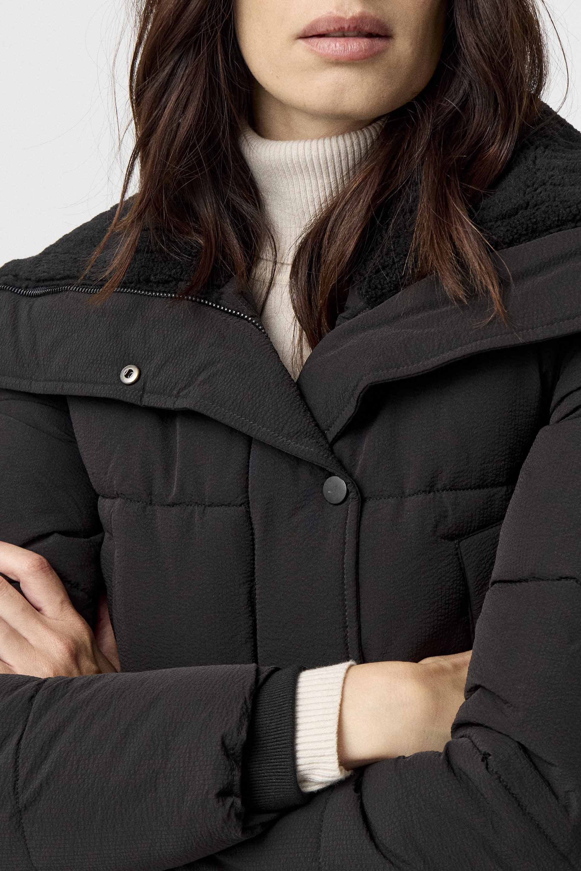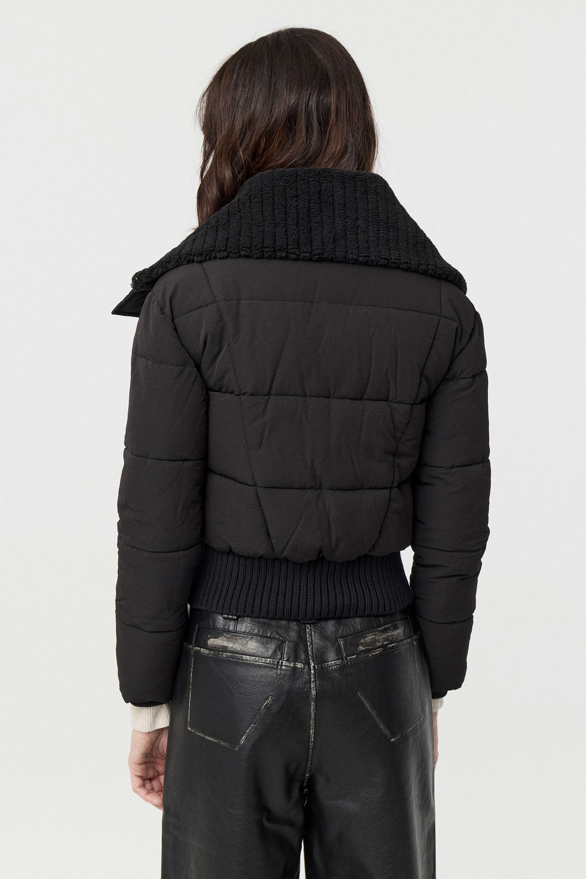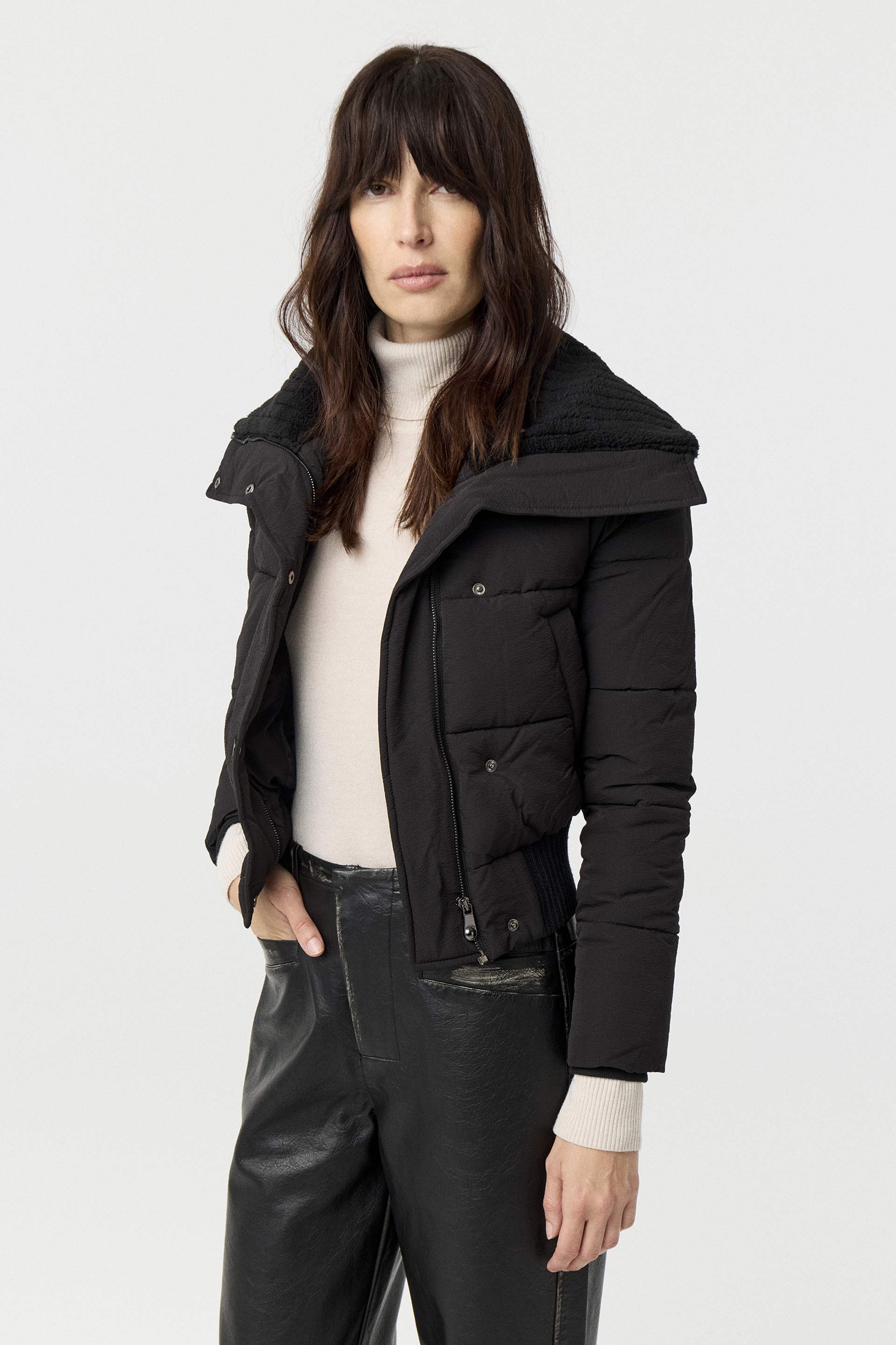 Campera corta de microfibra texturada mate, de silueta relajada y mangas largas. Posee cuello con corderito, cintura en tela combinación, acceso con cierre metálico y broches personalizados MKV. Su largo modular, su silueta y el acabado mate la convierten en una prenda moderna ideal para elevar cualquiera de tus looks.