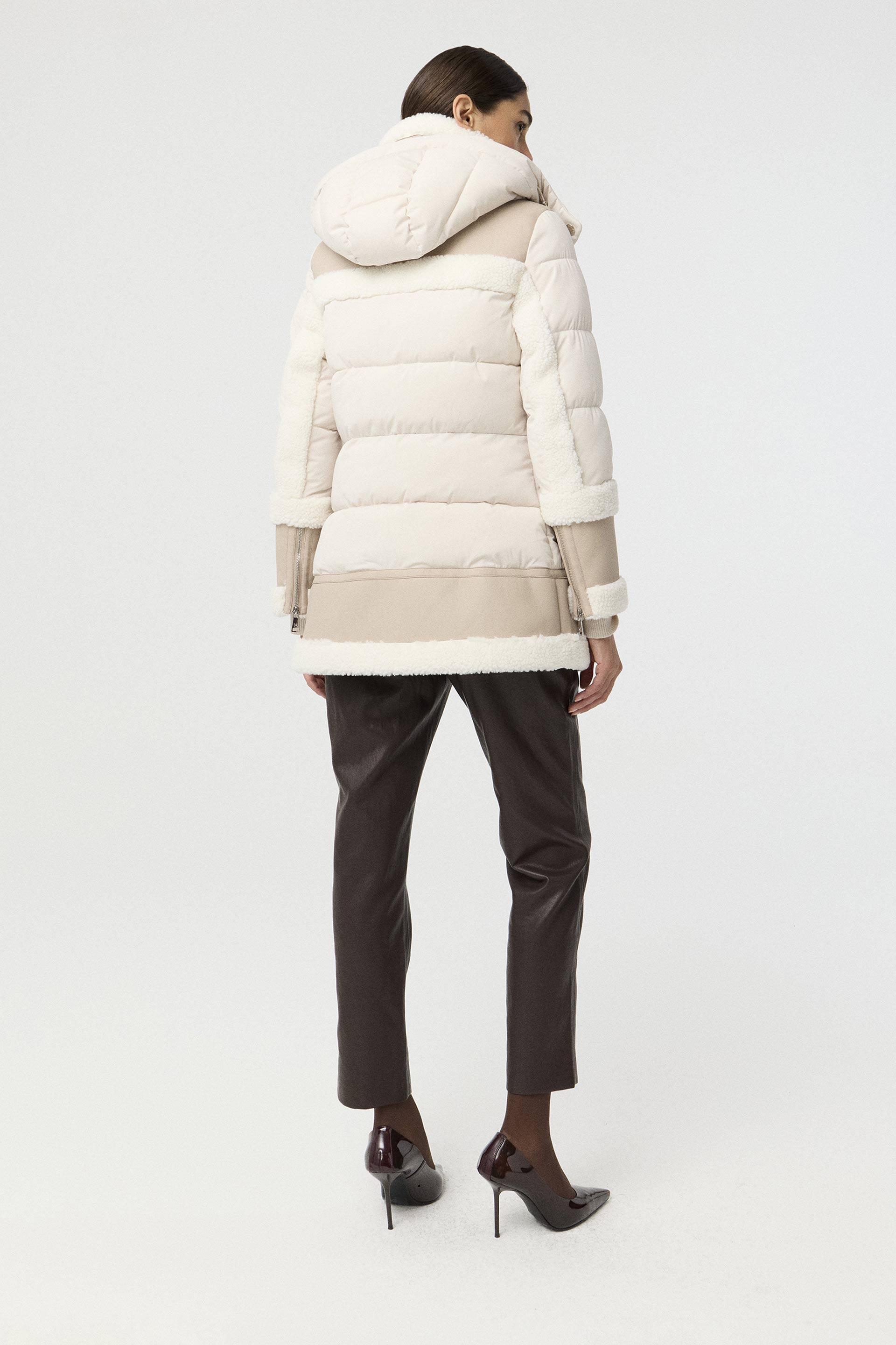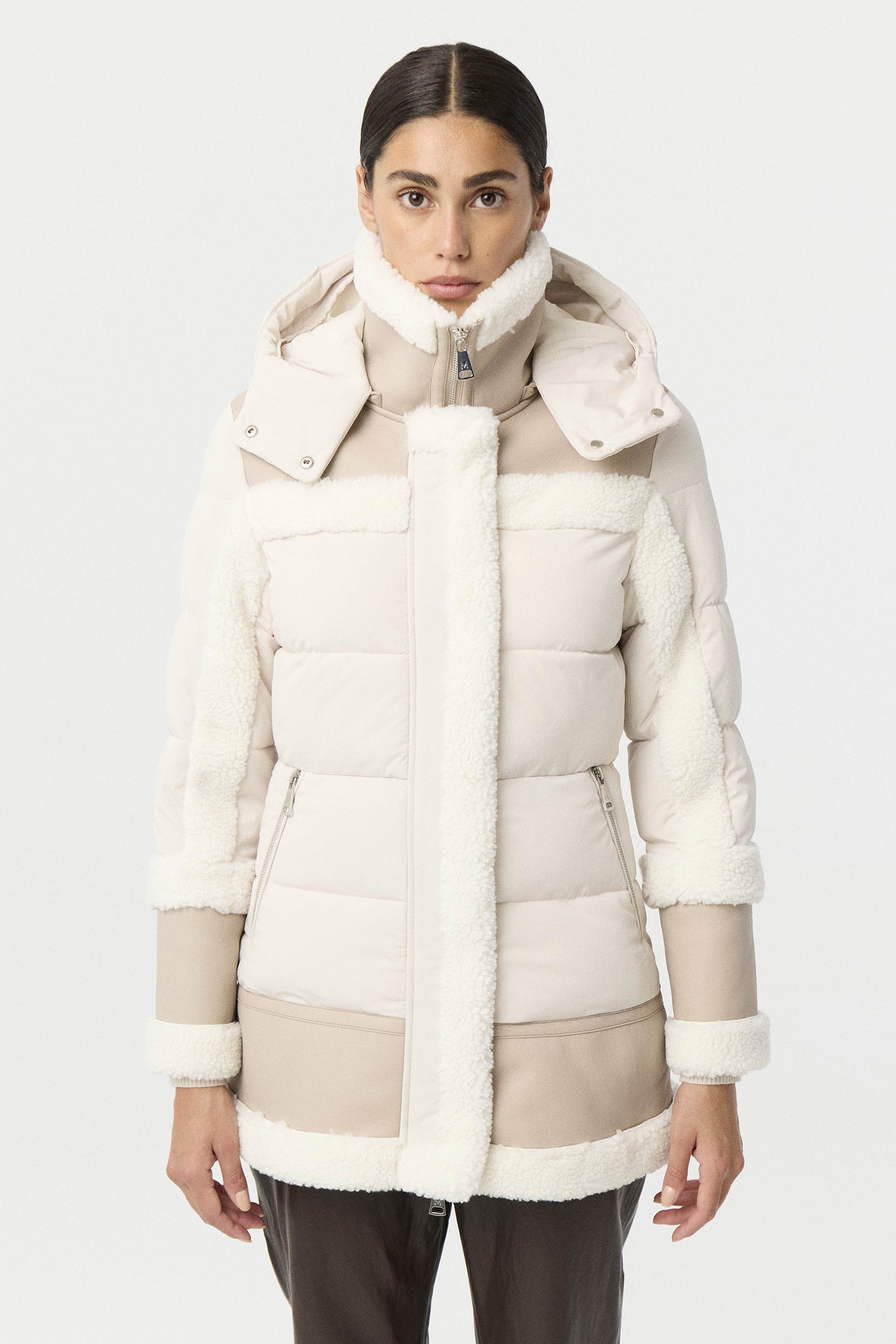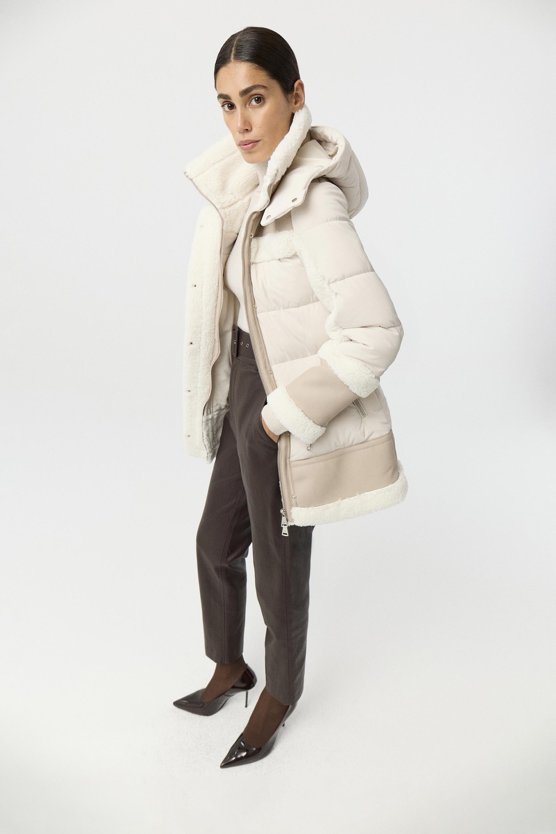 Campera tipo gamulán, larga y de silueta recta. Combinada con microfibra, efecto cuero y corderito. Posee capucha, acceso central con cierre y bolsillos con cierres metálicos personalizados MKV. La mezcla de géneros y su interior en pelo sintético la hacen ideal para los días más fríos.