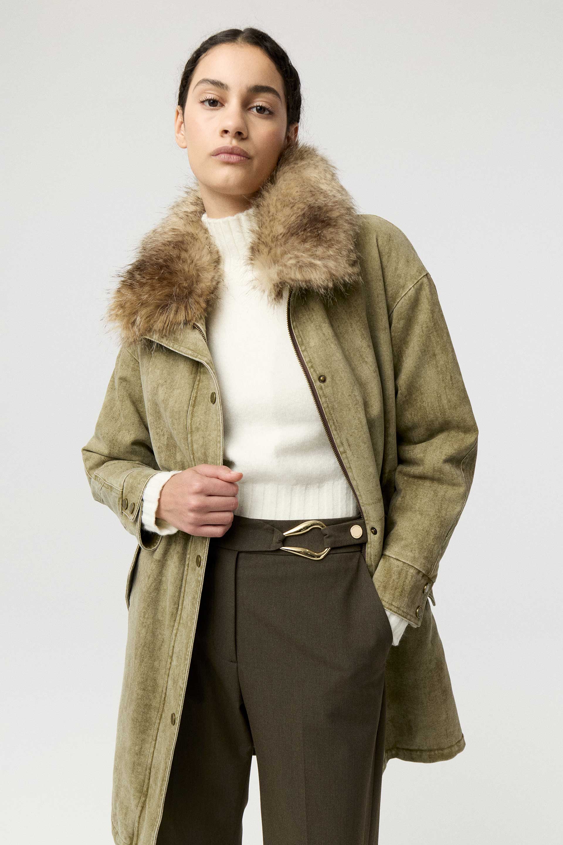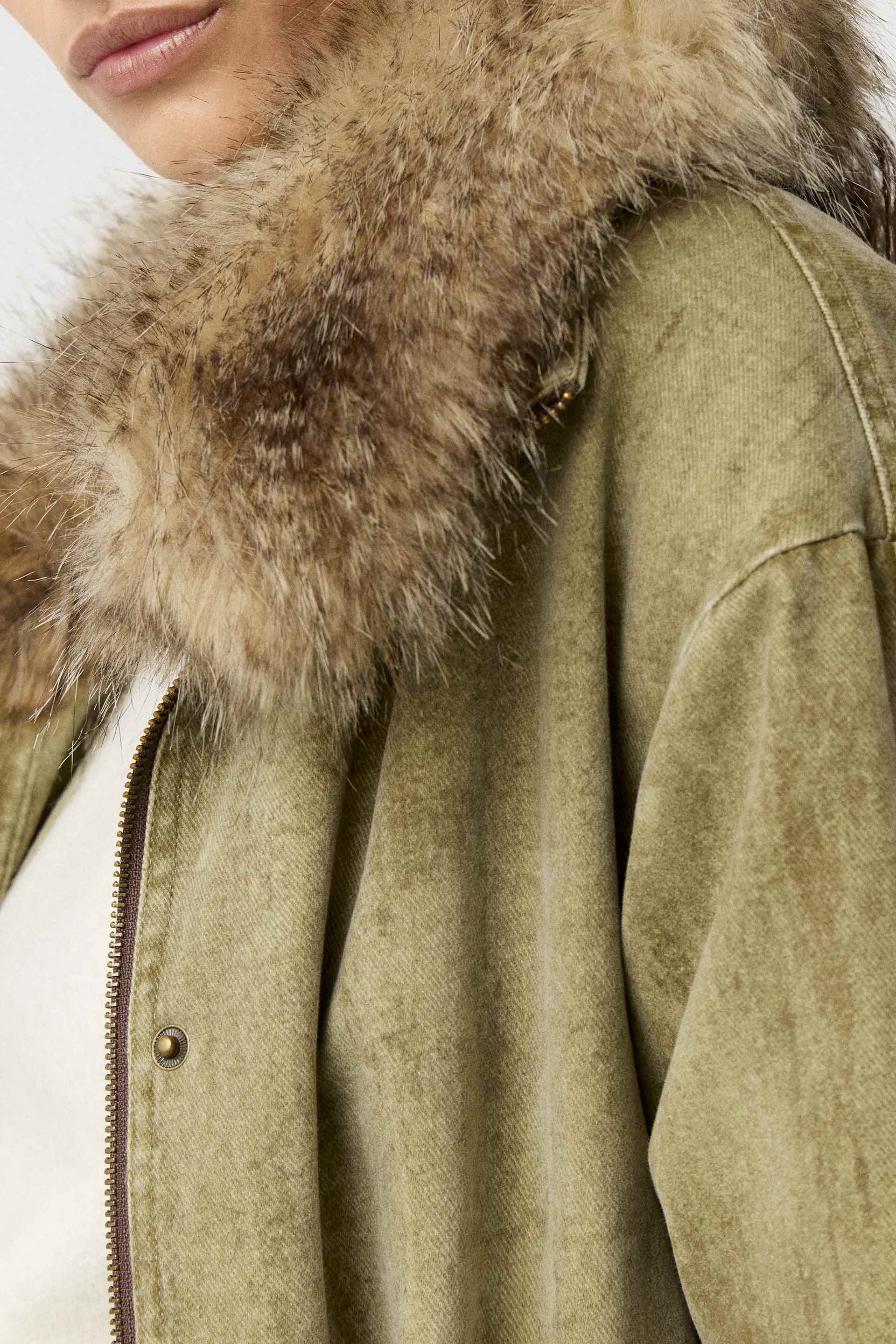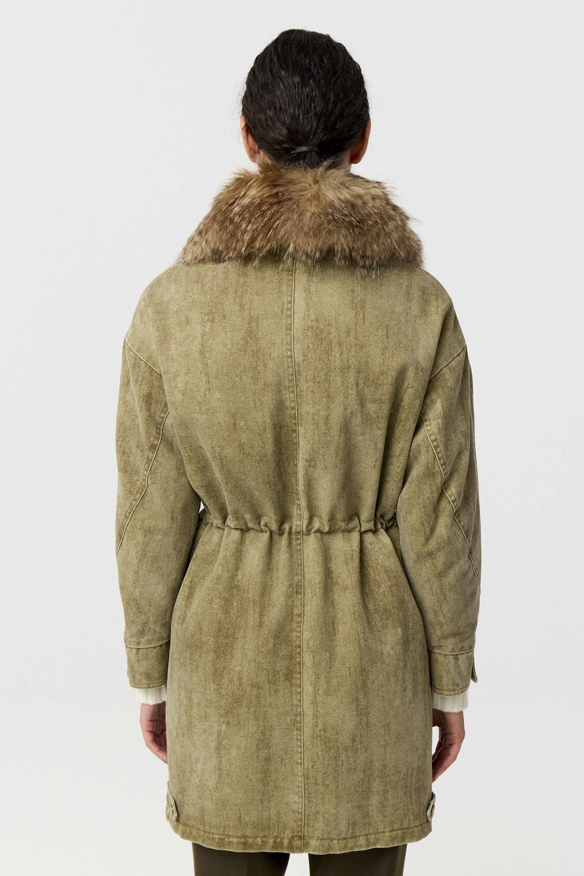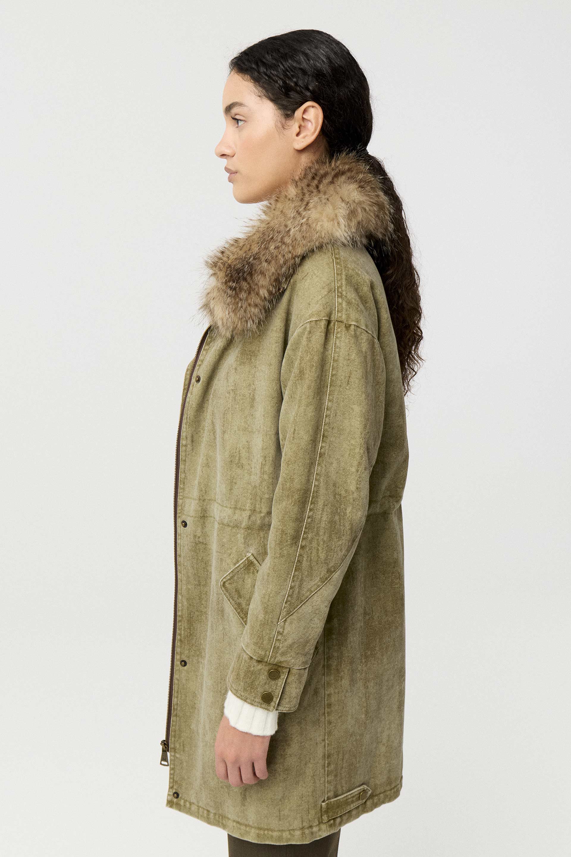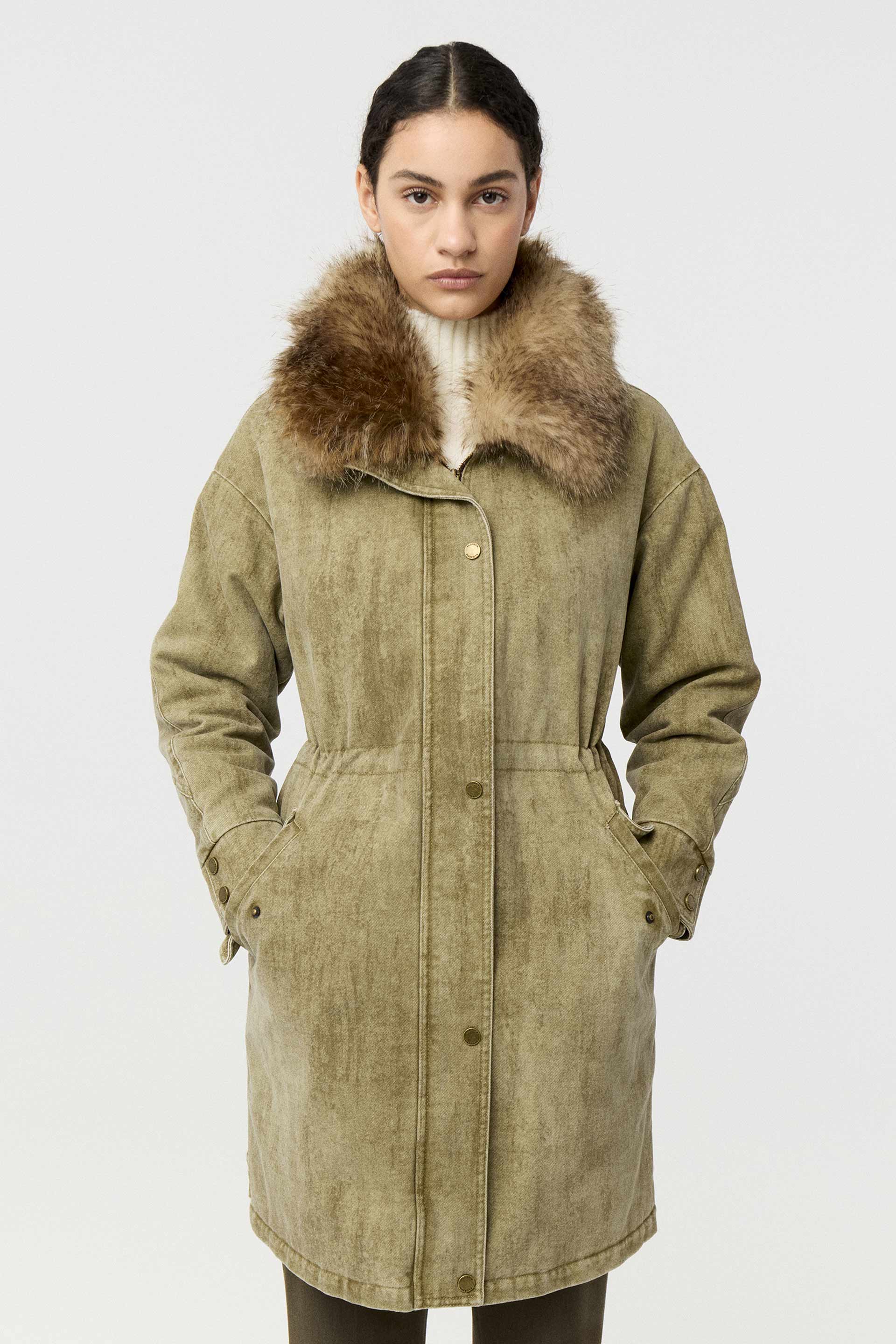 Parka larga de denim 100% algodón, de silueta relajada y manga larga. Posee capucha con pelo, acceso con cierre y broches metálicos personalizados MKV. Su interior está relleno y forrado con satén elastizado para brindar mayor comodidad y abrigo. Su género, su lavado con efecto gastado y su diseño la convierten en una prenda moderna y canchera que elevará todos tus looks.
