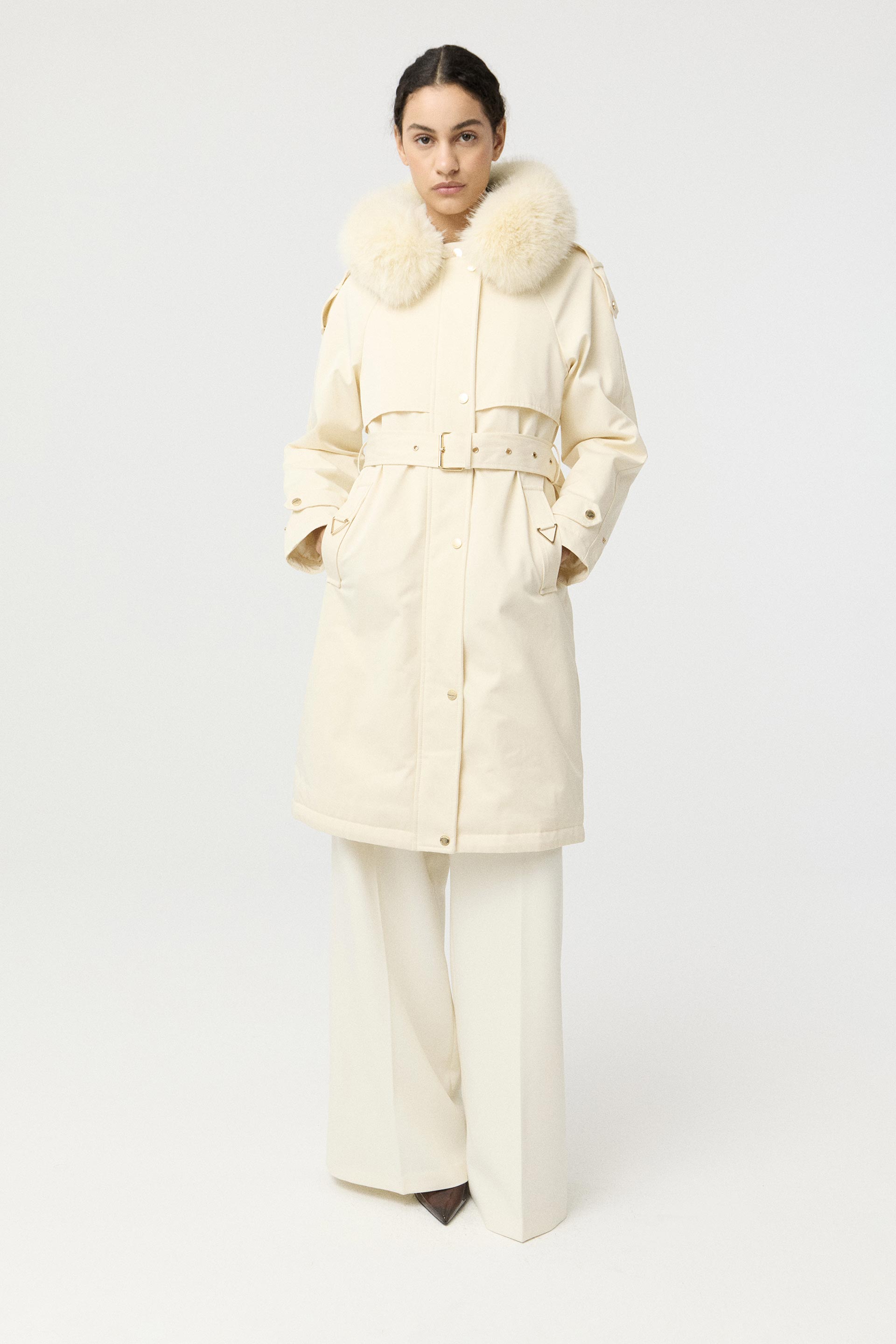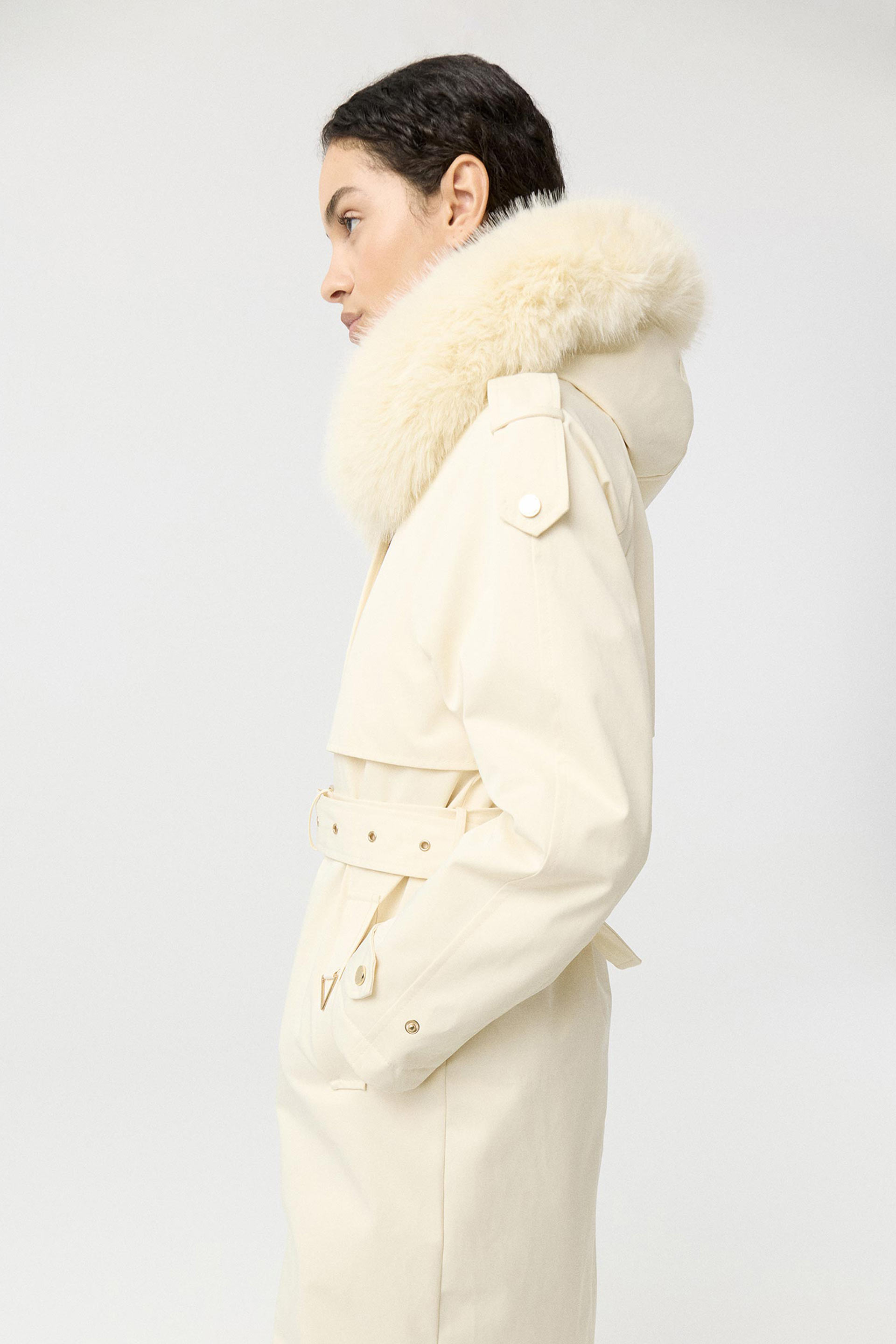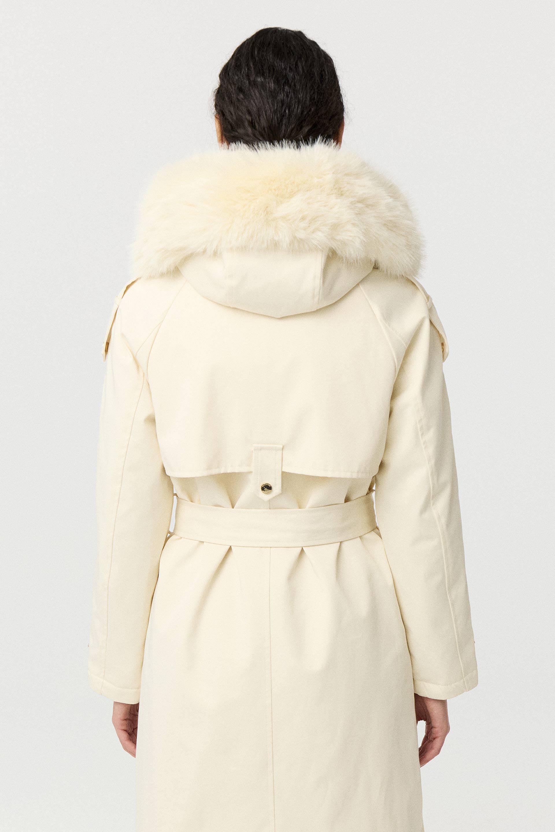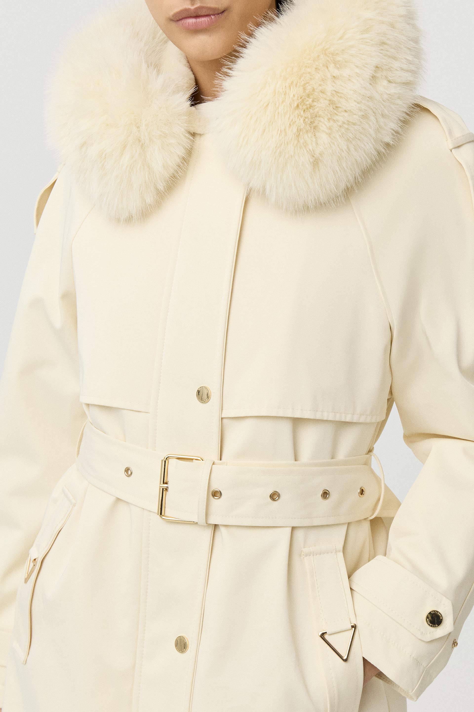 Parka larga de gabardina impermeable, de silueta entallada y manga larga. Posee capucha con pelo, cinturón con hebilla que permite un mayor ajuste en la cintura, acceso con cierre y broches metálicos personalizados MKV. Su interior está forrado con piel sintética, brindando mayor abrigo. Sus detalles metálicos en los bolsillos y su diseño la convierten en un ítem sofisticado y moderno que no puede faltarte este invierno para complementar tus looks.