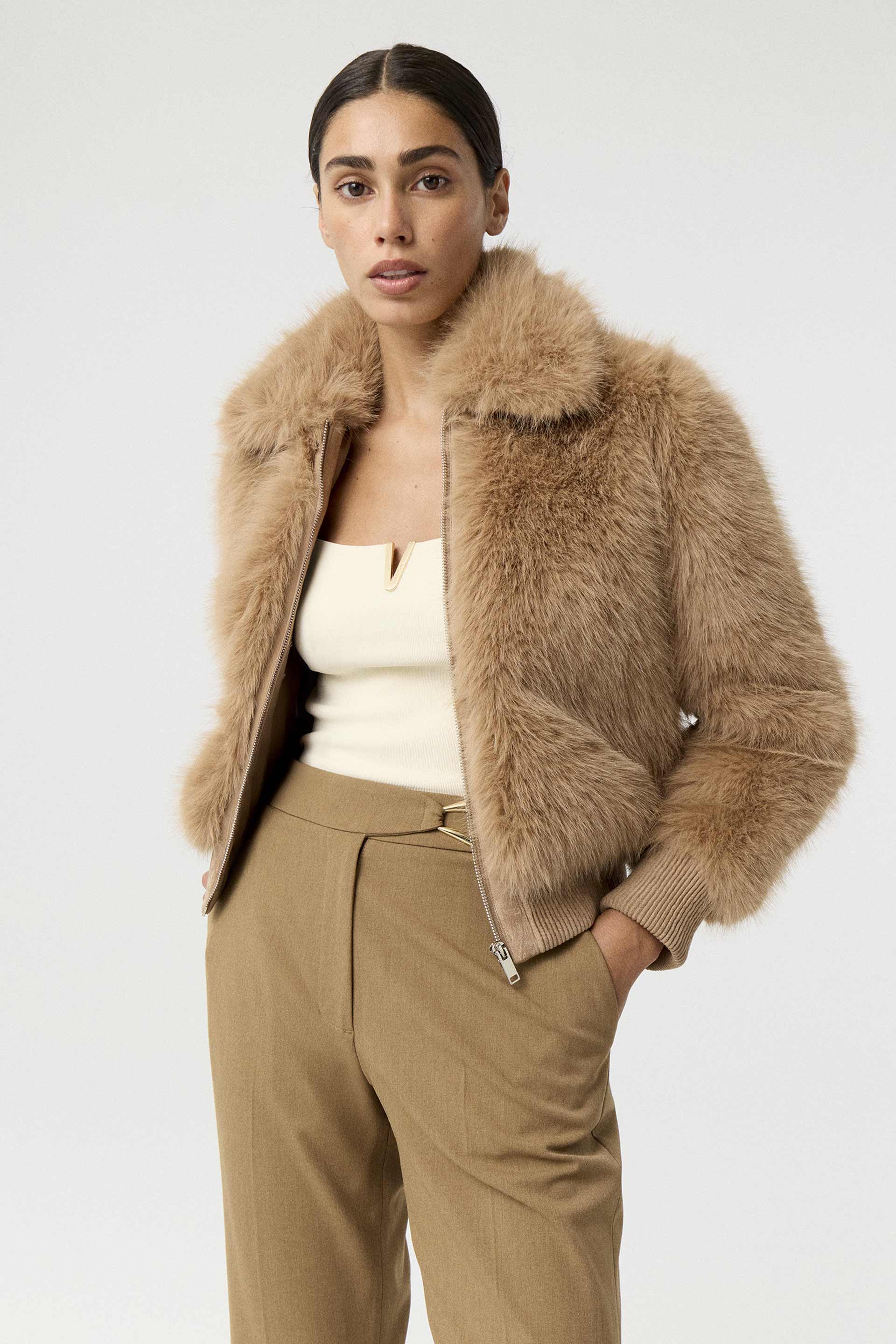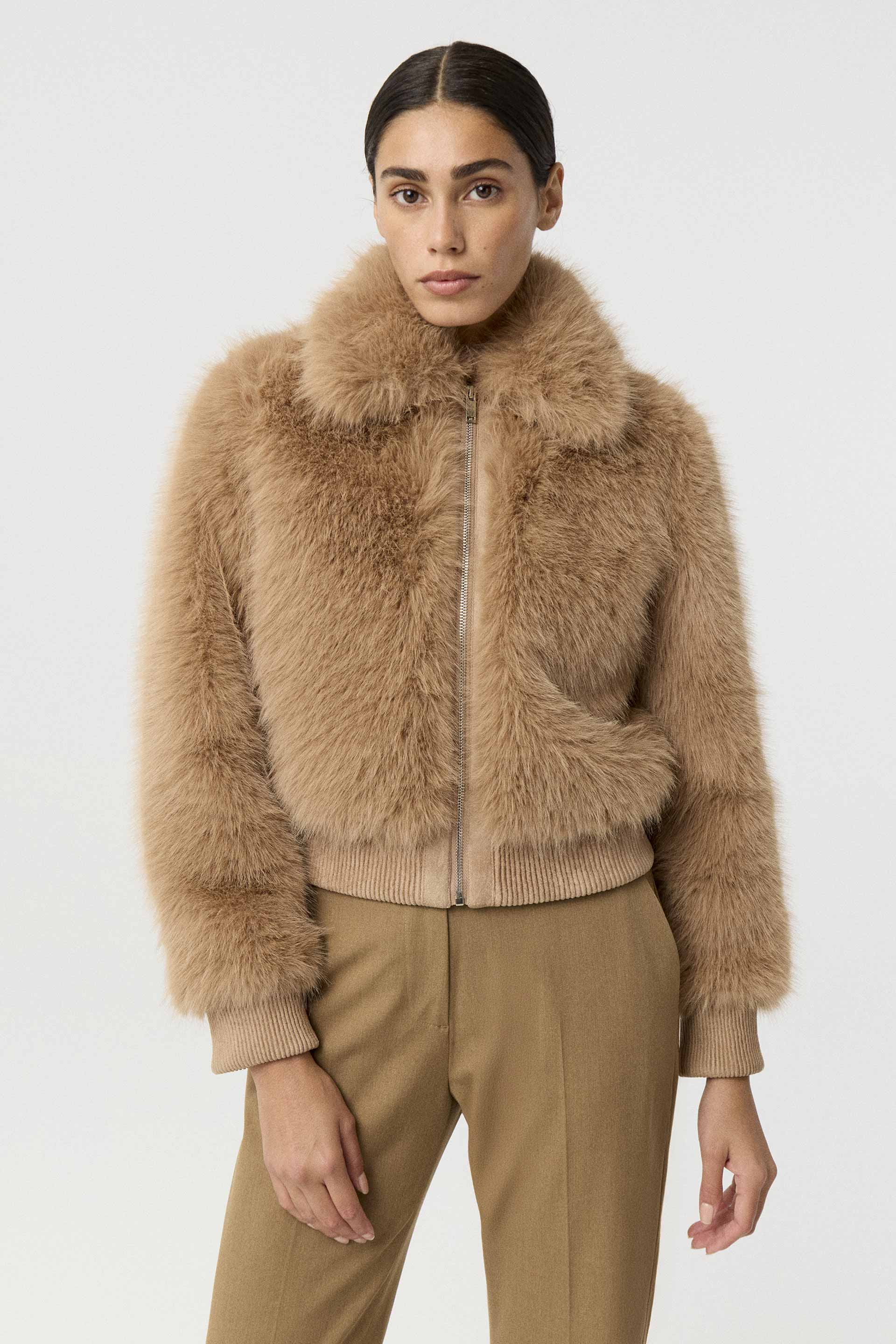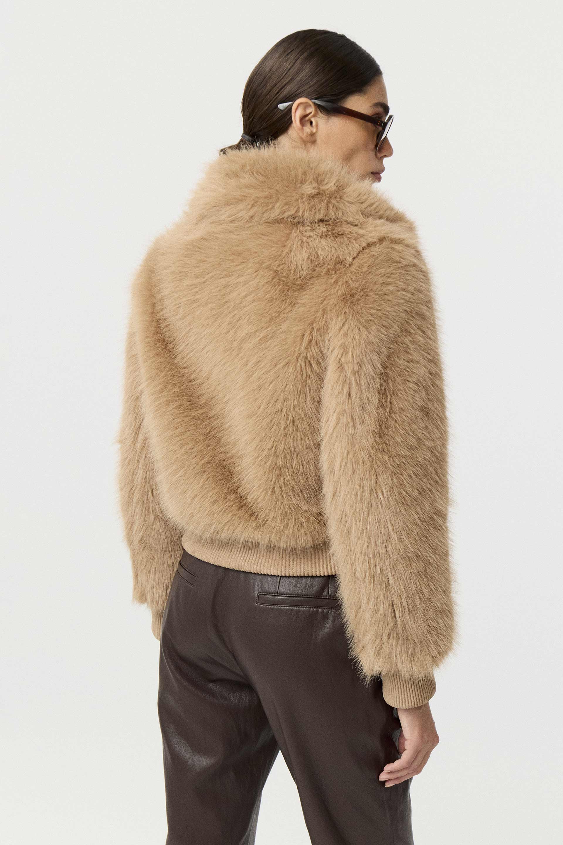 Campera corta efecto piel, de silueta relajada y manga larga. Posee acceso central con cierre metálico MKV, bolsillos laterales y puños en tela combinación gamuza. Su diseño, su género y su silueta la convierten en un ítem de absoluta tendencia. Ideal para una salida de noche.