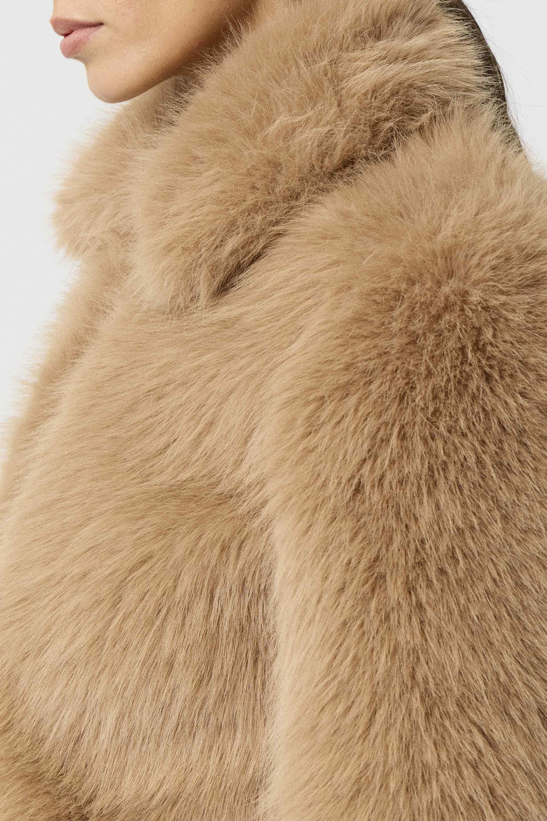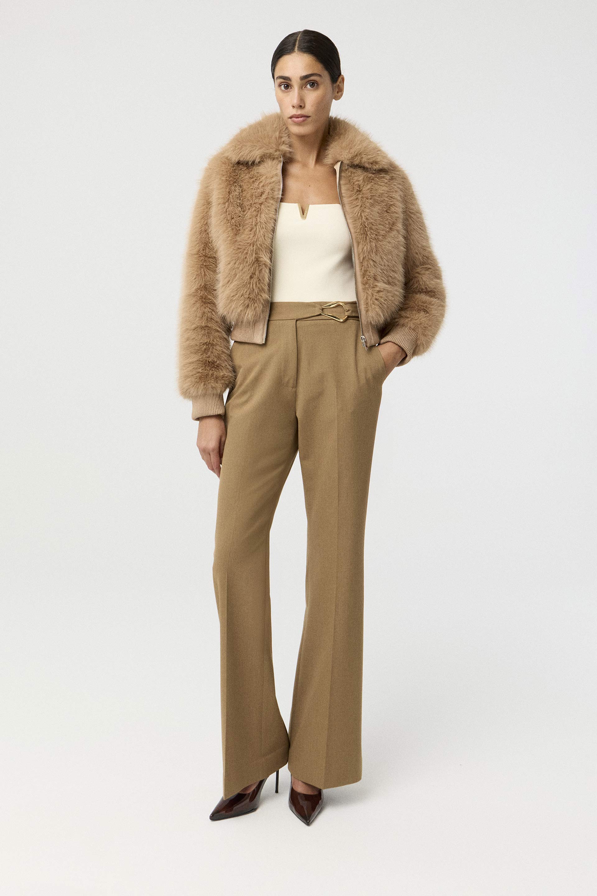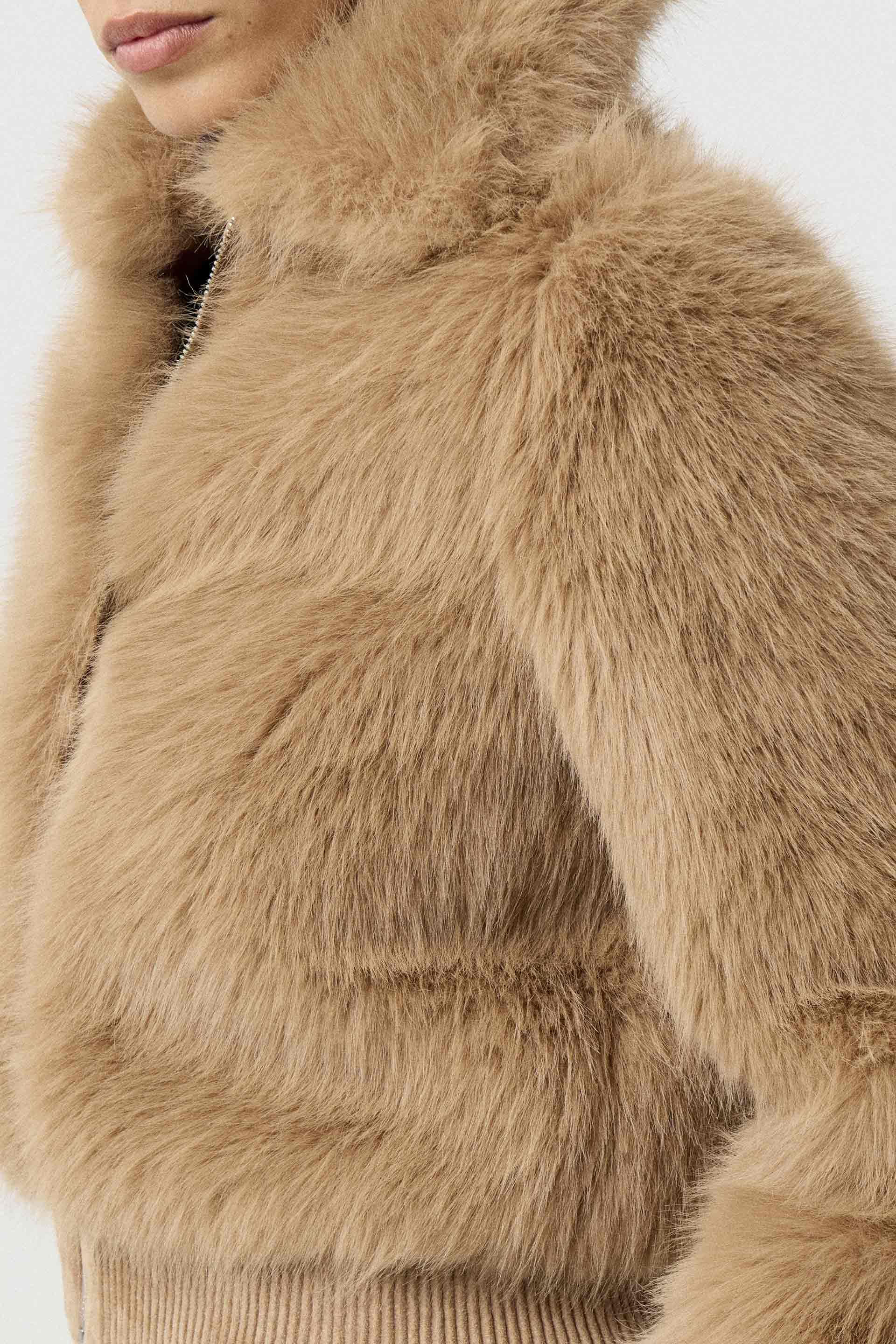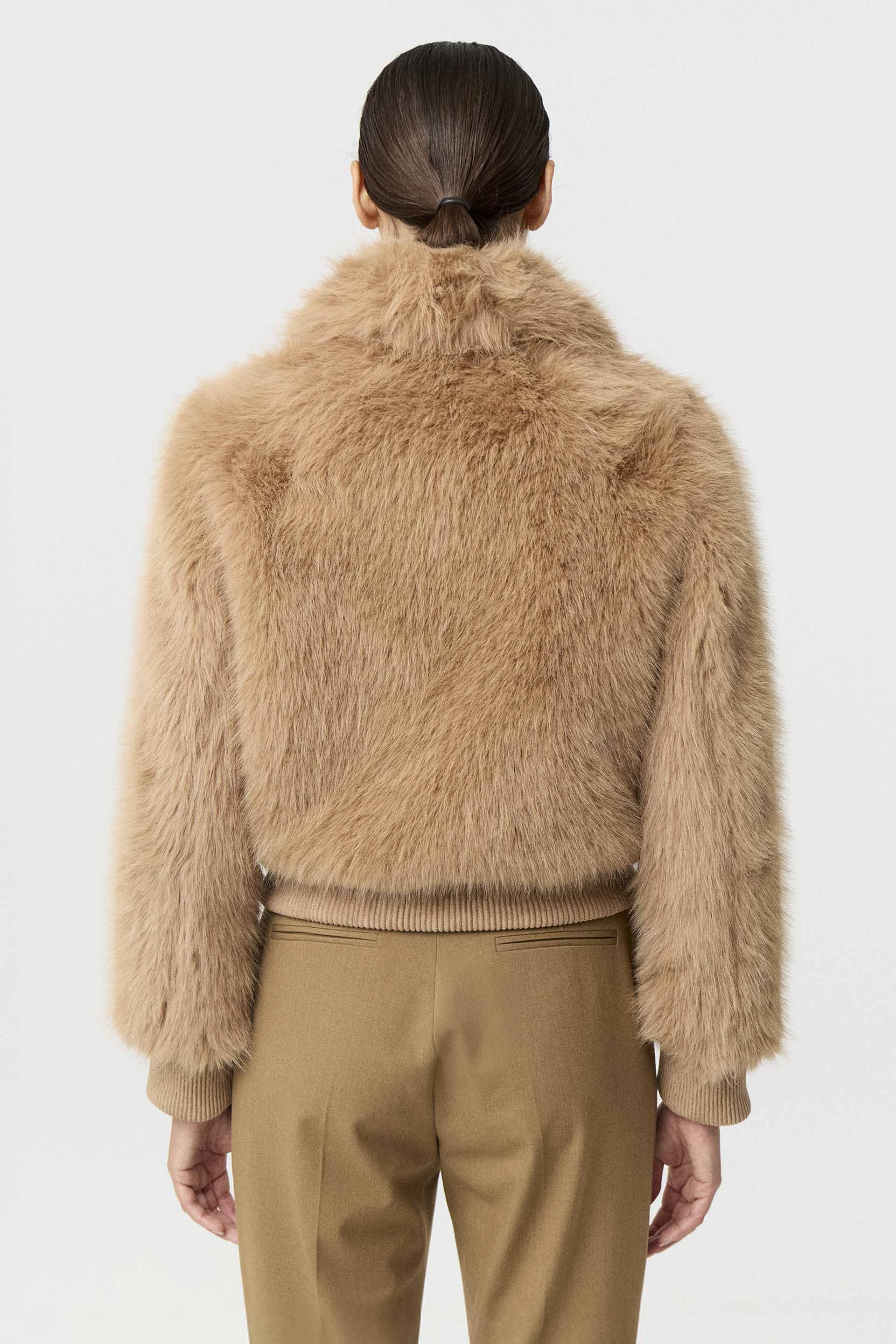 Campera corta efecto piel, de silueta relajada y manga larga. Posee acceso central con cierre metálico MKV, bolsillos laterales y puños en tela combinación gamuza. Su diseño, su género y su silueta la convierten en un ítem de absoluta tendencia. Ideal para una salida de noche.
