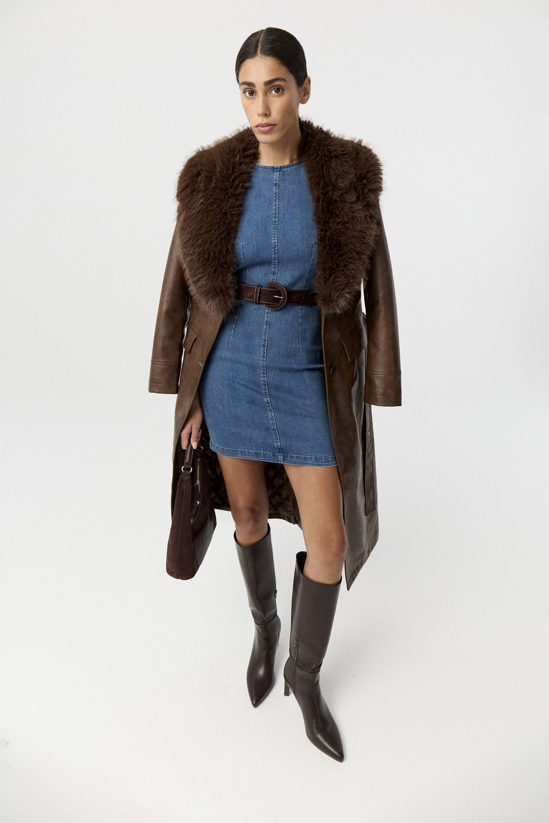 Vestido corto de denim elastizado, de silueta entallada y sin mangas. Posee escote a la base, recortes y pinzas de entalle en el delantero. Su diseño y su género lo convierten en un ítem canchero, ideal para un evento de noche.
