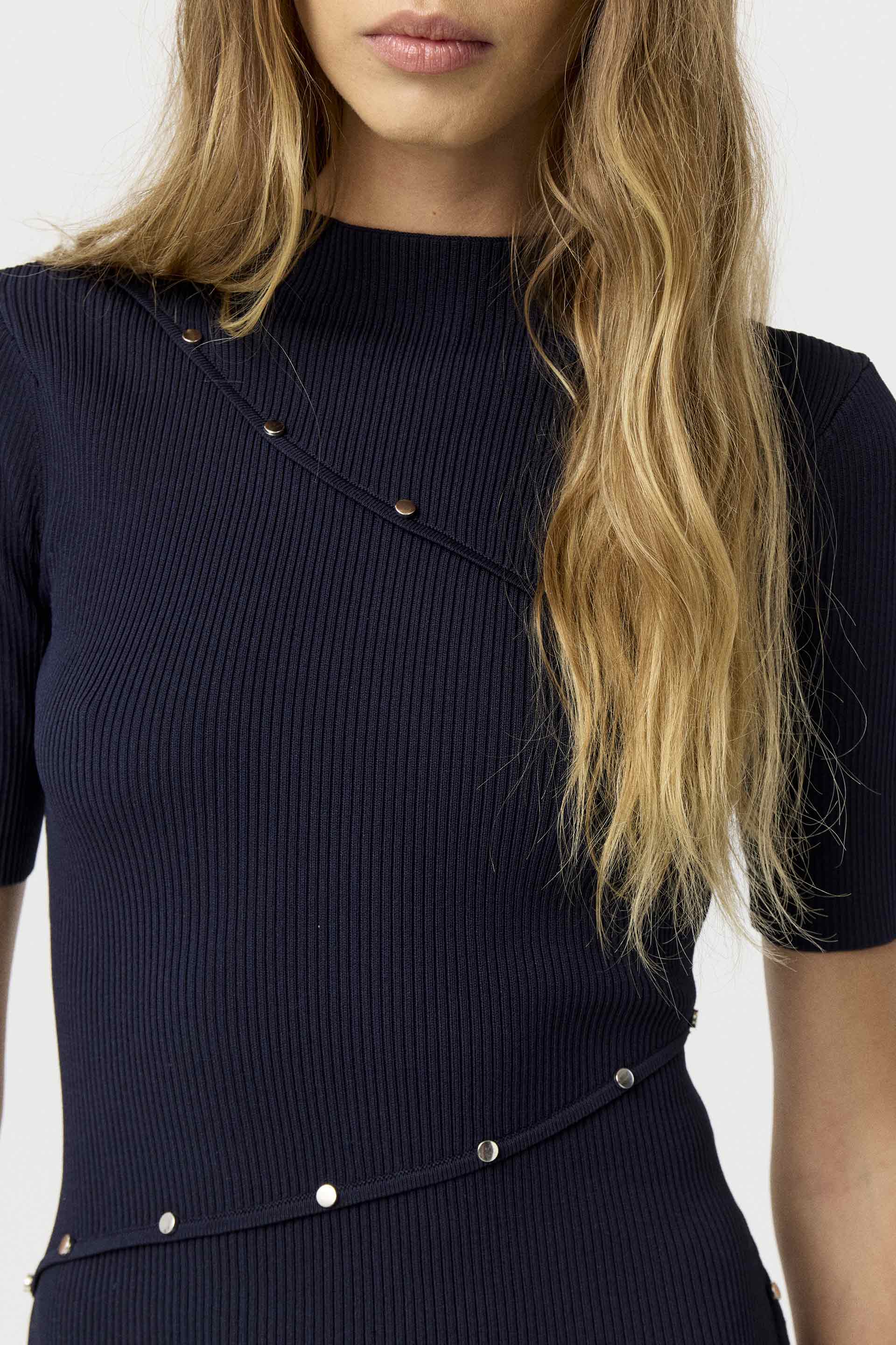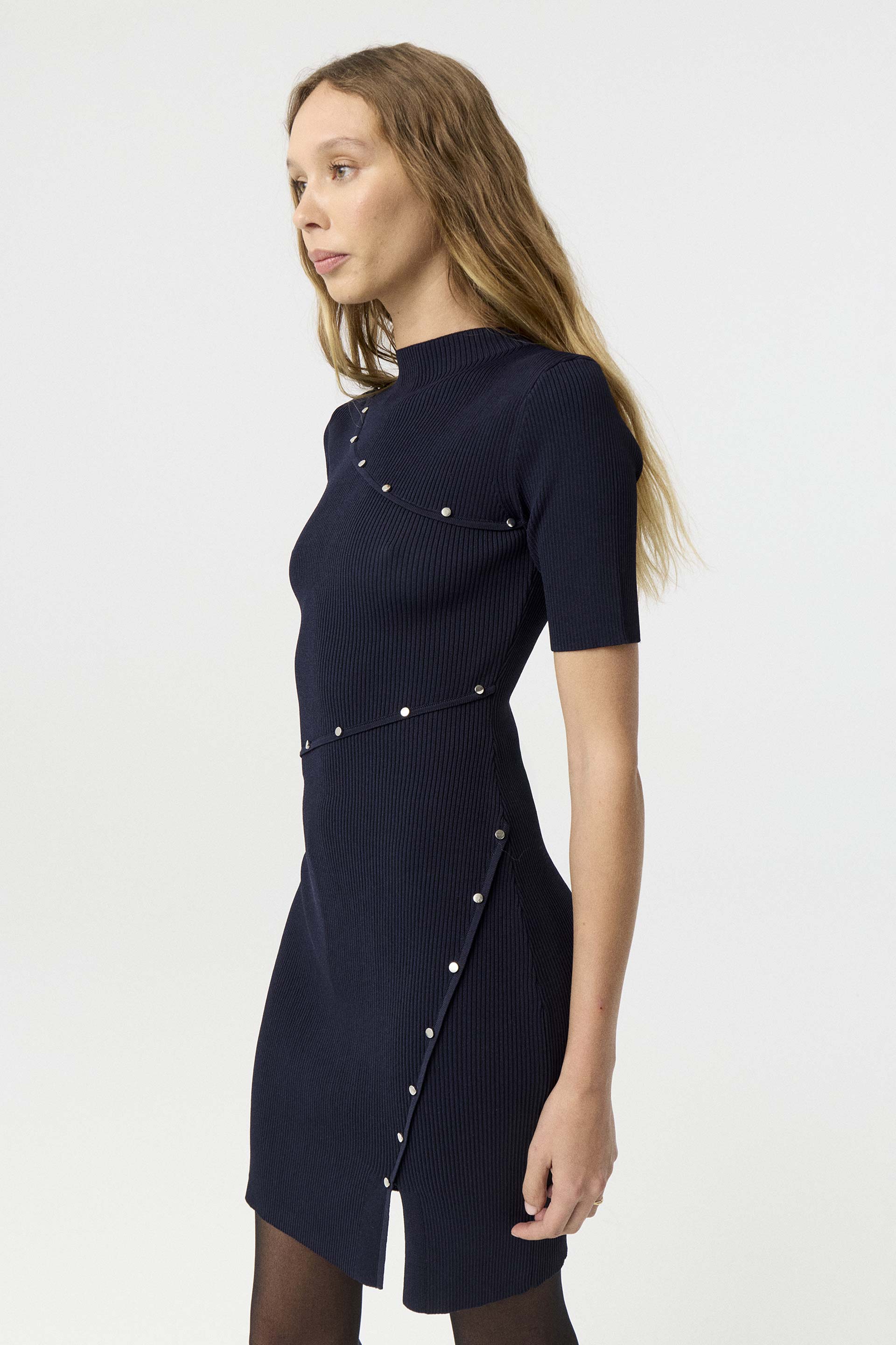 Vestido de punto acanalado de calce anatómico, con cuello estilo Perkins, mangas cortas y recortes asimétricos adornados con tachitas metálicas. Una opción versátil, atemporal y siempre a la moda.