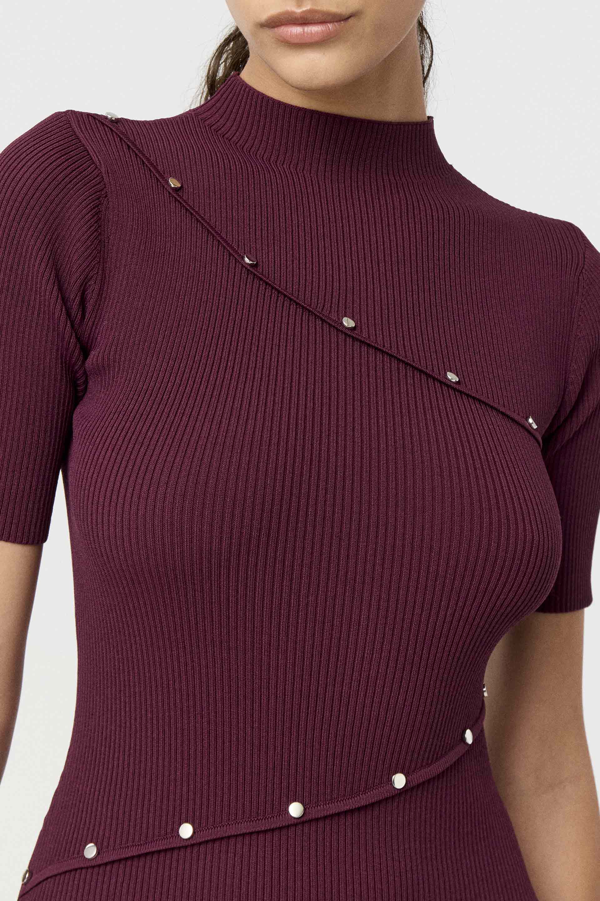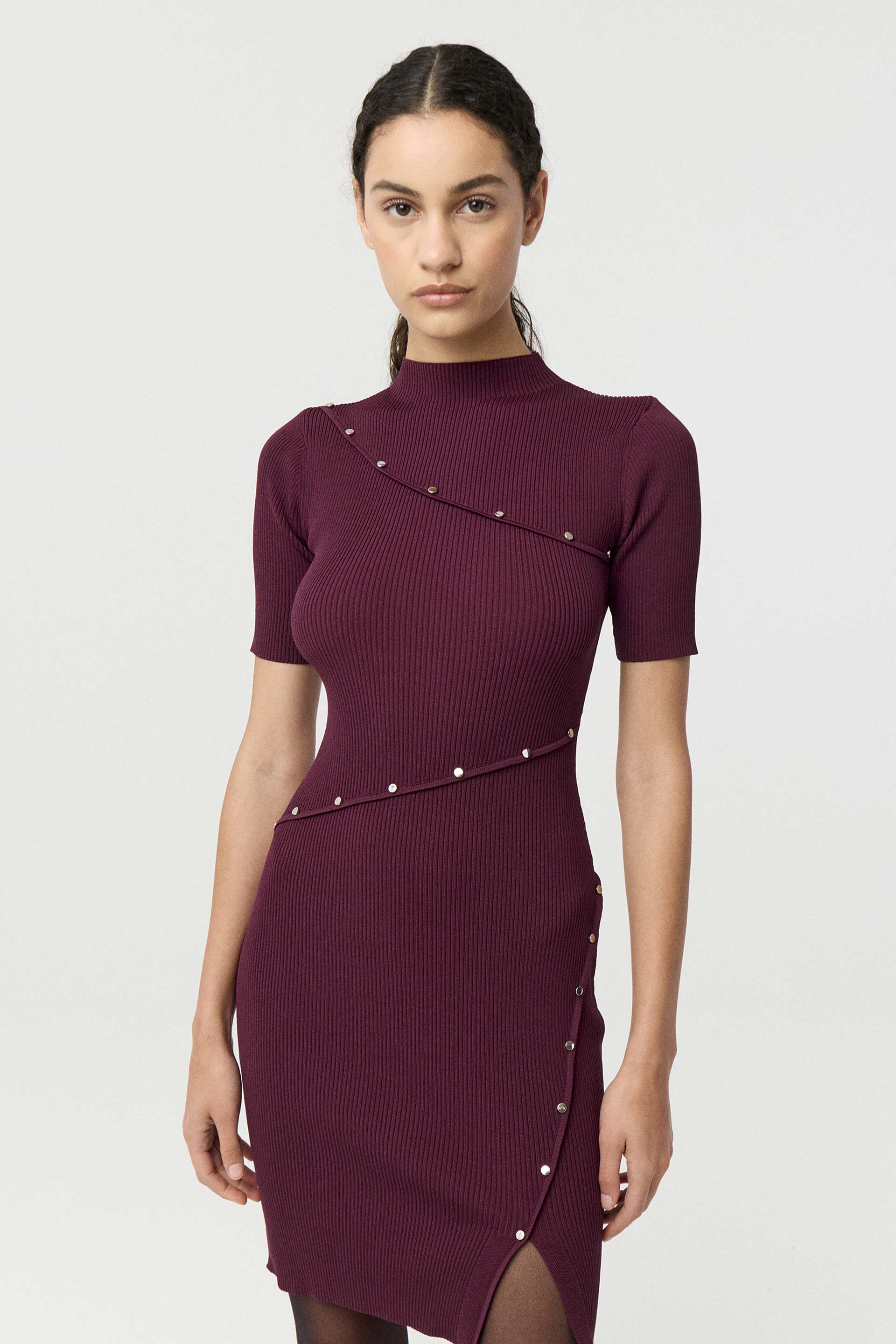 Vestido de punto acanalado de calce anatómico, con cuello estilo Perkins, mangas cortas y recortes asimétricos adornados con tachitas metálicas. Una opción versátil, atemporal y siempre a la moda.