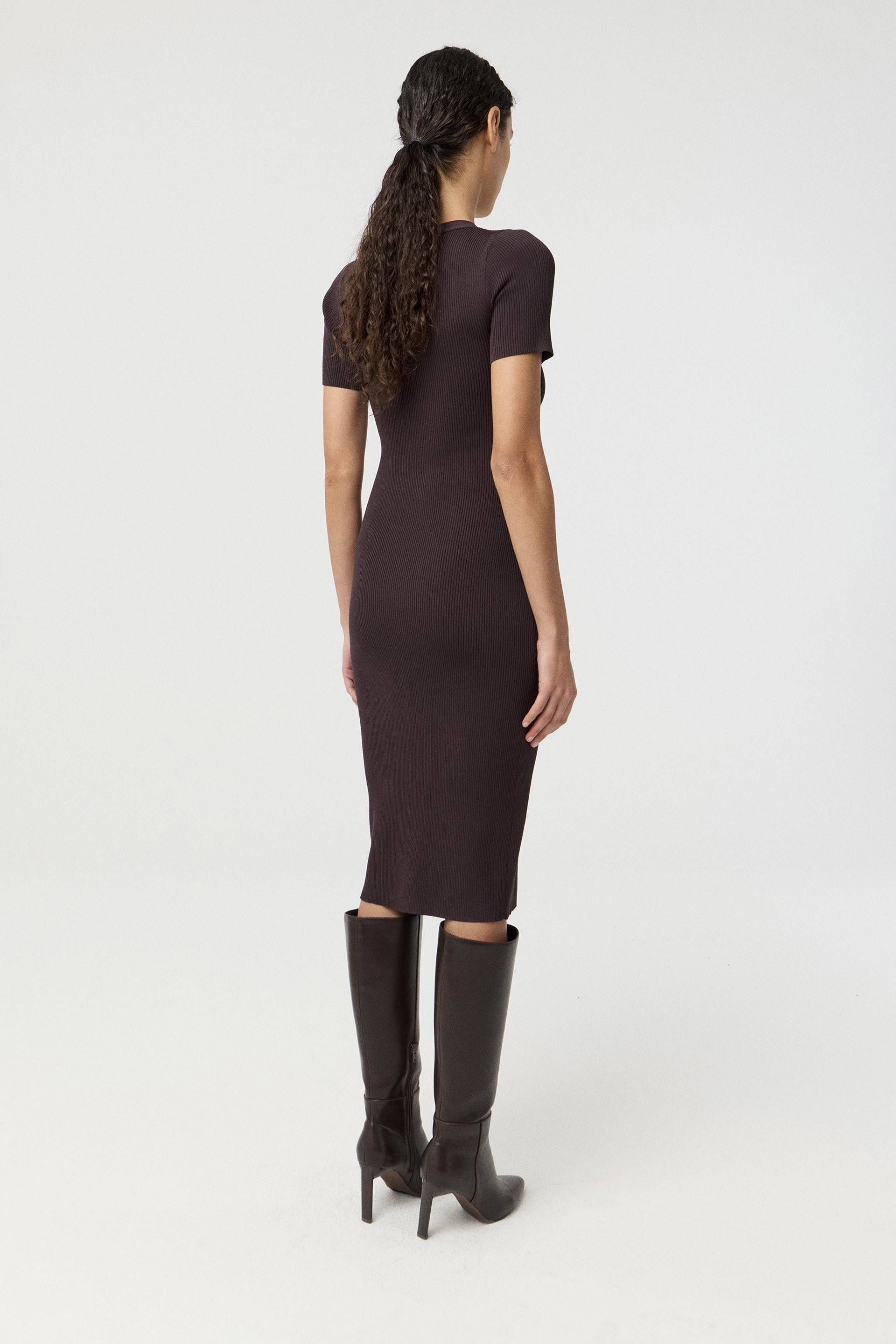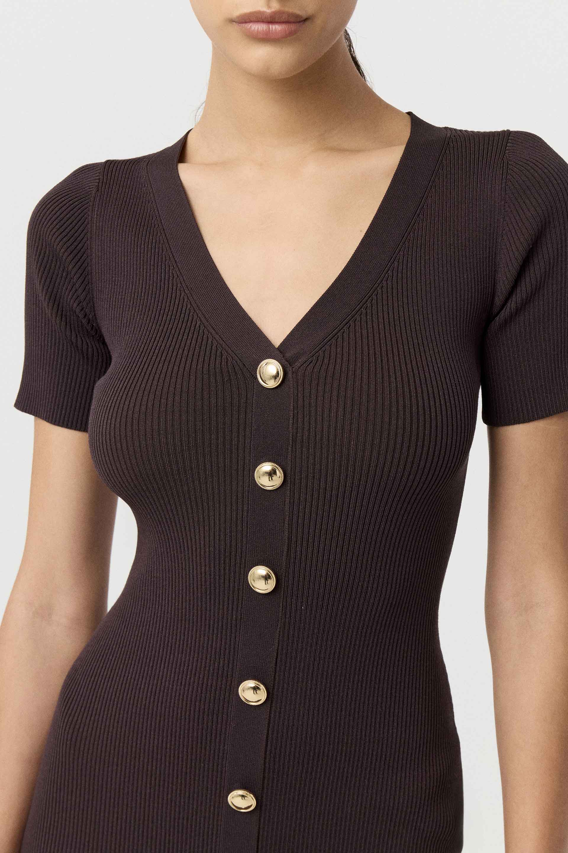 Vestido de punto acanalado de calce anatómico, con largo midi y mangas cortas. Presenta escote en V con cartera abotonada y botones metálicos, que aportan un detalle sofisticado y moderno. Su estilo atemporal lo convierte en una opción versátil para múltiples ocasiones.