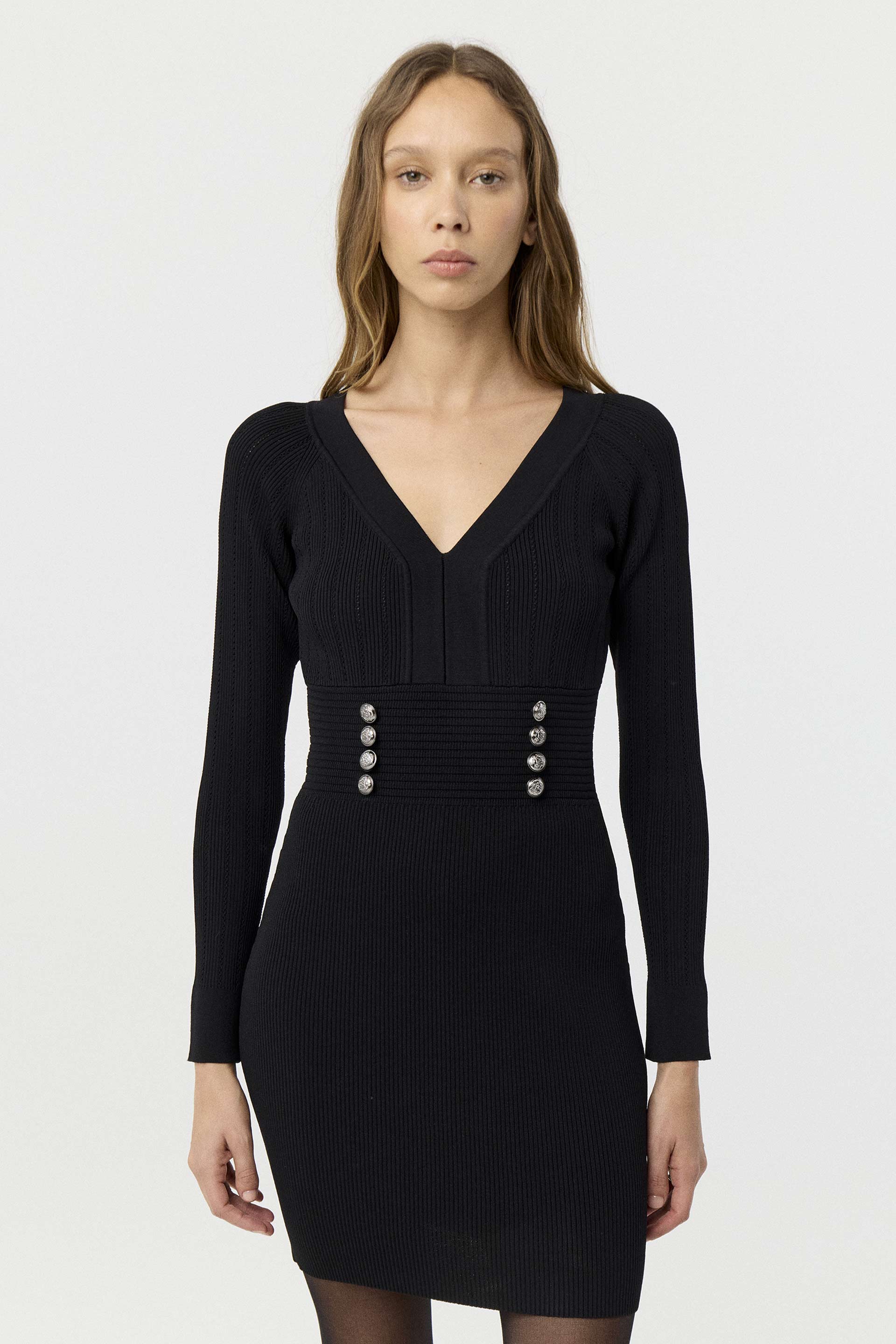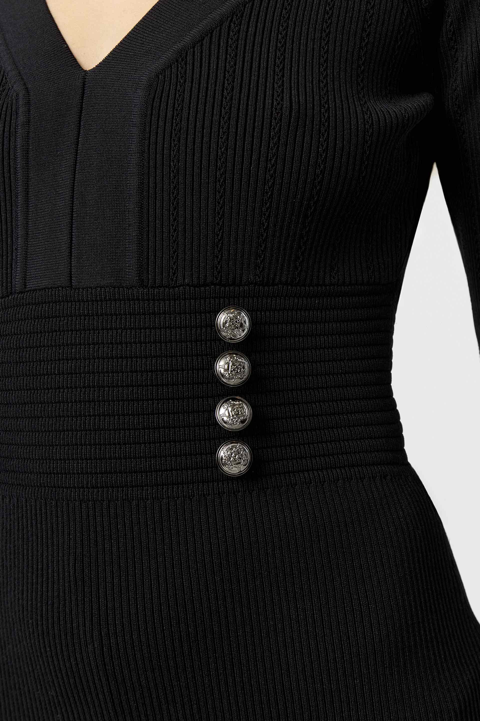 Vestido tejido punto acanalado de calce anatómico. Largo por arriba de las rodillas, mangas largas y escote en V. Posee recorte de cintura con botones decorativos en delantero. Un toque clásico y elegante para verte bien en cualquier ocasión.