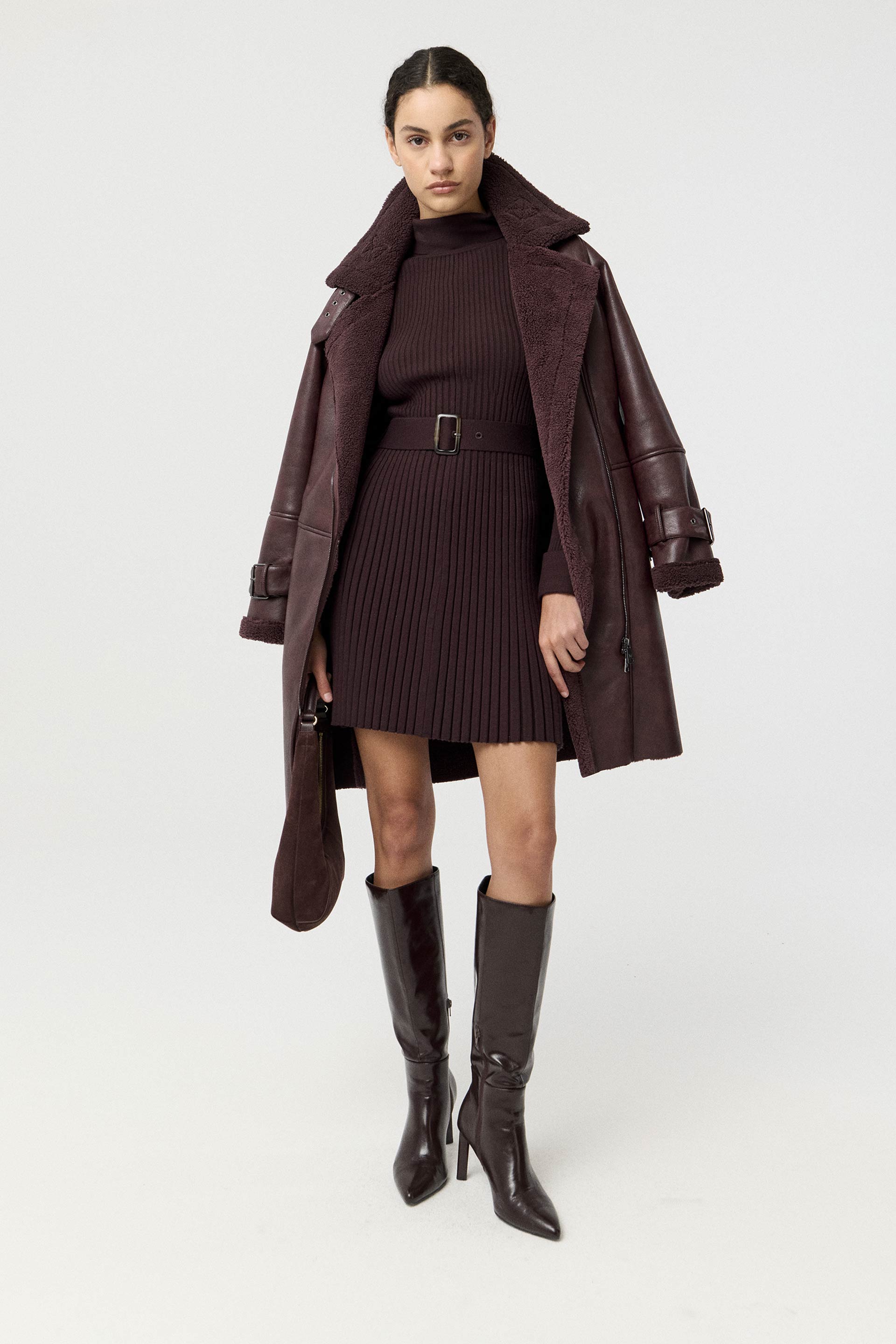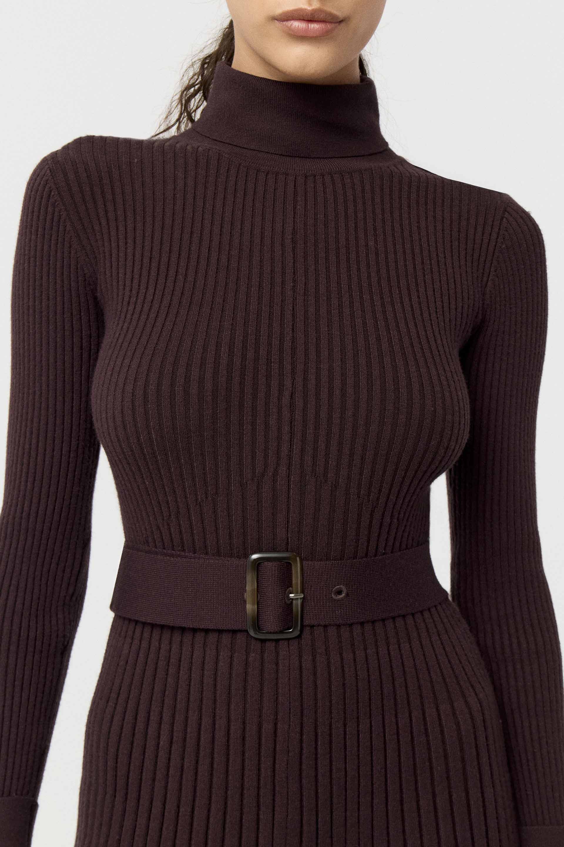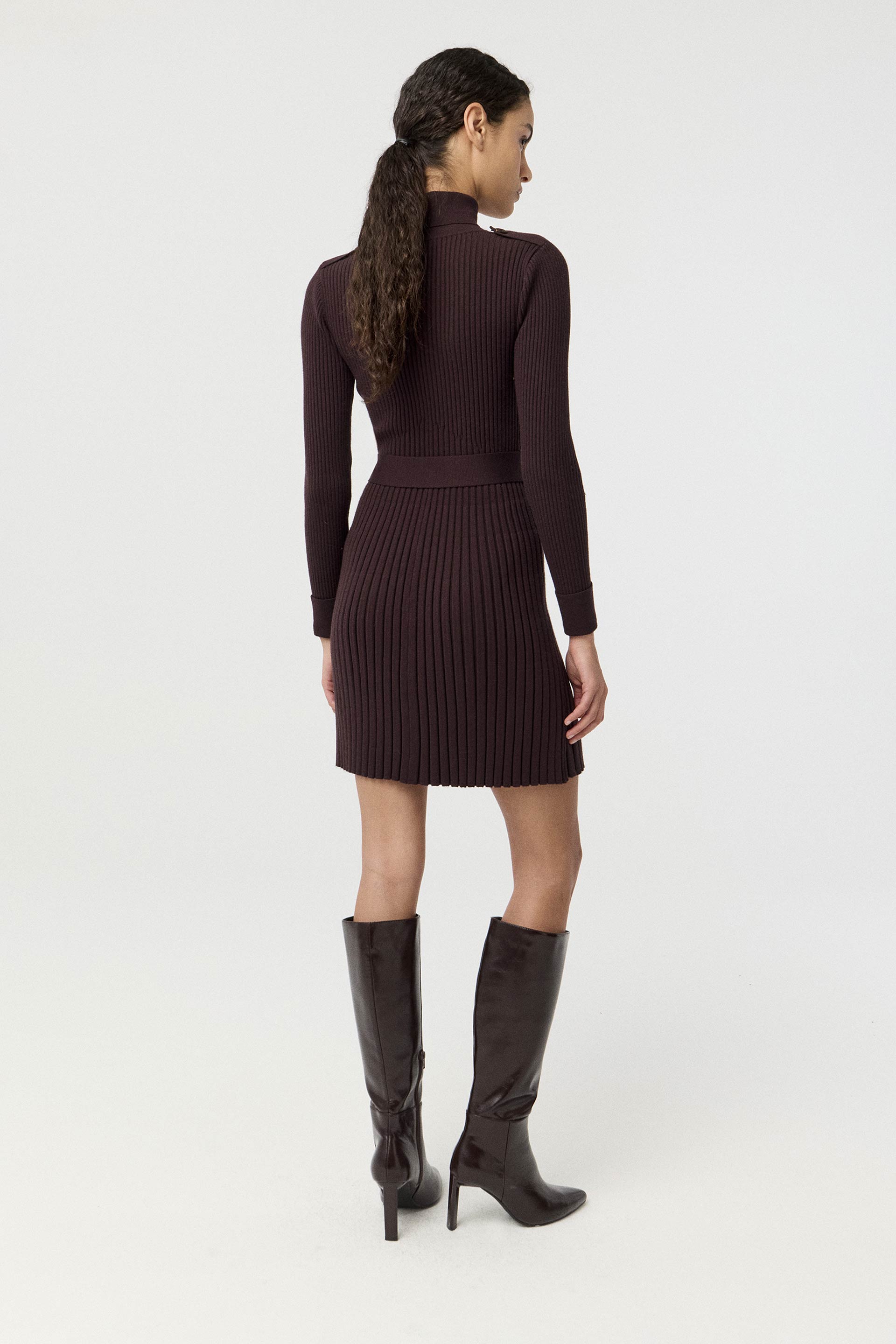 Vestido tejido en punto acanalado de calce anatómico, con falda evasé, largo por arriba de las rodillas y mangas largas. Cuello alto rebatible, charreteras en hombros y cinturón tejido con hebilla de resina en la cintura. Sofisticado y elegante, un ítem clave de tu fondo de armario.