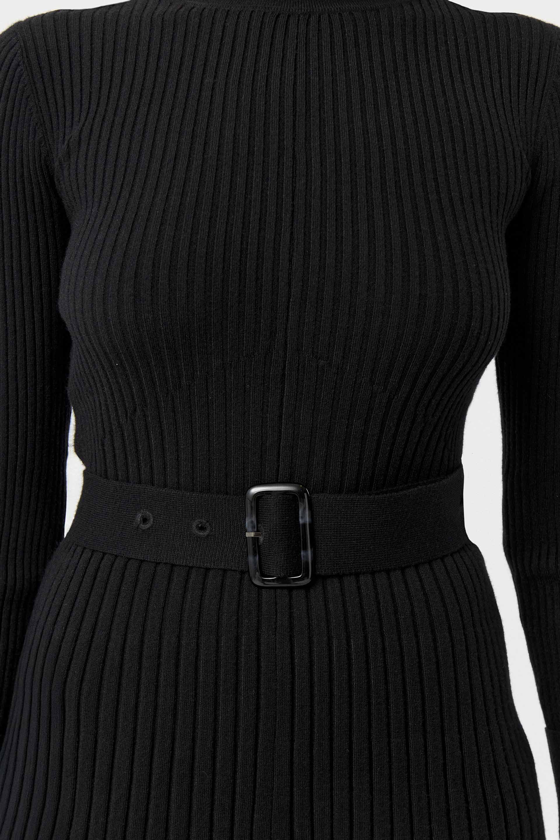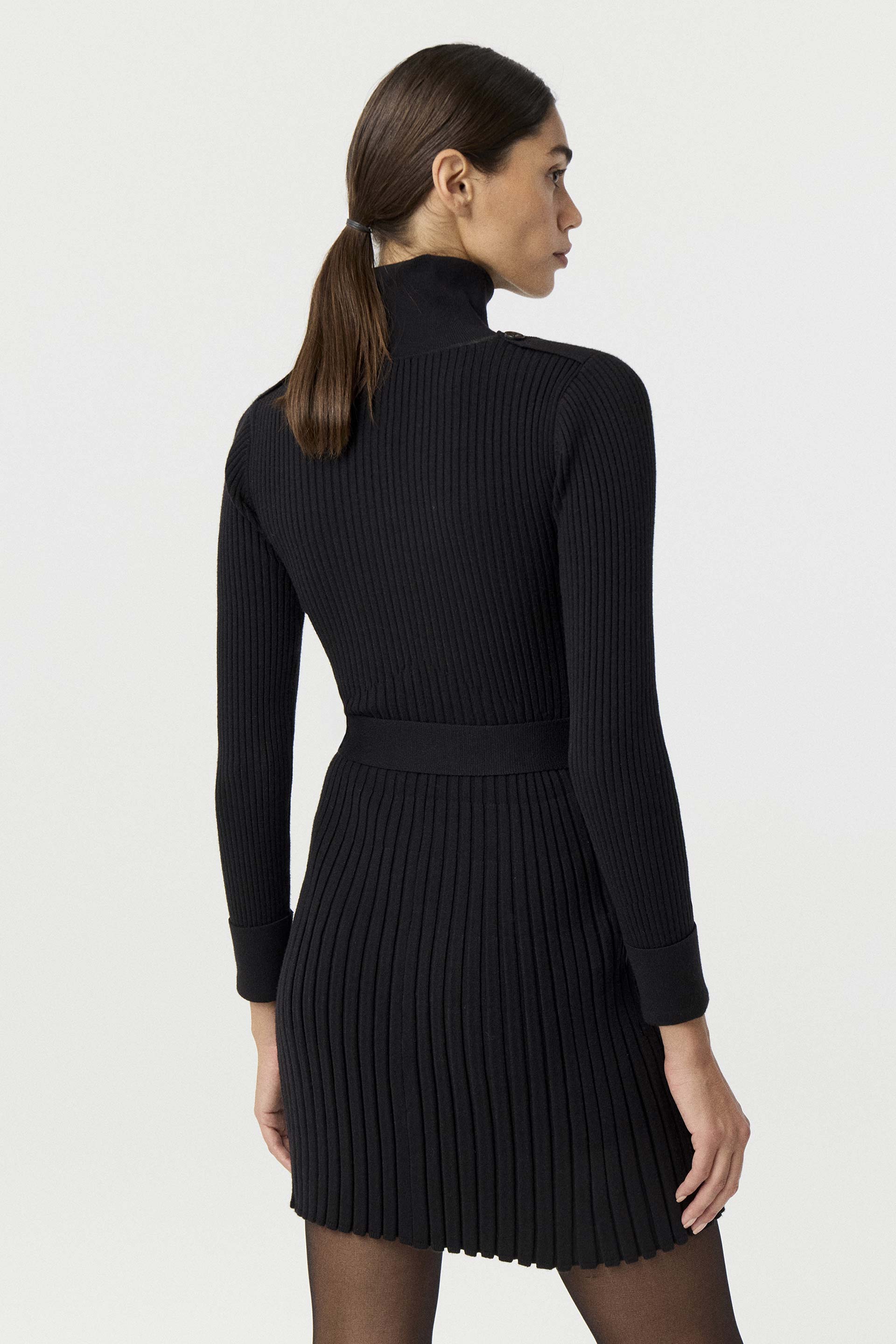 Vestido tejido en punto acanalado de calce anatómico, con falda evasé, largo por arriba de las rodillas y mangas largas. Cuello alto rebatible, charreteras en hombros y cinturón tejido con hebilla de resina en la cintura. Sofisticado y elegante, un ítem clave de tu fondo de armario.
