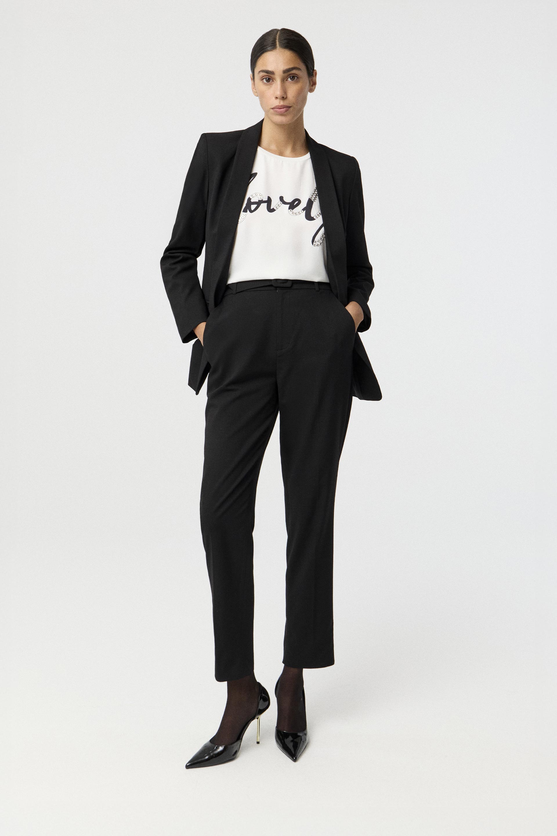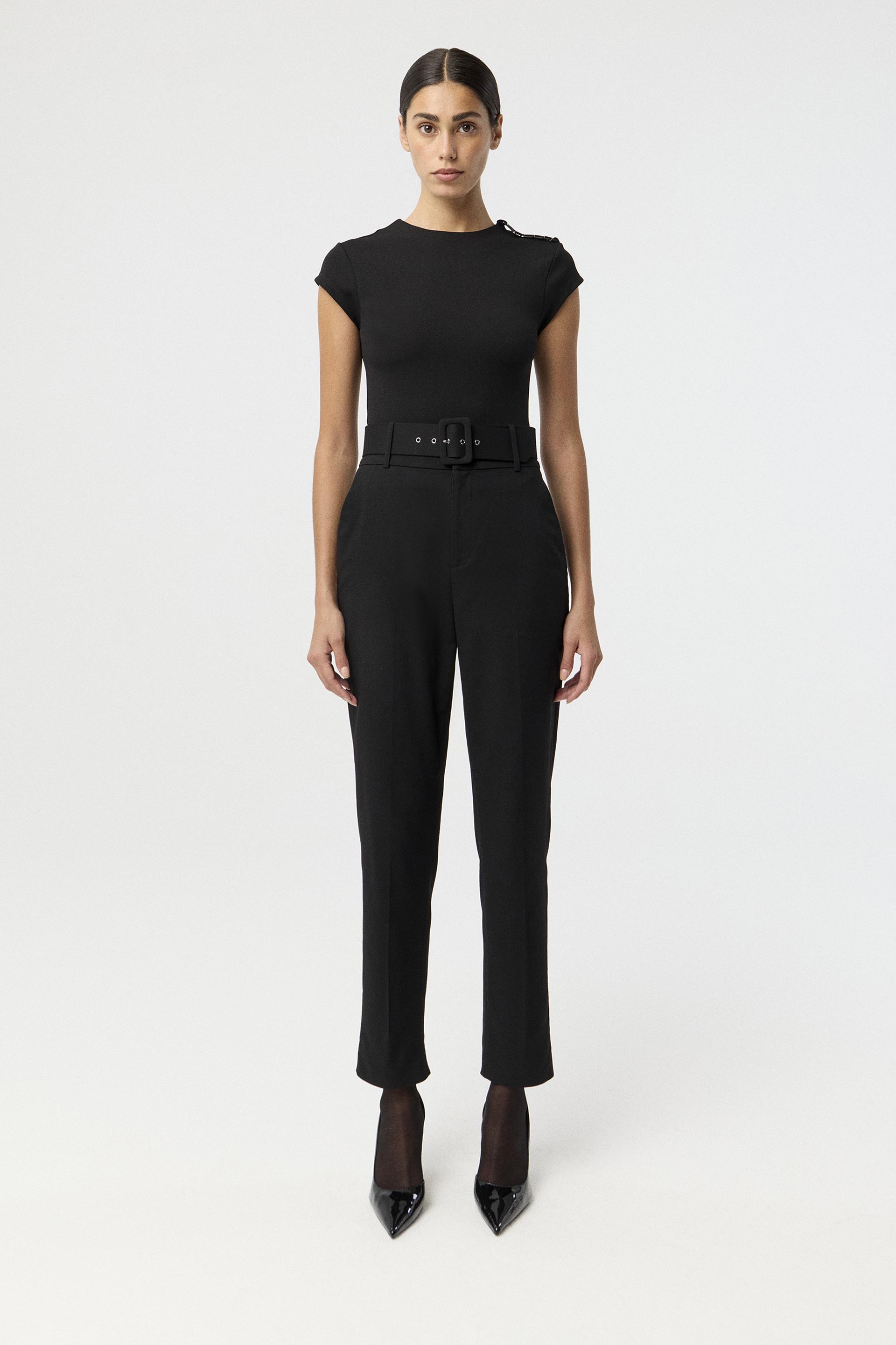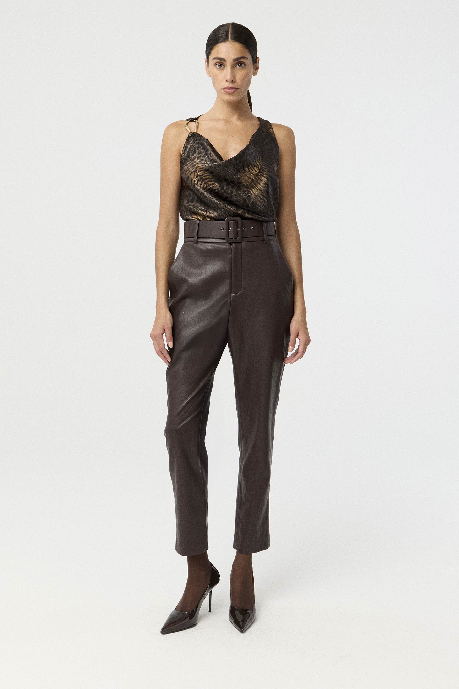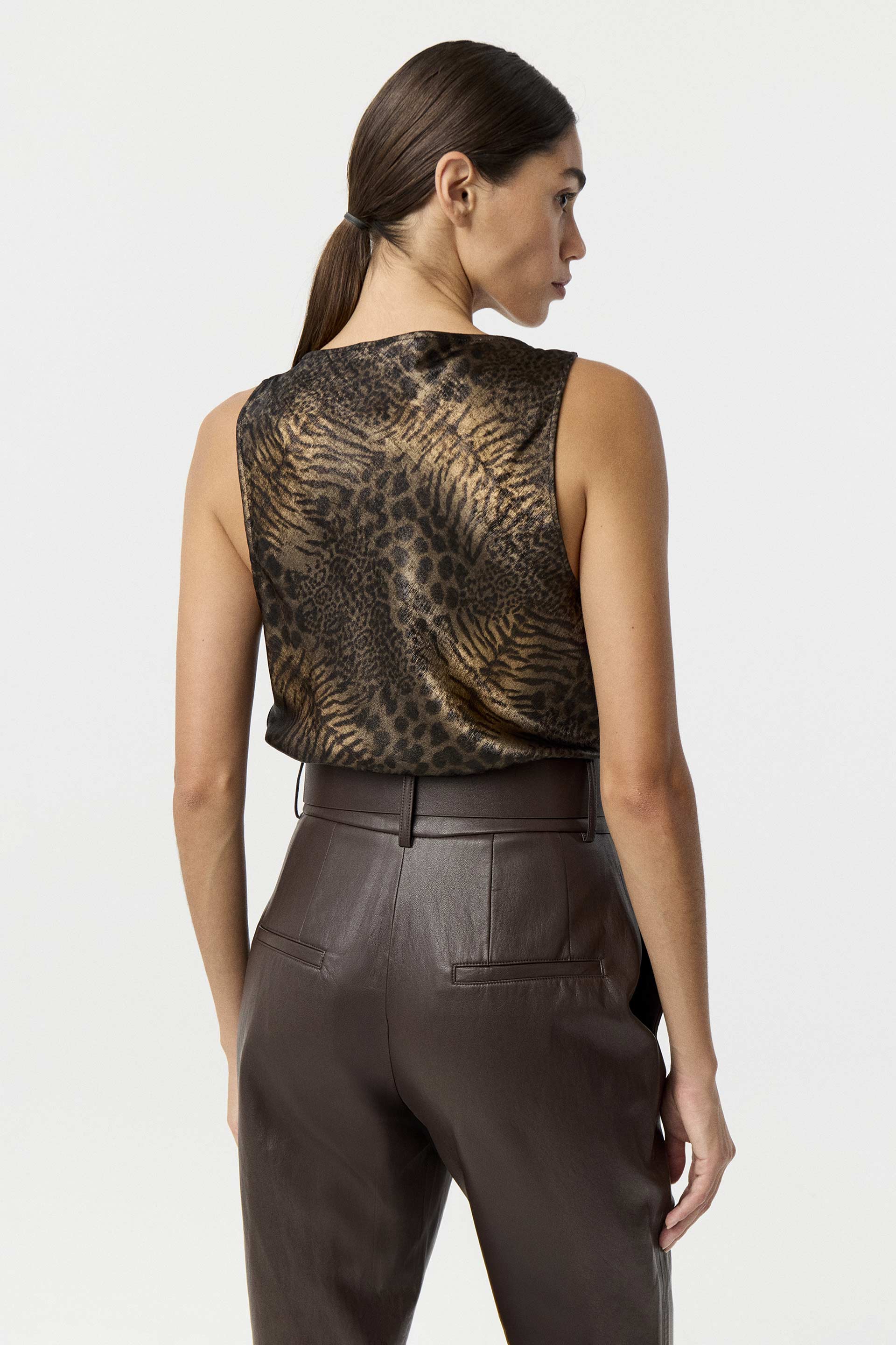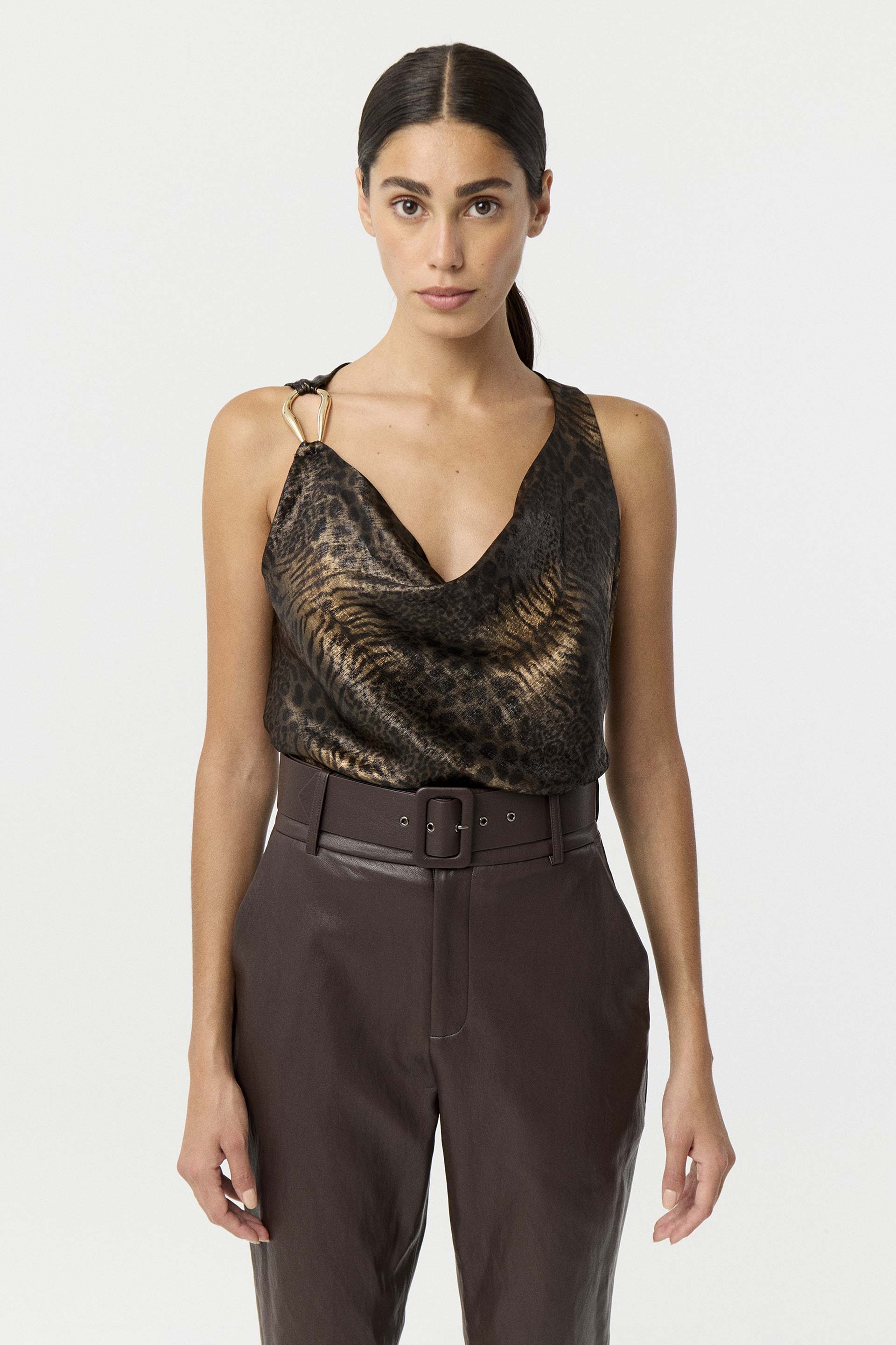 Top de lamé estampado de calce relajado. Diseño asimétrico con buche en escote y bretel con hebilla metálica en lado derecho. Armá un look de noche audaz y original con este ítem.