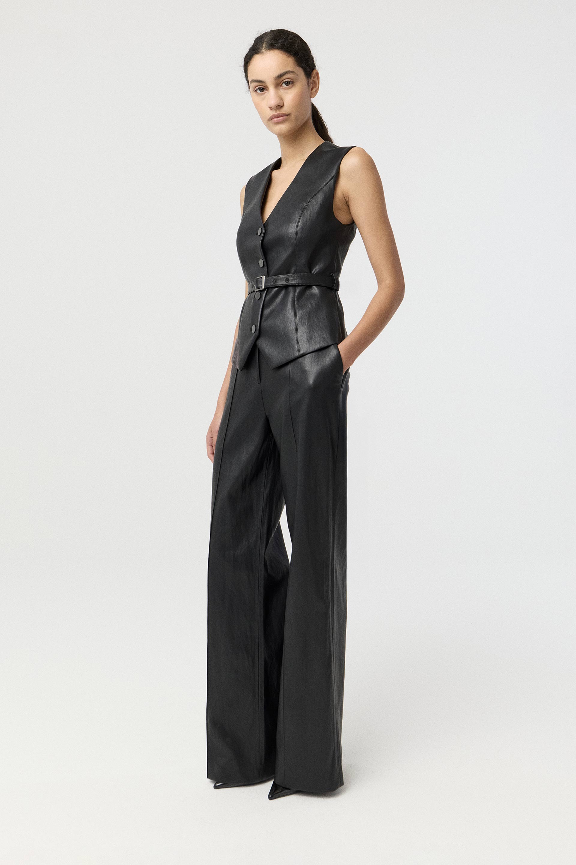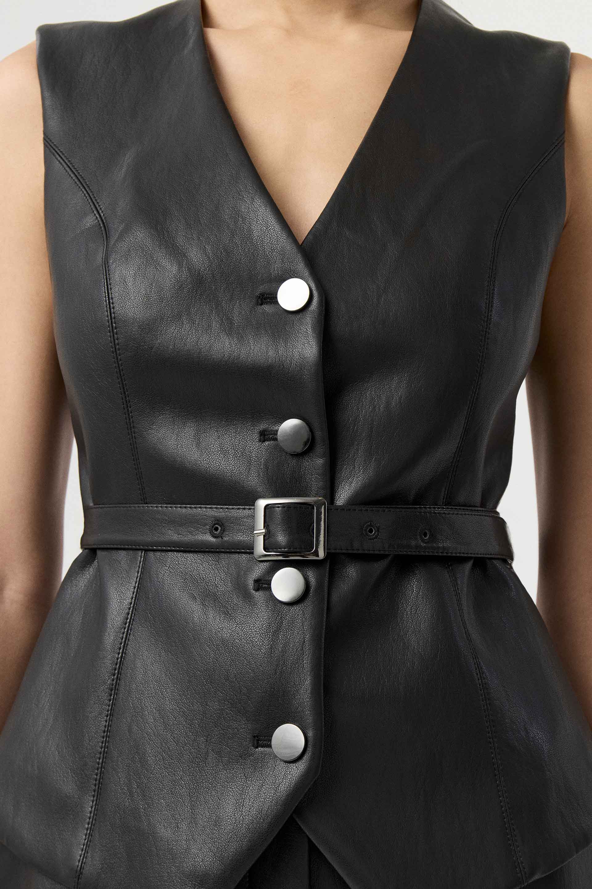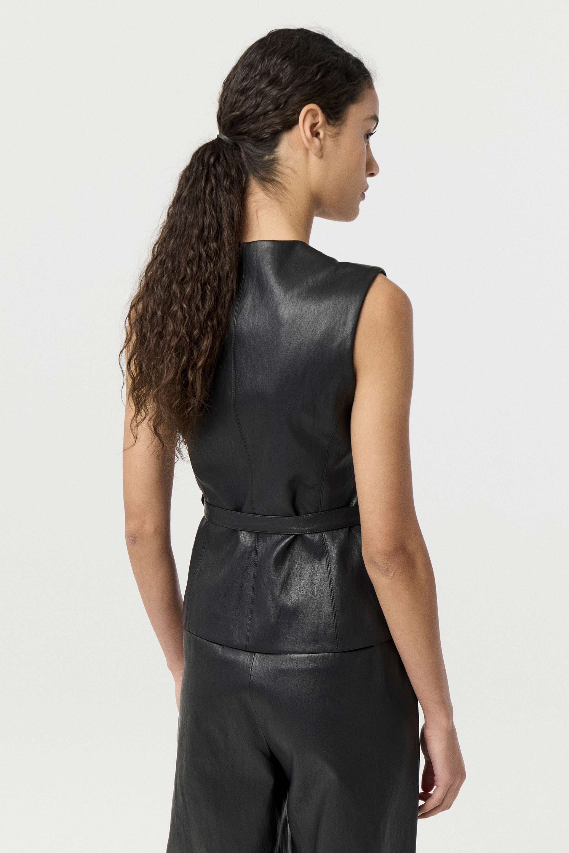 Chaleco de efecto cuero encerado. Posee escote en V, acceso con botones y cinturón con hebilla, que otorga mayor ajuste en la cintura. Combinalo con el pantalón Moser y armá un total look canchero y moderno, ideal para un evento o una salida nocturna.