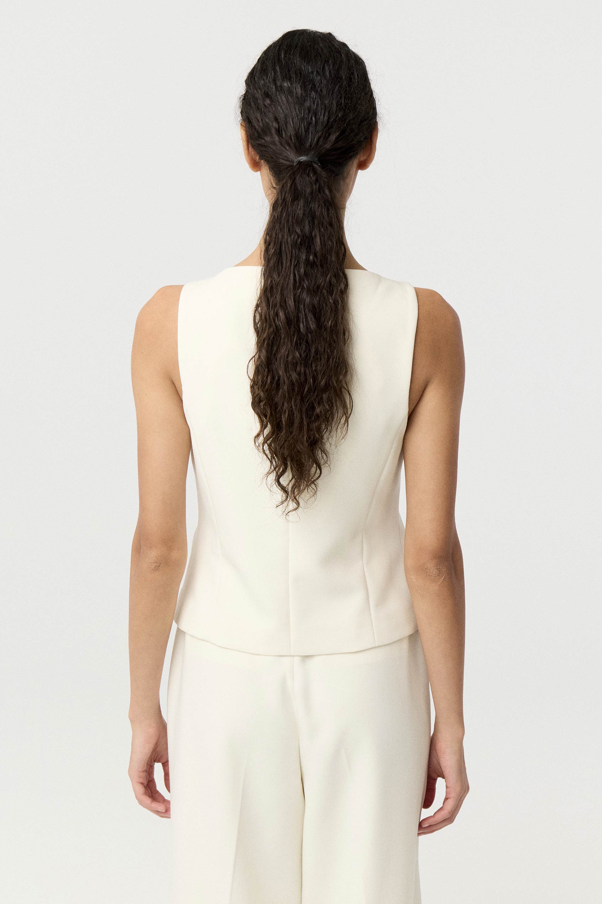 Chaleco de sastrería en rayón, de calce entallado. Posee escote bote y acceso con botones metálicos. Combinalo con el pantalón y el blazer Lanka y armá un total look ideal para lucirte en un evento o en la oficina.