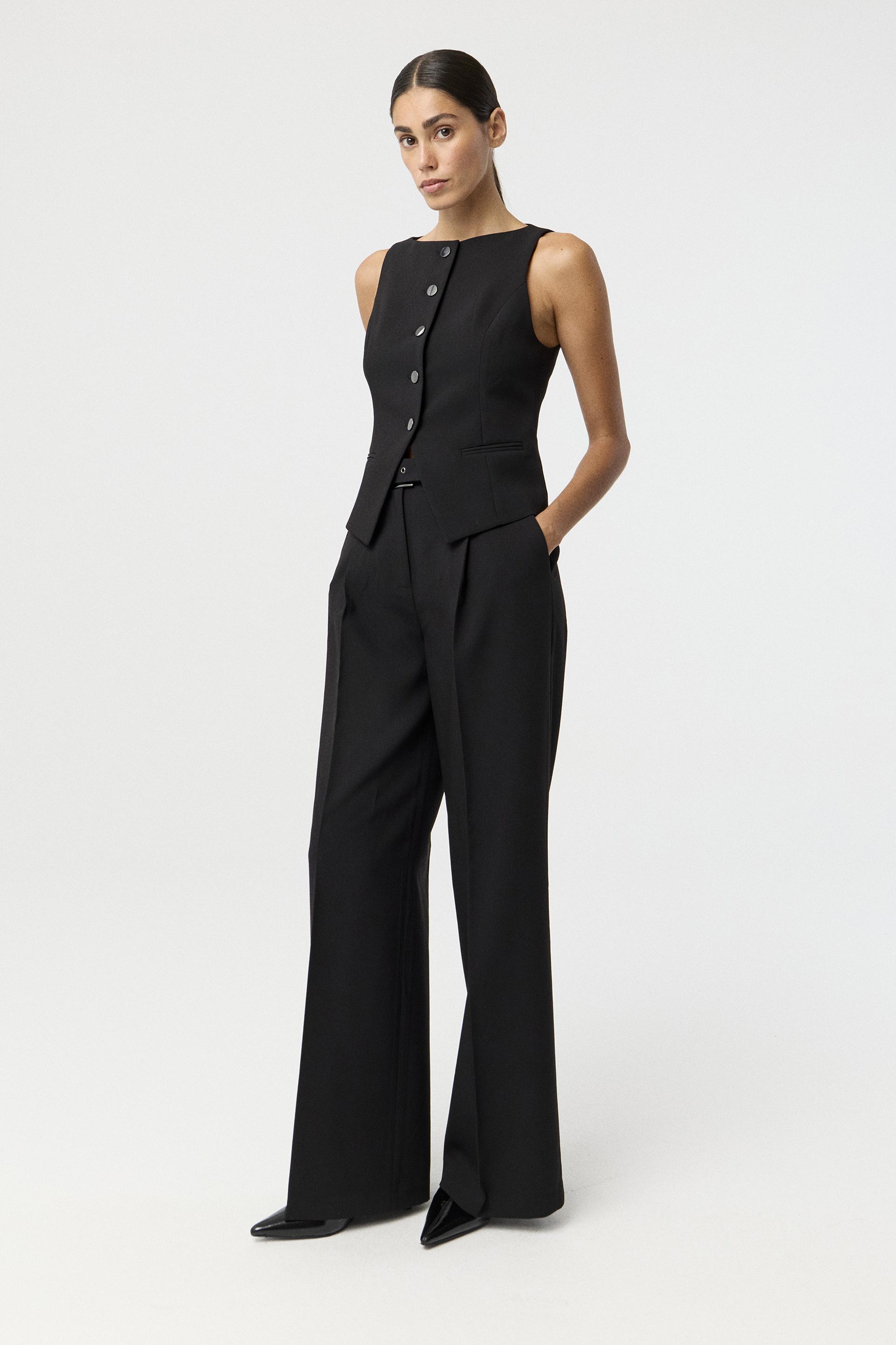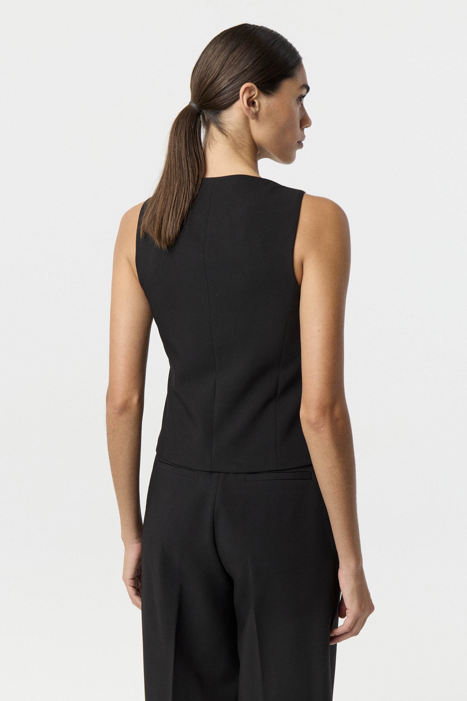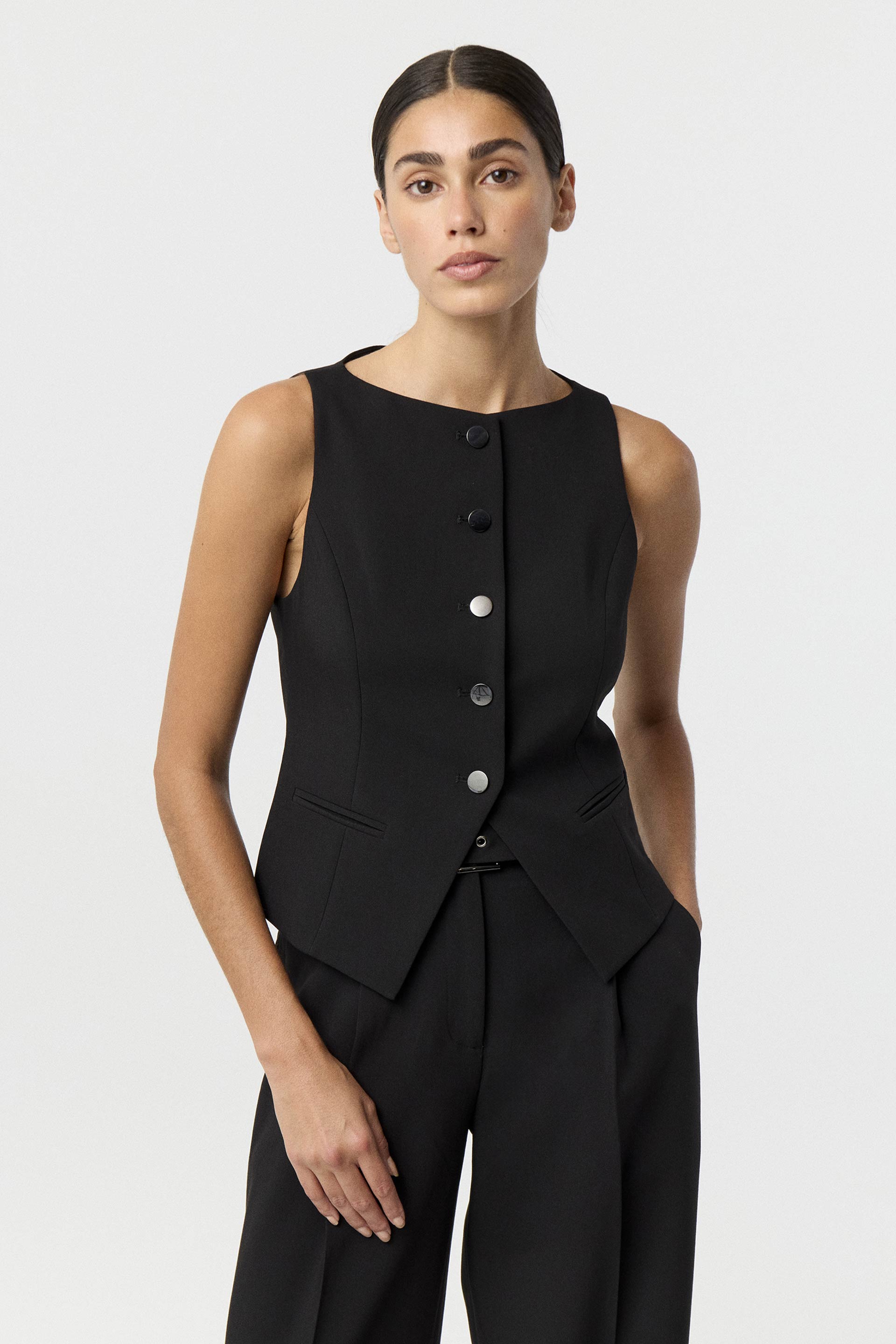 Chaleco de sastrería en rayón, de calce entallado. Posee escote bote y acceso con botones metálicos. Combinalo con el pantalón y el blazer Lanka y armá un total look ideal para lucirte en un evento o en la oficina.