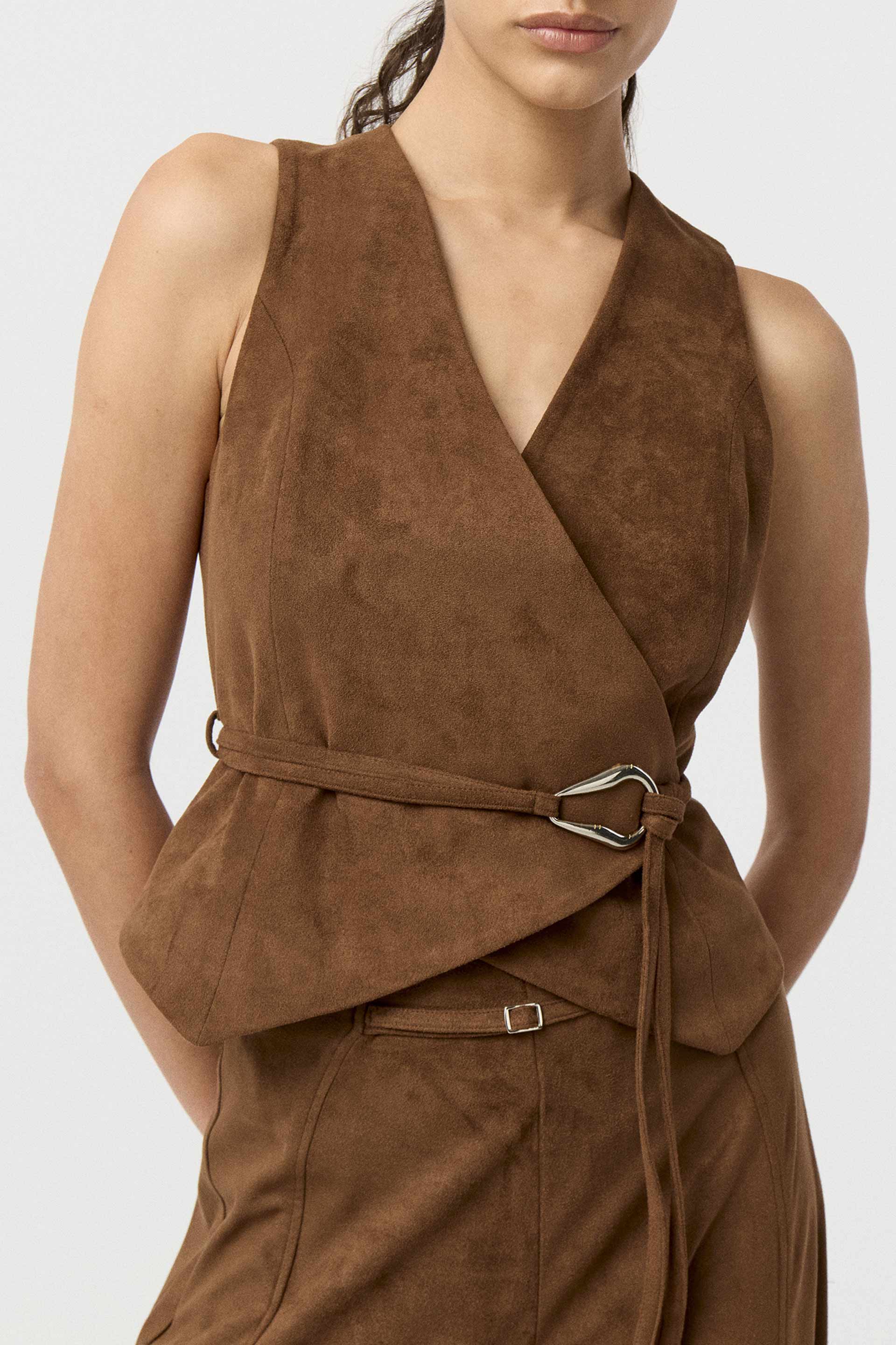 Chaleco largo de sastrería elastizada de calce entallado. Posee escote a la base y acceso en el delantero con ganchos de encastre metálicos. Su interior está forrado en satén elastizado, lo que otorga un extra confort. Combinalo con el pantalón Mauna y armá un look canchero y moderno, ideal para una salida.