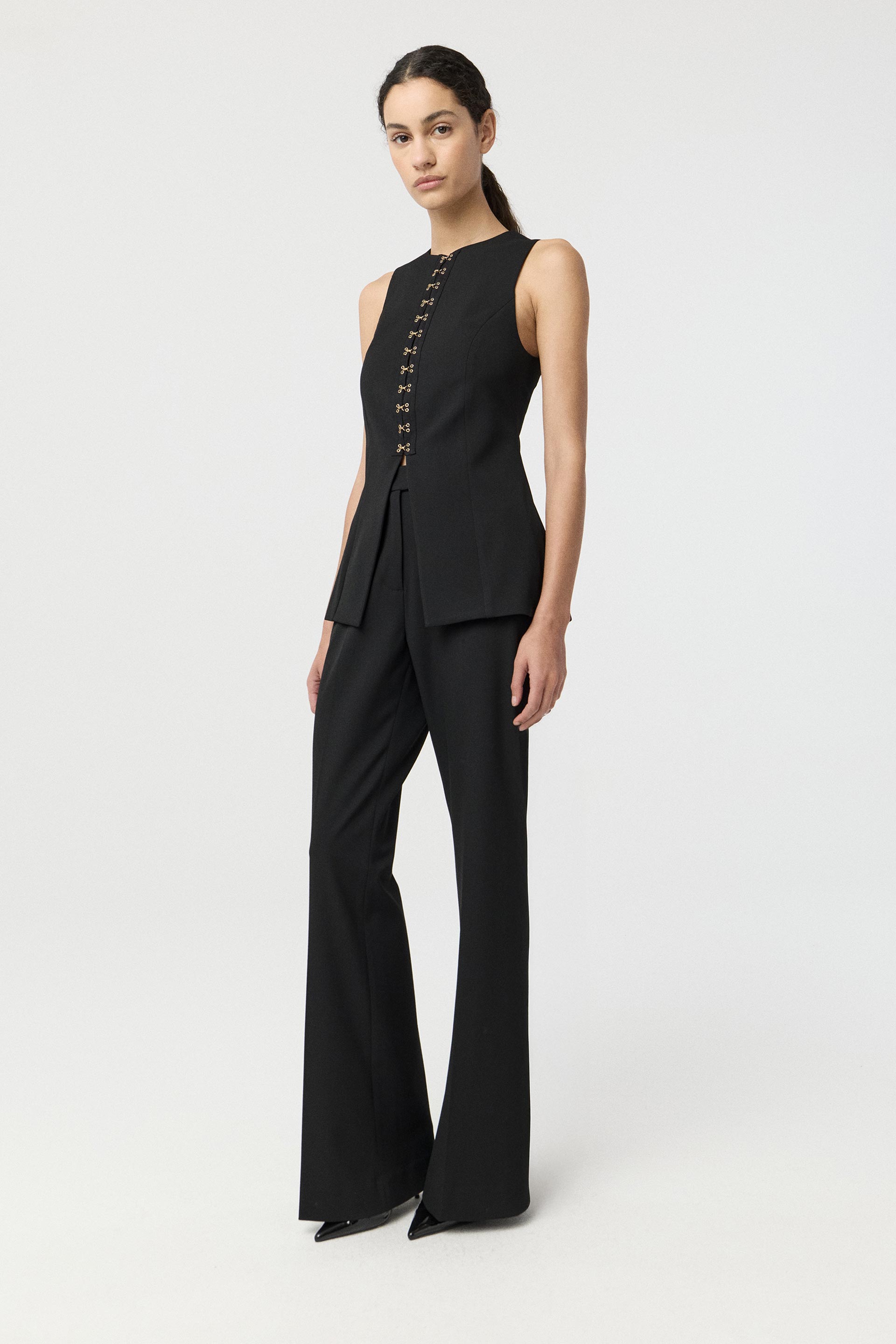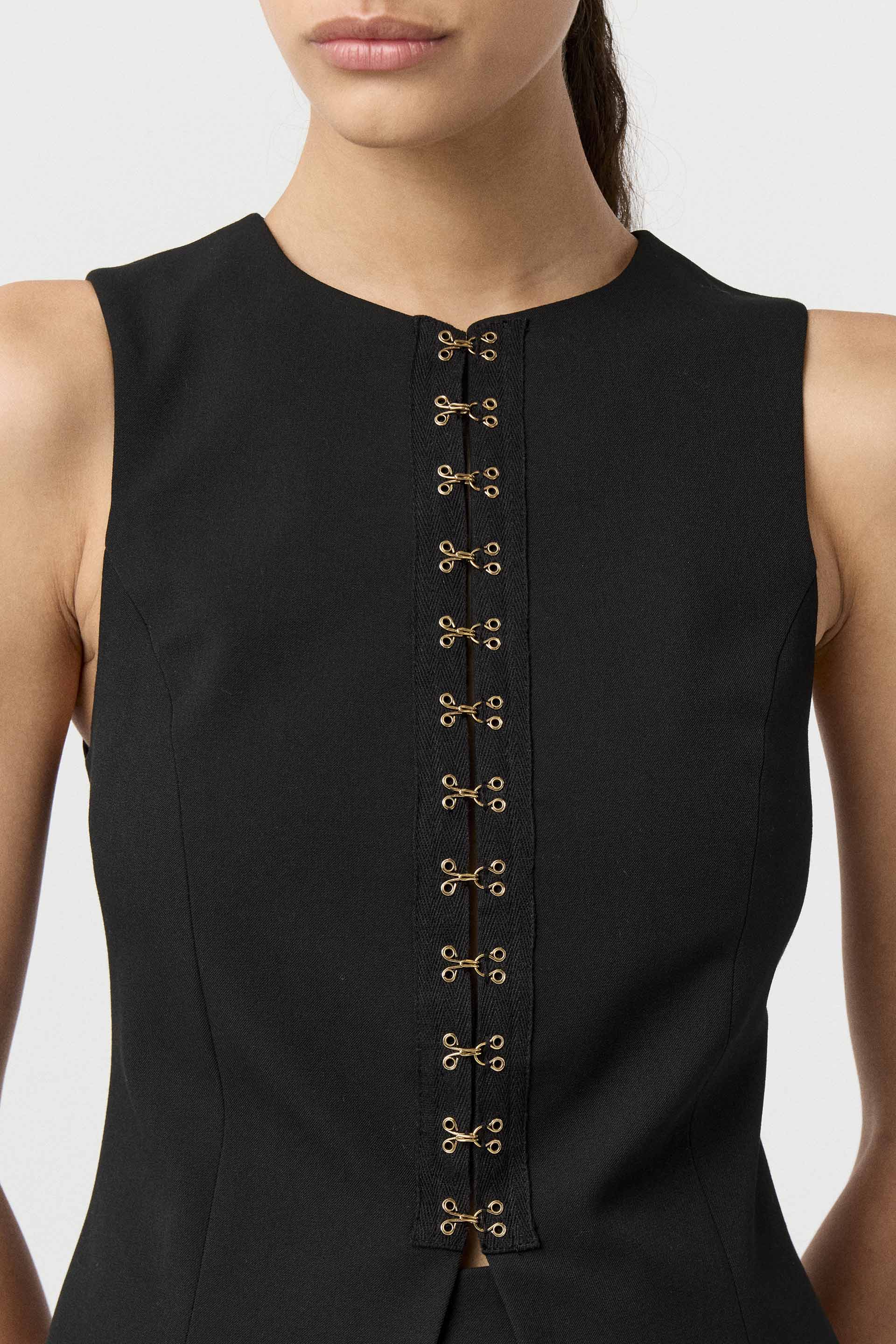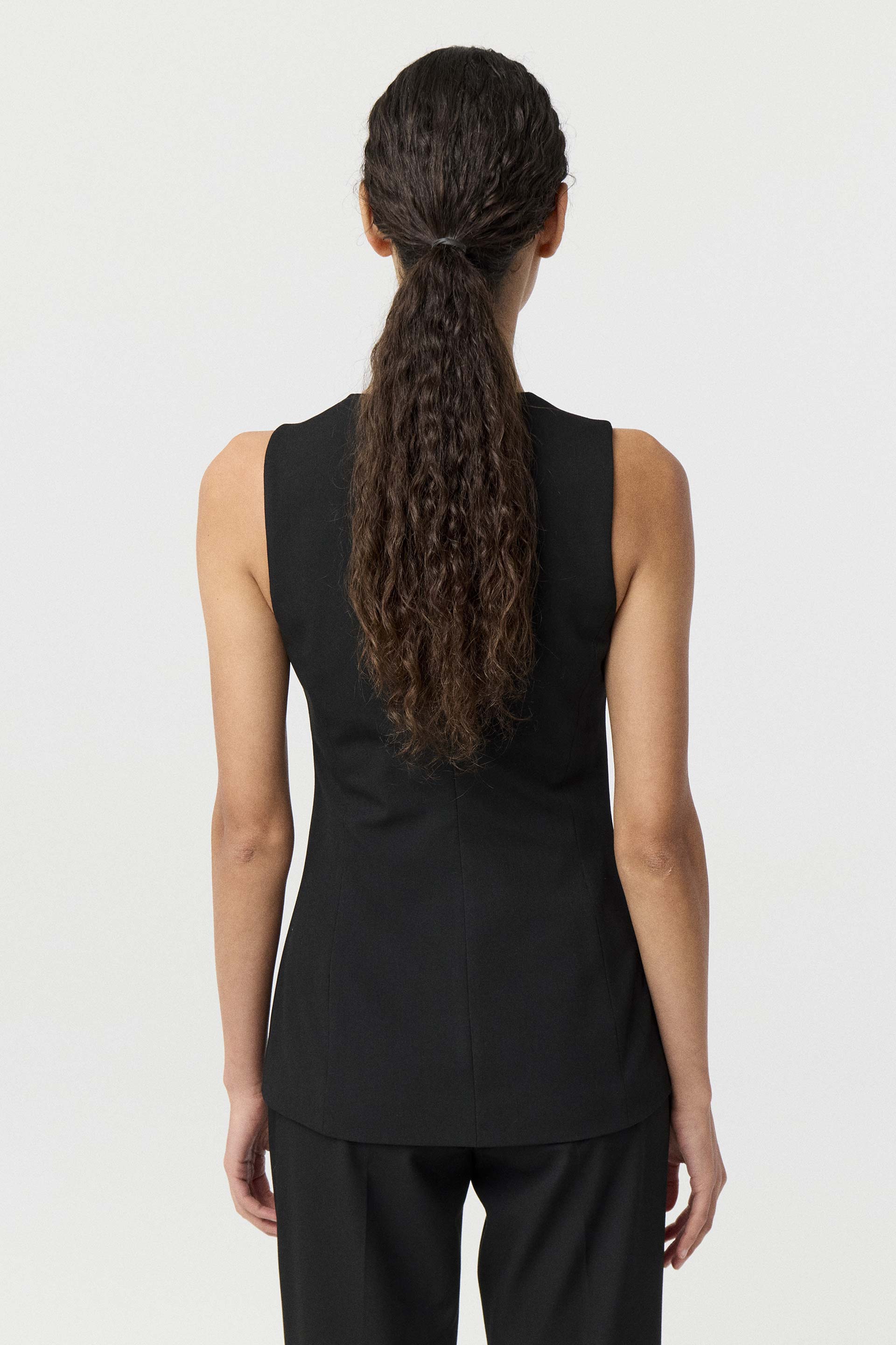 Chaleco largo de sastrería elastizada de calce entallado. Posee escote a la base y acceso en el delantero con ganchos de encastre metálicos. Su interior está forrado en satén elastizado, lo que otorga un extra confort. Combinalo con el pantalón Mauna y armá un look canchero y moderno, ideal para una salida.