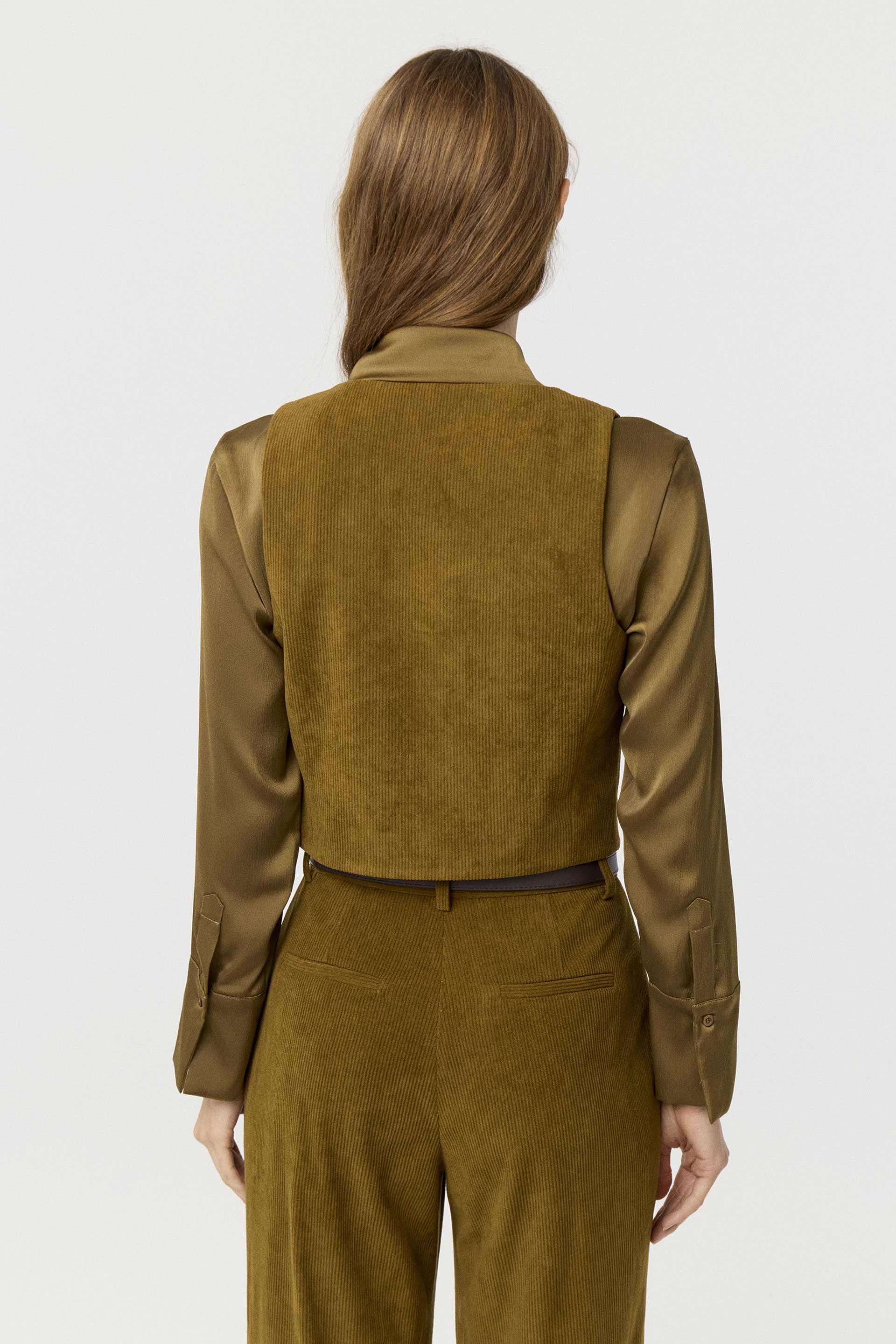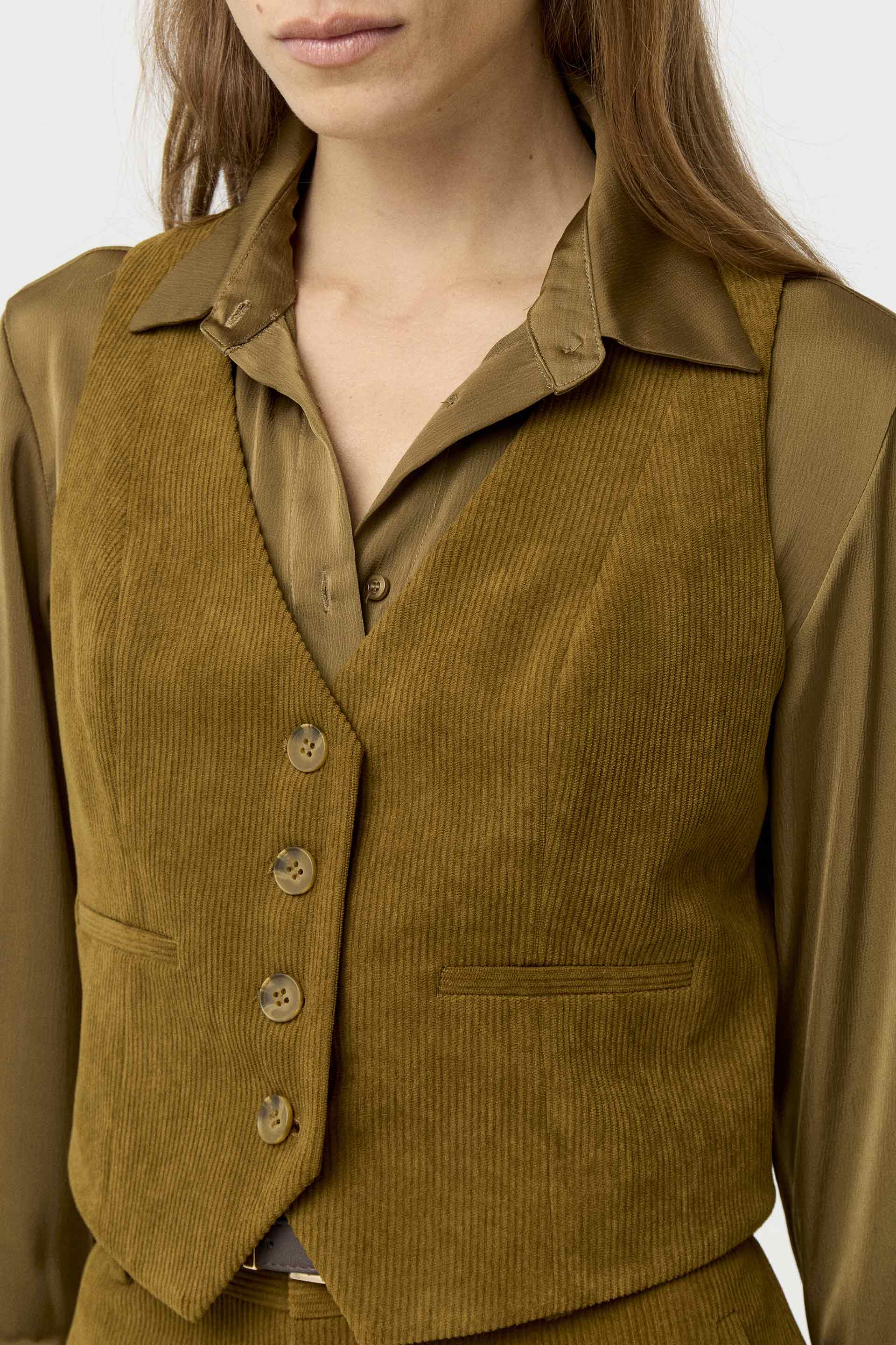 Chaleco corto de corderoy, de calce entallado. Posee escote en V y acceso con botones de pasta a tono. Su género y su color lo convierten en un ítem de tendencia que no puede faltarte este invierno en tu guardarropa. Combinalo con el pantalón Aneto y armá un total look canchero, ideal tanto para la oficina como para un evento de día.