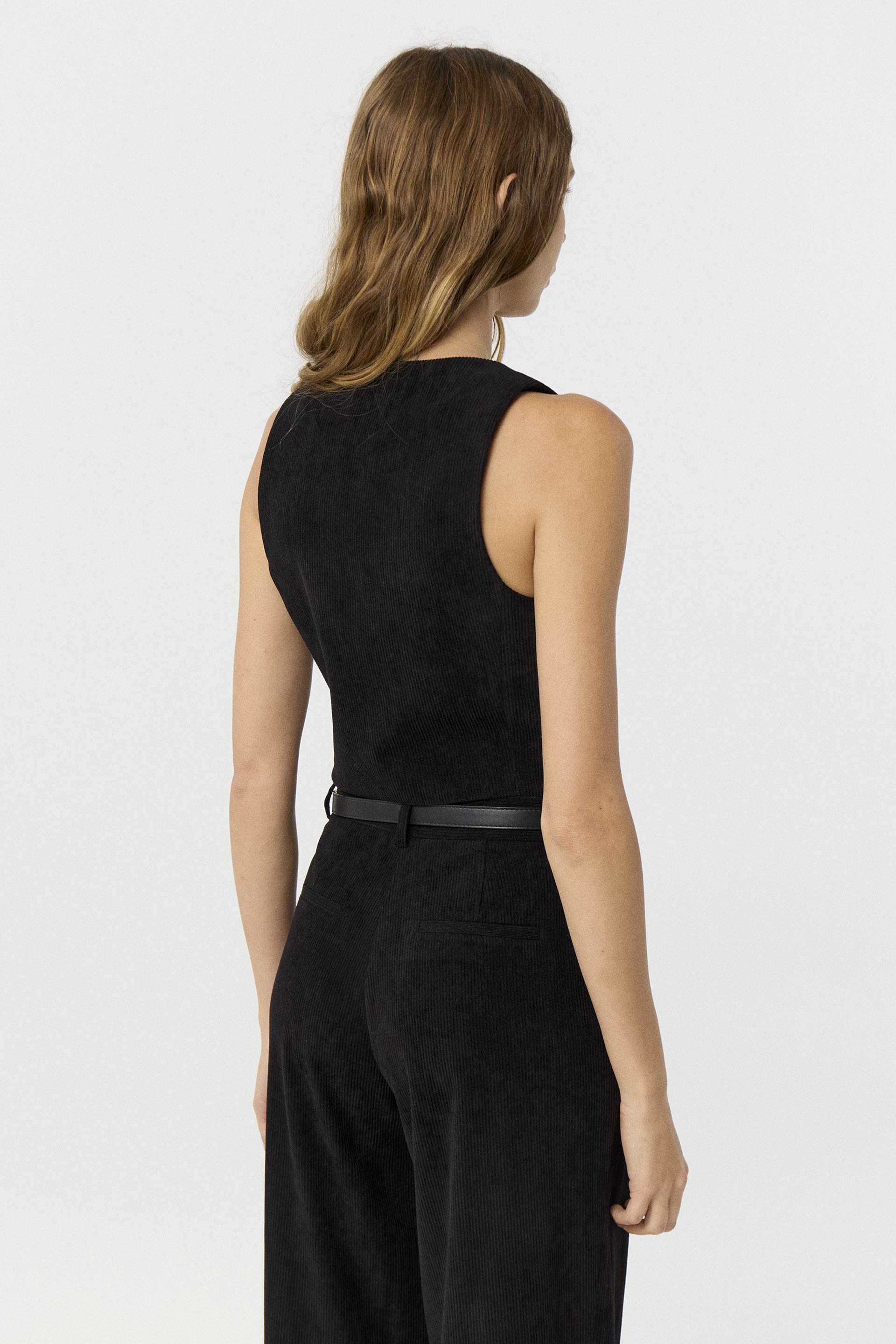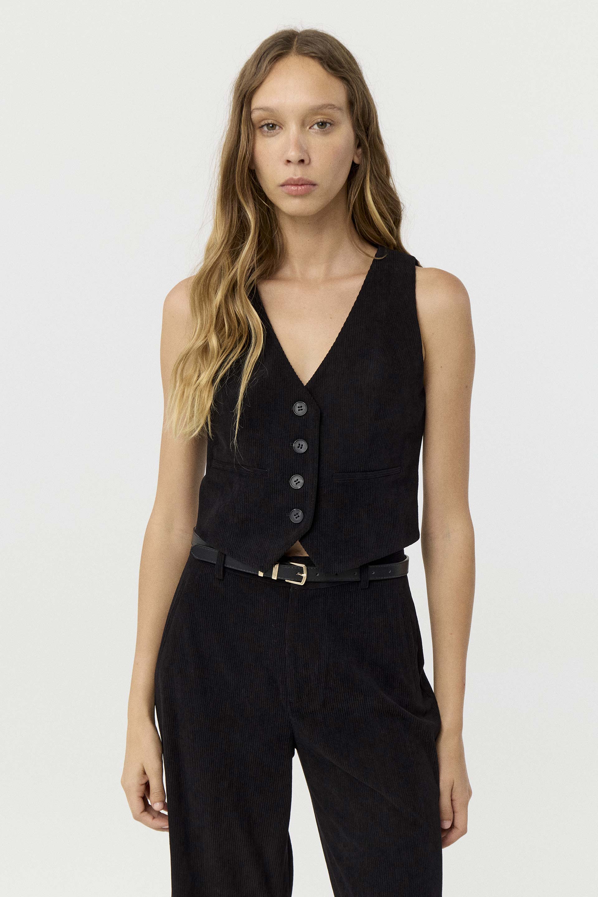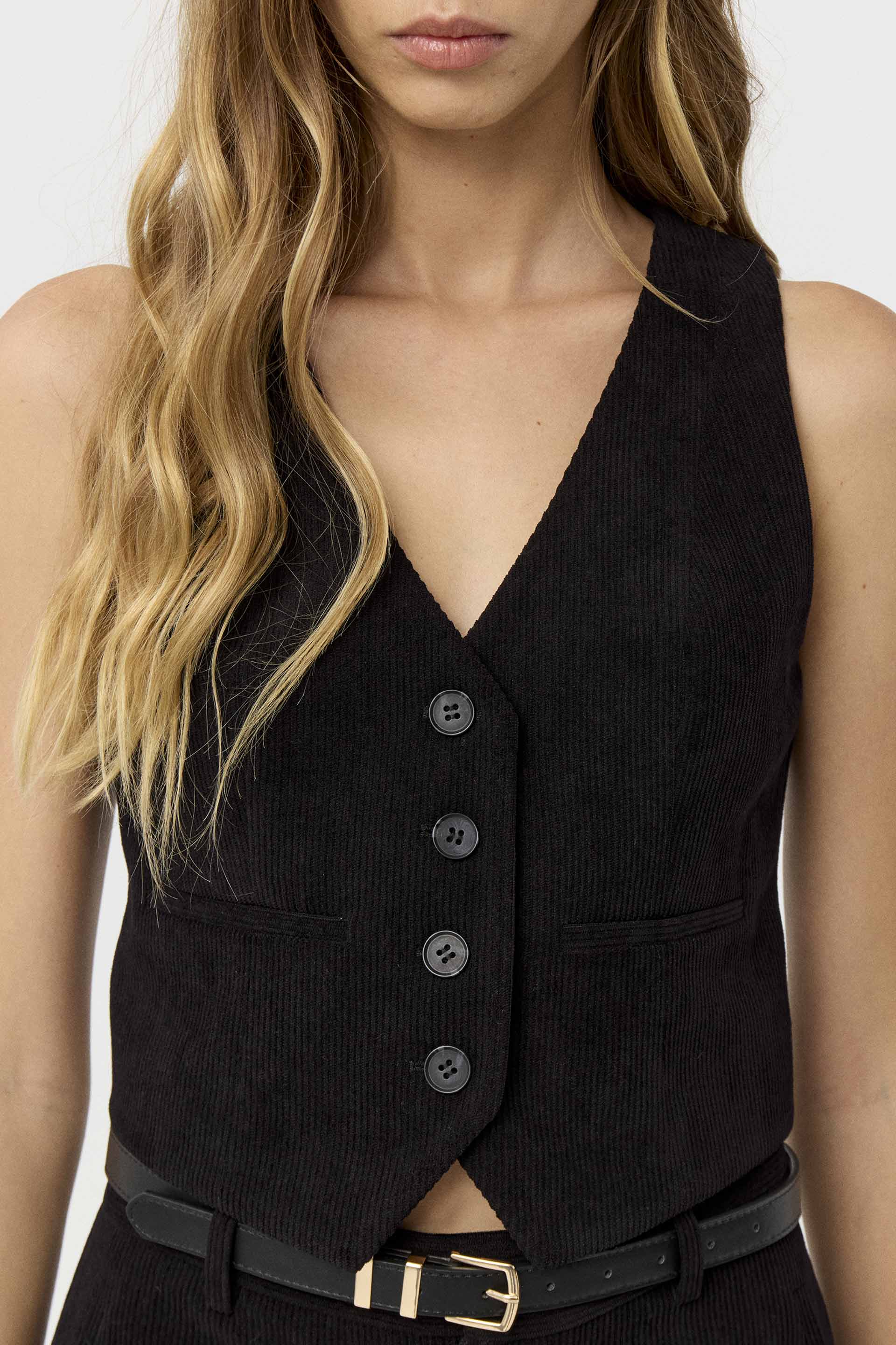 Chaleco corto de corderoy, de calce entallado. Posee escote en V y acceso con botones de pasta a tono. Su género y su color lo convierten en un ítem de tendencia que no puede faltarte este invierno en tu guardarropa. Combinalo con el pantalón Aneto y armá un total look canchero, ideal tanto para la oficina como para un evento de día.